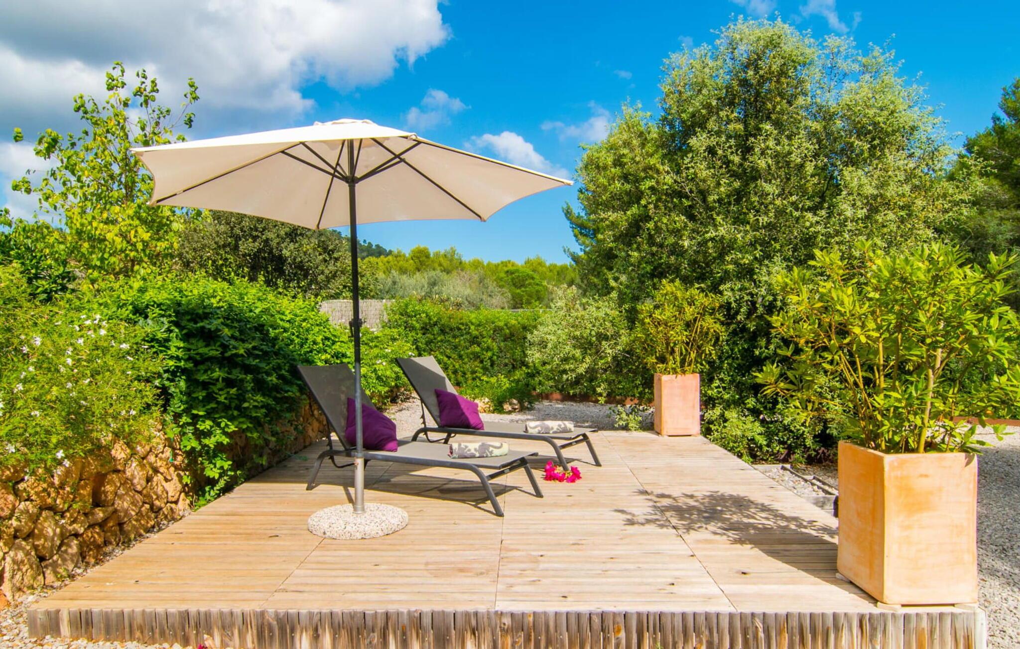 Die Villa „Es Carregador“ ist eine dieser Villen, die wir gerne nachbauen würden, denn Immobilien wie diese sind schwer zu finden. Erstens handelt es sich um eine echte Natursteinvilla in abgeschiedener Lage und zweitens sind Strand und Meer nur wenige Meter Luftlinie vom Haus entfernt. Außerdem haben wir es nicht mit einer Urbanisation oder irgendeinem Fischerdorf zu tun, nein, die Villa liegt wirklich an einem unbebauten Abschnitt der Ostküste Mallorcas. Die Küstenlandschaft mit ihren niedrigen Klippen und kleinen Sand- und Kiesbuchten ist einfach fabelhaft. Selbst in der Hochsaison sind die Ministrände oft leer. Stellen Sie sich vor, wenn Sie so wollen: Eine kleine, romantische Villa an einem Ort, an dem Sie den Abend entspannt an einem „halbprivaten Strand“ verbringen und den Tag ausklingen lassen können. Oder Sie verbringen die Abendstunden natürlich auch auf dem Grundstück rund um das Haus. Das 3.000 m² große Anwesen verfügt über hübsche kleine Terrassen und Kiesgrundstücke, auf denen Sie in aller Ruhe entspannen können. Am hübschen Esstisch unter der Terrassenüberdachung schmeckt sicher ein Glas Wein am besten, ebenso wie das Frühstück am Morgen mit Blick in den Garten. Ein weiterer attraktiver Ort während des Tages ist die leicht erhöhte Holzterrasse mit bequemen Liegestühlen, die den idealen Rahmen für ausgedehnte Stunden in der Sonne bieten.