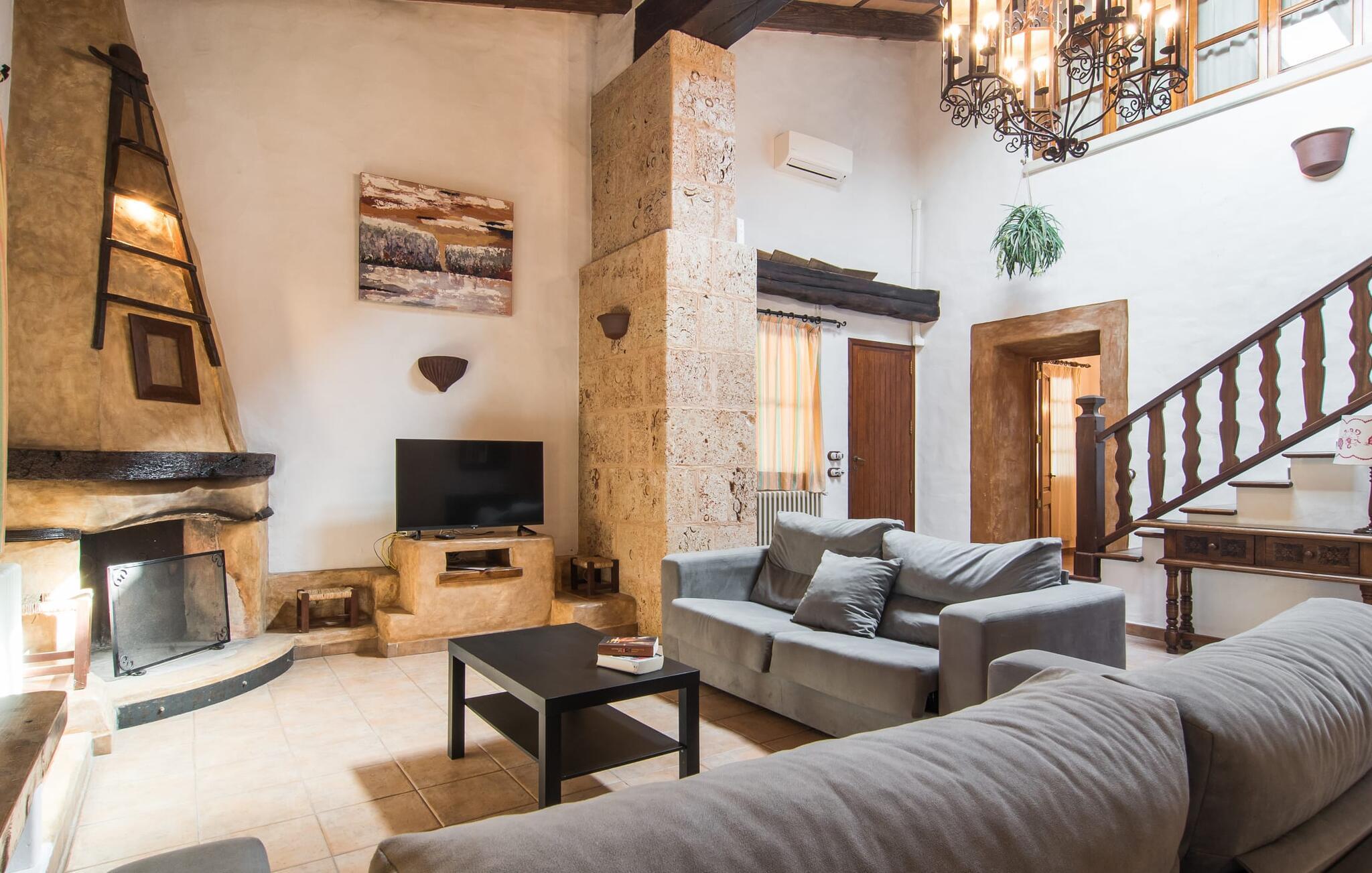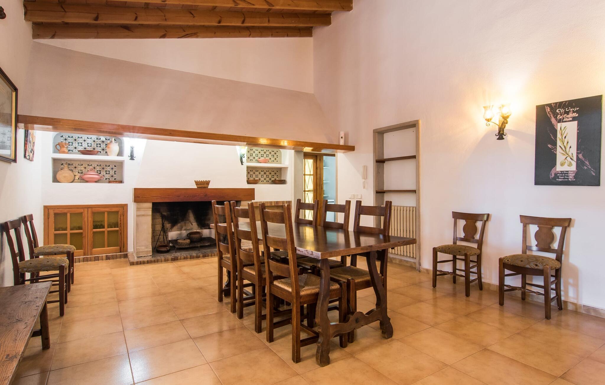 Das Interieur versprüht traditionellen mallorquinischen Charme mit Naturstein, Rundbögen und rustikalen Details wie gemauerten Waschbecken, Fliesenböden und dunklen Holzbalken. So entsteht eine tolle, authentische Landhausatmosphäre, die sich mühelos mit einer modernen Einrichtung kombinieren lässt. Das offen gestaltete Erdgeschoss verfügt über einen Wohn- und Essbereich, eine rustikale Küche mit modernen Geräten und ein geräumiges Esszimmer mit Kamin. Ein Schlafzimmer mit Doppelbett und ein Badezimmer vervollständigen diese Ebene. Eine Treppe mit dekorativen Fliesen führt in das Obergeschoss, wo zwei weitere Schlafzimmer auf Sie warten, darunter eines mit eigenem Bad.
