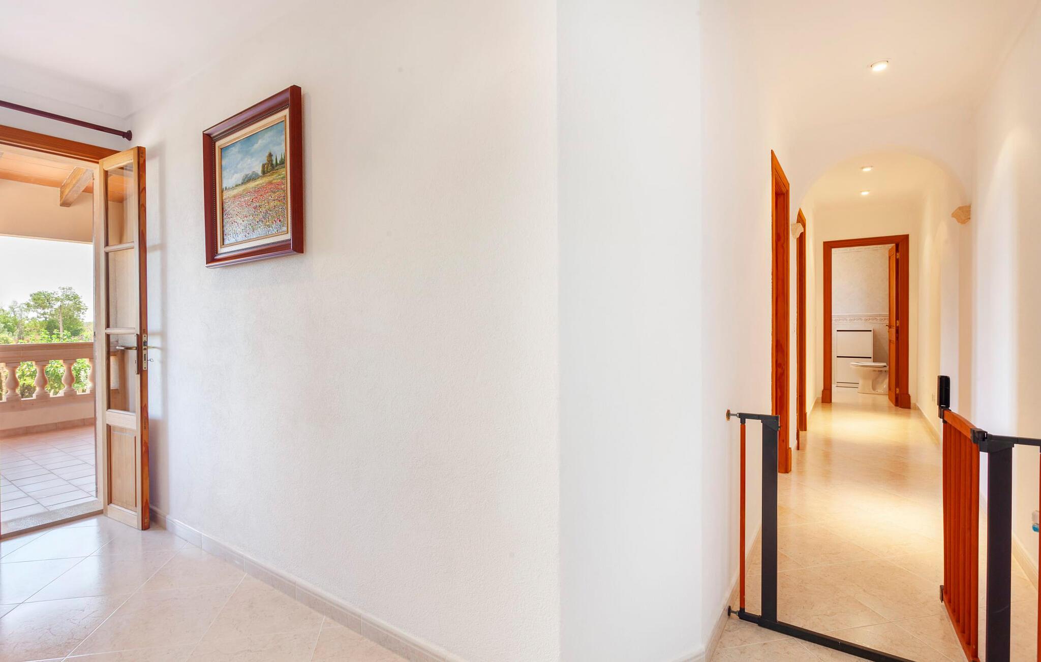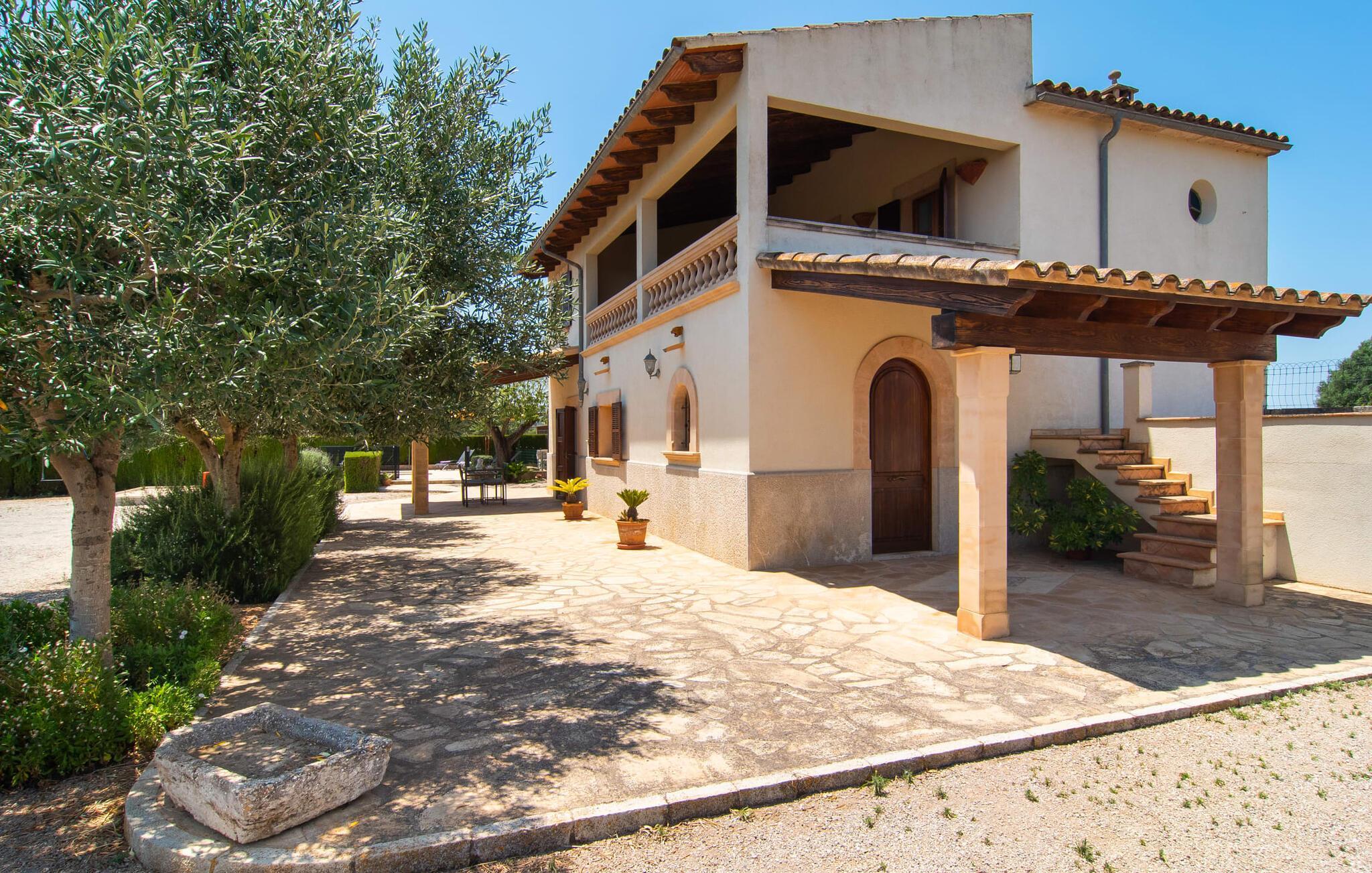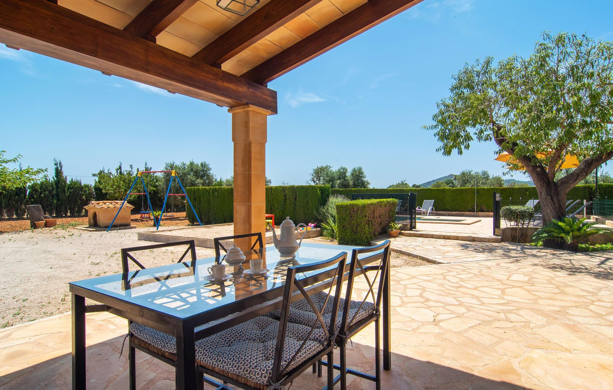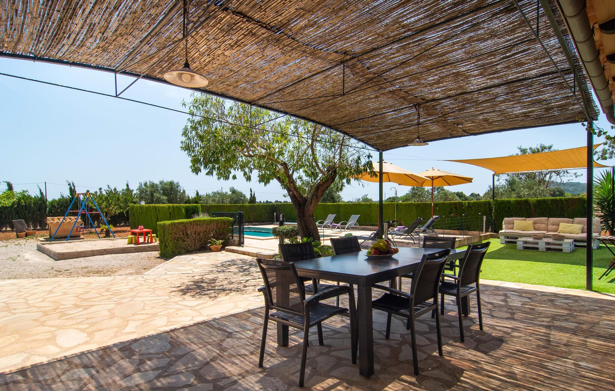 Die familienfreundliche Villa „Es Cipres“ wird Sie mit ihrer hübschen Alleinlage auf einem 9.000 m² großen Grundstück und je nach Jahreszeit üppiger Vegetation begeistern. Eine Vielzahl von Pflanzen, weitläufige Kies- und Terrassenflächen sowie einladende Nischen zum Verweilen verleihen dieser Immobilie einen individuellen Charme. Das Raumgefühl wird hier eindrucksvoll und unmittelbar erlebbar. Durch die Überdachung des Hauses haben Sie die Möglichkeit, sich ganz nach Ihren Vorlieben in der Sonne oder im luftigen Schatten auf eine Vielzahl wunderbarer Plätze zum Entspannen zu freuen. Bequeme Sonnenliegen laden zum Entspannen und Verweilen ein, ebenso wie die geschmackvollen Sitzecken, wo Sie gemeinsam speisen können. Hier können Sie beim Frühstück den freien Blick auf den tiefblauen Morgenhimmel genießen oder einen weiteren erfüllten Urlaubstag bei abendlicher Atmosphäre gemütlich ausklingen lassen. Der Pool im rechten Winkel zur Villa ist mit einem Zaun für Kinder gesichert. Der Pool ist mit hübschen Mosaiksteinen gefliest und variiert in der Tiefe zwischen 1 m und 1,90 m. Für alle Sonnenanbeter stehen sechs bequeme Sonnenliegen zur Verfügung und zum Schutz vor grellen UV-Strahlen gibt es zwei Sonnenschirme. Ein weiterer herrlicher Außensitzbereich befindet sich im Obergeschoss, wo ein großzügiger Balkon eine idyllische Aussicht bietet. Verschiedene Kinderspielgeräte machen den Aufenthalt im Freien für unsere kleinen Gäste noch attraktiver.