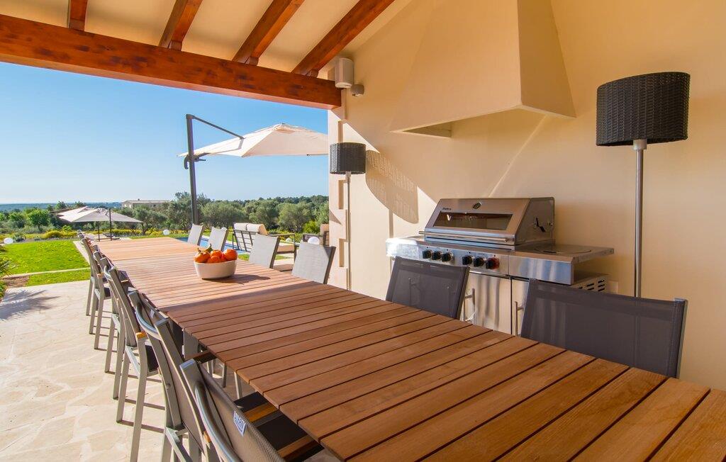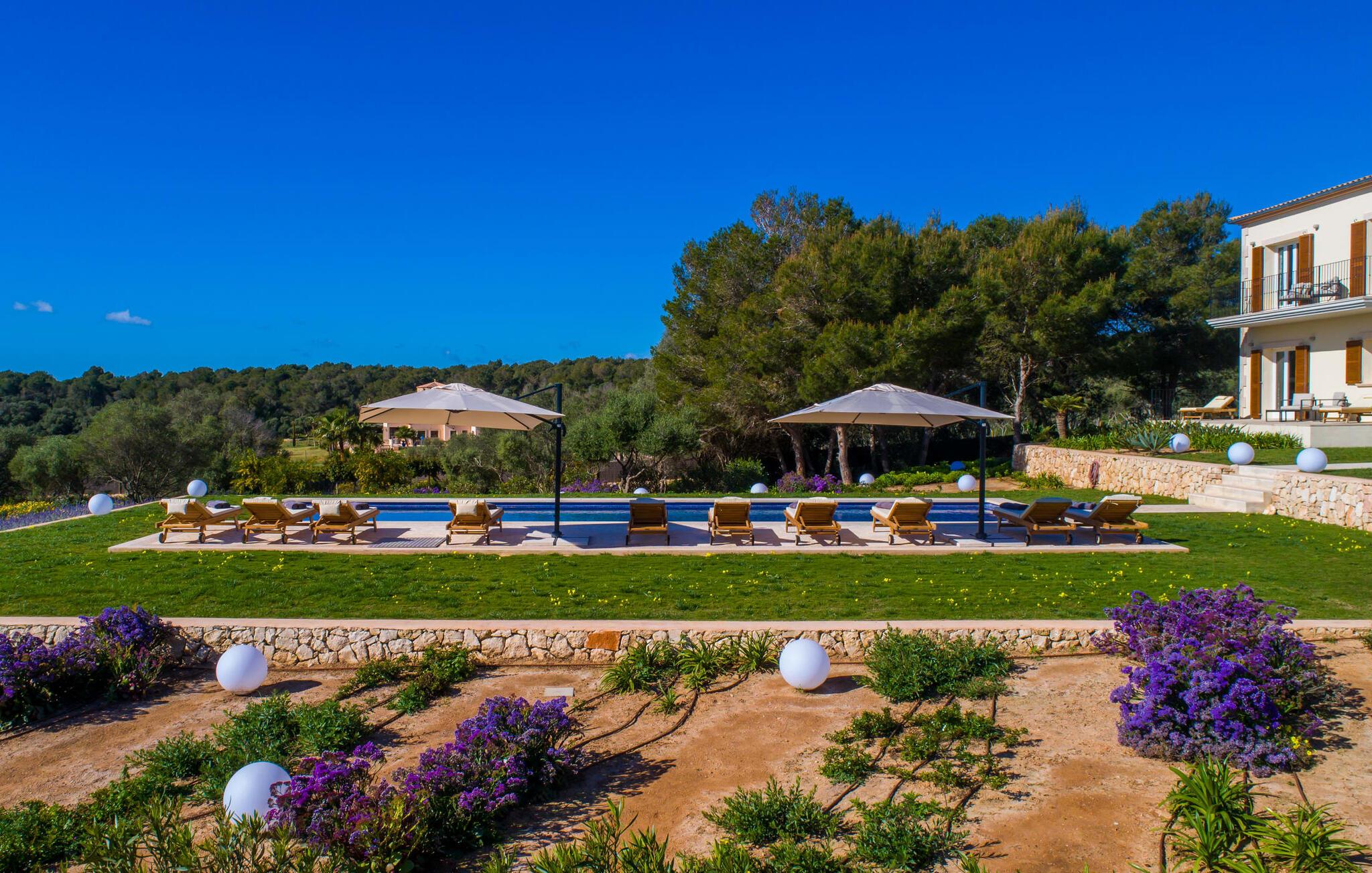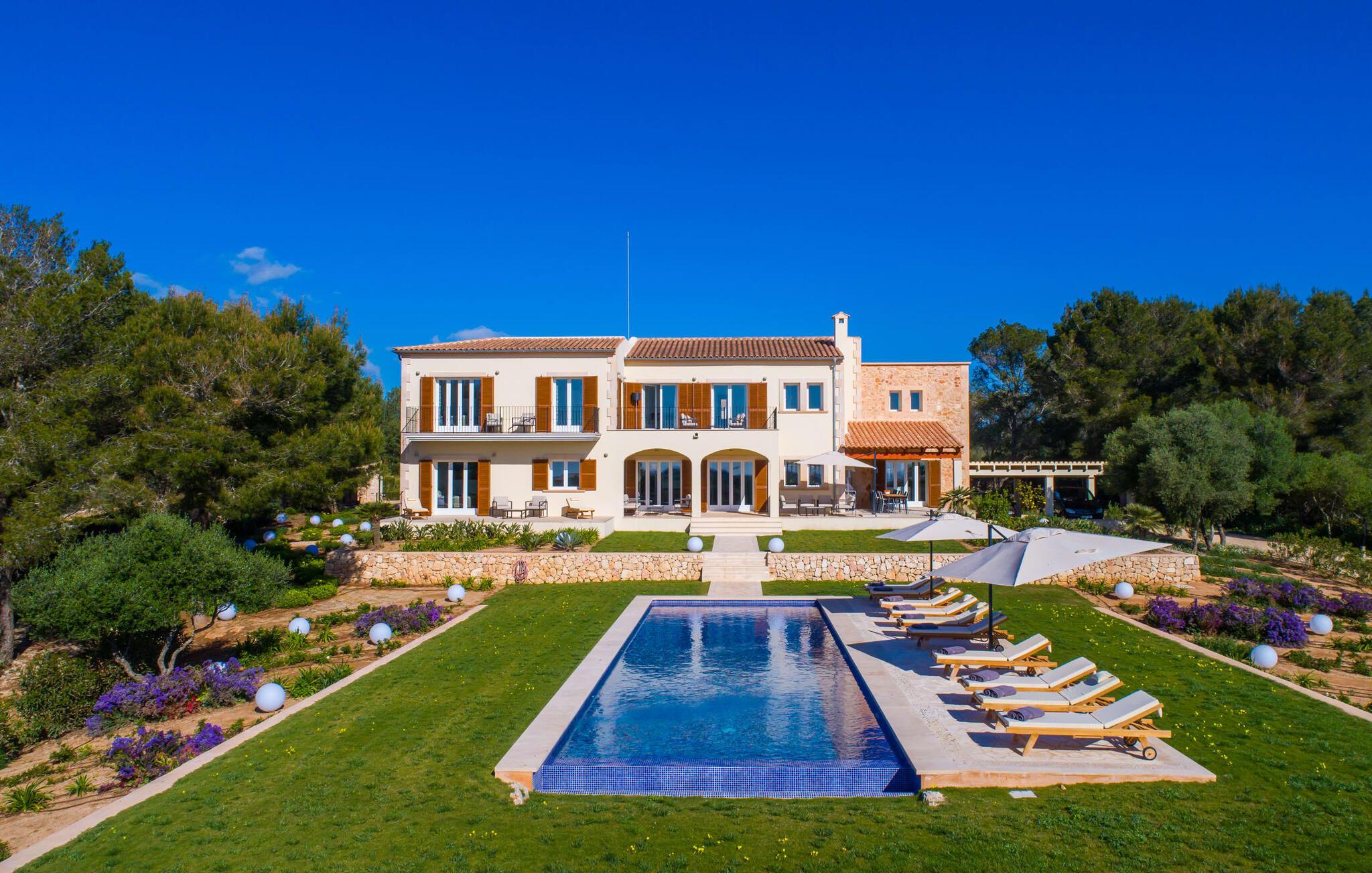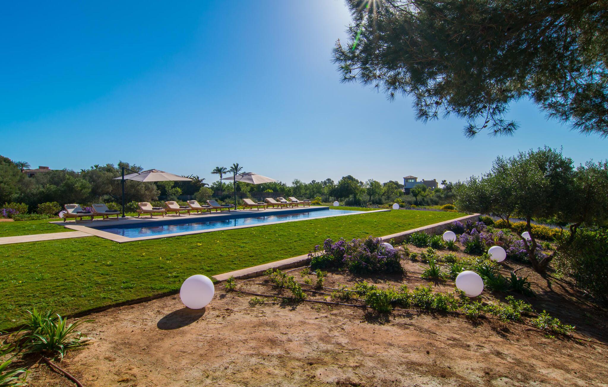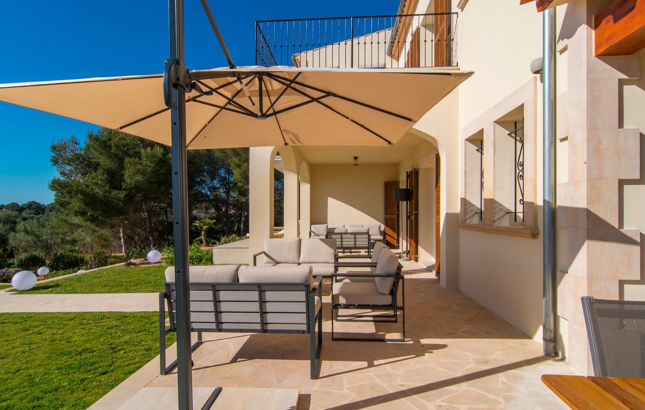 Villa „Es Clape de Sa Galera“ ist einfach umwerfend. Das Äußere des luxuriösen Anwesens ist eine wahre Augenweide. Die im typisch mallorquinischen Stil erbaute Villa liegt auf einem großen Grundstück mit einem wunderschön angelegten Garten. Gemütliche Loungemöbel auf der Terrasse laden zum Verweilen ein. Große Teile der Terrasse sind überdacht, der Rest der Terrasse ist mit Sonnenschirmen ausgestattet. Eine weitere Terrasse, die von einem der Schlafzimmer aus zugänglich ist, ist offen und lädt zum entspannten Sonnenbaden ein. Die bequemen Liegen sind schon da! Von den Terrassen genießen Sie den Blick über das herrliche Anwesen mit seinem großen Infinity-Pool und die umliegende Landschaft. Genießen Sie an der langen Holztafel auf der Terrasse erlesene Köstlichkeiten, die Sie vorher auf dem exklusiven Grill zubereiten können. Und schalten Sie am Abend unbedingt die schönen Kugellichter ein, die sich über das gesamte Anwesen verteilen. Sie schaffen eine ganz besondere Atmosphäre. Der Pool erstreckt sich über eine Länge von 15 m und eignet sich hervorragend zum Schwimmen ein paar Bahnen oder zum Entspannen am Beckenrand auf einer der erstklassigen Sonnenliegen.