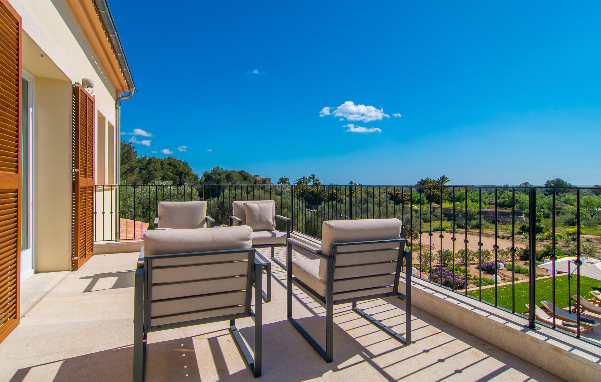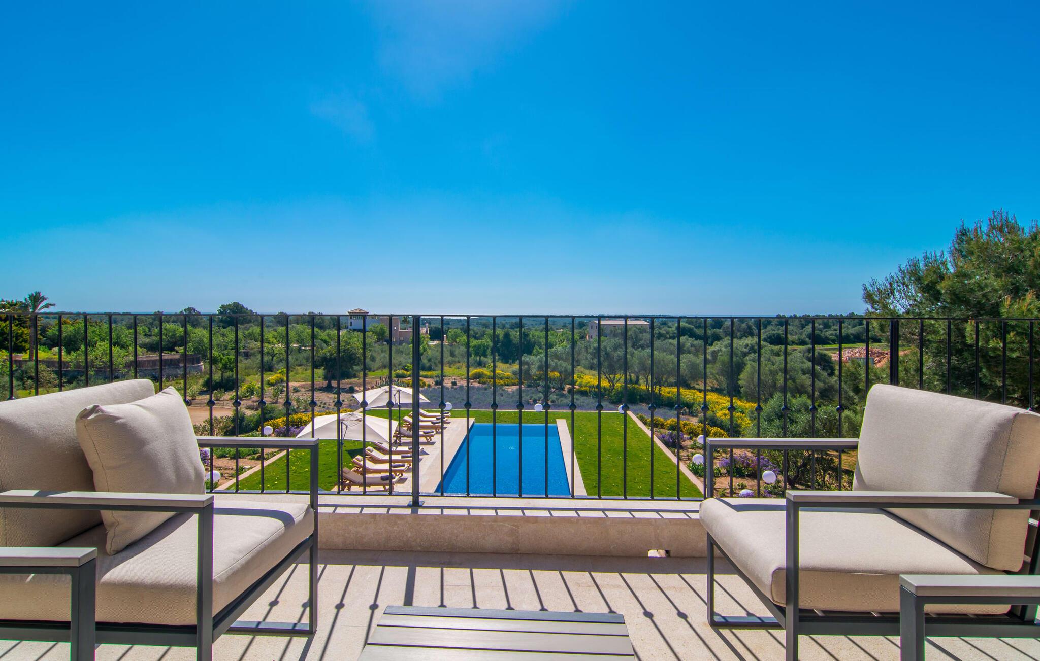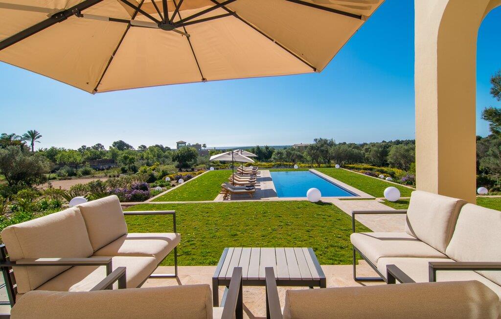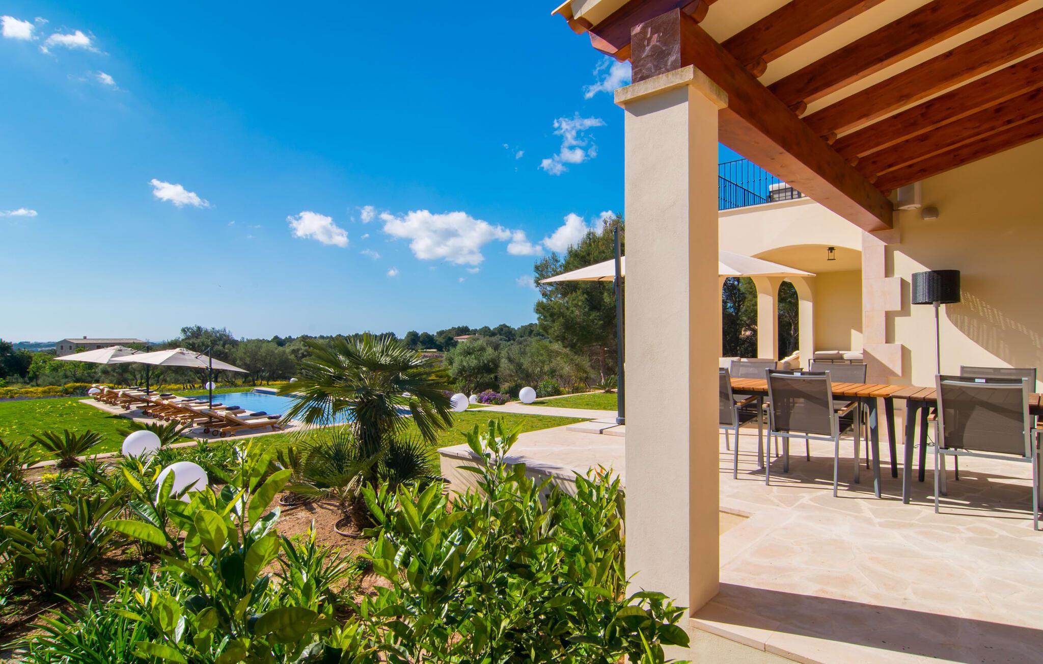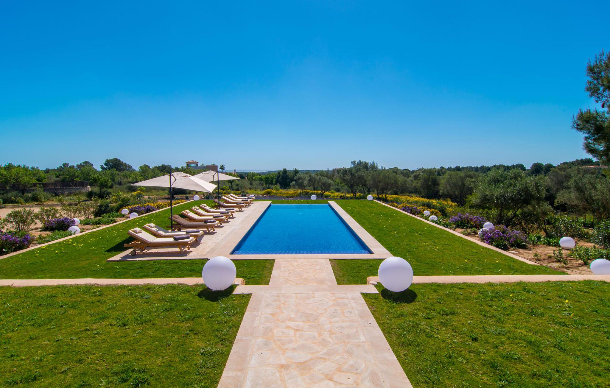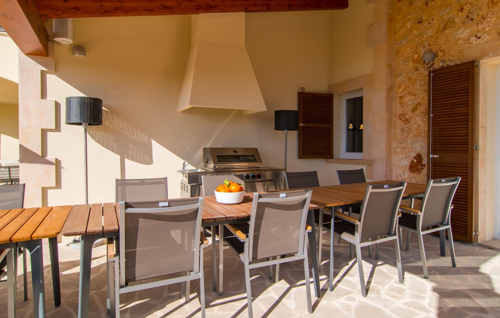 Villa „Es Clape de Sa Galera“ ist einfach umwerfend. Das Äußere des luxuriösen Anwesens ist eine wahre Augenweide. Die im typisch mallorquinischen Stil erbaute Villa liegt auf einem großen Grundstück mit einem wunderschön angelegten Garten. Gemütliche Loungemöbel auf der Terrasse laden zum Verweilen ein. Große Teile der Terrasse sind überdacht, der Rest der Terrasse ist mit Sonnenschirmen ausgestattet. Eine weitere Terrasse, die von einem der Schlafzimmer aus zugänglich ist, ist offen und lädt zum entspannten Sonnenbaden ein. Die bequemen Liegen sind schon da! Von den Terrassen genießen Sie den Blick über das herrliche Anwesen mit seinem großen Infinity-Pool und die umliegende Landschaft. Genießen Sie an der langen Holztafel auf der Terrasse erlesene Köstlichkeiten, die Sie vorher auf dem exklusiven Grill zubereiten können. Und schalten Sie am Abend unbedingt die schönen Kugellichter ein, die sich über das gesamte Anwesen verteilen. Sie schaffen eine ganz besondere Atmosphäre. Der Pool erstreckt sich über eine Länge von 15 m und eignet sich hervorragend zum Schwimmen ein paar Bahnen oder zum Entspannen am Beckenrand auf einer der erstklassigen Sonnenliegen.