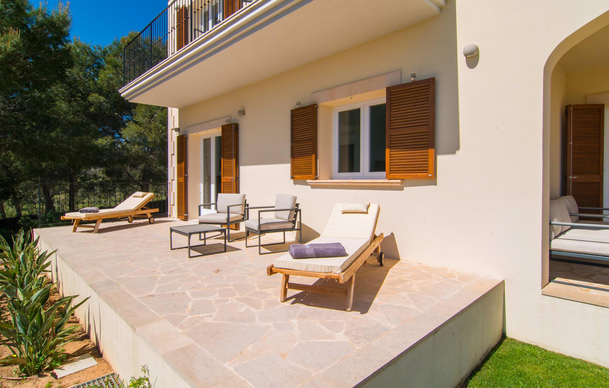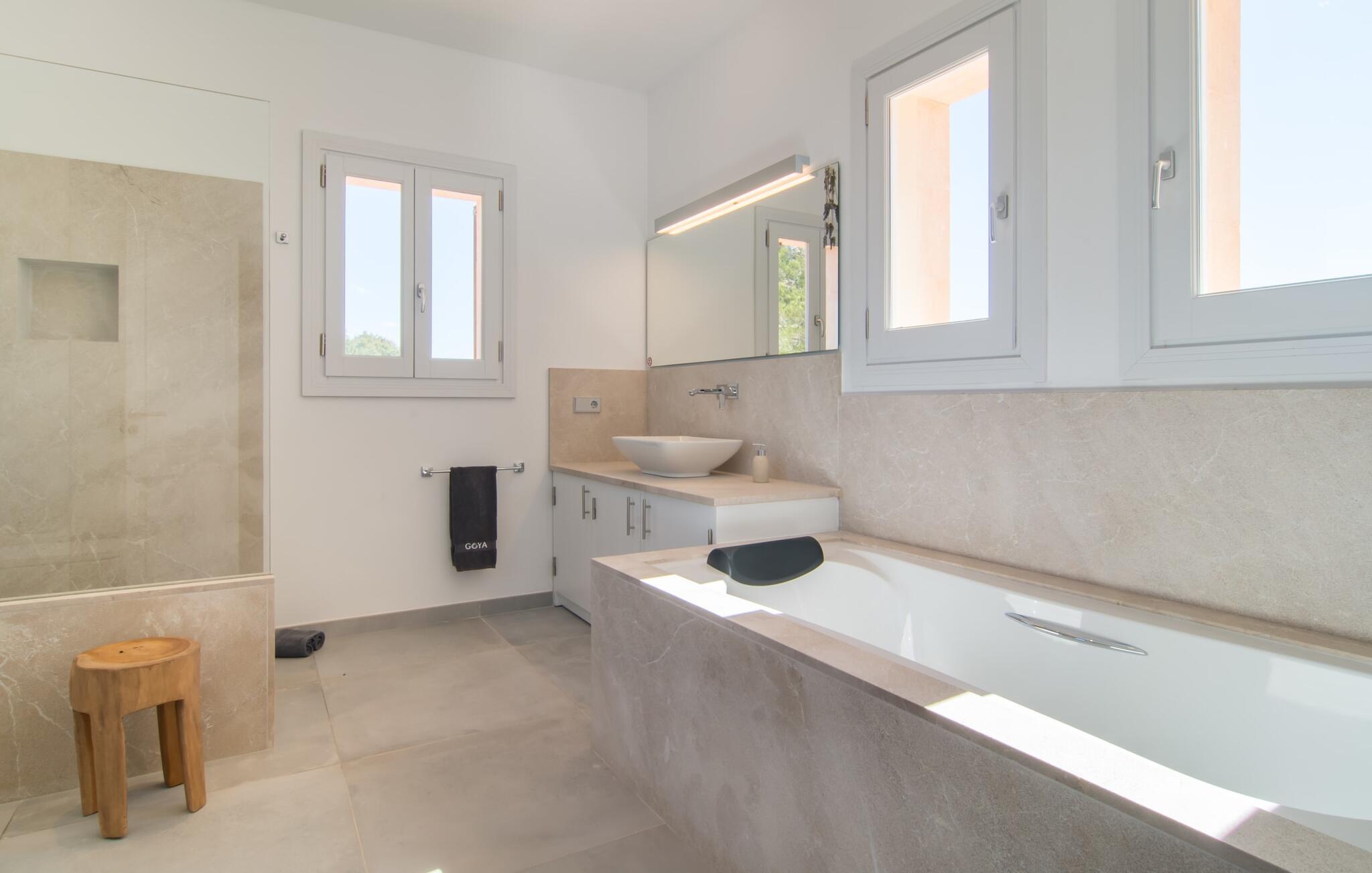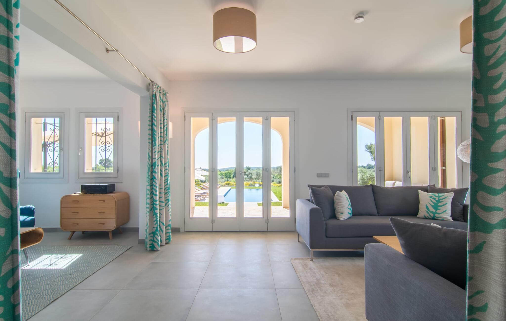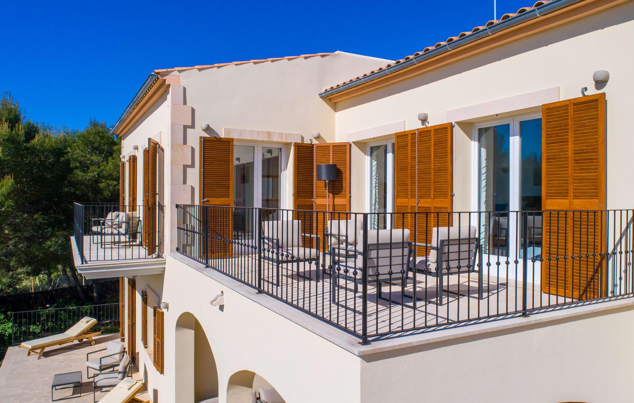 Villa „Es Clape de Sa Galera“ ist einfach umwerfend. Das Äußere des luxuriösen Anwesens ist eine wahre Augenweide. Die im typisch mallorquinischen Stil erbaute Villa liegt auf einem großen Grundstück mit einem wunderschön angelegten Garten. Gemütliche Loungemöbel auf der Terrasse laden zum Verweilen ein. Große Teile der Terrasse sind überdacht, der Rest der Terrasse ist mit Sonnenschirmen ausgestattet. Eine weitere Terrasse, die von einem der Schlafzimmer aus zugänglich ist, ist offen und lädt zum entspannten Sonnenbaden ein. Die bequemen Liegen sind schon da! Von den Terrassen genießen Sie den Blick über das herrliche Anwesen mit seinem großen Infinity-Pool und die umliegende Landschaft. Genießen Sie an der langen Holztafel auf der Terrasse erlesene Köstlichkeiten, die Sie vorher auf dem exklusiven Grill zubereiten können. Und schalten Sie am Abend unbedingt die schönen Kugellichter ein, die sich über das gesamte Anwesen verteilen. Sie schaffen eine ganz besondere Atmosphäre. Der Pool erstreckt sich über eine Länge von 15 m und eignet sich hervorragend zum Schwimmen ein paar Bahnen oder zum Entspannen am Beckenrand auf einer der erstklassigen Sonnenliegen.