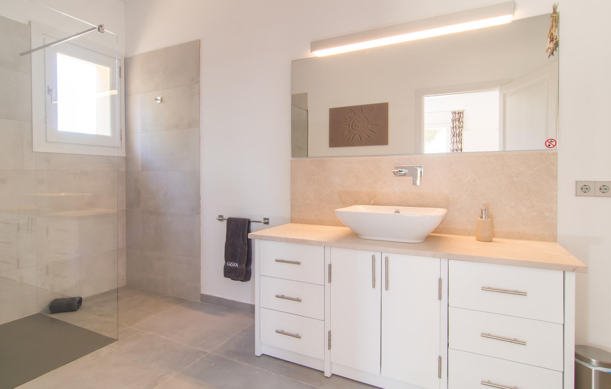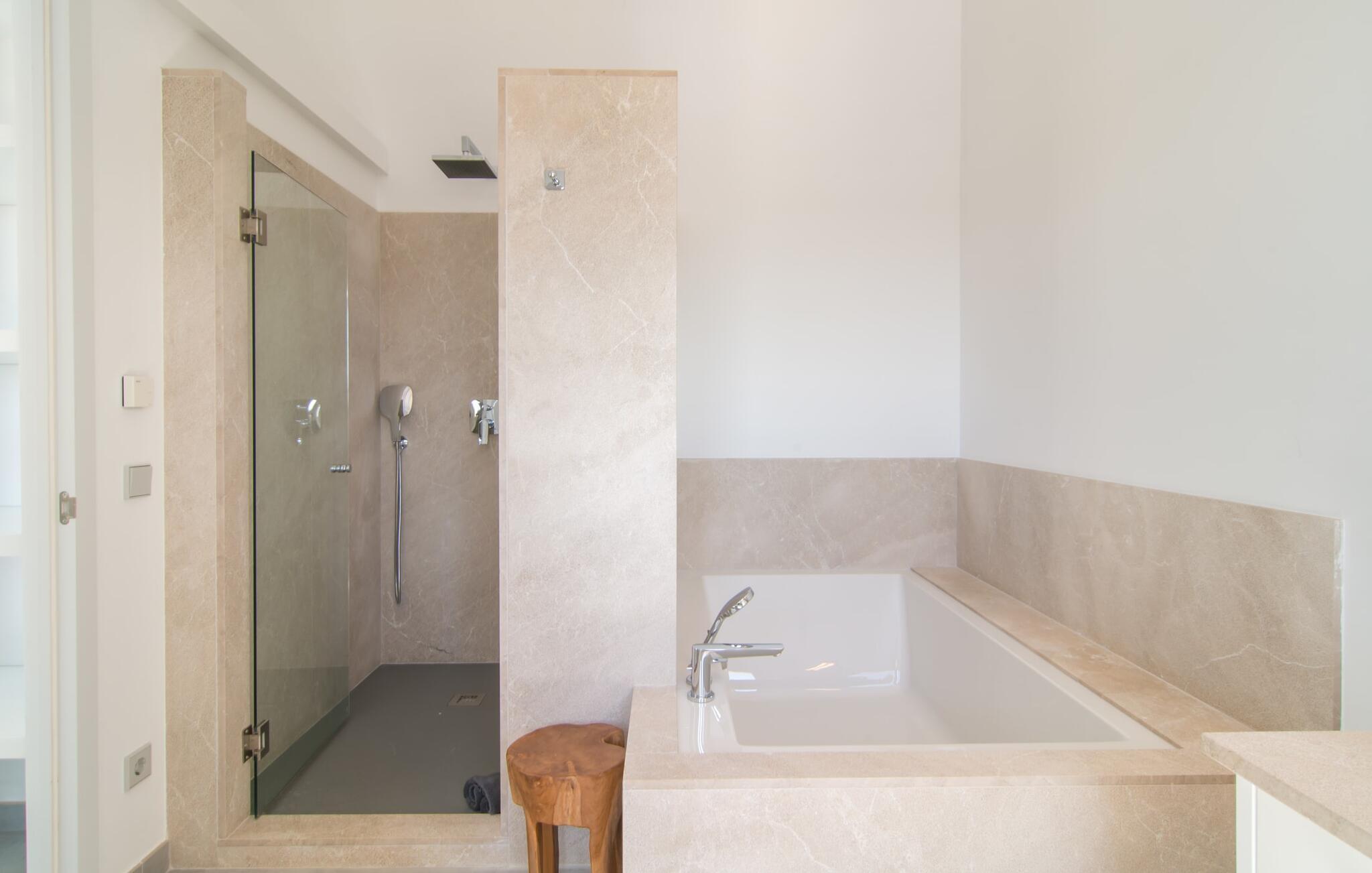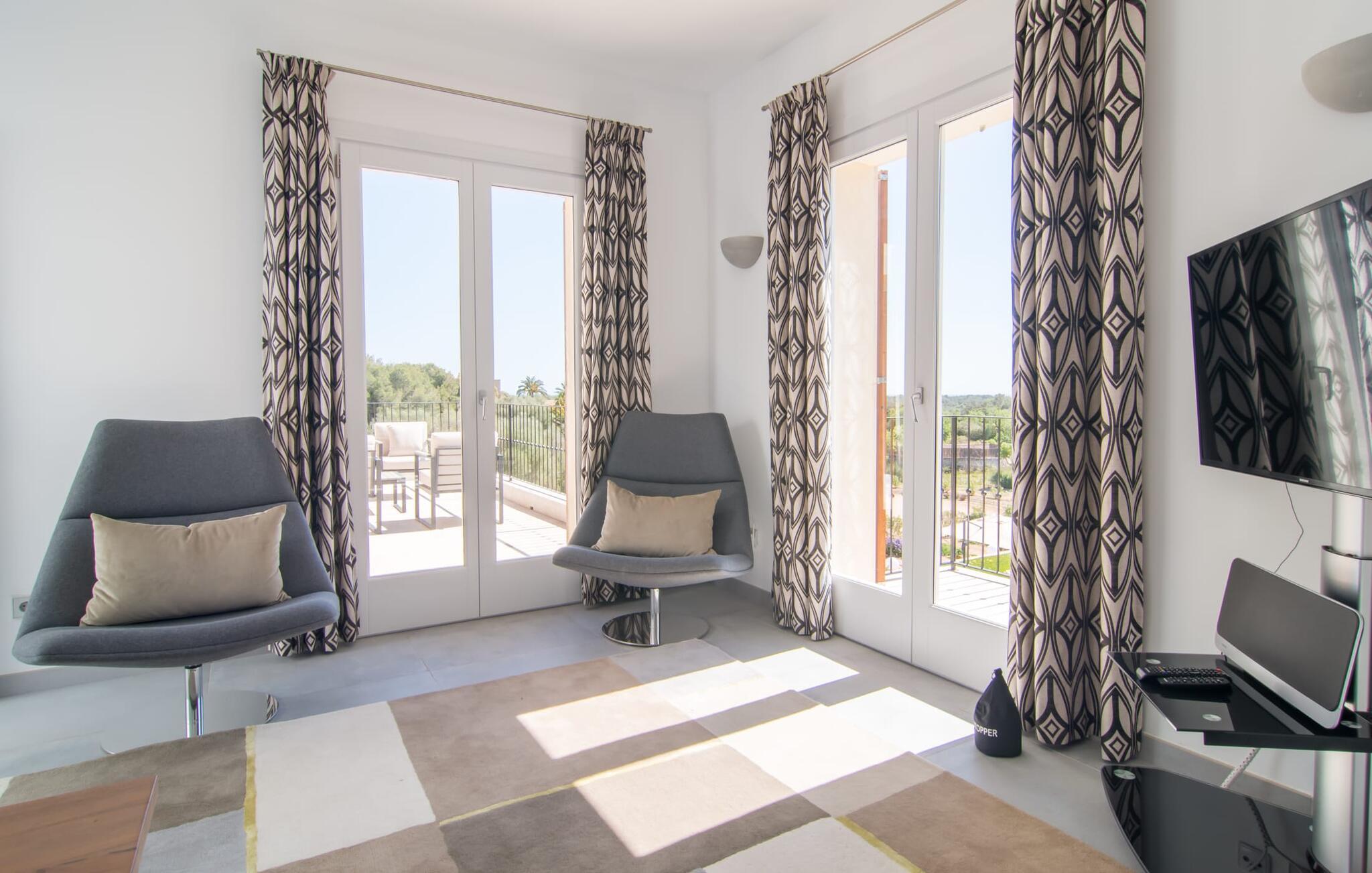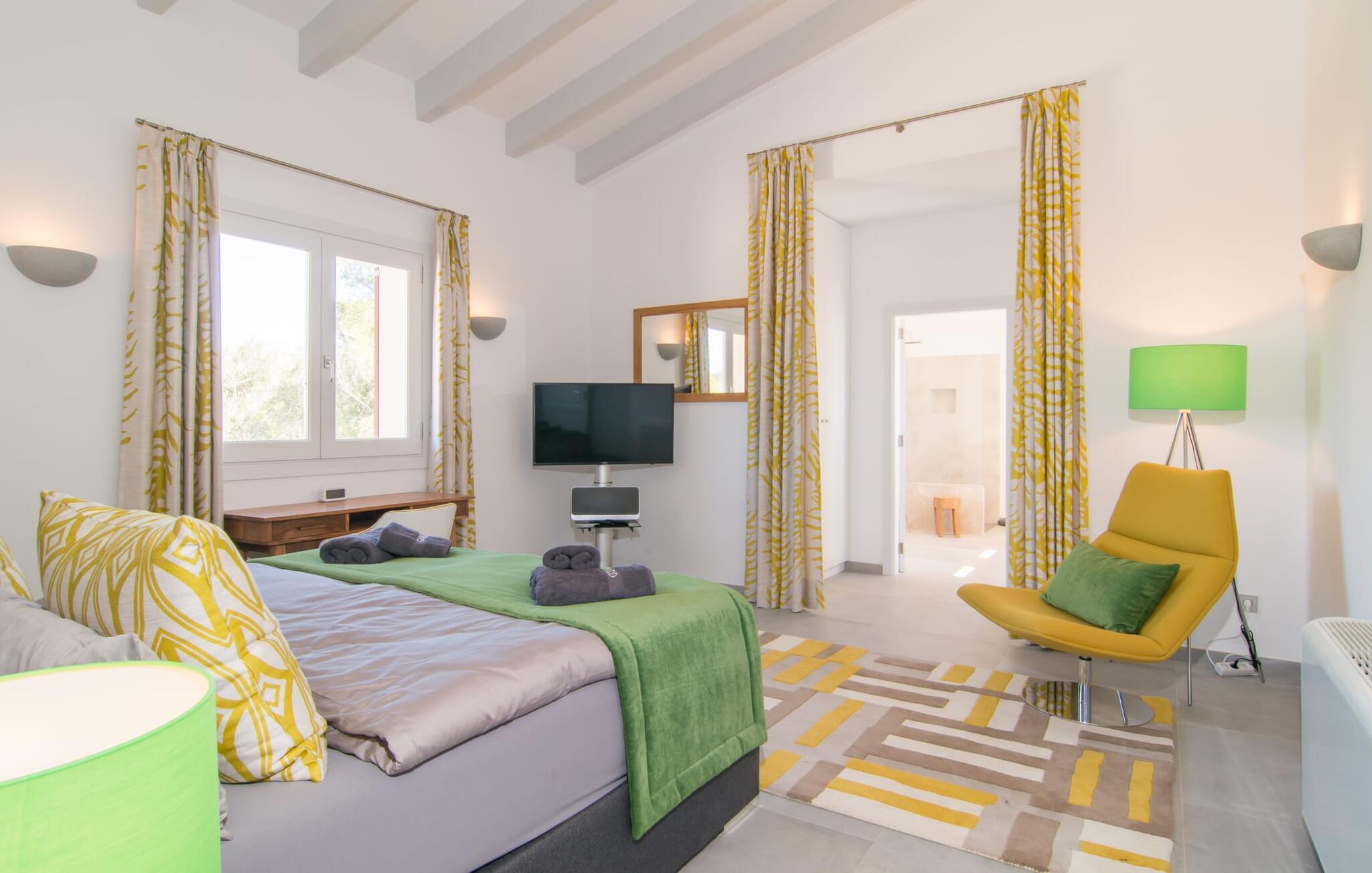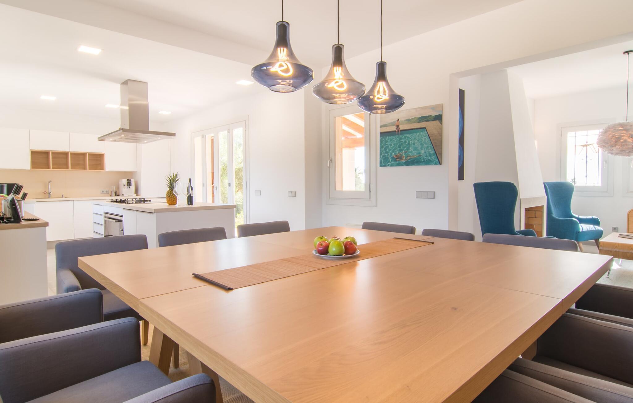 Villa „Es Clape de Sa Galera“ ist einfach umwerfend. Das Äußere des luxuriösen Anwesens ist eine wahre Augenweide. Die im typisch mallorquinischen Stil erbaute Villa liegt auf einem großen Grundstück mit einem wunderschön angelegten Garten. Gemütliche Loungemöbel auf der Terrasse laden zum Verweilen ein. Große Teile der Terrasse sind überdacht, der Rest der Terrasse ist mit Sonnenschirmen ausgestattet. Eine weitere Terrasse, die von einem der Schlafzimmer aus zugänglich ist, ist offen und lädt zum entspannten Sonnenbaden ein. Die bequemen Liegen sind schon da! Von den Terrassen genießen Sie den Blick über das herrliche Anwesen mit seinem großen Infinity-Pool und die umliegende Landschaft. Genießen Sie an der langen Holztafel auf der Terrasse erlesene Köstlichkeiten, die Sie vorher auf dem exklusiven Grill zubereiten können. Und schalten Sie am Abend unbedingt die schönen Kugellichter ein, die sich über das gesamte Anwesen verteilen. Sie schaffen eine ganz besondere Atmosphäre. Der Pool erstreckt sich über eine Länge von 15 m und eignet sich hervorragend zum Schwimmen ein paar Bahnen oder zum Entspannen am Beckenrand auf einer der erstklassigen Sonnenliegen.