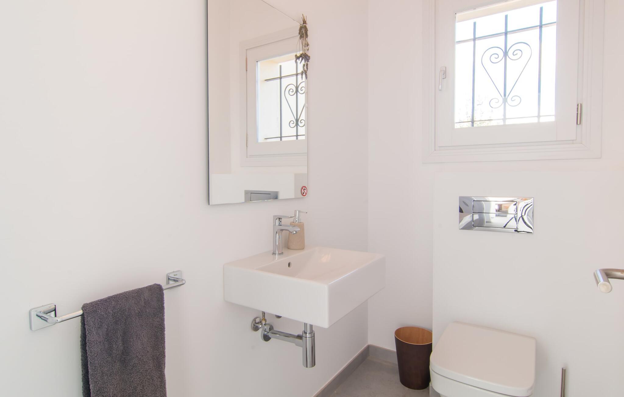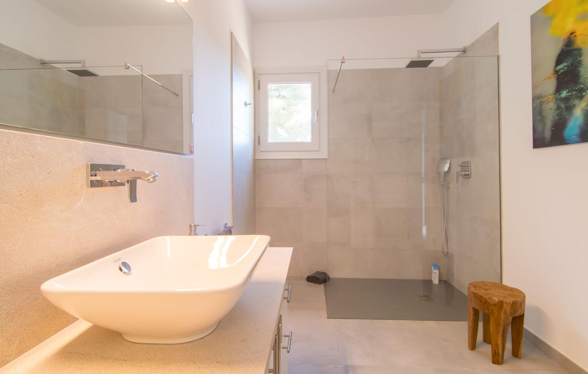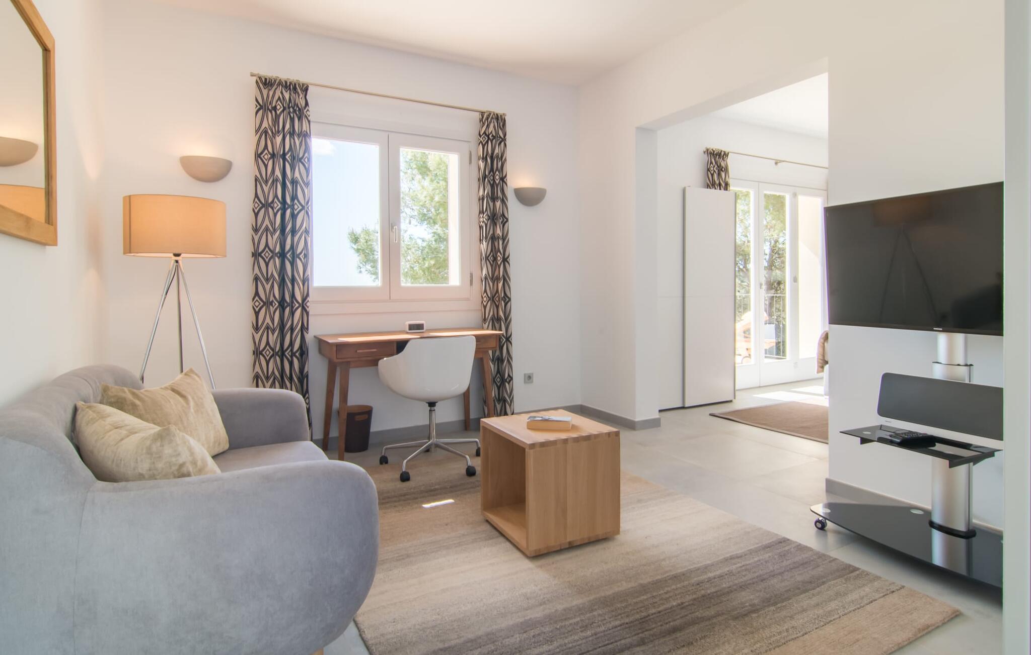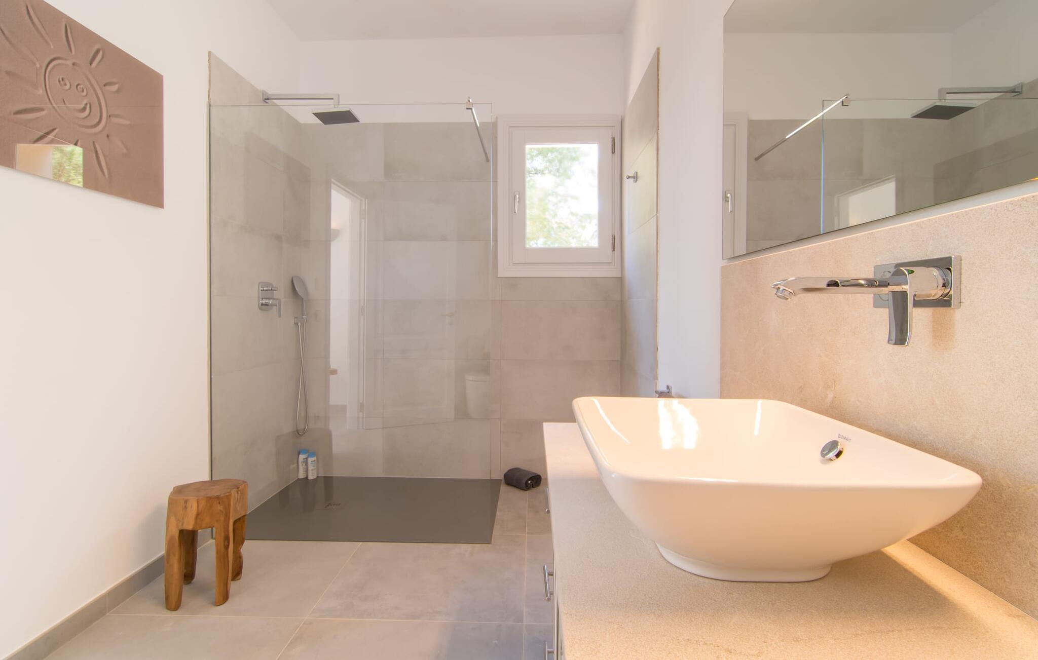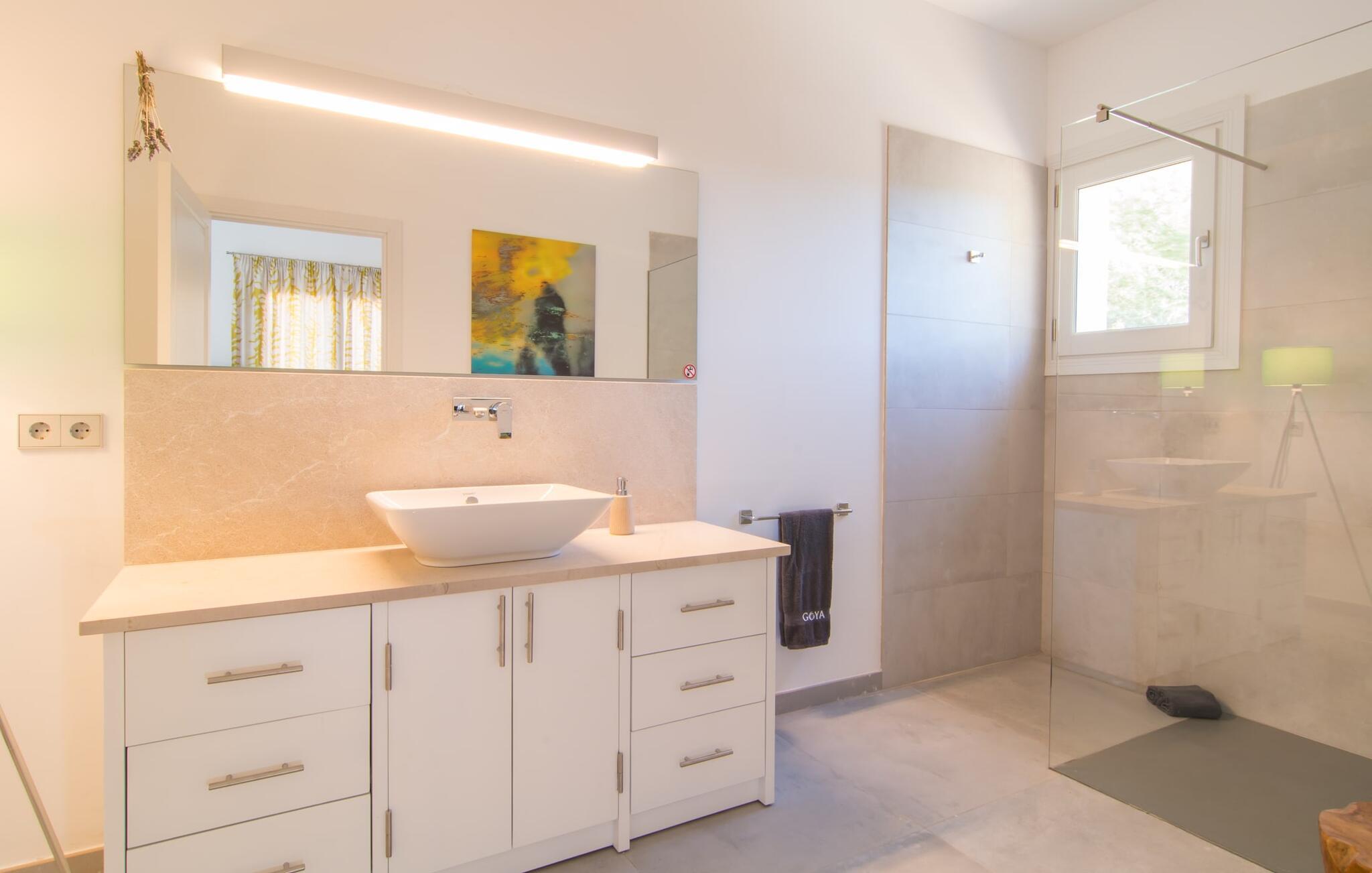 Villa „Es Clape de Sa Galera“ ist einfach umwerfend. Das Äußere des luxuriösen Anwesens ist eine wahre Augenweide. Die im typisch mallorquinischen Stil erbaute Villa liegt auf einem großen Grundstück mit einem wunderschön angelegten Garten. Gemütliche Loungemöbel auf der Terrasse laden zum Verweilen ein. Große Teile der Terrasse sind überdacht, der Rest der Terrasse ist mit Sonnenschirmen ausgestattet. Eine weitere Terrasse, die von einem der Schlafzimmer aus zugänglich ist, ist offen und lädt zum entspannten Sonnenbaden ein. Die bequemen Liegen sind schon da! Von den Terrassen genießen Sie den Blick über das herrliche Anwesen mit seinem großen Infinity-Pool und die umliegende Landschaft. Genießen Sie an der langen Holztafel auf der Terrasse erlesene Köstlichkeiten, die Sie vorher auf dem exklusiven Grill zubereiten können. Und schalten Sie am Abend unbedingt die schönen Kugellichter ein, die sich über das gesamte Anwesen verteilen. Sie schaffen eine ganz besondere Atmosphäre. Der Pool erstreckt sich über eine Länge von 15 m und eignet sich hervorragend zum Schwimmen ein paar Bahnen oder zum Entspannen am Beckenrand auf einer der erstklassigen Sonnenliegen.