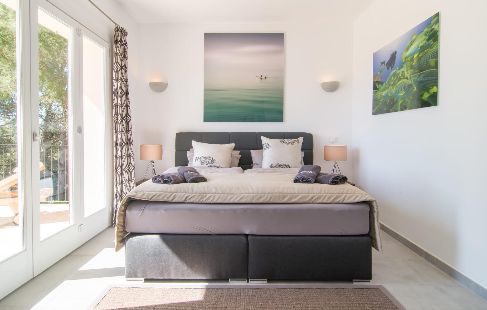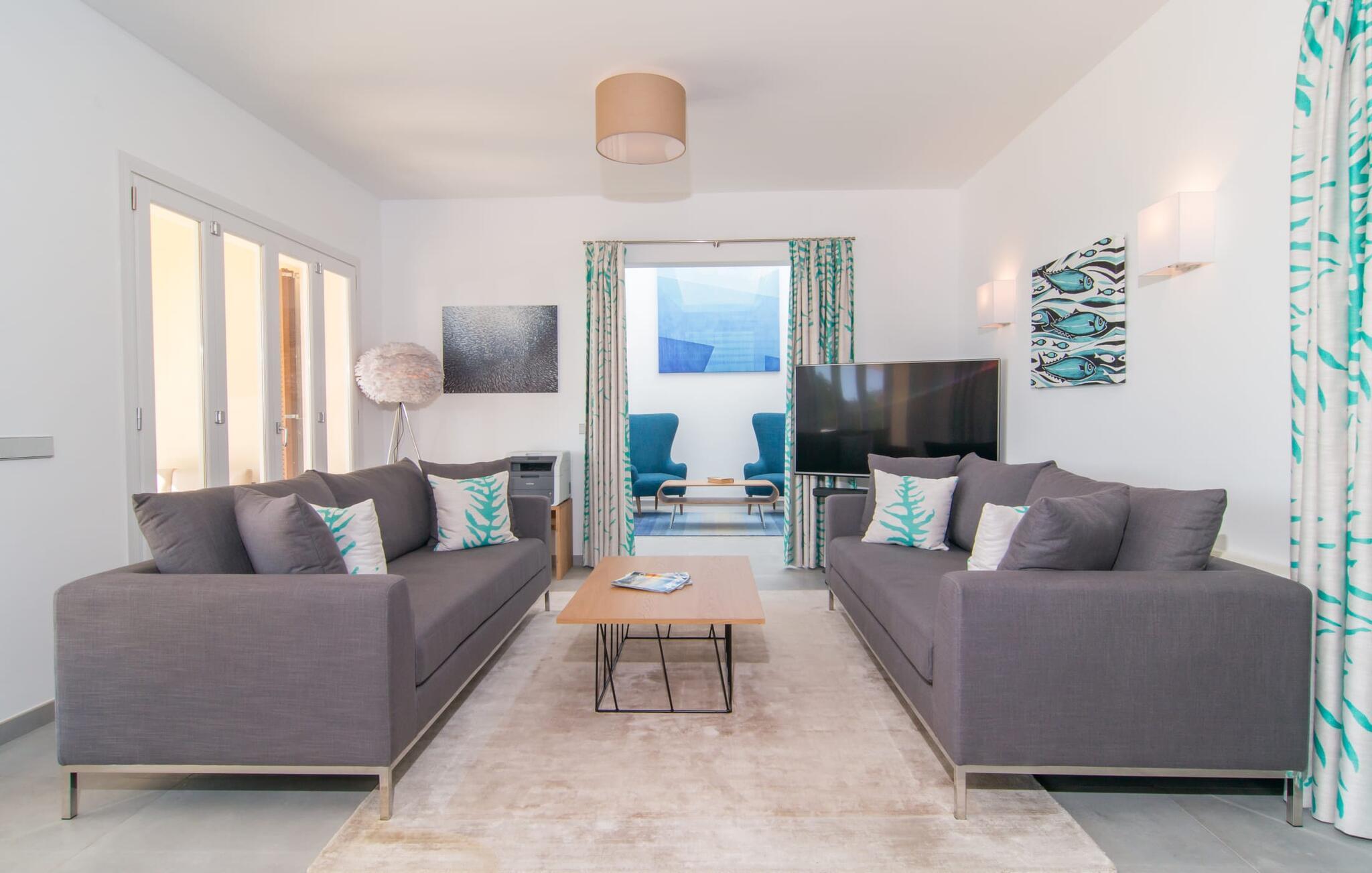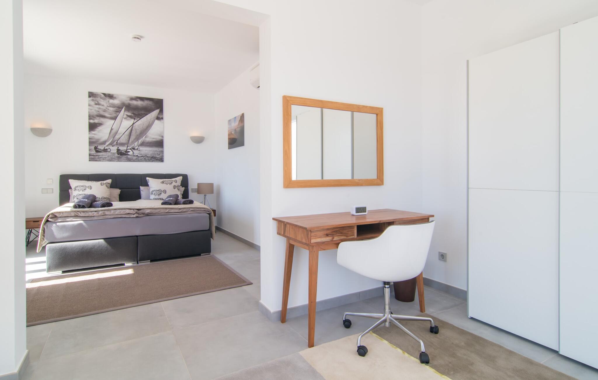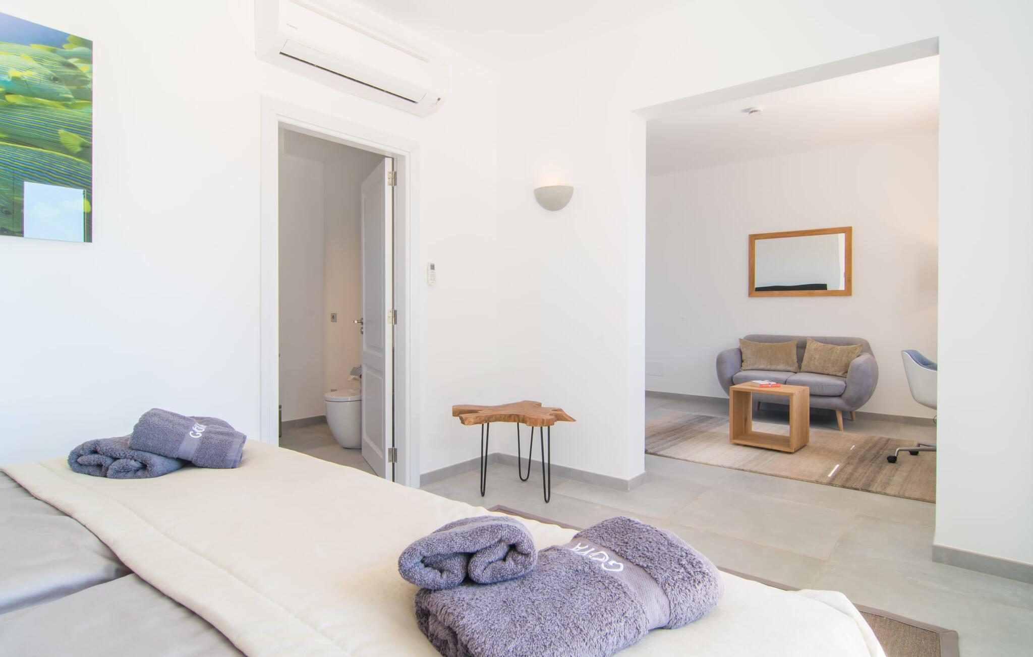 Hell, fröhlich, modern und exklusiv – die perfekten Worte, um das Interieur dieser Villa zu beschreiben. Das gemütliche Wohnzimmer im Erdgeschoss lädt zum Entspannen ein und in einem der Sessel des Kaminzimmers findet bestimmt jeder seinen Lieblingsplatz. Es ist direkt mit dem Wohnzimmer verbunden und kann durch einen Vorhang abgetrennt werden. Vom Kaminzimmer aus gelangt man in den Essbereich mit offener Küche. Alle Gäste können auf den bequemen Stühlen am großen Tisch zusammensitzen und ein gemeinsames Essen genießen. Die weiße Küche ist – im Einklang mit dem Rest der Villa – von ausgezeichneter Qualität und mit allen Annehmlichkeiten ausgestattet. Alles was Sie brauchen, finden Sie hier. Inklusive großer Spülmaschine und schickem Herd, der in eine Kochstation integriert ist. Im Erdgeschoss stehen den Gästen zwei Doppelzimmer mit komfortablen Boxspringbetten (auch behindertengerecht) zur Verfügung, zudem verfügt jedes Schlafzimmer über ein eigenes Bad en suite mit großen Duschen. Das hochwertige Flair der Villa setzt sich auch im Obergeschoss fort. Es gibt vier weitere geräumige Doppelzimmer mit eigenem Bad – zwei davon mit Badewanne. Einige der Schlafzimmer verfügen über einen kleinen Eingangsbereich oder eine schöne Schreibecke und alle haben Zugang zu den Balkonen des Hauses, die mit gemütlichen Gartenmöbeln ausgestattet sind.