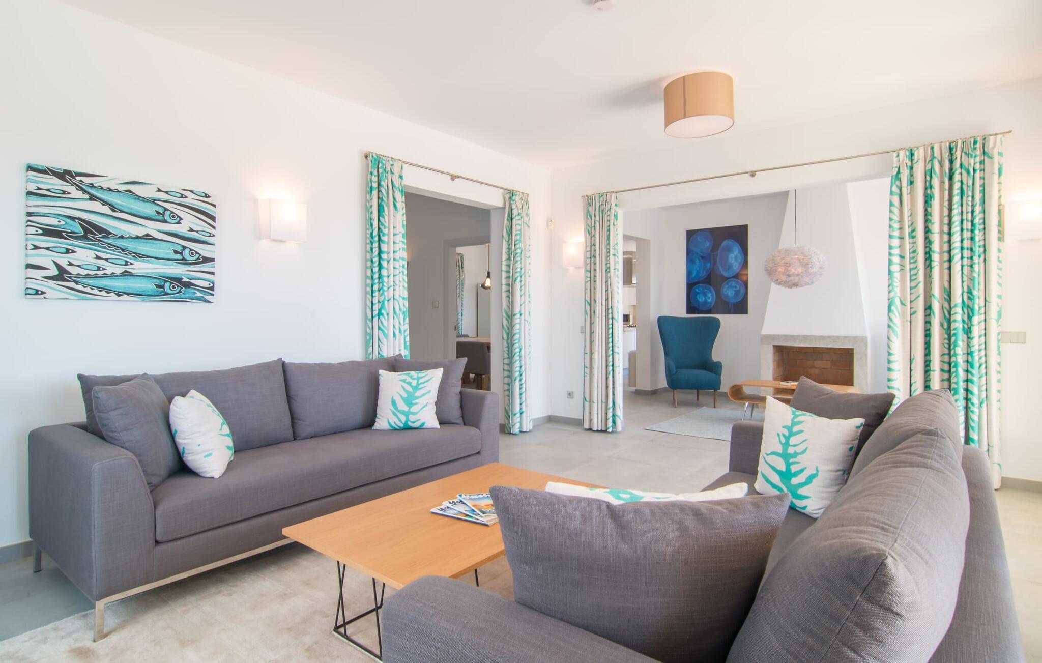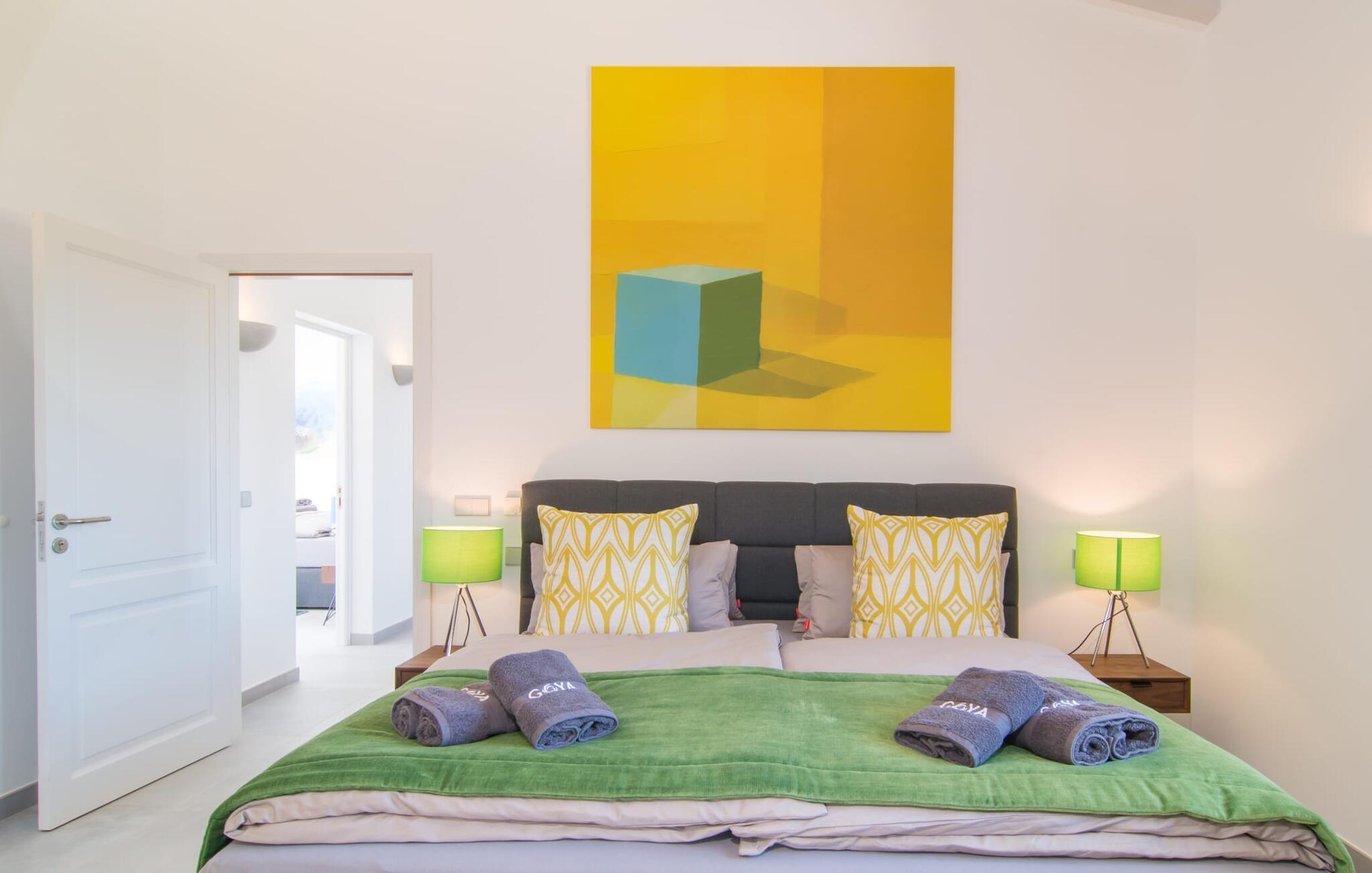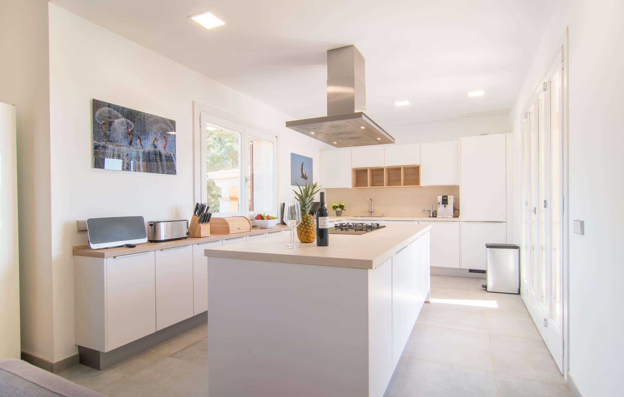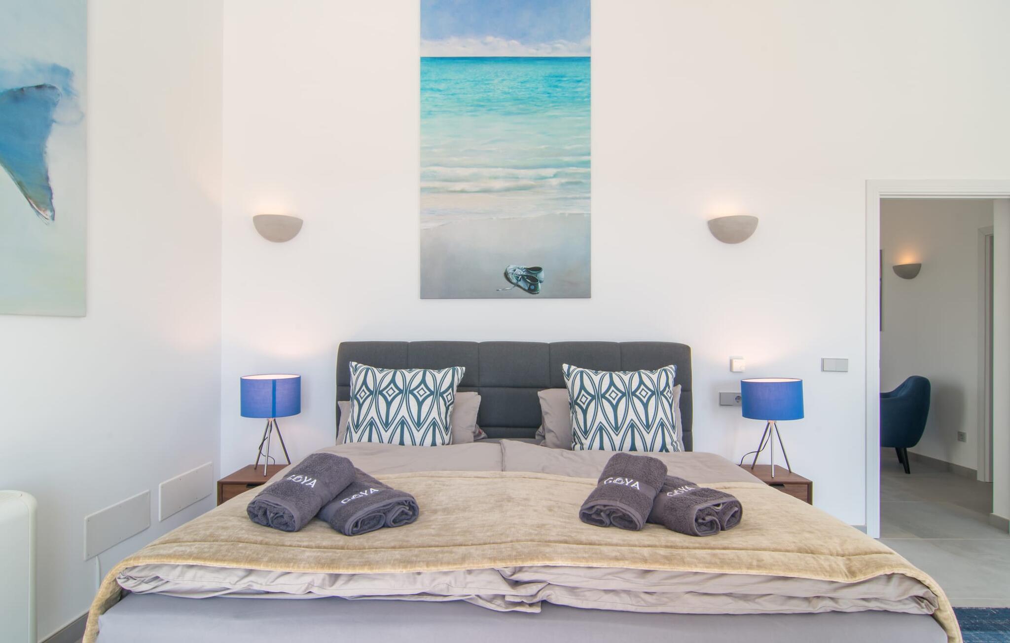 Hell, fröhlich, modern und exklusiv – die perfekten Worte, um das Interieur dieser Villa zu beschreiben. Das gemütliche Wohnzimmer im Erdgeschoss lädt zum Entspannen ein und in einem der Sessel des Kaminzimmers findet bestimmt jeder seinen Lieblingsplatz. Es ist direkt mit dem Wohnzimmer verbunden und kann durch einen Vorhang abgetrennt werden. Vom Kaminzimmer aus gelangt man in den Essbereich mit offener Küche. Alle Gäste können auf den bequemen Stühlen am großen Tisch zusammensitzen und ein gemeinsames Essen genießen. Die weiße Küche ist – im Einklang mit dem Rest der Villa – von ausgezeichneter Qualität und mit allen Annehmlichkeiten ausgestattet. Alles was Sie brauchen, finden Sie hier. Inklusive großer Spülmaschine und schickem Herd, der in eine Kochstation integriert ist. Im Erdgeschoss stehen den Gästen zwei Doppelzimmer mit komfortablen Boxspringbetten (auch behindertengerecht) zur Verfügung, zudem verfügt jedes Schlafzimmer über ein eigenes Bad en suite mit großen Duschen. Das hochwertige Flair der Villa setzt sich auch im Obergeschoss fort. Es gibt vier weitere geräumige Doppelzimmer mit eigenem Bad – zwei davon mit Badewanne. Einige der Schlafzimmer verfügen über einen kleinen Eingangsbereich oder eine schöne Schreibecke und alle haben Zugang zu den Balkonen des Hauses, die mit gemütlichen Gartenmöbeln ausgestattet sind.