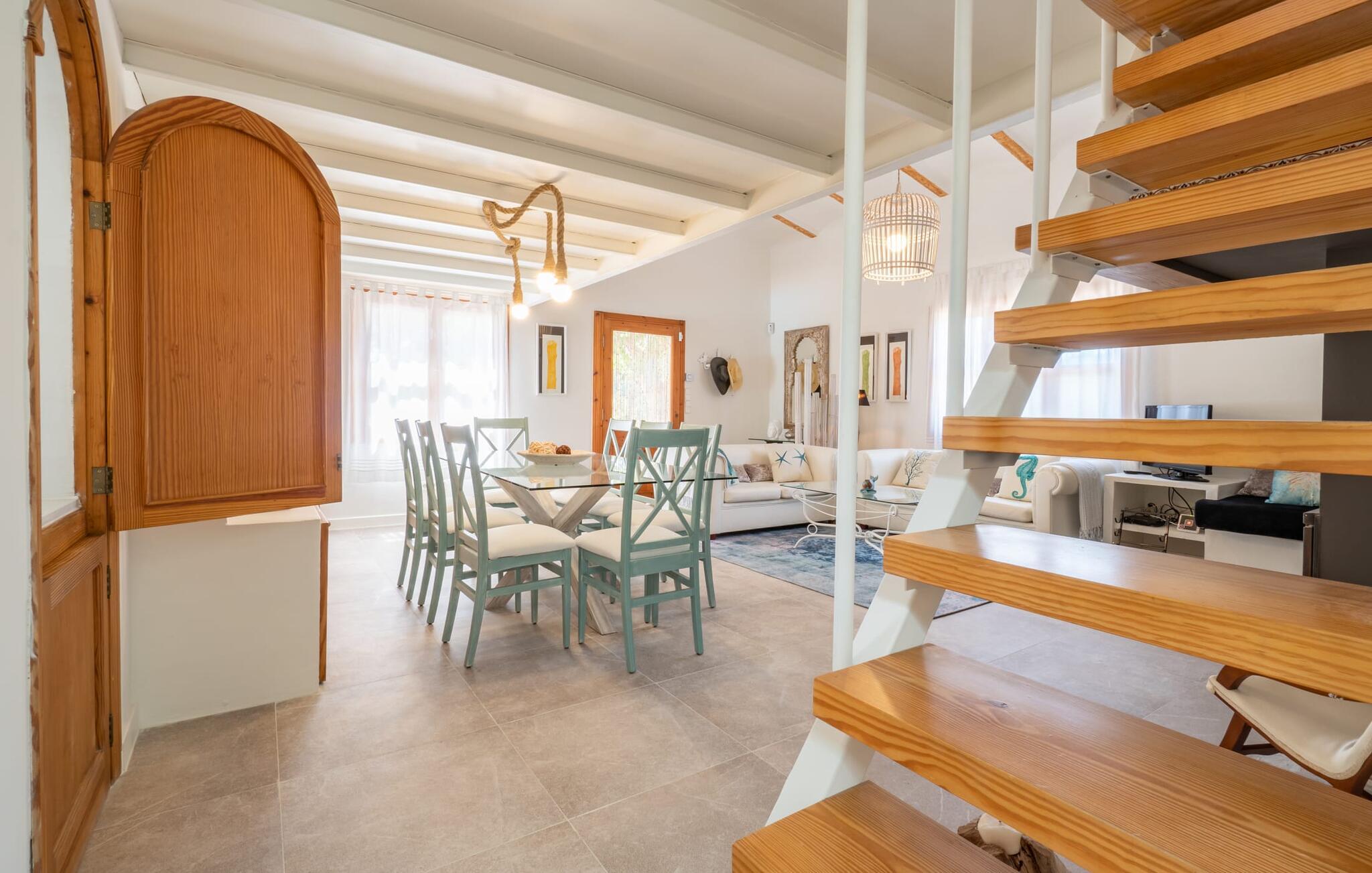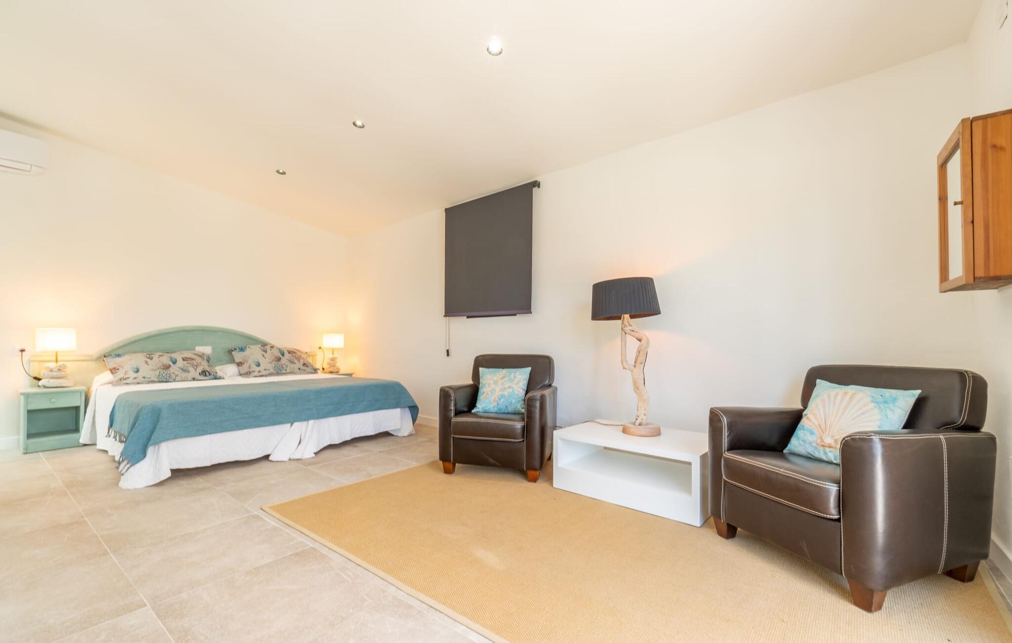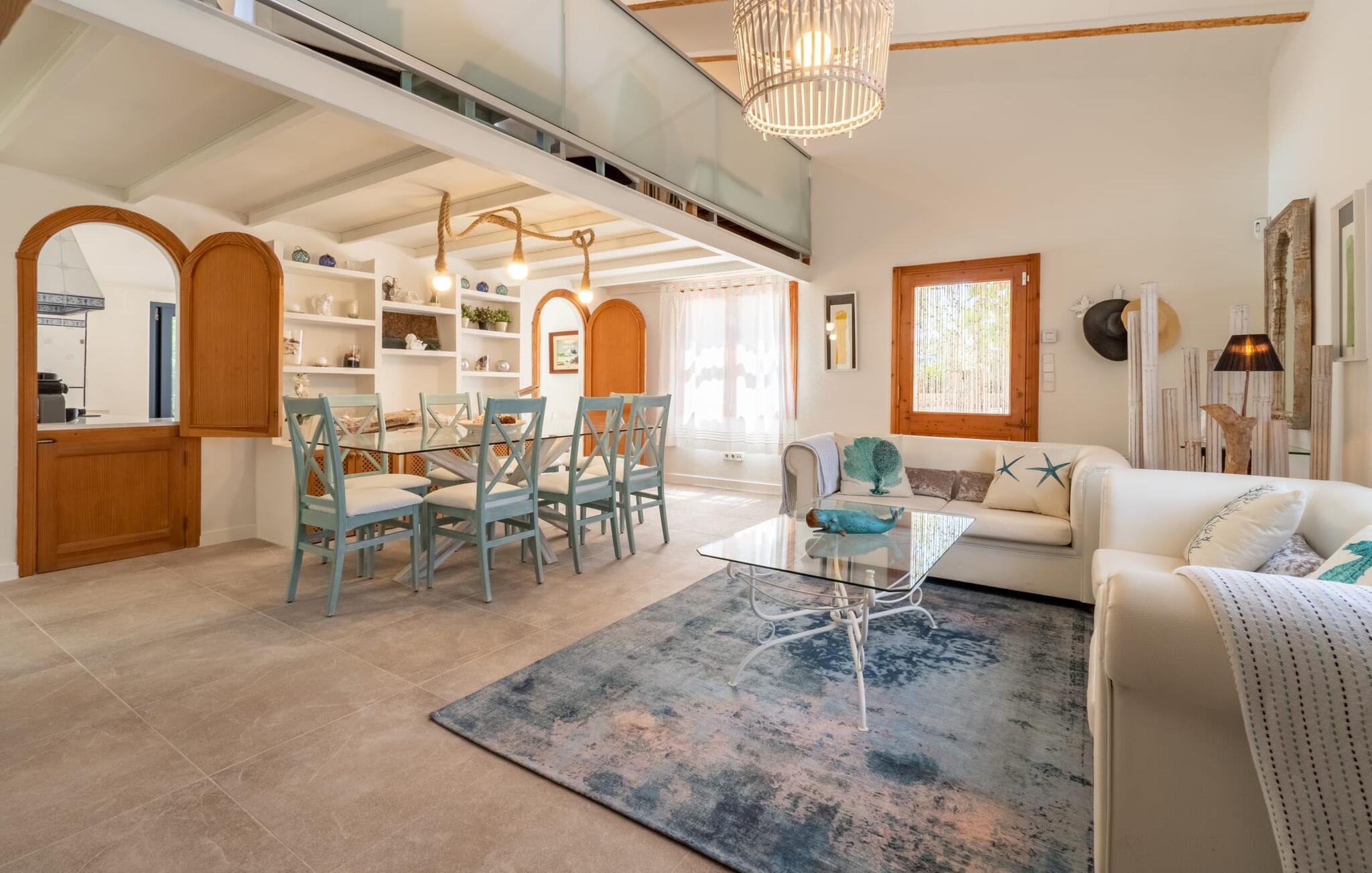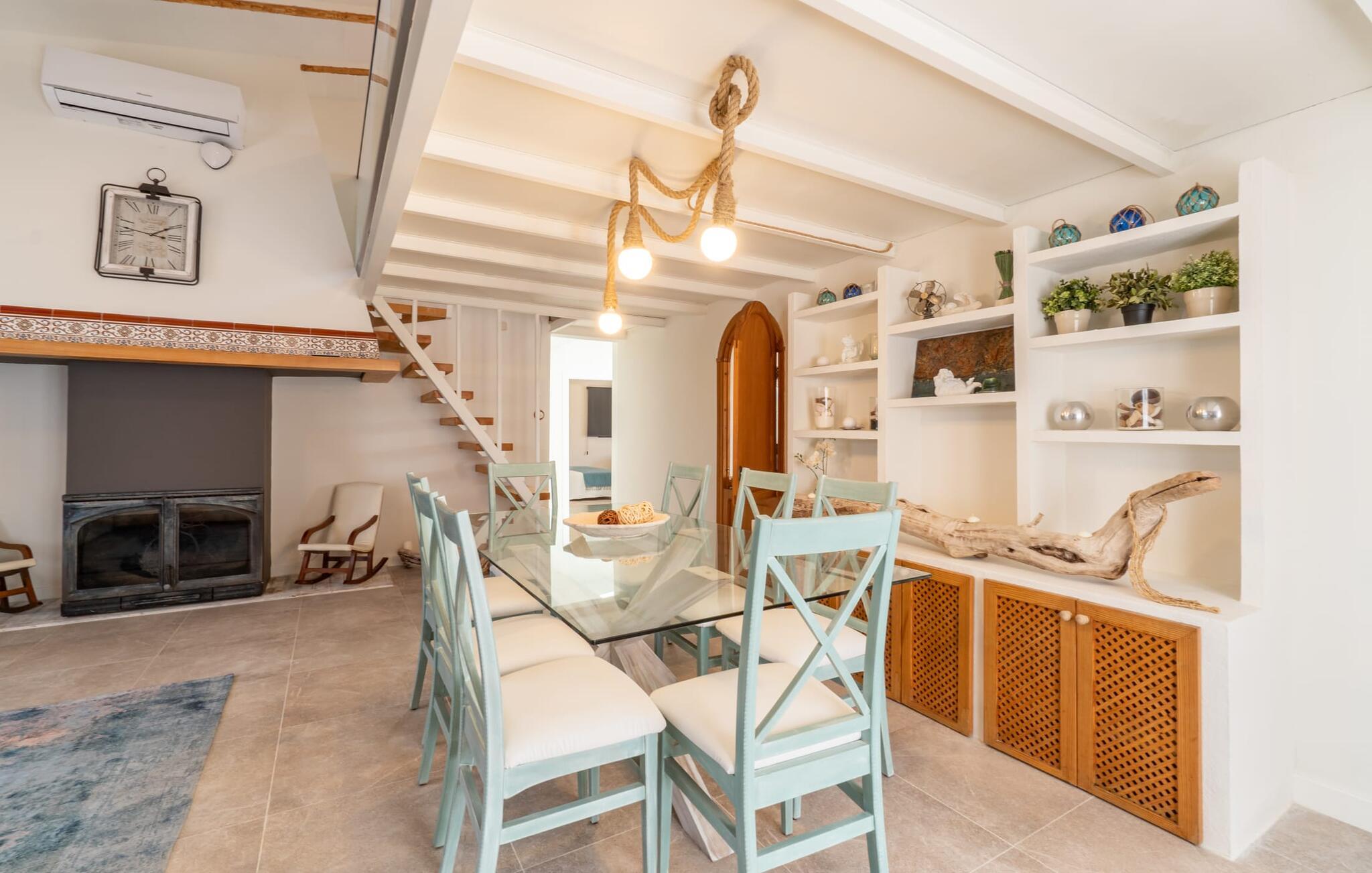 Das Innere des Bauernhauses umgibt ein wunderbar maritimes Flair. Farben und Dekoration signalisieren unmissverständlich: Hier sind Sie nah am Meer. Und so haben Sie auch dann, wenn Sie keinen Strandtag haben, die Meeresbrise immer dabei. Im Erdgeschoss befindet sich ein großzügiges Wohn-/Esszimmer sowie die voll ausgestattete Küche, in der vor dem riesigen bodentiefen Fenster Platz für einen weiteren Esstisch ist. Auf dieser Wohnebene befinden sich auch drei der vier Schlafzimmer und drei Badezimmer, davon zwei en Suite. Schlafzimmer und Badezimmer punkten mit einem modernen und dennoch zeitlosen Stil, der sich durch klare Formen, Farbharmonie und Leichtigkeit auszeichnet. Besonders originell ist die vierte Schlafgelegenheit im ersten Stock mit zwei Einzelbetten, die sich auf einer Art offener Galerie befinden – sicherlich besonders beliebt bei den kleinen Feriengästen. Wir geben diesem Ferienhaus auf Mallorca unsere uneingeschränkte Empfehlung!