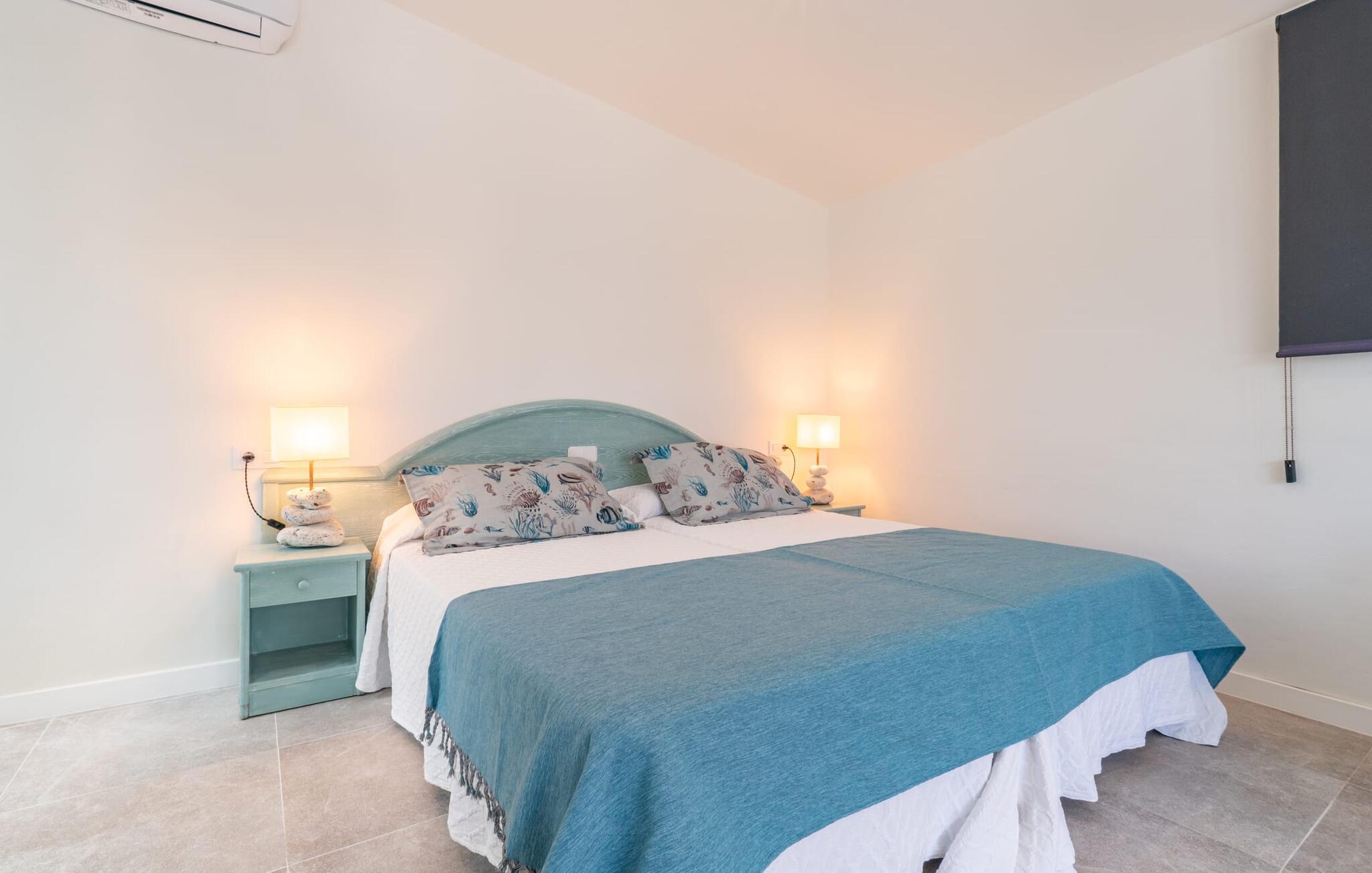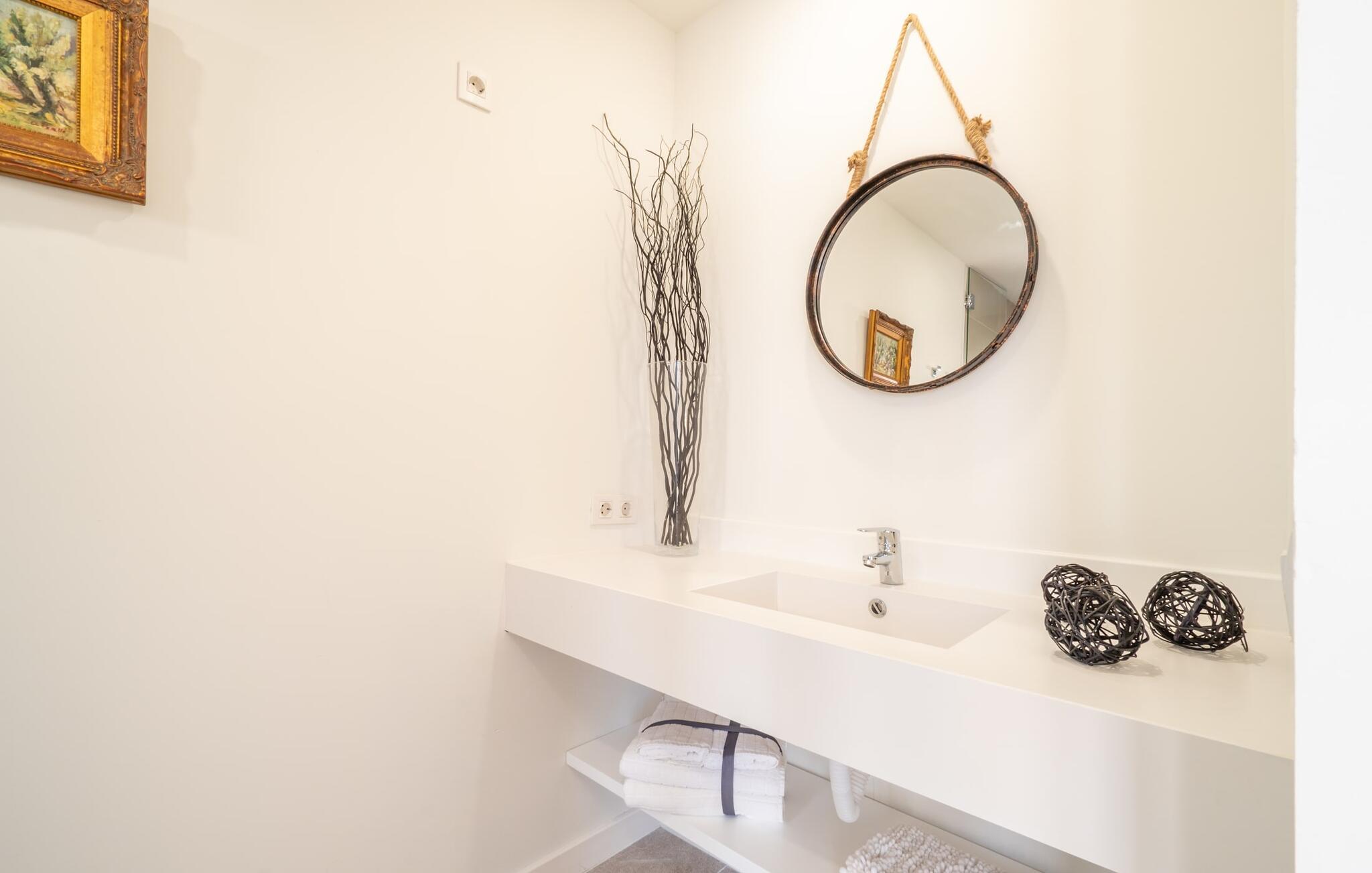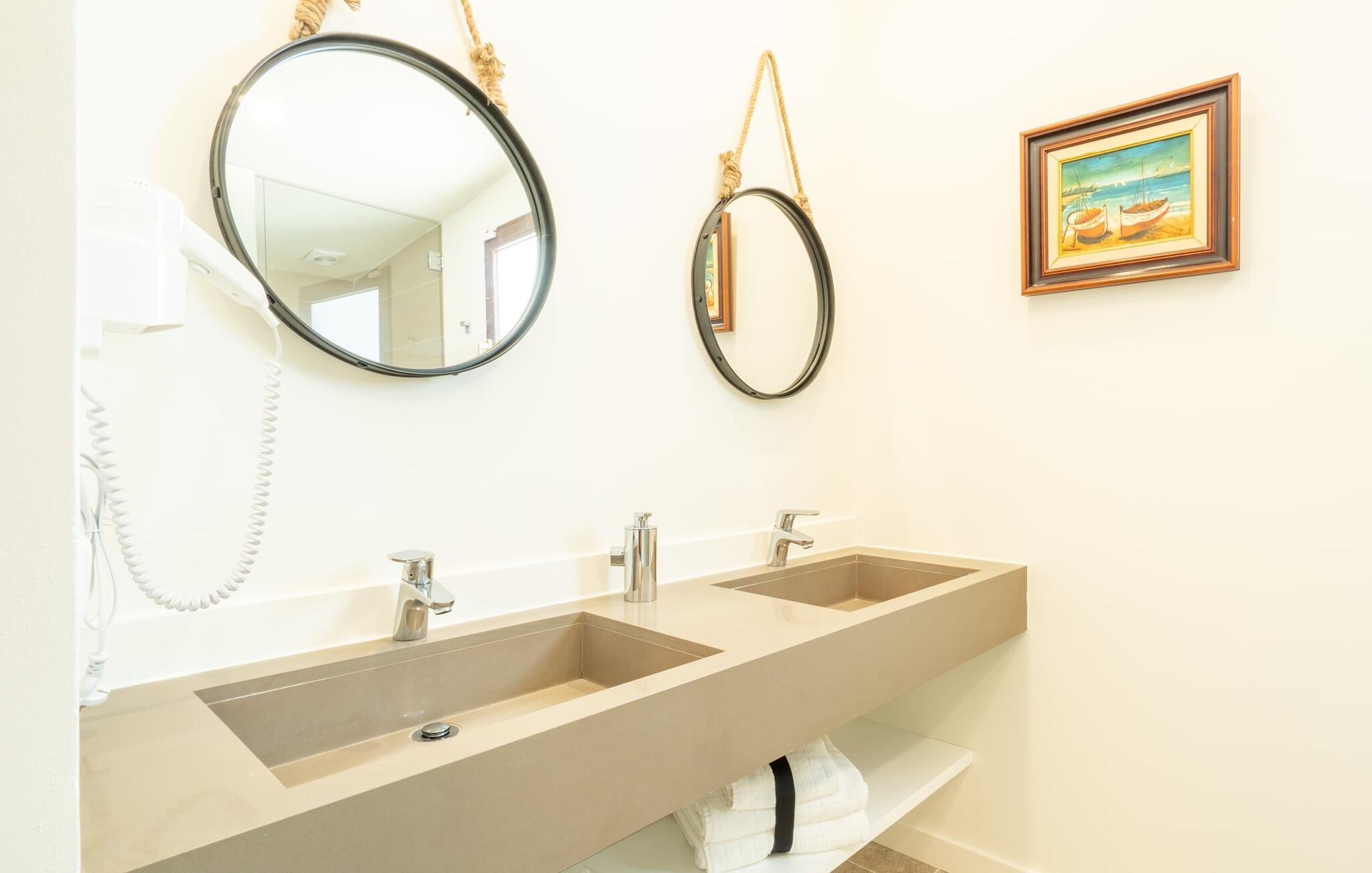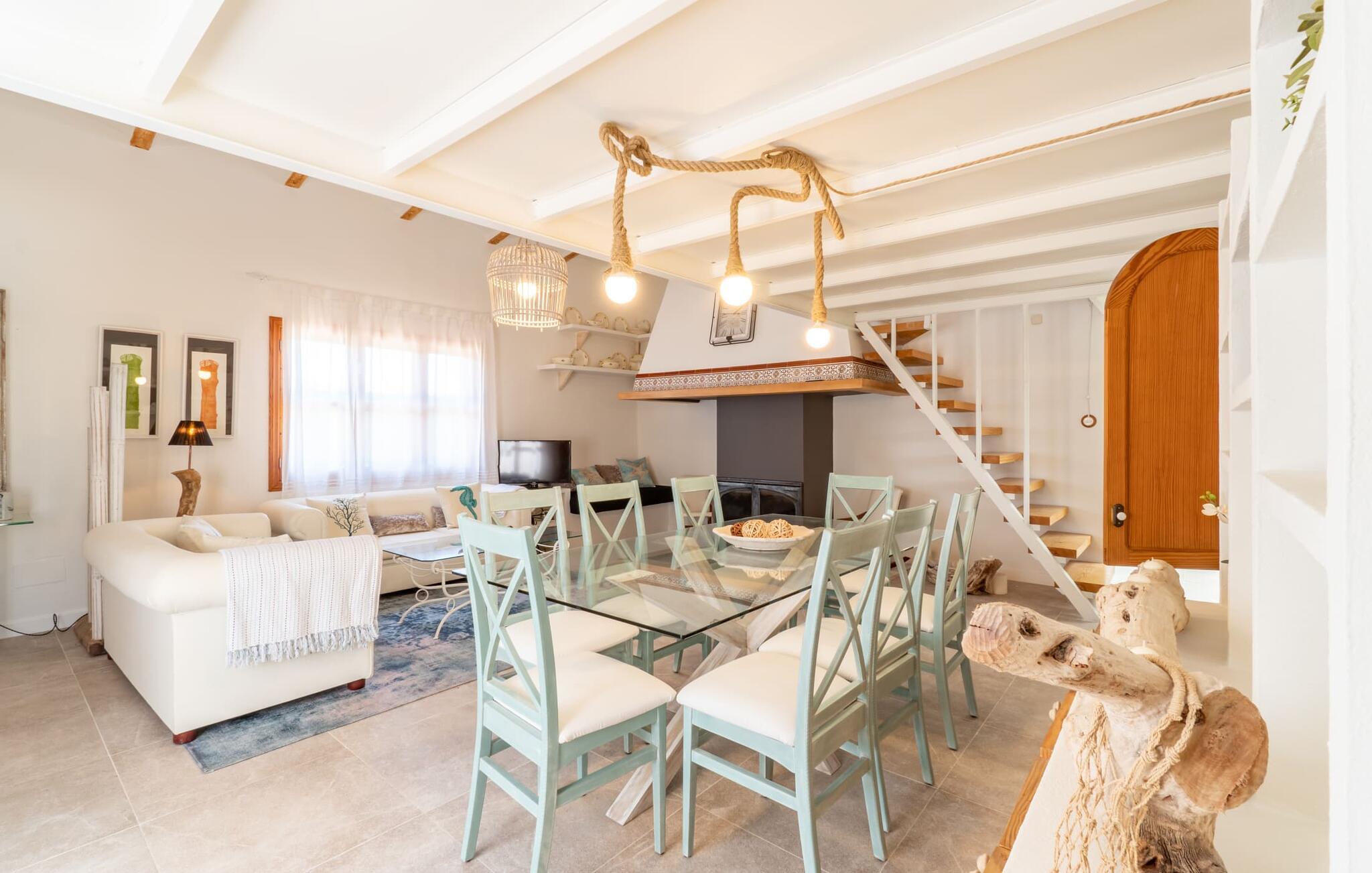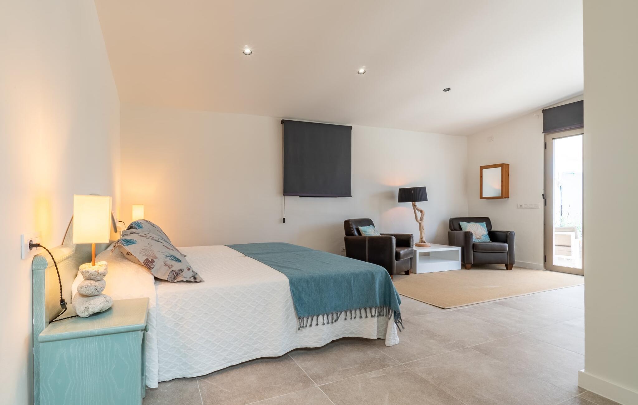 Das Innere des Bauernhauses umgibt ein wunderbar maritimes Flair. Farben und Dekoration signalisieren unmissverständlich: Hier sind Sie nah am Meer. Und so haben Sie auch dann, wenn Sie keinen Strandtag haben, die Meeresbrise immer dabei. Im Erdgeschoss befindet sich ein großzügiges Wohn-/Esszimmer sowie die voll ausgestattete Küche, in der vor dem riesigen bodentiefen Fenster Platz für einen weiteren Esstisch ist. Auf dieser Wohnebene befinden sich auch drei der vier Schlafzimmer und drei Badezimmer, davon zwei en Suite. Schlafzimmer und Badezimmer punkten mit einem modernen und dennoch zeitlosen Stil, der sich durch klare Formen, Farbharmonie und Leichtigkeit auszeichnet. Besonders originell ist die vierte Schlafgelegenheit im ersten Stock mit zwei Einzelbetten, die sich auf einer Art offener Galerie befinden – sicherlich besonders beliebt bei den kleinen Feriengästen. Wir geben diesem Ferienhaus auf Mallorca unsere uneingeschränkte Empfehlung!