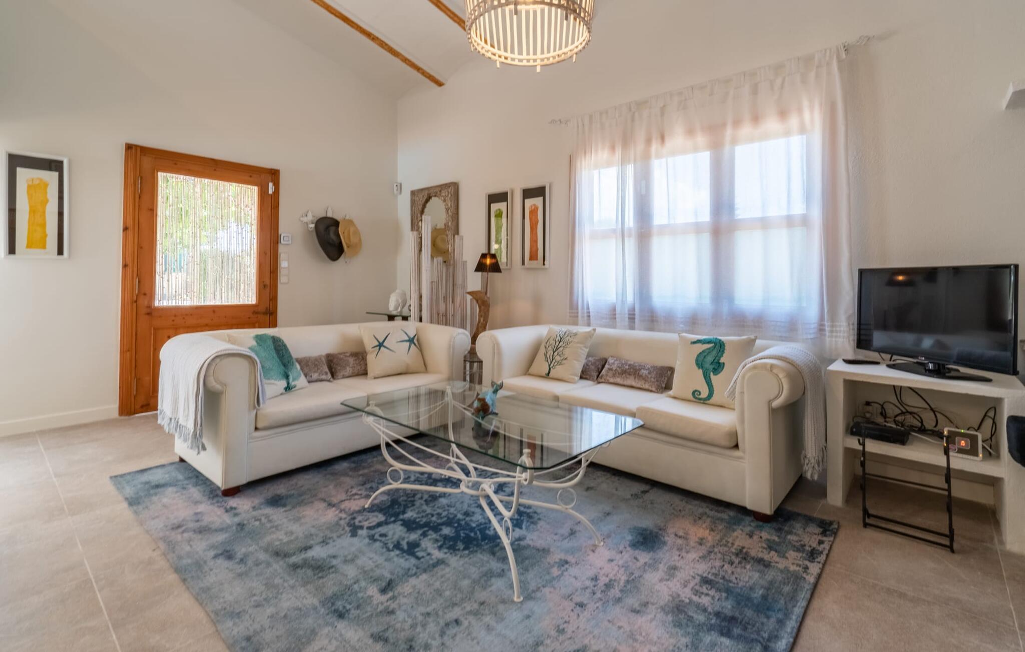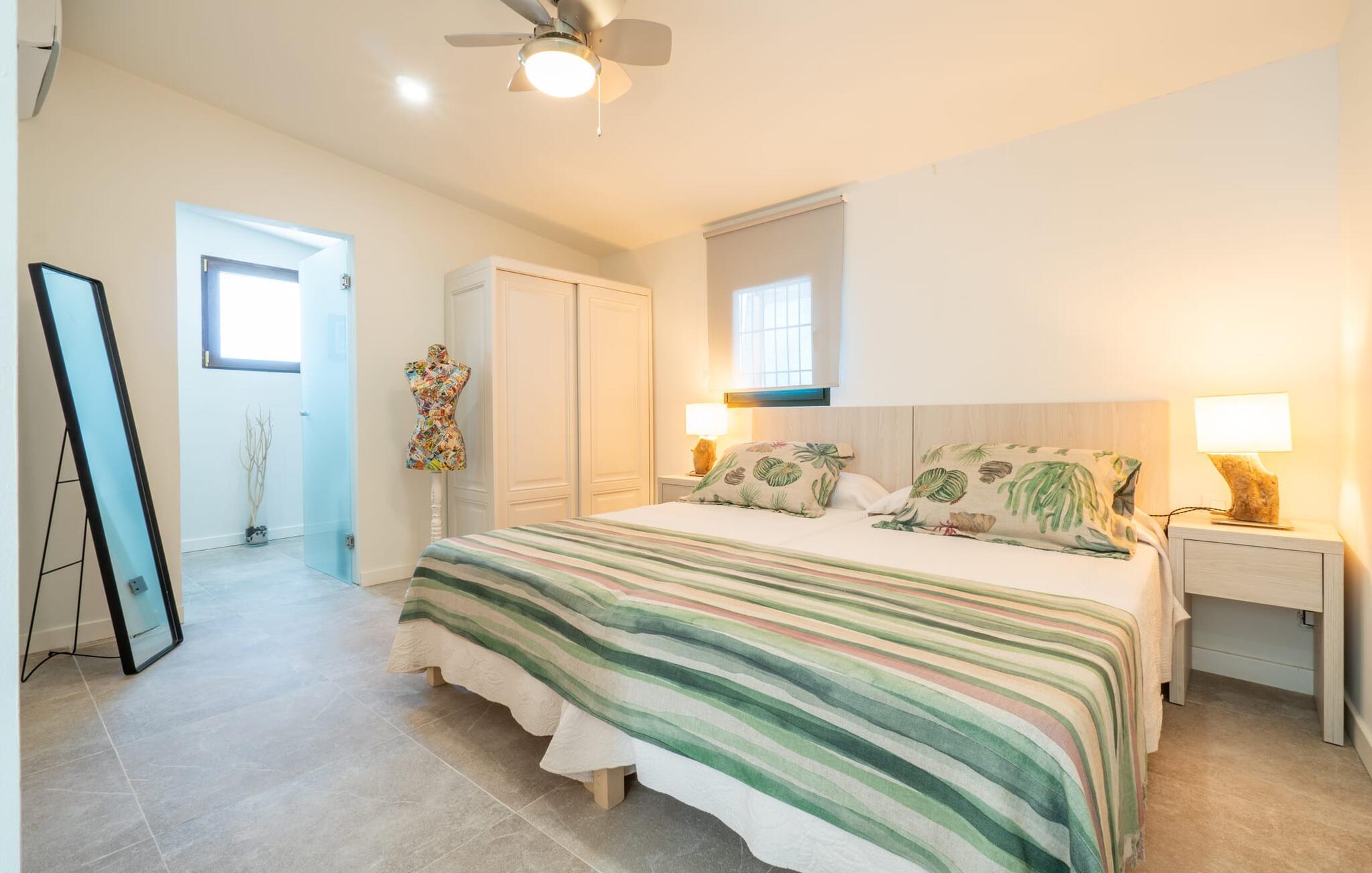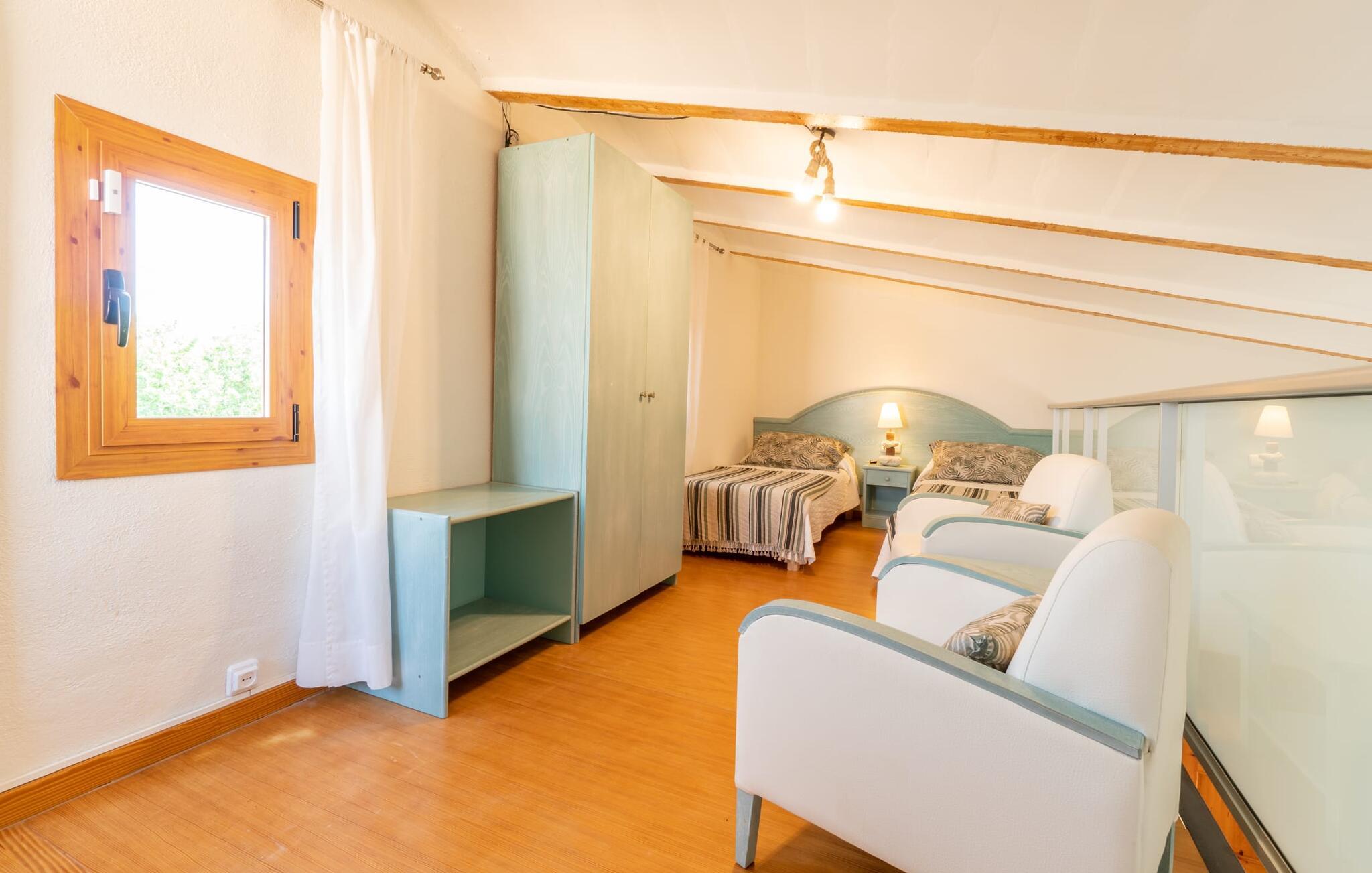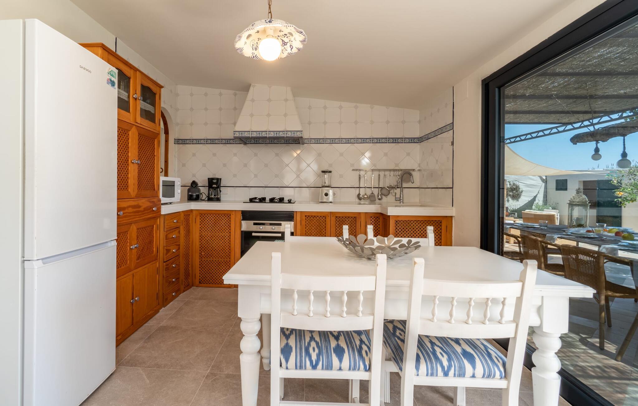 Das Innere des Bauernhauses umgibt ein wunderbar maritimes Flair. Farben und Dekoration signalisieren unmissverständlich: Hier sind Sie nah am Meer. Und so haben Sie auch dann, wenn Sie keinen Strandtag haben, die Meeresbrise immer dabei. Im Erdgeschoss befindet sich ein großzügiges Wohn-/Esszimmer sowie die voll ausgestattete Küche, in der vor dem riesigen bodentiefen Fenster Platz für einen weiteren Esstisch ist. Auf dieser Wohnebene befinden sich auch drei der vier Schlafzimmer und drei Badezimmer, davon zwei en Suite. Schlafzimmer und Badezimmer punkten mit einem modernen und dennoch zeitlosen Stil, der sich durch klare Formen, Farbharmonie und Leichtigkeit auszeichnet. Besonders originell ist die vierte Schlafgelegenheit im ersten Stock mit zwei Einzelbetten, die sich auf einer Art offener Galerie befinden – sicherlich besonders beliebt bei den kleinen Feriengästen. Wir geben diesem Ferienhaus auf Mallorca unsere uneingeschränkte Empfehlung!