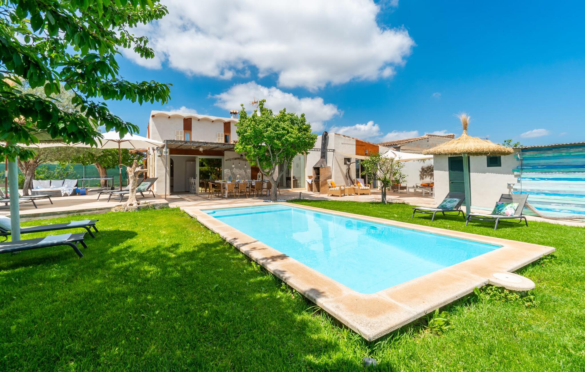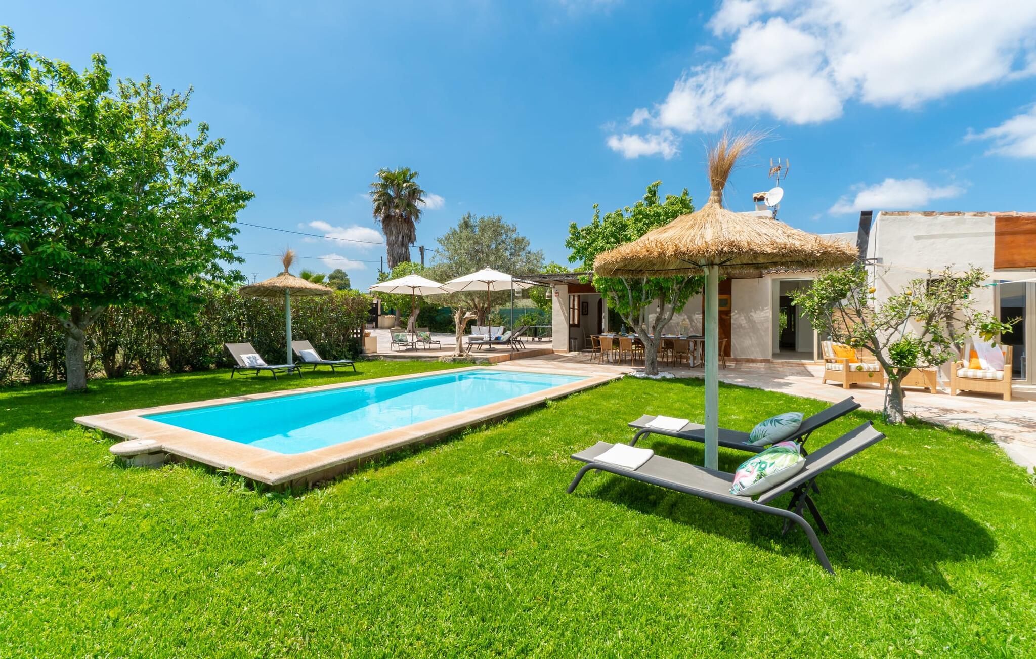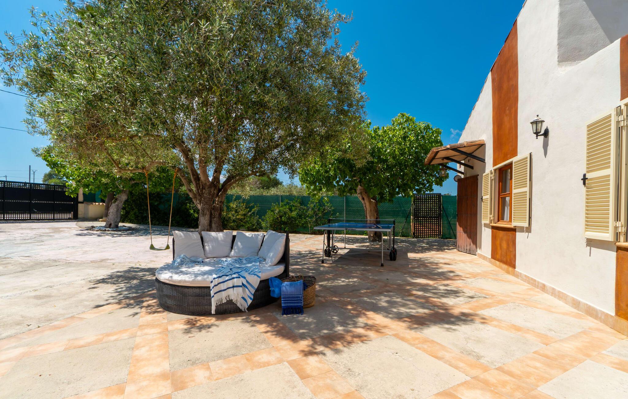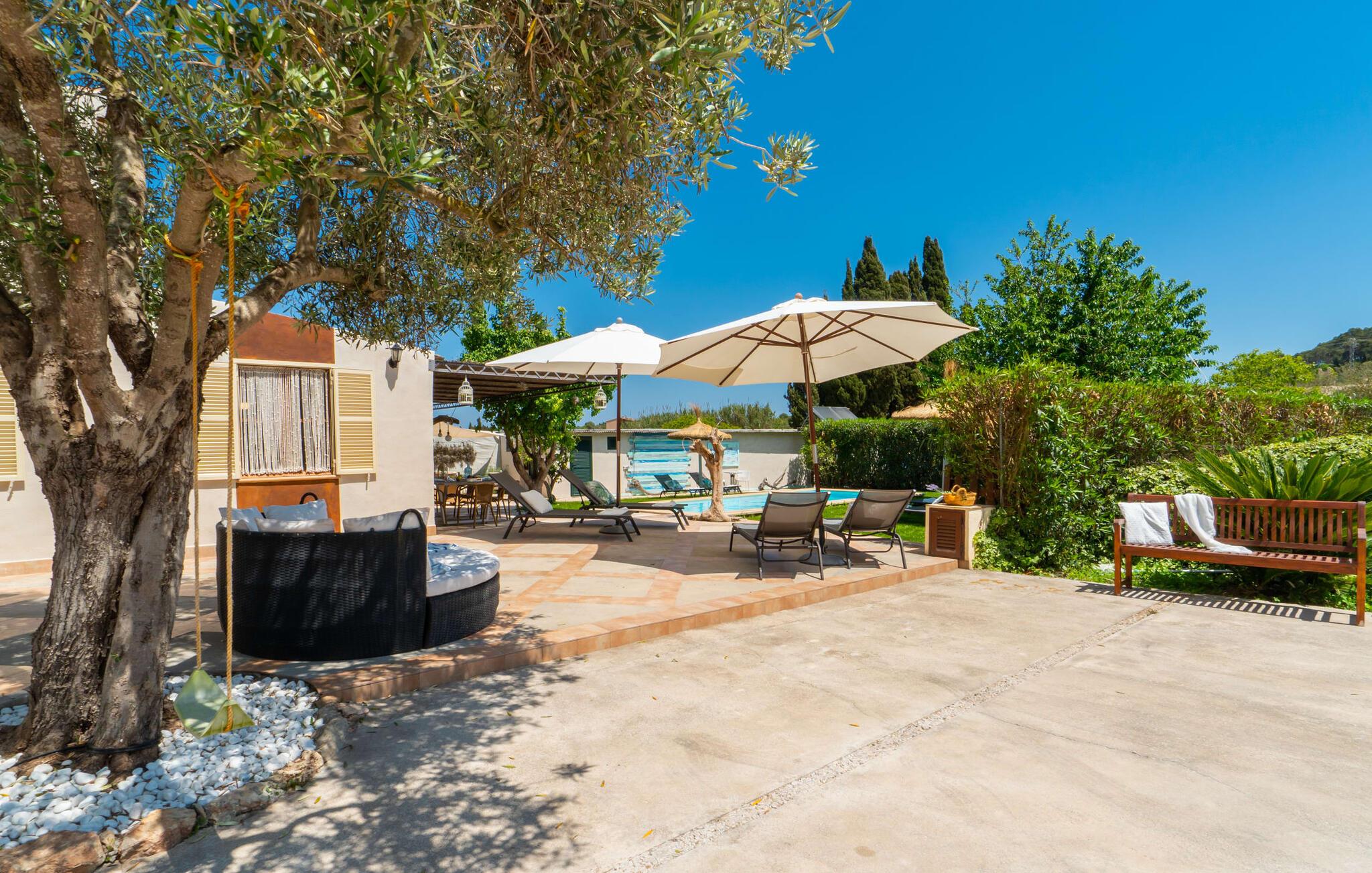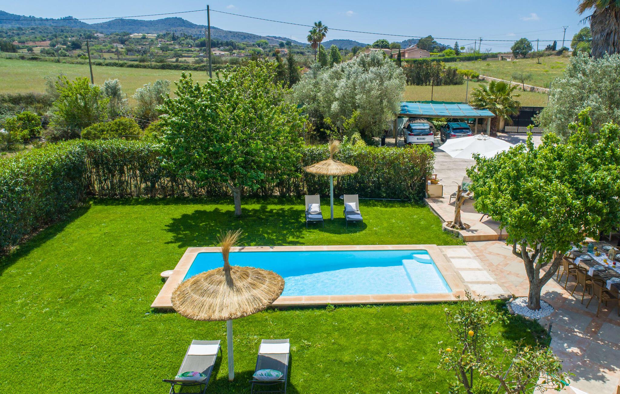 Frische, leichte Sommerstimmung verbreitet dieses Bauernhaus auf Mallorca, das ideal für eine oder zwei Familien ist. Der abwechslungsreiche, völlig private Gartenbereich bietet viele Möglichkeiten, auf den Rasenflächen und Terrassen Ihren täglichen Outdoor-Lieblingsplatz zu wählen. Vielleicht liegt es direkt am Haus, unter dem Olivenbaum, wo man es sich auf der Polyrattan-Sonneninsel so gemütlich machen kann? Oder ist es vielleicht die schöne Holzbank, auf der zwei oder drei Personen zusammensitzen können? Oder ist es der Esstisch, der zum gemeinsamen Essen, zum Grillen einlädt? Überdacht mit einem Sonnensegel schmeckt der Nachmittagskaffee oder ein kühles Getränk besonders lecker in der kleinen Lounge oder von den Sesseln aus, die Sie je nach Tageszeit an ein sonniges oder schattiges Plätzchen stellen möchten. Ein Lieblingsplatz wird nicht zuletzt der Pool sein, der gerade an heißen Tagen eine willkommene Abkühlung verspricht. Eine praktische Außendusche steht ebenso zur Verfügung wie ein Außenbad – Sie werden es in Ihrem Urlaub bestimmt zu schätzen wissen. Auf den bereitgestellten bequemen Liegen können Sie sich sonnen, entspannen und entspannen.