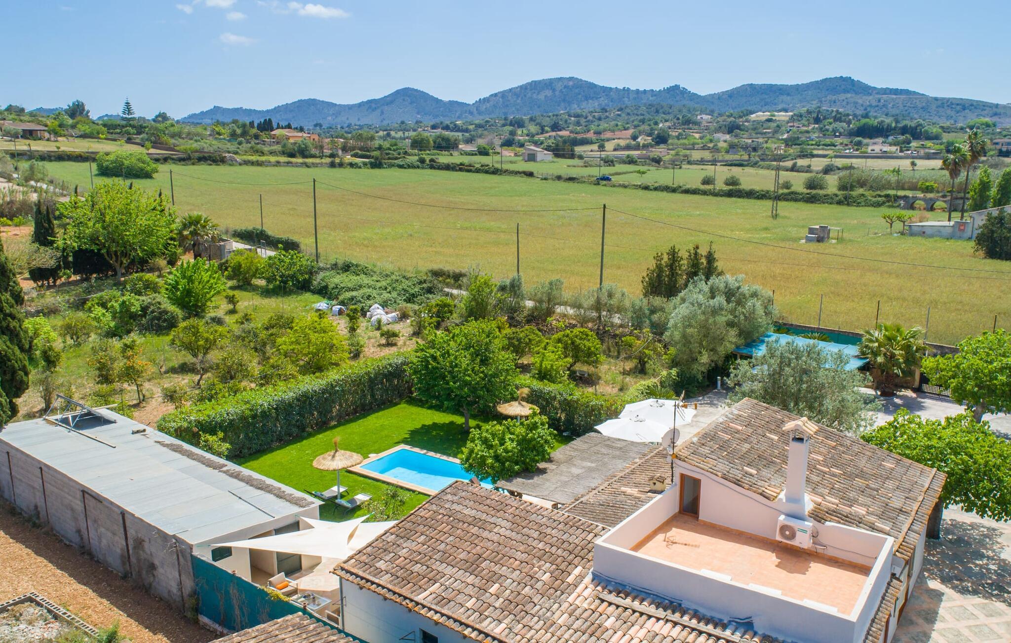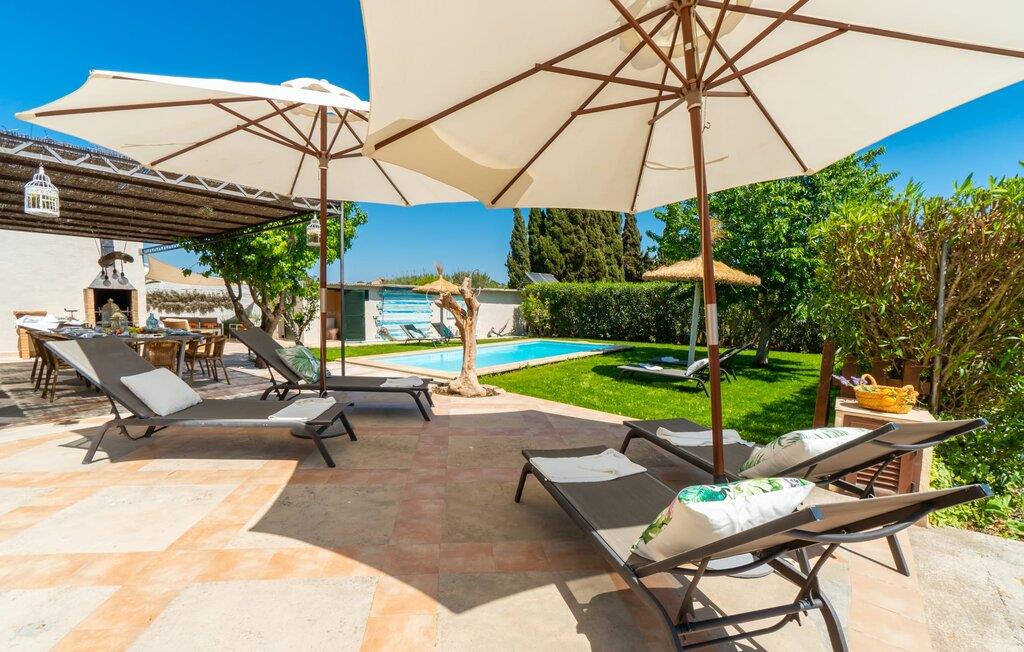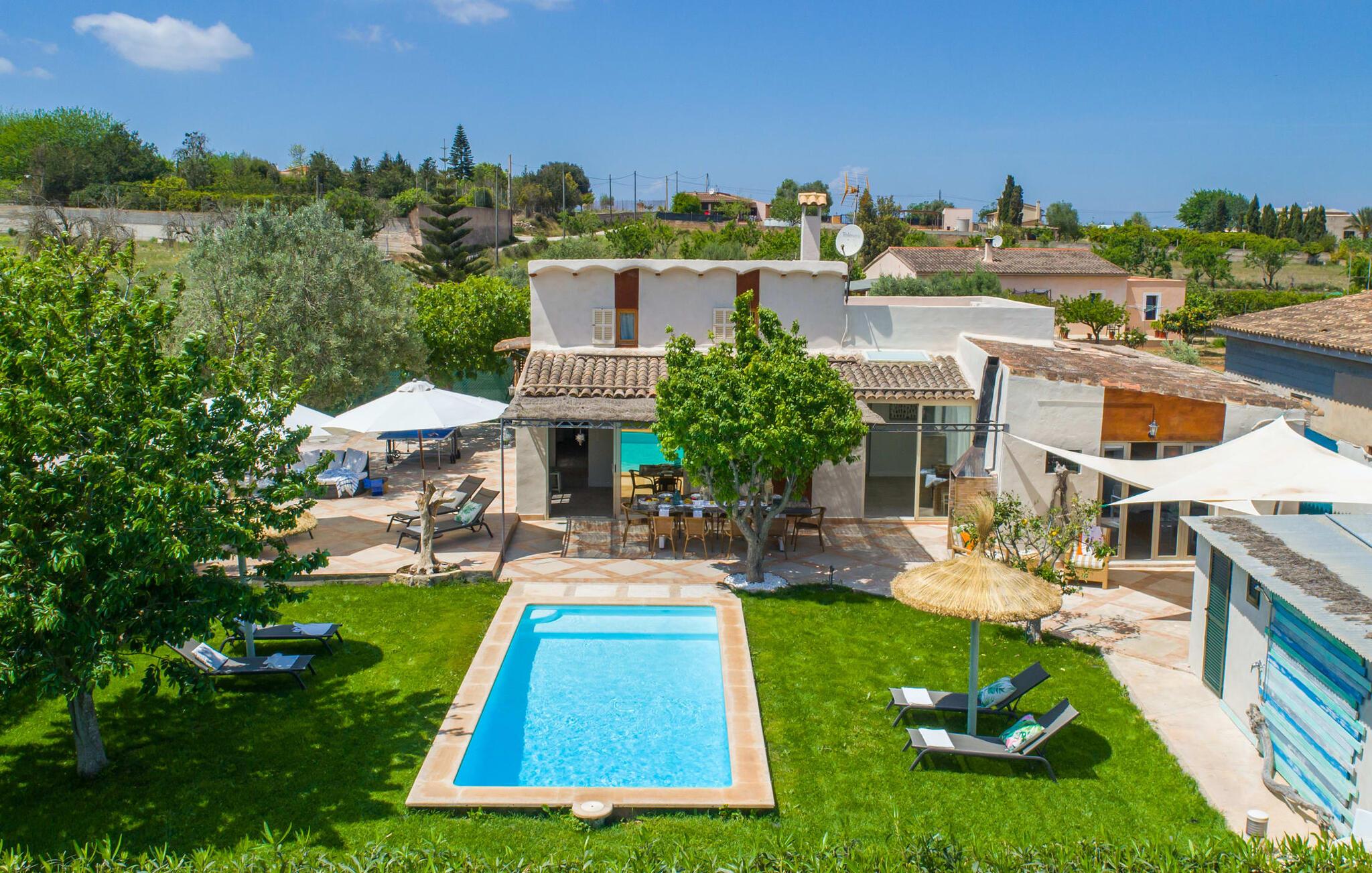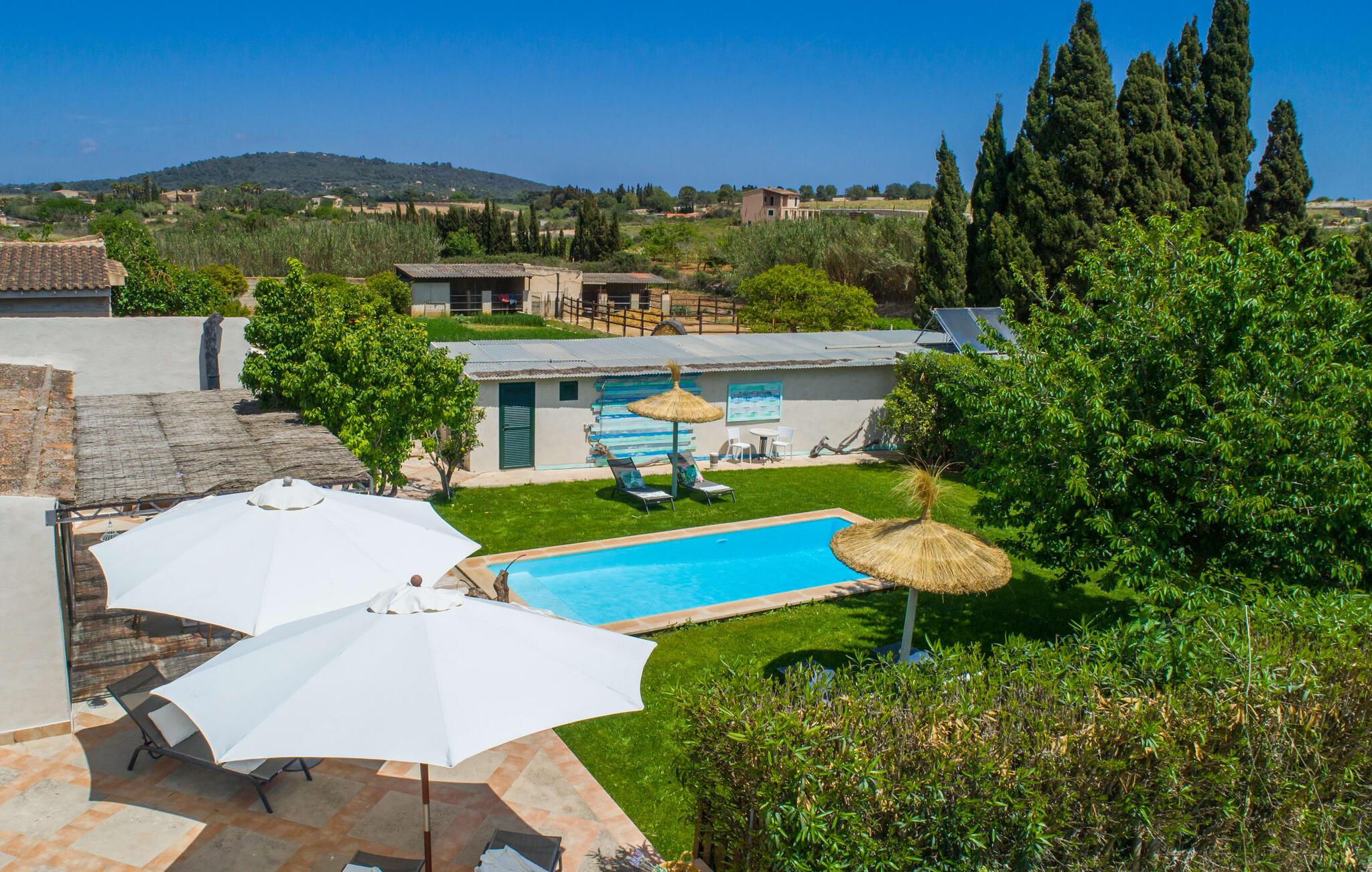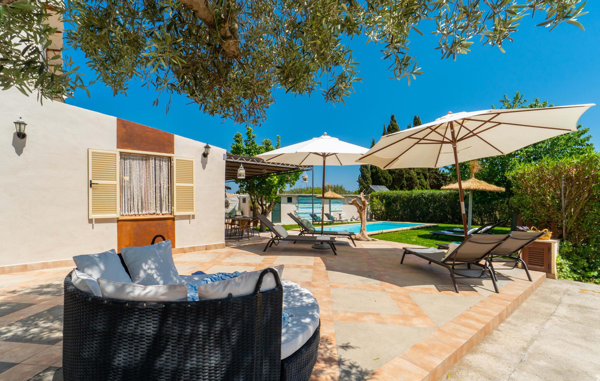 Frische, leichte Sommerstimmung verbreitet dieses Bauernhaus auf Mallorca, das ideal für eine oder zwei Familien ist. Der abwechslungsreiche, völlig private Gartenbereich bietet viele Möglichkeiten, auf den Rasenflächen und Terrassen Ihren täglichen Outdoor-Lieblingsplatz zu wählen. Vielleicht liegt es direkt am Haus, unter dem Olivenbaum, wo man es sich auf der Polyrattan-Sonneninsel so gemütlich machen kann? Oder ist es vielleicht die schöne Holzbank, auf der zwei oder drei Personen zusammensitzen können? Oder ist es der Esstisch, der zum gemeinsamen Essen, zum Grillen einlädt? Überdacht mit einem Sonnensegel schmeckt der Nachmittagskaffee oder ein kühles Getränk besonders lecker in der kleinen Lounge oder von den Sesseln aus, die Sie je nach Tageszeit an ein sonniges oder schattiges Plätzchen stellen möchten. Ein Lieblingsplatz wird nicht zuletzt der Pool sein, der gerade an heißen Tagen eine willkommene Abkühlung verspricht. Eine praktische Außendusche steht ebenso zur Verfügung wie ein Außenbad – Sie werden es in Ihrem Urlaub bestimmt zu schätzen wissen. Auf den bereitgestellten bequemen Liegen können Sie sich sonnen, entspannen und entspannen.