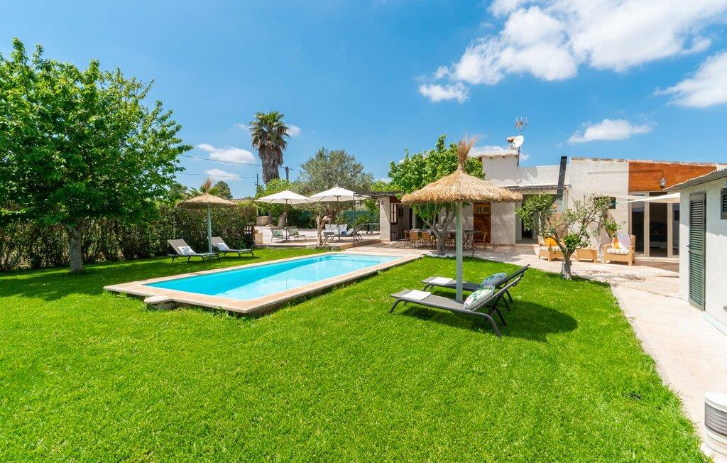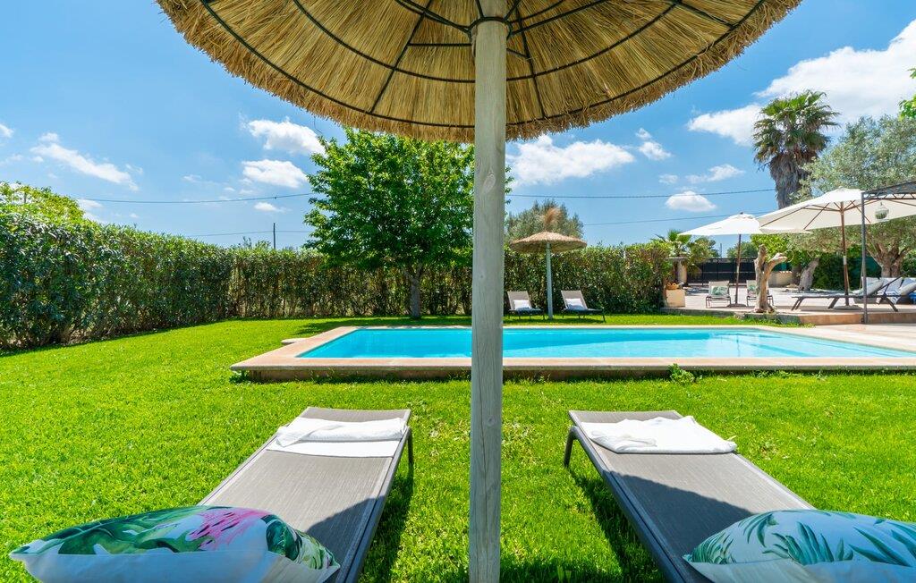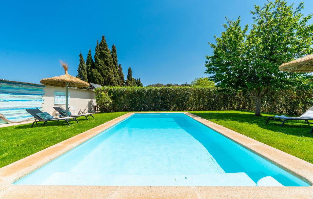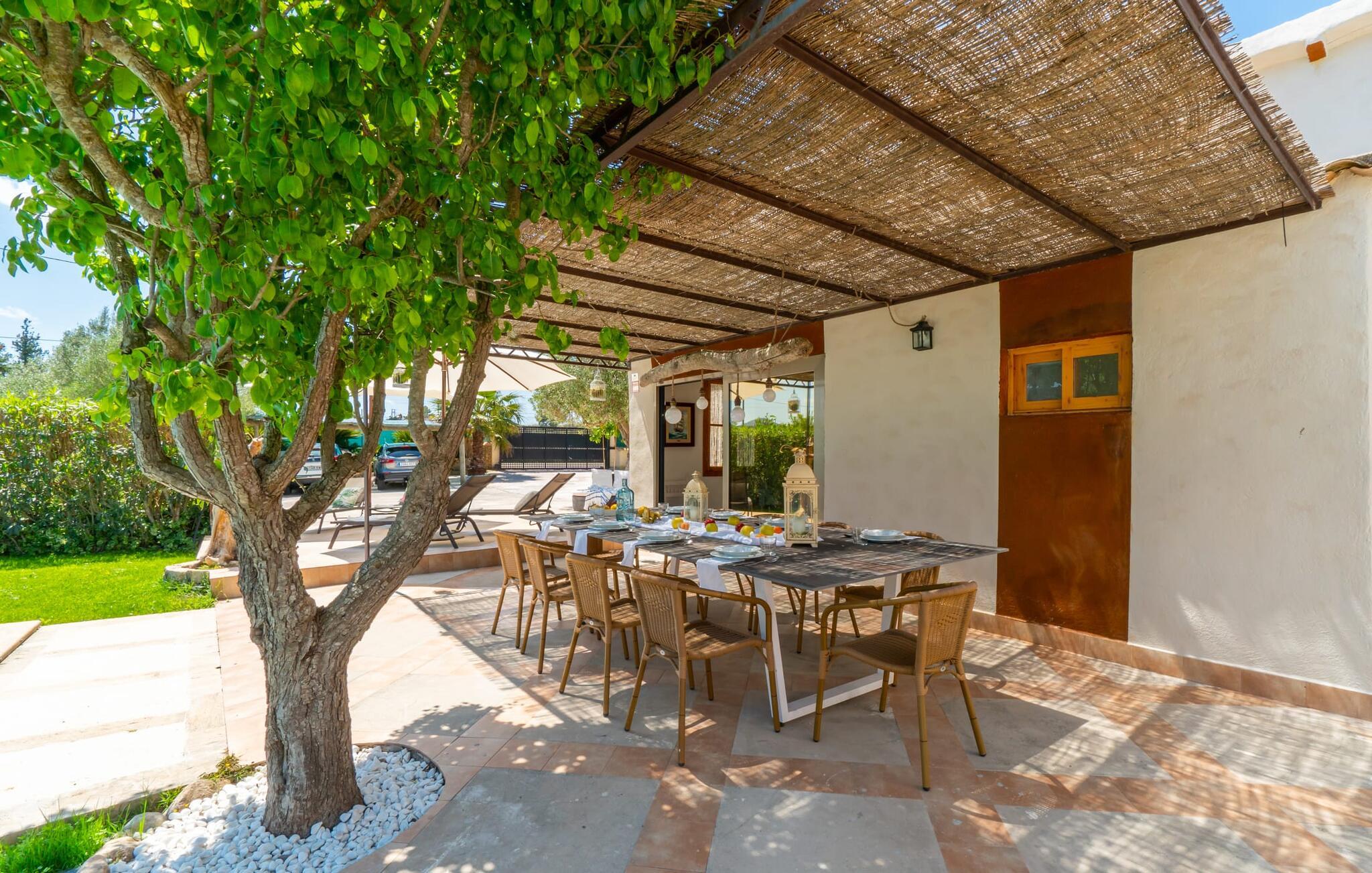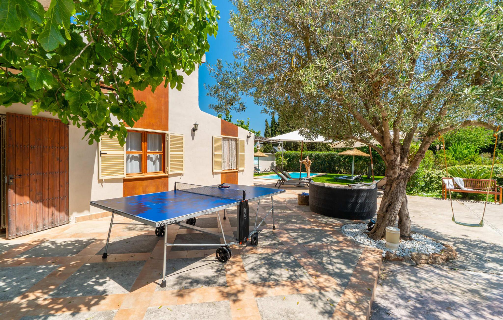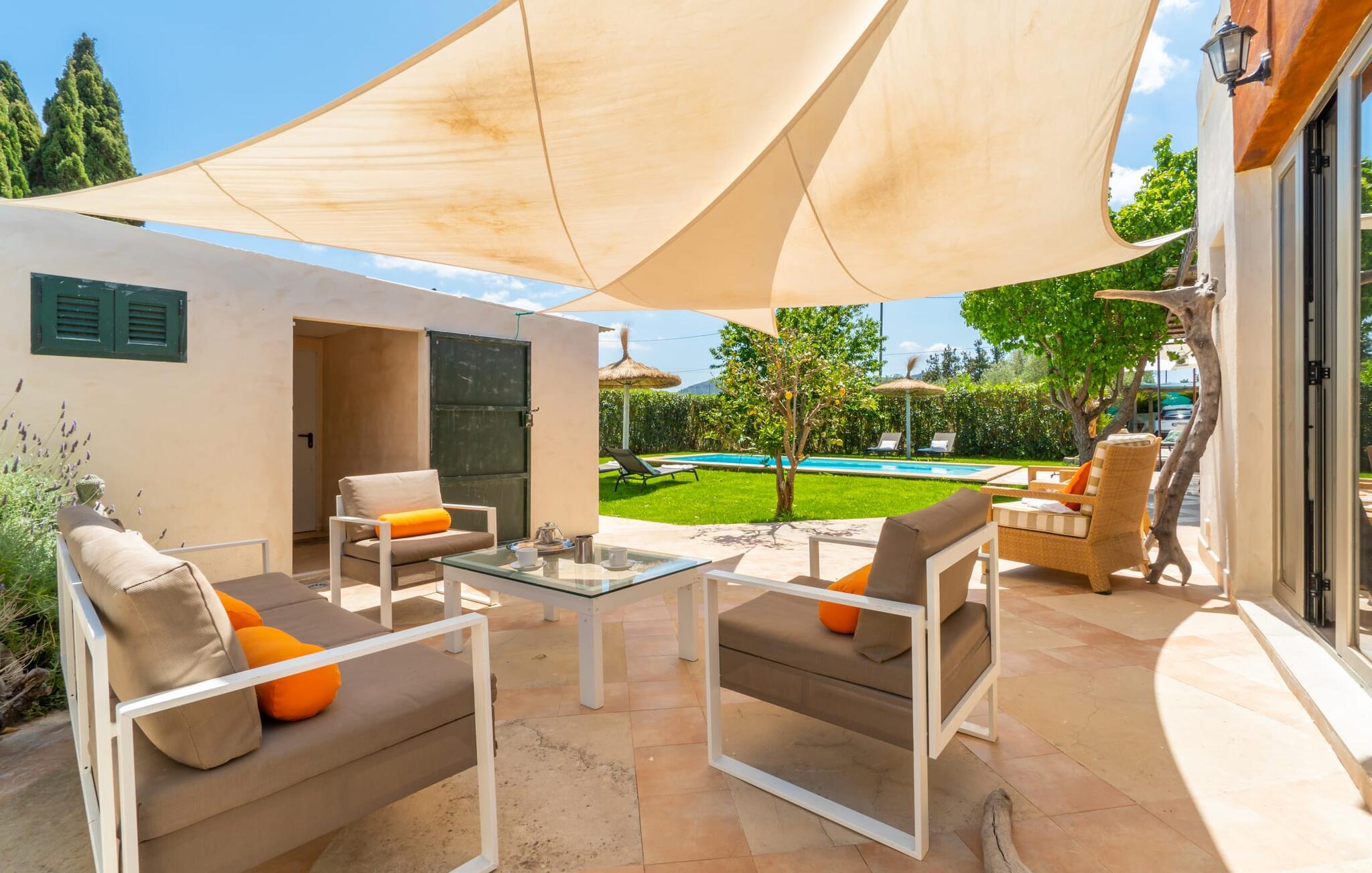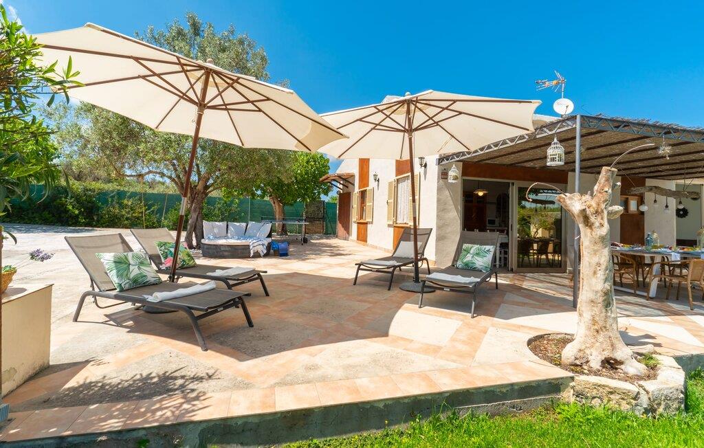 Frische, leichte Sommerstimmung verbreitet dieses Bauernhaus auf Mallorca, das ideal für eine oder zwei Familien ist. Der abwechslungsreiche, völlig private Gartenbereich bietet viele Möglichkeiten, auf den Rasenflächen und Terrassen Ihren täglichen Outdoor-Lieblingsplatz zu wählen. Vielleicht liegt es direkt am Haus, unter dem Olivenbaum, wo man es sich auf der Polyrattan-Sonneninsel so gemütlich machen kann? Oder ist es vielleicht die schöne Holzbank, auf der zwei oder drei Personen zusammensitzen können? Oder ist es der Esstisch, der zum gemeinsamen Essen, zum Grillen einlädt? Überdacht mit einem Sonnensegel schmeckt der Nachmittagskaffee oder ein kühles Getränk besonders lecker in der kleinen Lounge oder von den Sesseln aus, die Sie je nach Tageszeit an ein sonniges oder schattiges Plätzchen stellen möchten. Ein Lieblingsplatz wird nicht zuletzt der Pool sein, der gerade an heißen Tagen eine willkommene Abkühlung verspricht. Eine praktische Außendusche steht ebenso zur Verfügung wie ein Außenbad – Sie werden es in Ihrem Urlaub bestimmt zu schätzen wissen. Auf den bereitgestellten bequemen Liegen können Sie sich sonnen, entspannen und entspannen.