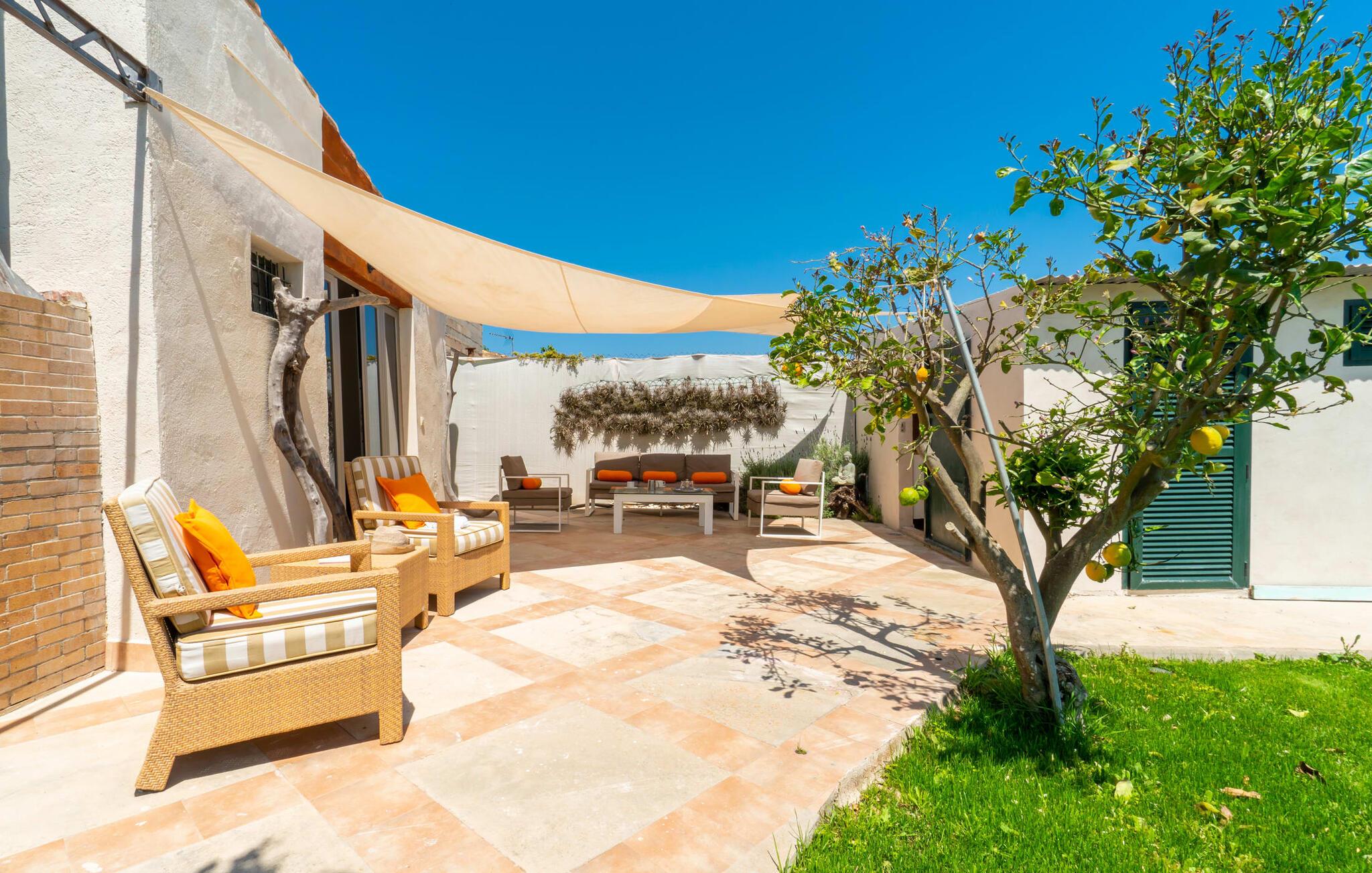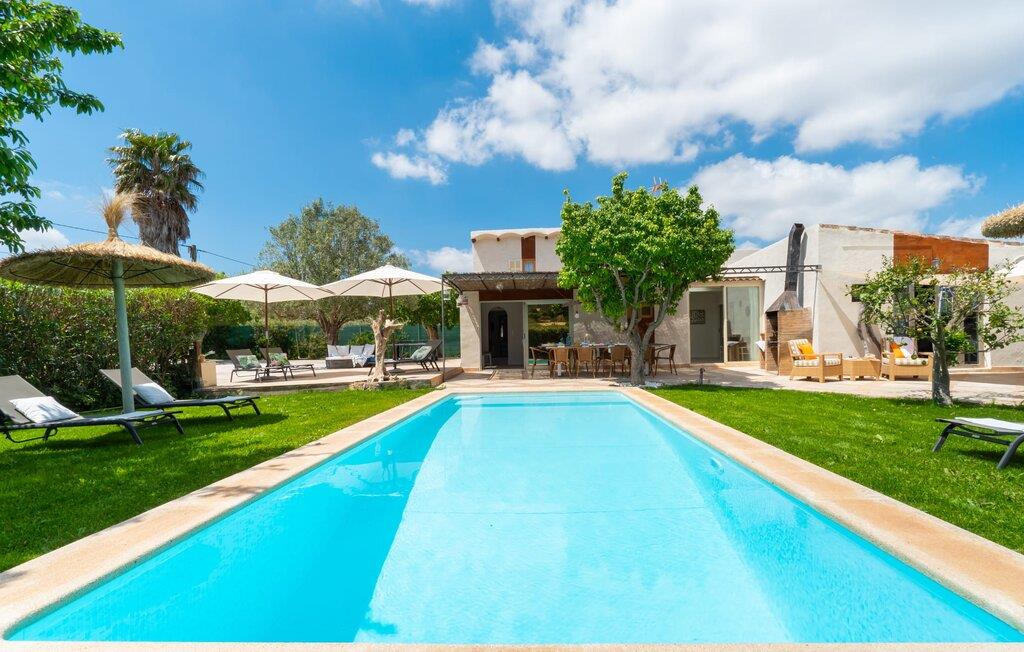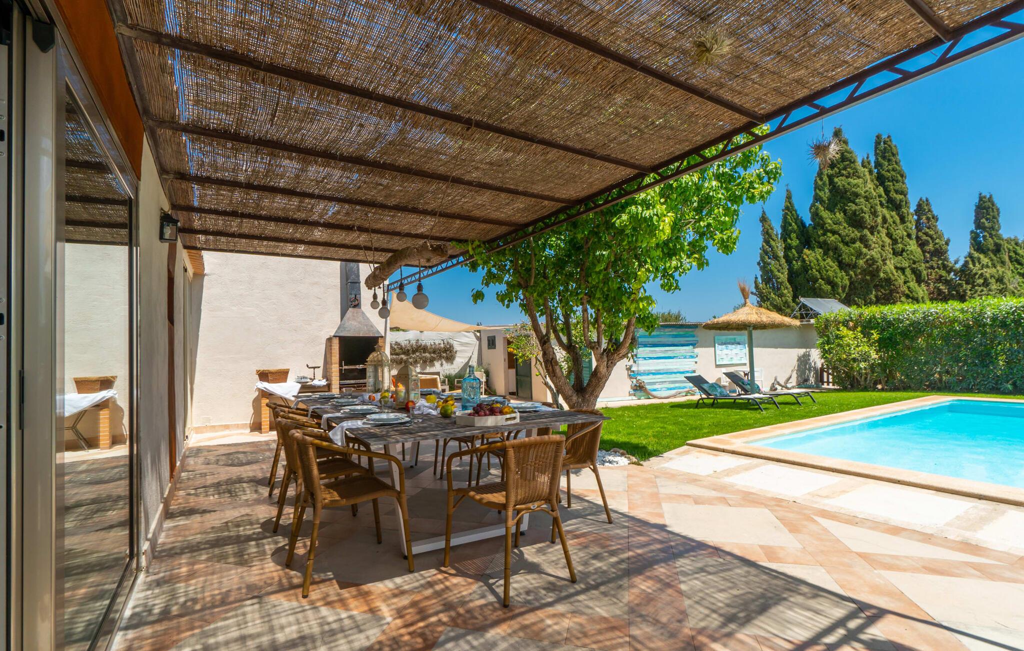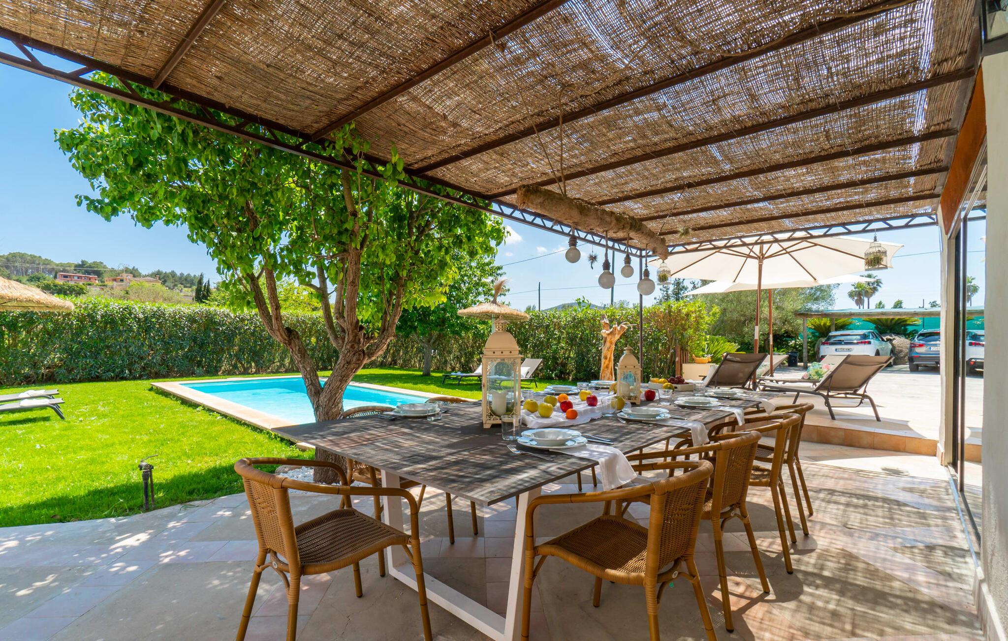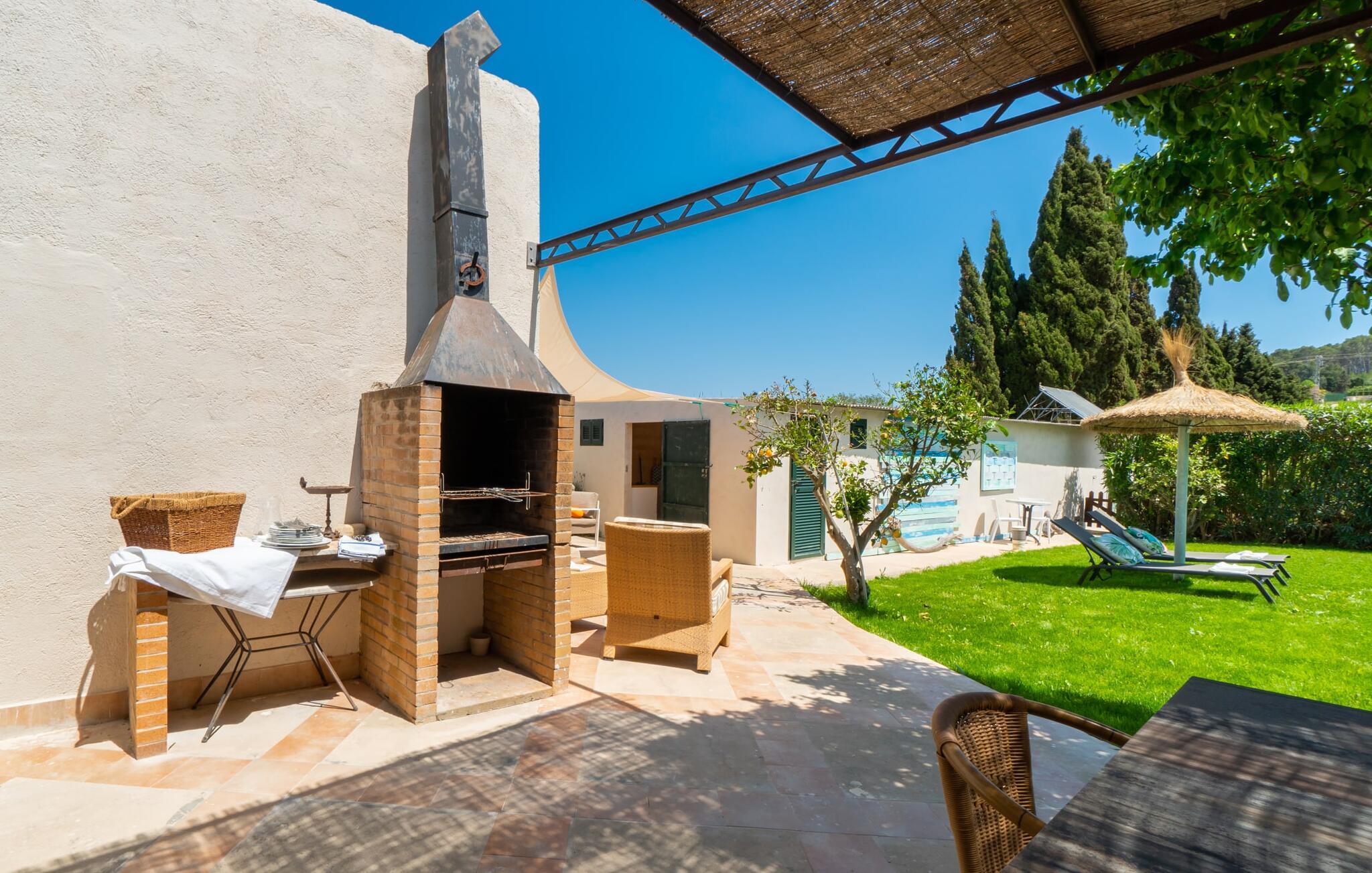 Frische, leichte Sommerstimmung verbreitet dieses Bauernhaus auf Mallorca, das ideal für eine oder zwei Familien ist. Der abwechslungsreiche, völlig private Gartenbereich bietet viele Möglichkeiten, auf den Rasenflächen und Terrassen Ihren täglichen Outdoor-Lieblingsplatz zu wählen. Vielleicht liegt es direkt am Haus, unter dem Olivenbaum, wo man es sich auf der Polyrattan-Sonneninsel so gemütlich machen kann? Oder ist es vielleicht die schöne Holzbank, auf der zwei oder drei Personen zusammensitzen können? Oder ist es der Esstisch, der zum gemeinsamen Essen, zum Grillen einlädt? Überdacht mit einem Sonnensegel schmeckt der Nachmittagskaffee oder ein kühles Getränk besonders lecker in der kleinen Lounge oder von den Sesseln aus, die Sie je nach Tageszeit an ein sonniges oder schattiges Plätzchen stellen möchten. Ein Lieblingsplatz wird nicht zuletzt der Pool sein, der gerade an heißen Tagen eine willkommene Abkühlung verspricht. Eine praktische Außendusche steht ebenso zur Verfügung wie ein Außenbad – Sie werden es in Ihrem Urlaub bestimmt zu schätzen wissen. Auf den bereitgestellten bequemen Liegen können Sie sich sonnen, entspannen und entspannen.