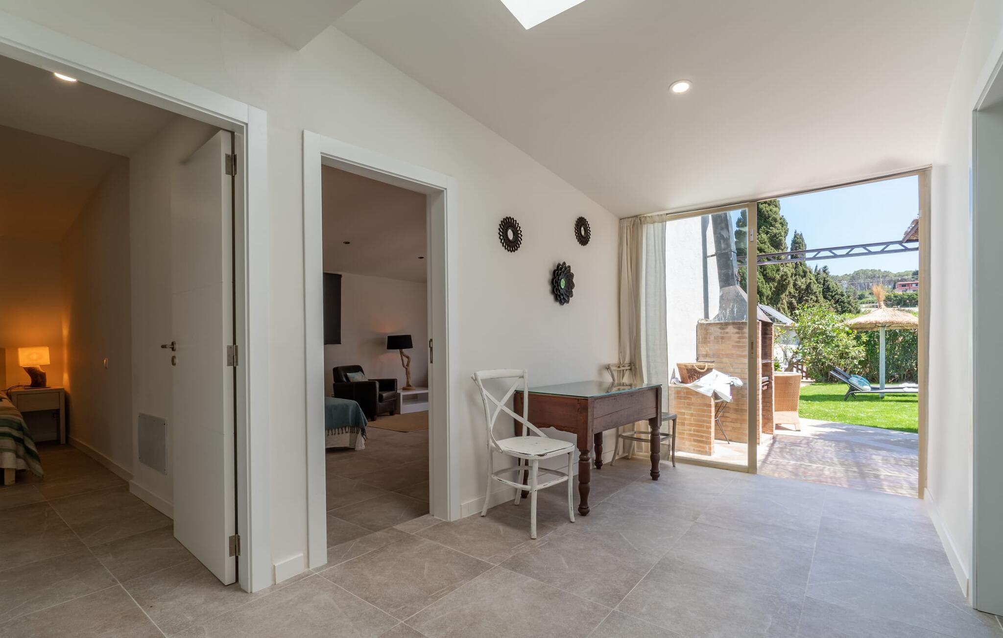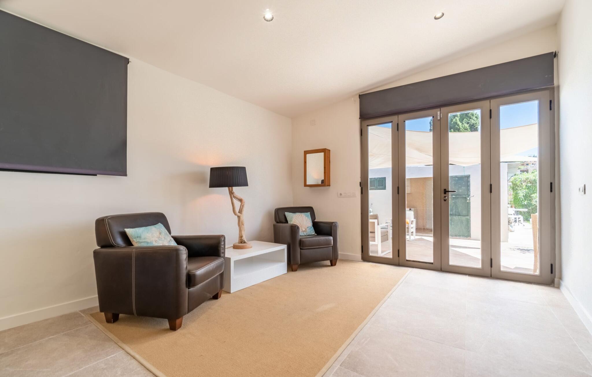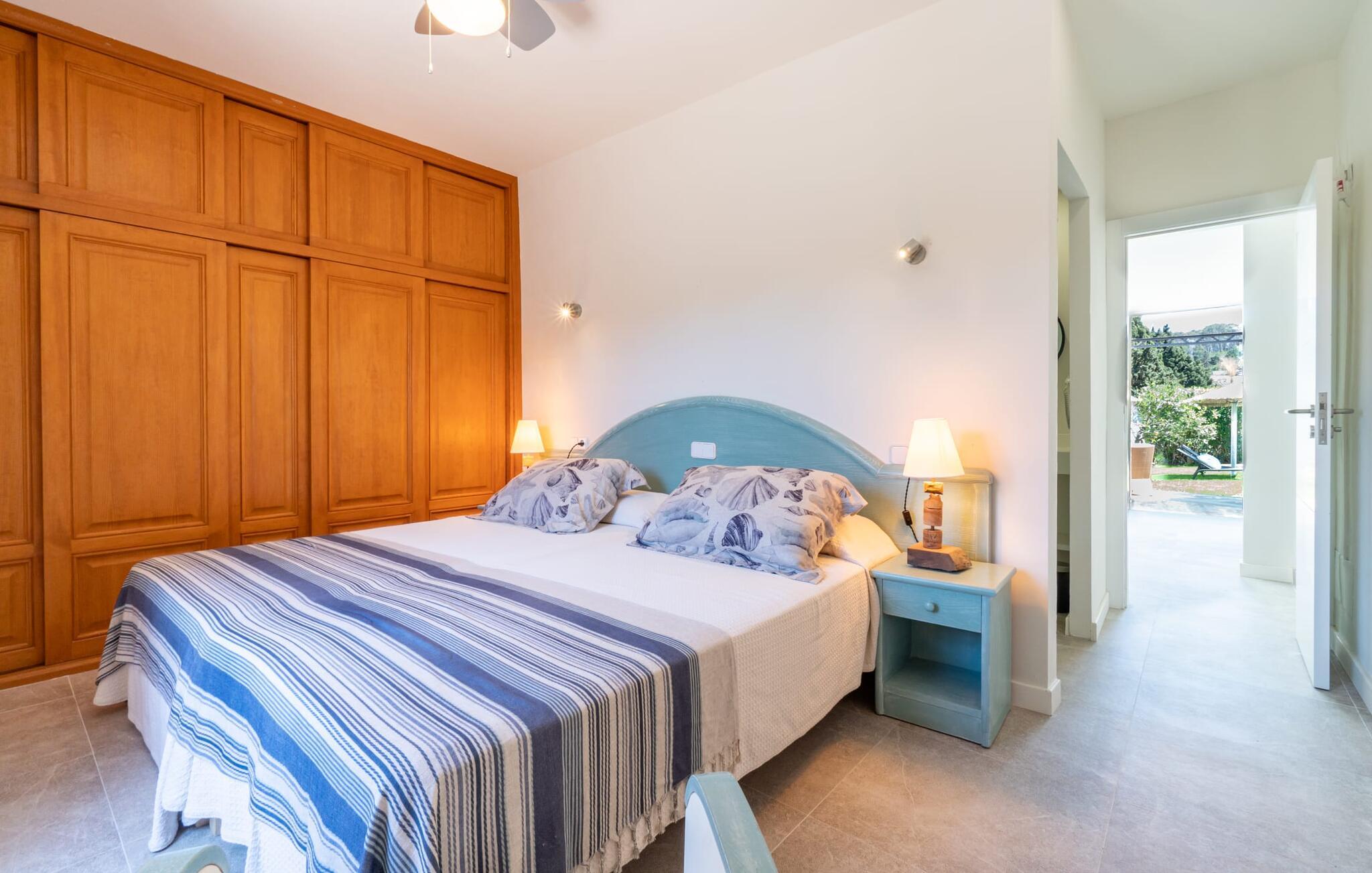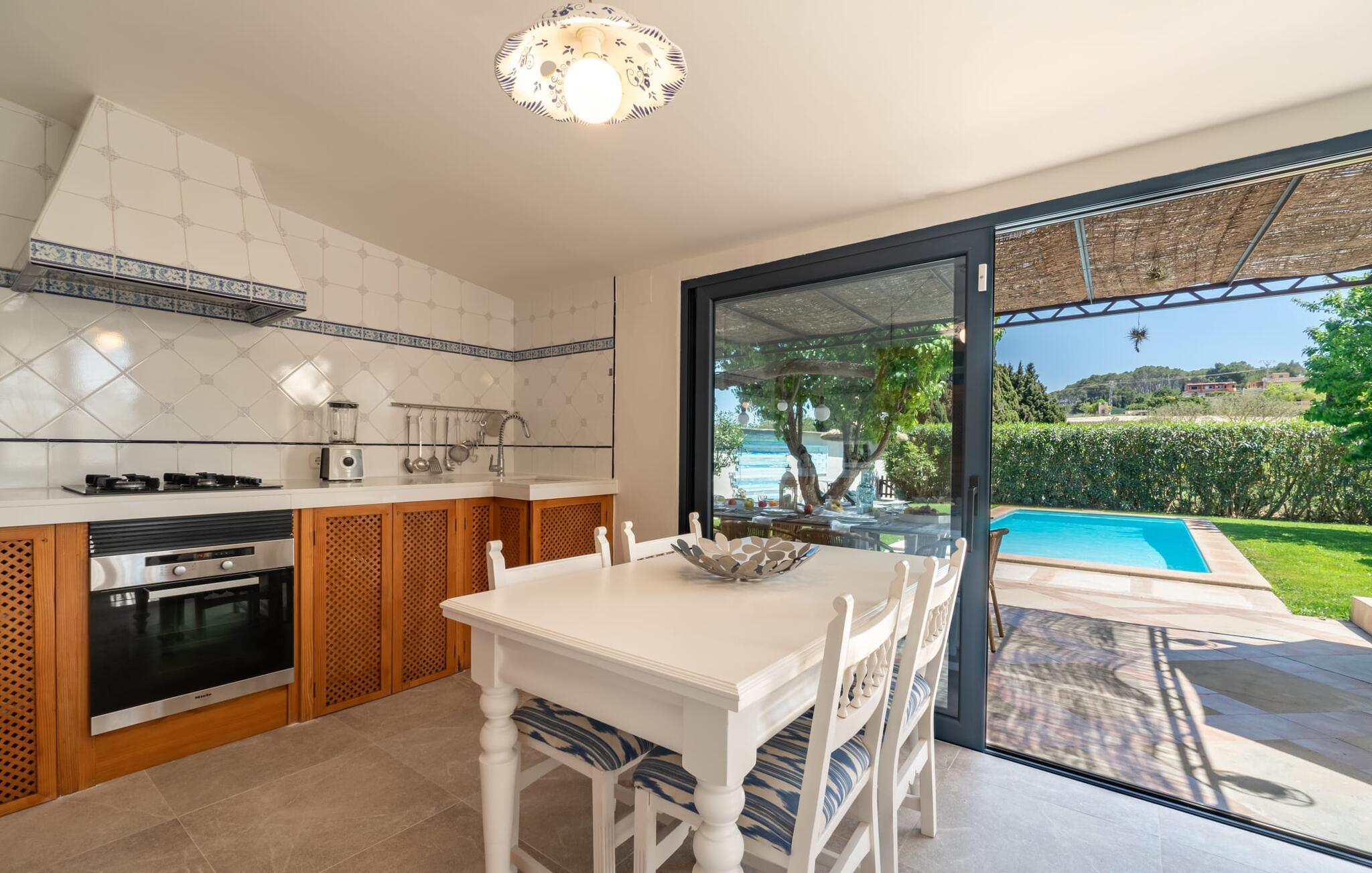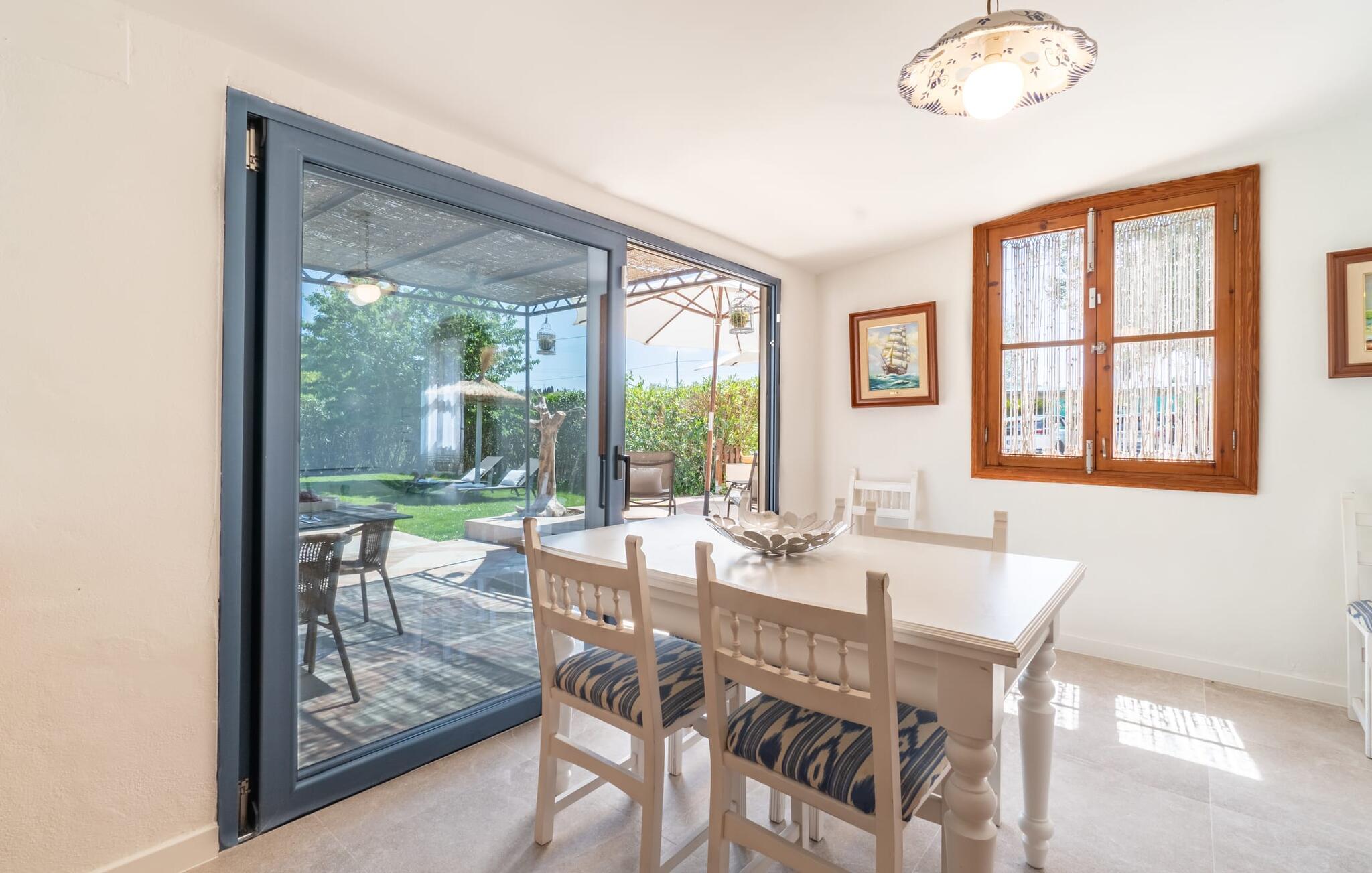 Frische, leichte Sommerstimmung verbreitet dieses Bauernhaus auf Mallorca, das ideal für eine oder zwei Familien ist. Der abwechslungsreiche, völlig private Gartenbereich bietet viele Möglichkeiten, auf den Rasenflächen und Terrassen Ihren täglichen Outdoor-Lieblingsplatz zu wählen. Vielleicht liegt es direkt am Haus, unter dem Olivenbaum, wo man es sich auf der Polyrattan-Sonneninsel so gemütlich machen kann? Oder ist es vielleicht die schöne Holzbank, auf der zwei oder drei Personen zusammensitzen können? Oder ist es der Esstisch, der zum gemeinsamen Essen, zum Grillen einlädt? Überdacht mit einem Sonnensegel schmeckt der Nachmittagskaffee oder ein kühles Getränk besonders lecker in der kleinen Lounge oder von den Sesseln aus, die Sie je nach Tageszeit an ein sonniges oder schattiges Plätzchen stellen möchten. Ein Lieblingsplatz wird nicht zuletzt der Pool sein, der gerade an heißen Tagen eine willkommene Abkühlung verspricht. Eine praktische Außendusche steht ebenso zur Verfügung wie ein Außenbad – Sie werden es in Ihrem Urlaub bestimmt zu schätzen wissen. Auf den bereitgestellten bequemen Liegen können Sie sich sonnen, entspannen und entspannen.
