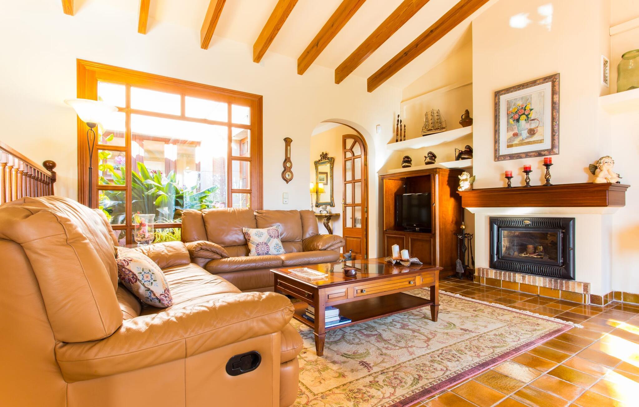 Im Inneren ist die Villa geschmackvoll eingerichtet und verfügt über ein kombiniertes Wohn-/Esszimmer mit großem Tisch, eine gemütliche Sofaecke mit TV und Kamin sowie bodentiefe Fenster für natürliches Licht. Die gut ausgestattete Küche ist mit einem Toaster, einem Mixer und einer Kaffeemaschine ausgestattet. Im Erdgeschoss befinden sich einladende Schlafzimmer und moderne Badezimmer, während das Obergeschoss ein zusätzliches Wohnzimmer und eine kleine Bibliothek bietet. Annehmlichkeiten wie ein Bügeleisen und ein Haartrockner sorgen für zusätzlichen Komfort.