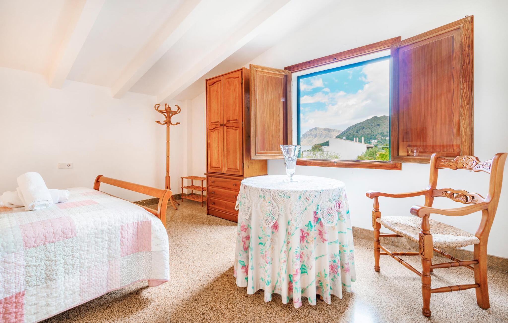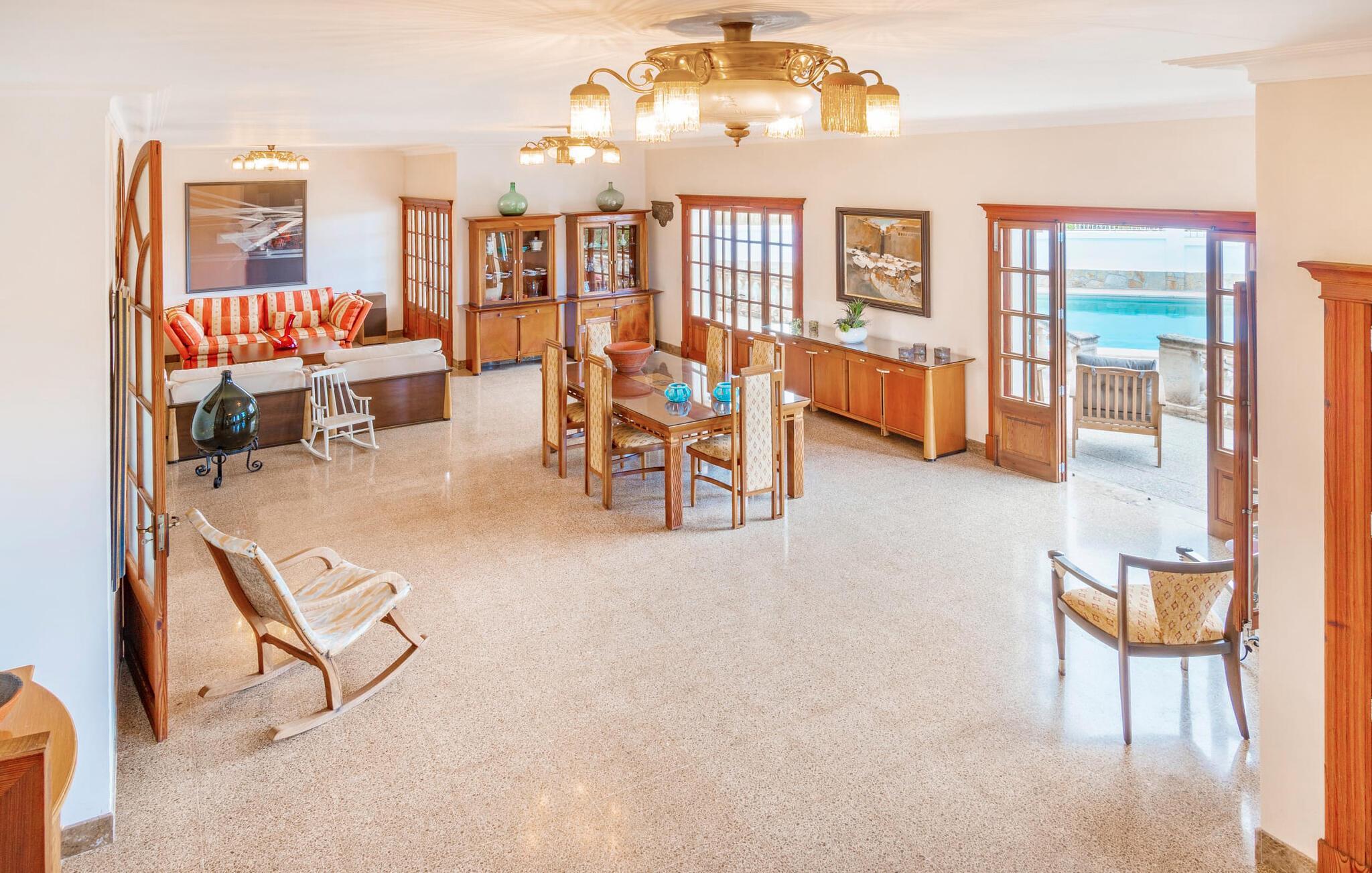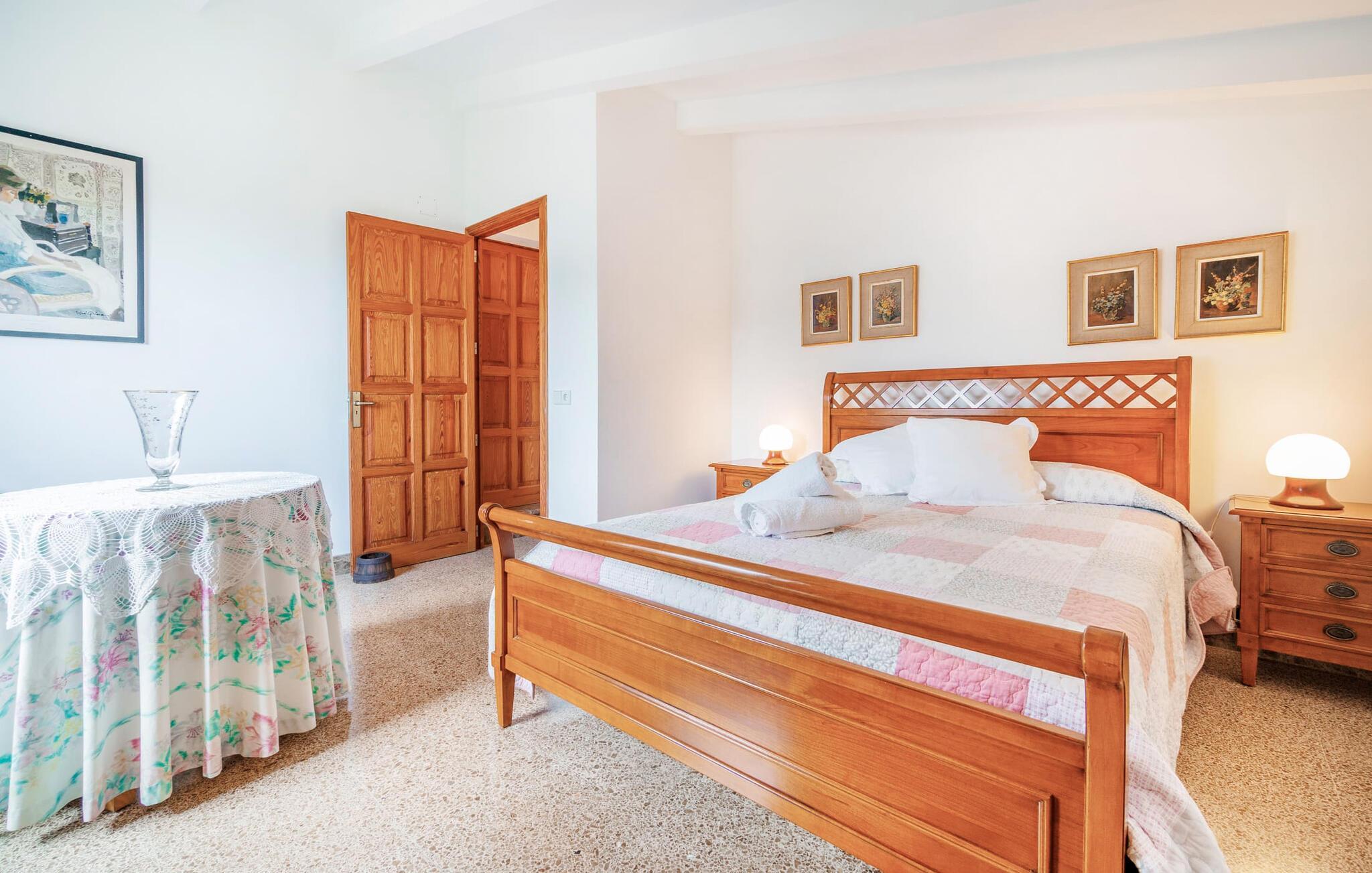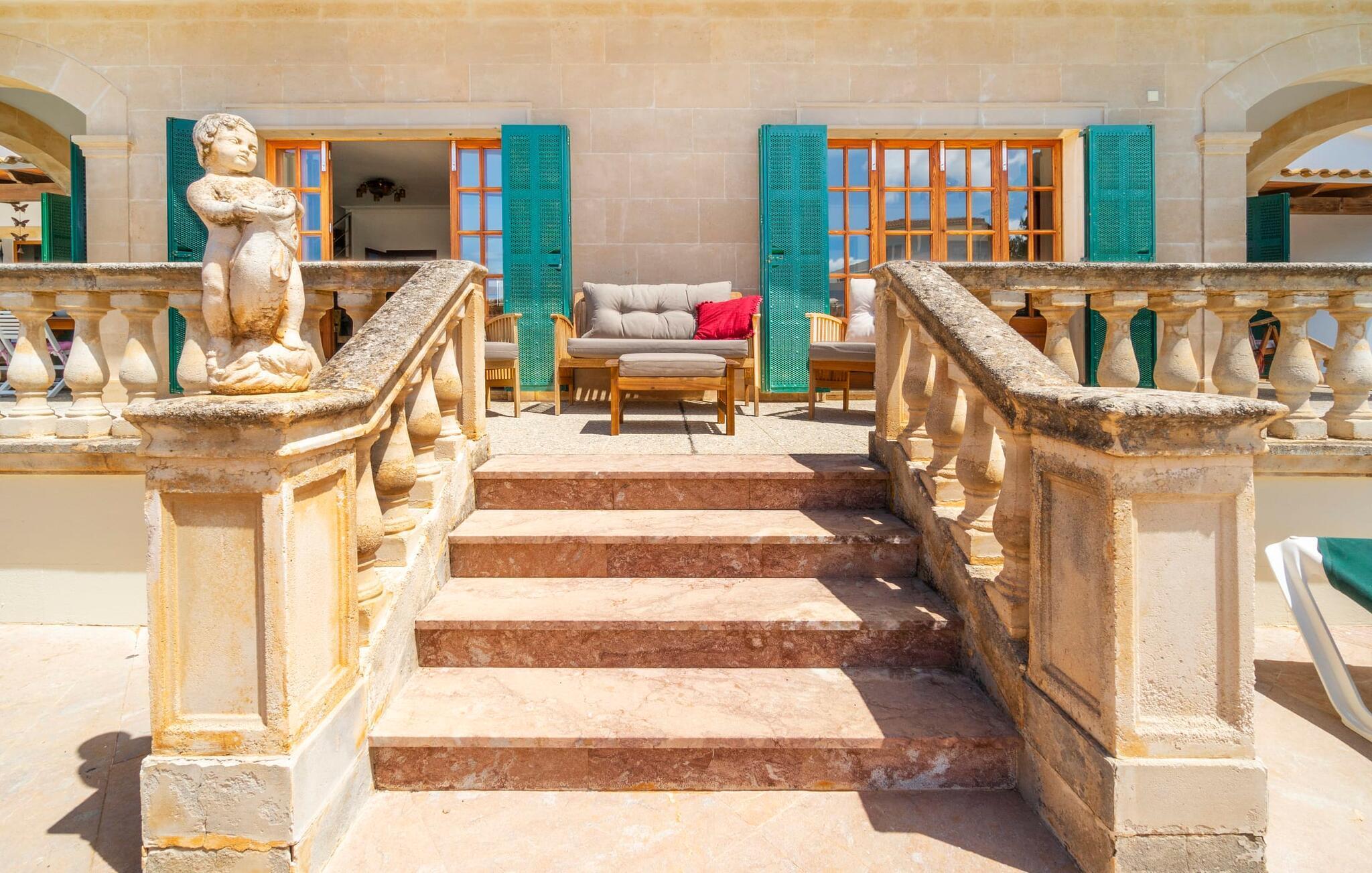 Das Interieur von „Es Ferrutx“ ist klassisch elegant. Das Ferienhaus ist – typisch für das traditionelle Mallorca – mit vielen schönen alten Möbelstücken ausgestattet, von denen einige aufwendig geschnitzt sind. Glänzende Fliesenböden, helle Wände und verschiedene Holzelemente wie Täfelungen und Türrahmen sind perfekt aufeinander abgestimmt. Als angenehmen Kontrast dazu finden sich an den Wänden teilweise moderne, farbenfrohe Gemälde. Das Haus ist sehr geräumig, so dass jeder seinen Lieblingsplatz findet und man sich – besonders wenn viele Mitreisende da sind – auch mal zurückziehen kann. Im Erdgeschoss befinden sich neben dem herrschaftlichen Eingangsbereich und der gut ausgestatteten Küche zwei große Wohnzimmer mit jeweils eigenem Essbereich. Vier liebevoll eingerichtete Schlafzimmer, drei davon mit modernen Bädern en Suite und eines mit separatem Bad, runden das Wohnangebot auf dieser Ebene ab. Eine Marmortreppe führt in die obere Etage, wo sich ein weiteres Schlafzimmer mit Bad befindet.