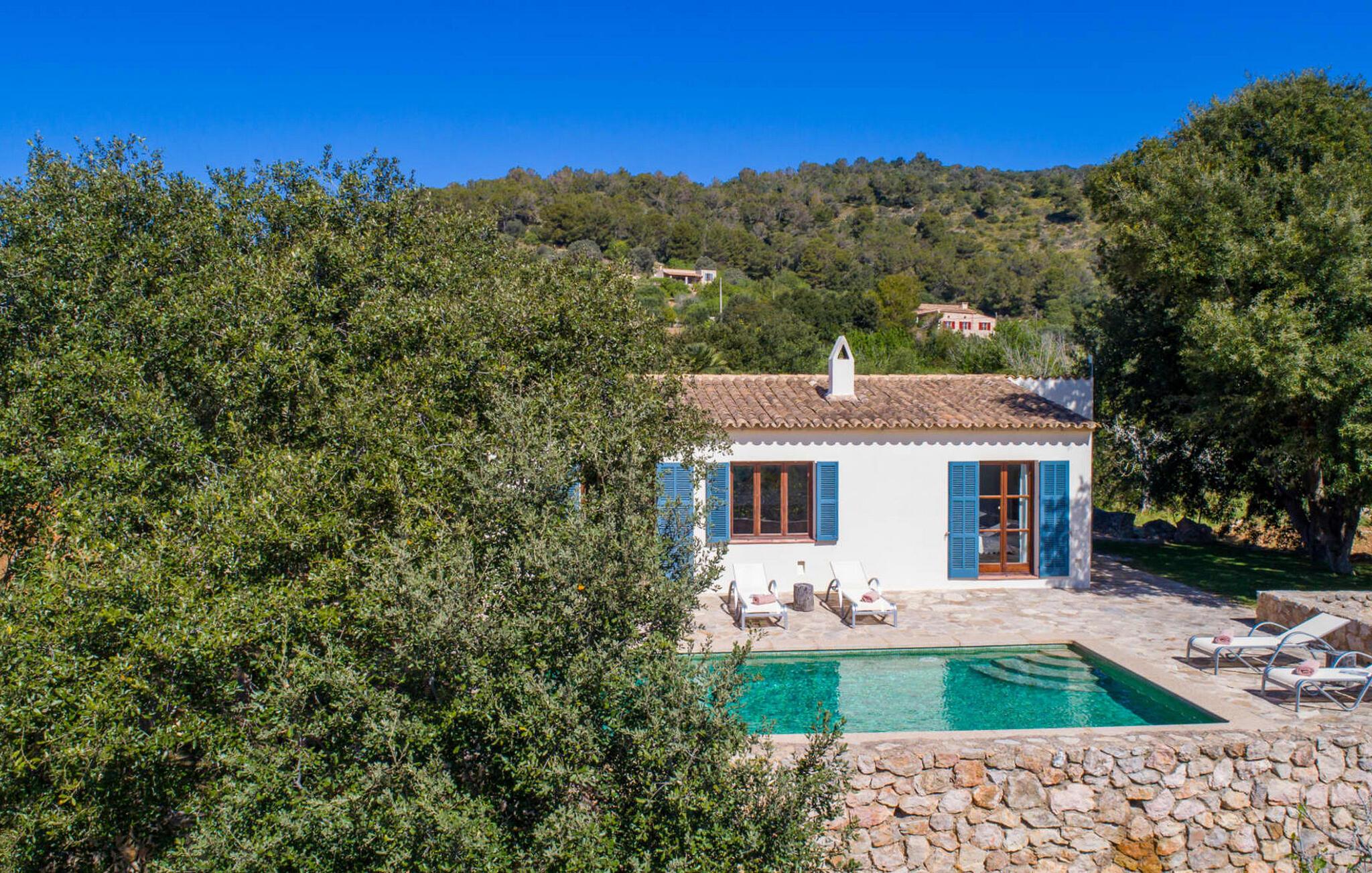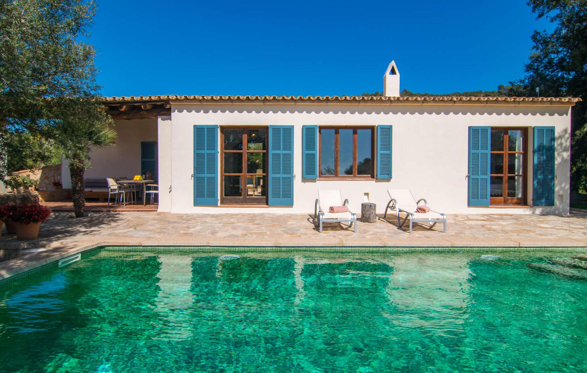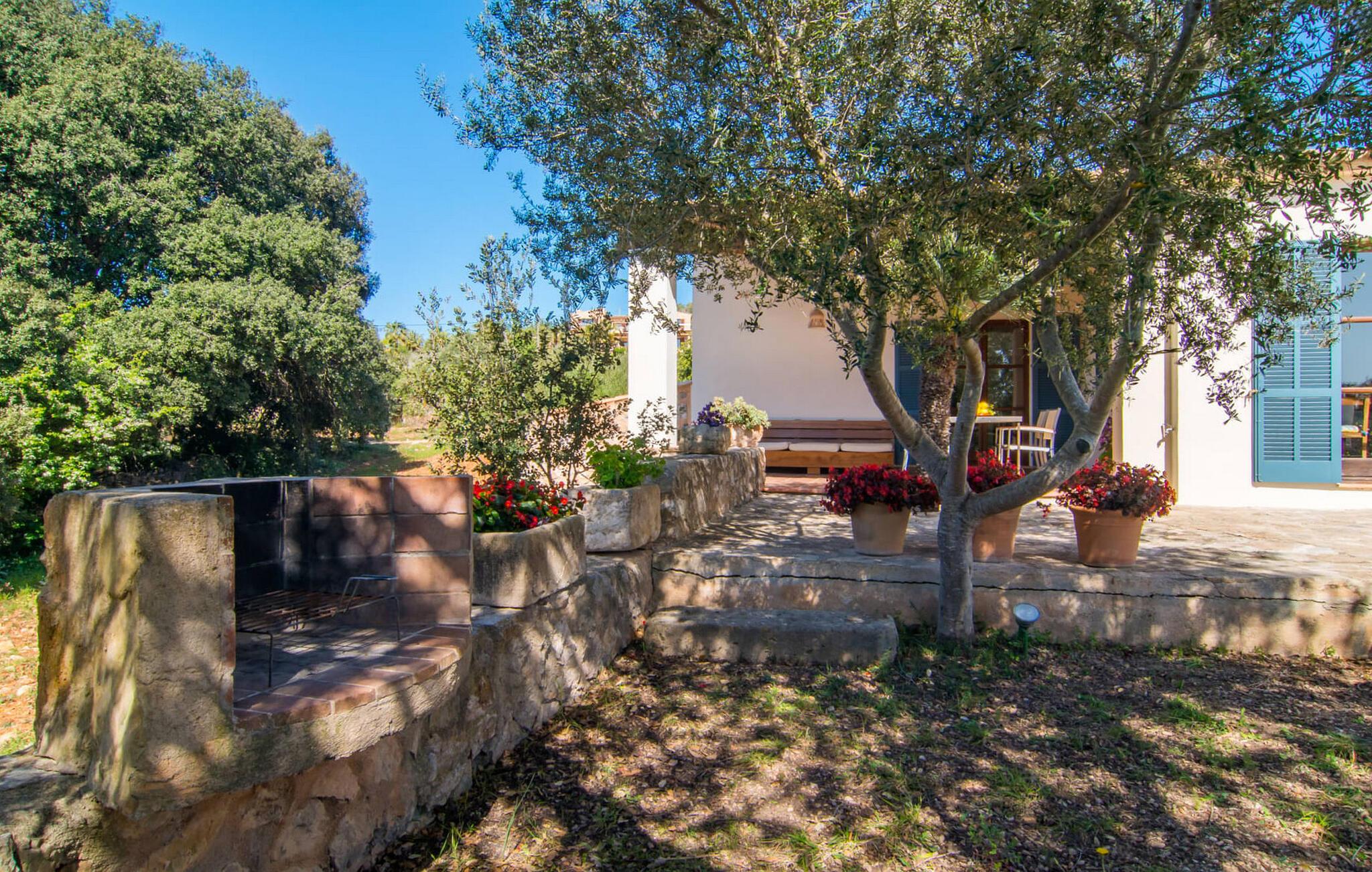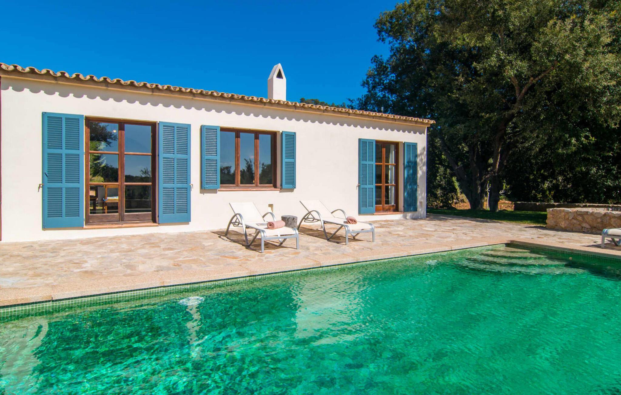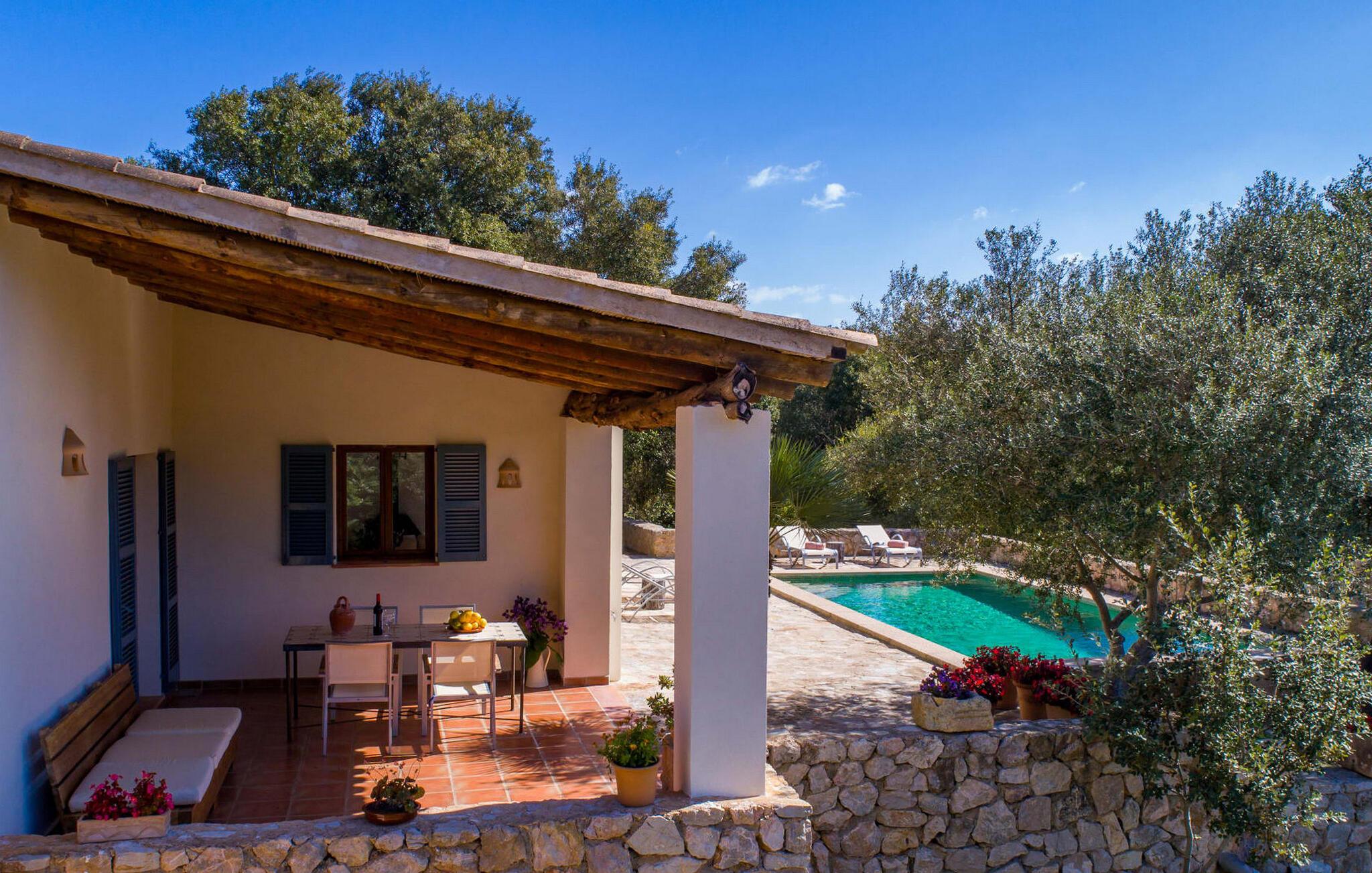 Die wunderschöne Steinvilla "Es Garbalio“ liegt inmitten uralter Bäume und empfängt Sie mit bezaubernden türkisfarbenen Fensterläden und einer großzügigen umlaufenden Terrasse. Die Terrasse verfügt über einen schönen Pool und einen teilweise überdachten Frühstücksbereich. Unter dem strahlend blauen Himmel verbreiten die Palmen eine herrlich mediterrane Atmosphäre. Ein luxuriöser eingebauter Außengrill erwartet Sie, perfekt, um die kulinarischen Schätze der Insel zu genießen.