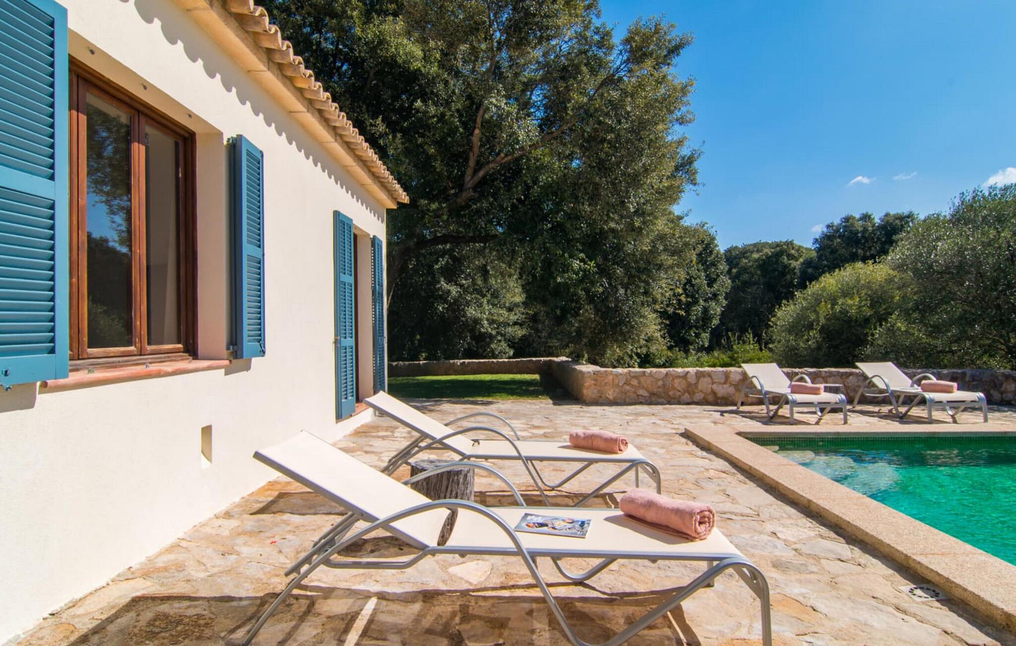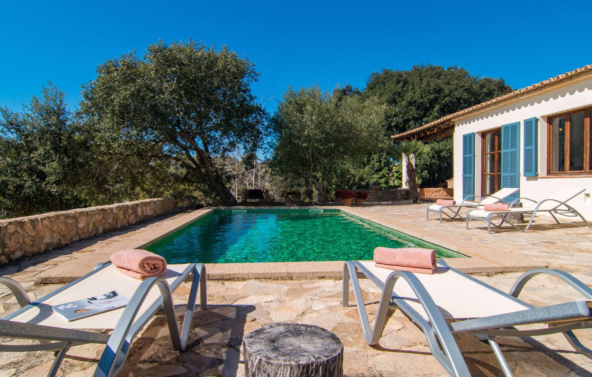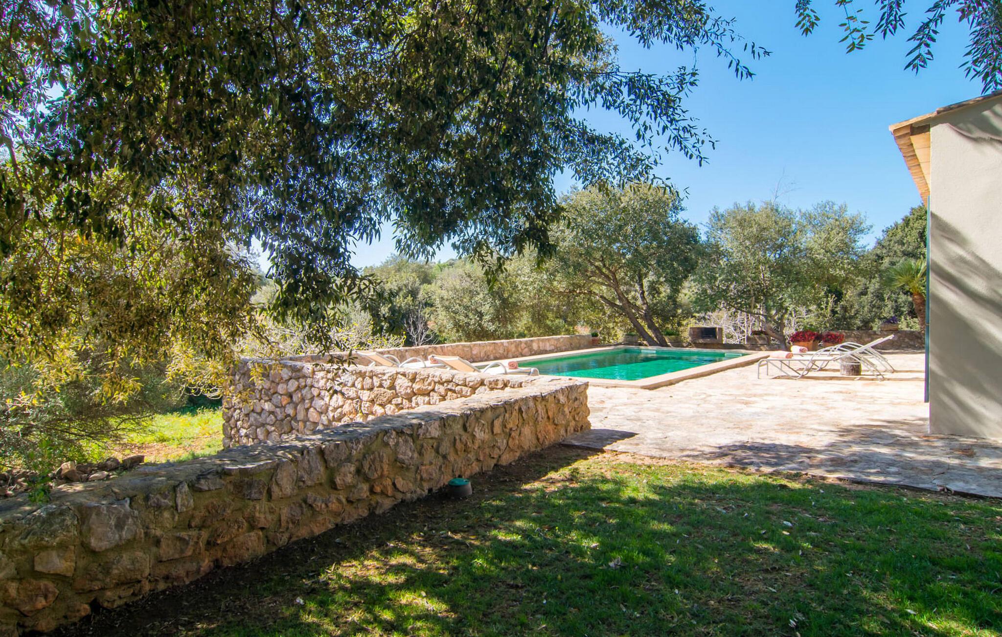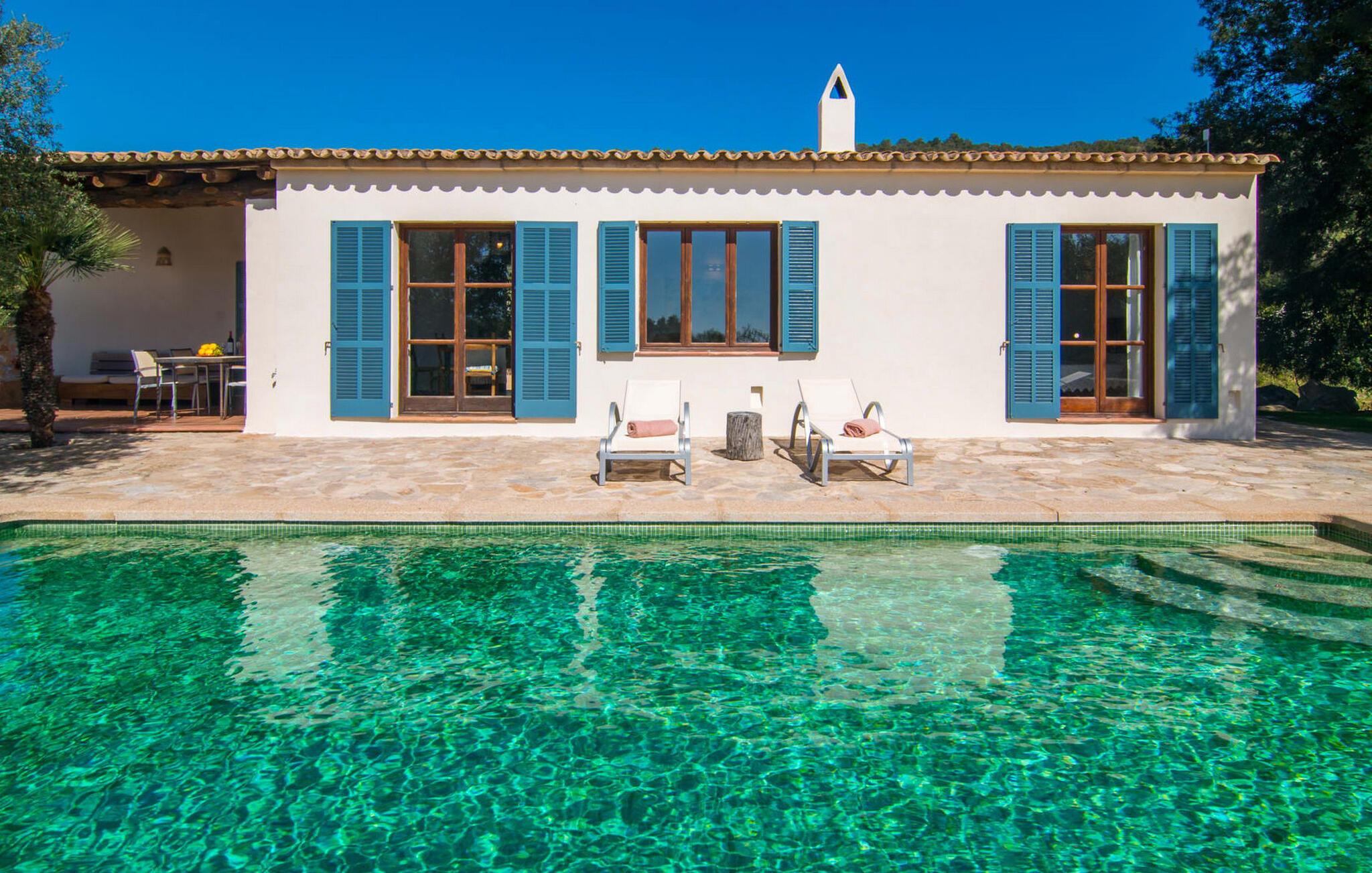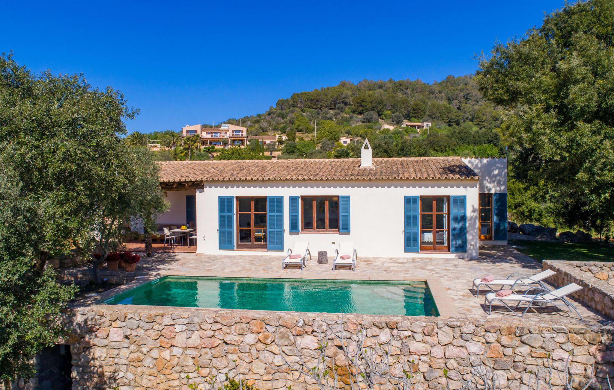 Die wunderschöne Steinvilla "Es Garbalio“ liegt inmitten uralter Bäume und empfängt Sie mit bezaubernden türkisfarbenen Fensterläden und einer großzügigen umlaufenden Terrasse. Die Terrasse verfügt über einen schönen Pool und einen teilweise überdachten Frühstücksbereich. Unter dem strahlend blauen Himmel verbreiten die Palmen eine herrlich mediterrane Atmosphäre. Ein luxuriöser eingebauter Außengrill erwartet Sie, perfekt, um die kulinarischen Schätze der Insel zu genießen.