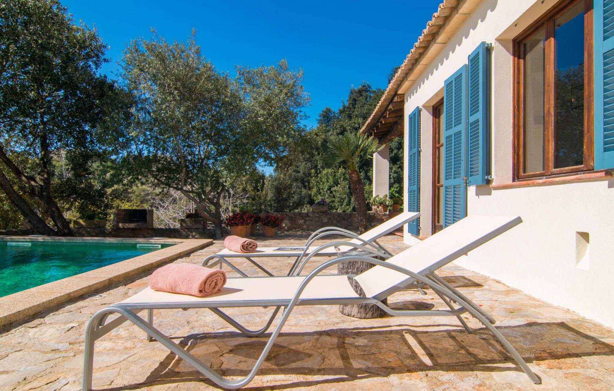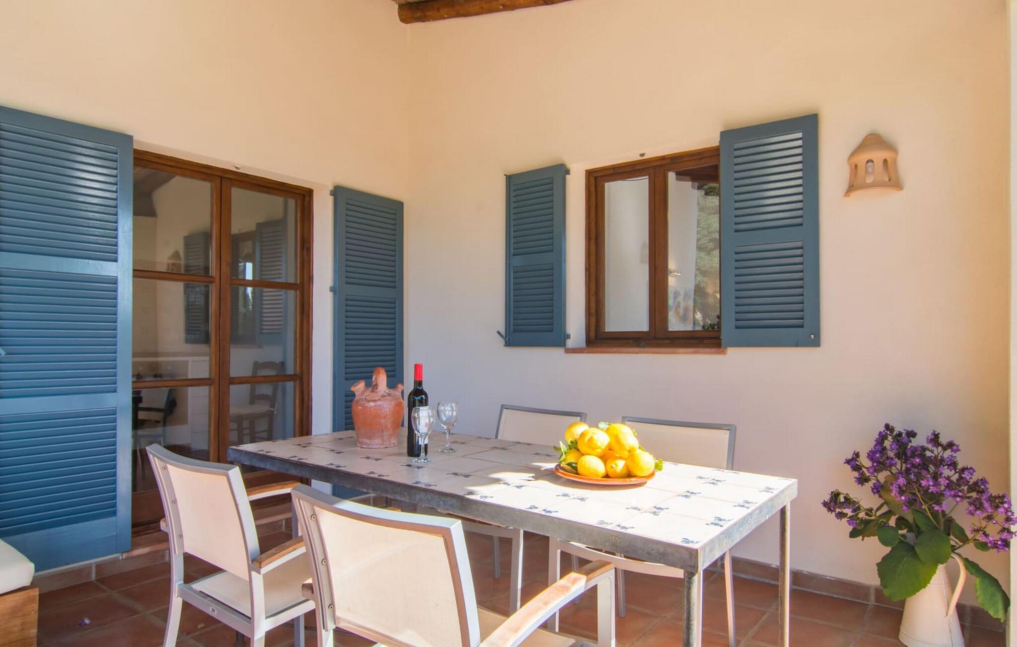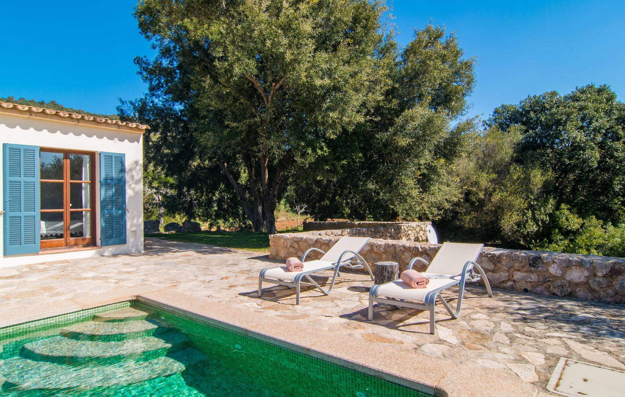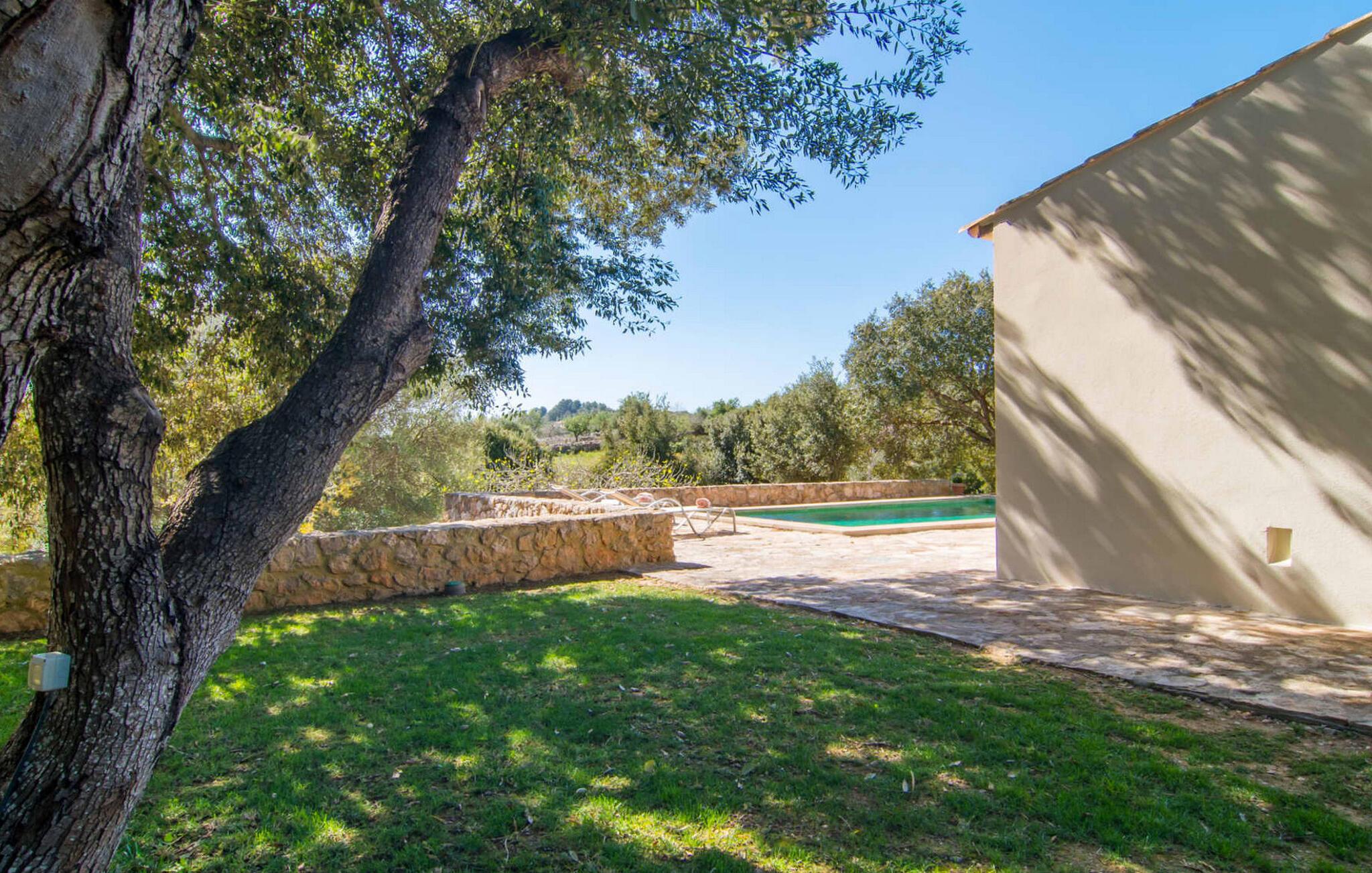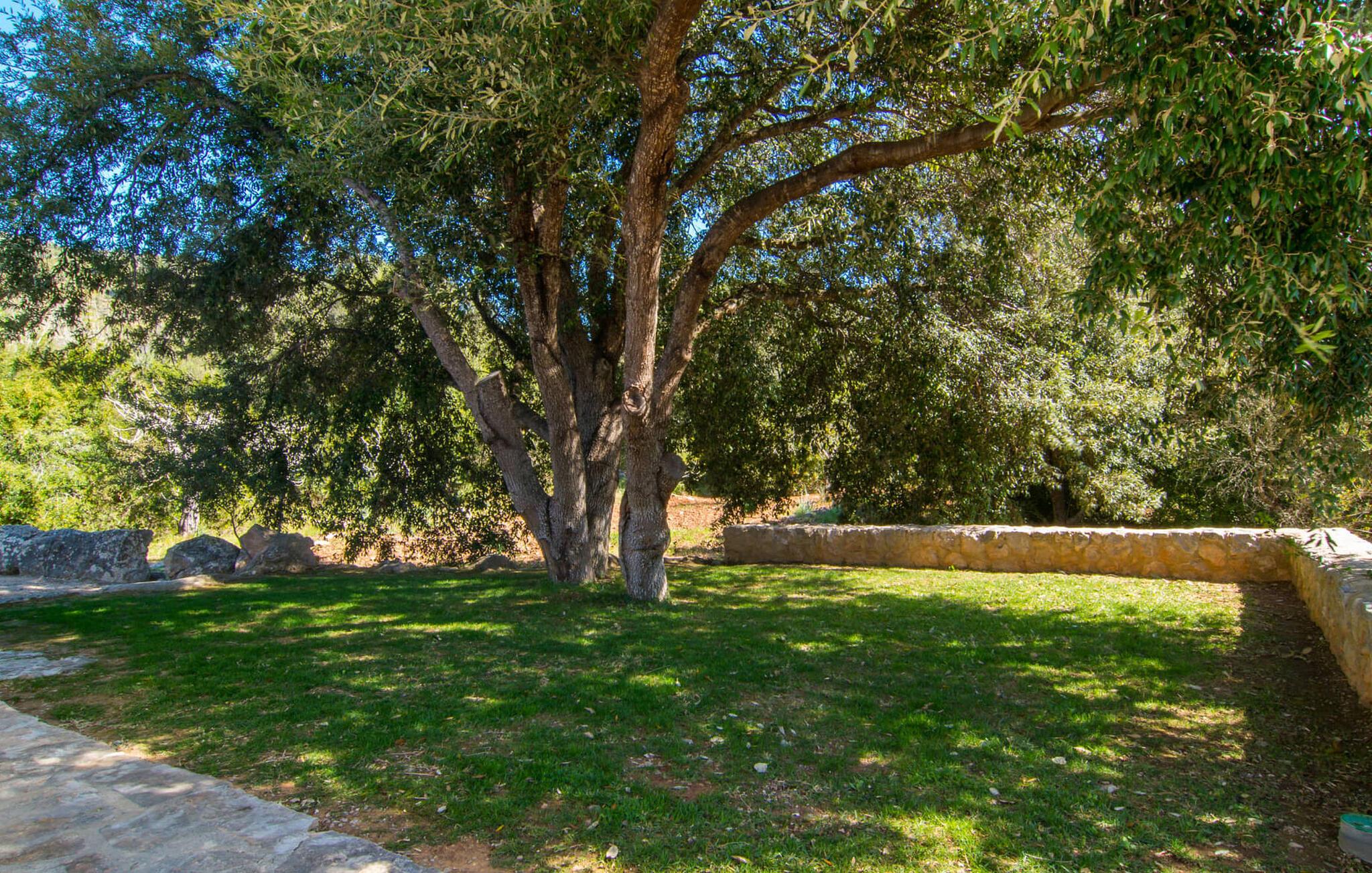Die wunderschöne Steinvilla "Es Garbalio“ liegt inmitten uralter Bäume und empfängt Sie mit bezaubernden türkisfarbenen Fensterläden und einer großzügigen umlaufenden Terrasse. Die Terrasse verfügt über einen schönen Pool und einen teilweise überdachten Frühstücksbereich. Unter dem strahlend blauen Himmel verbreiten die Palmen eine herrlich mediterrane Atmosphäre. Ein luxuriöser eingebauter Außengrill erwartet Sie, perfekt, um die kulinarischen Schätze der Insel zu genießen.