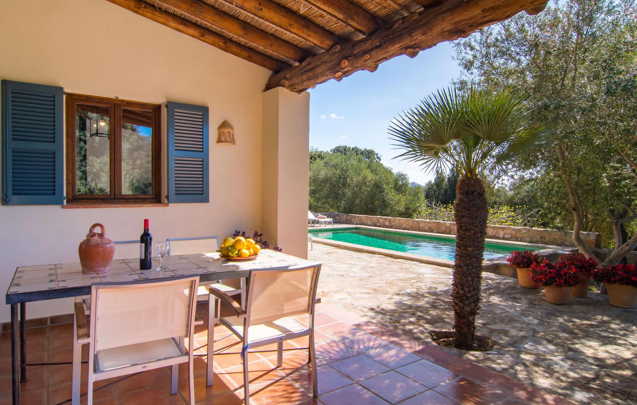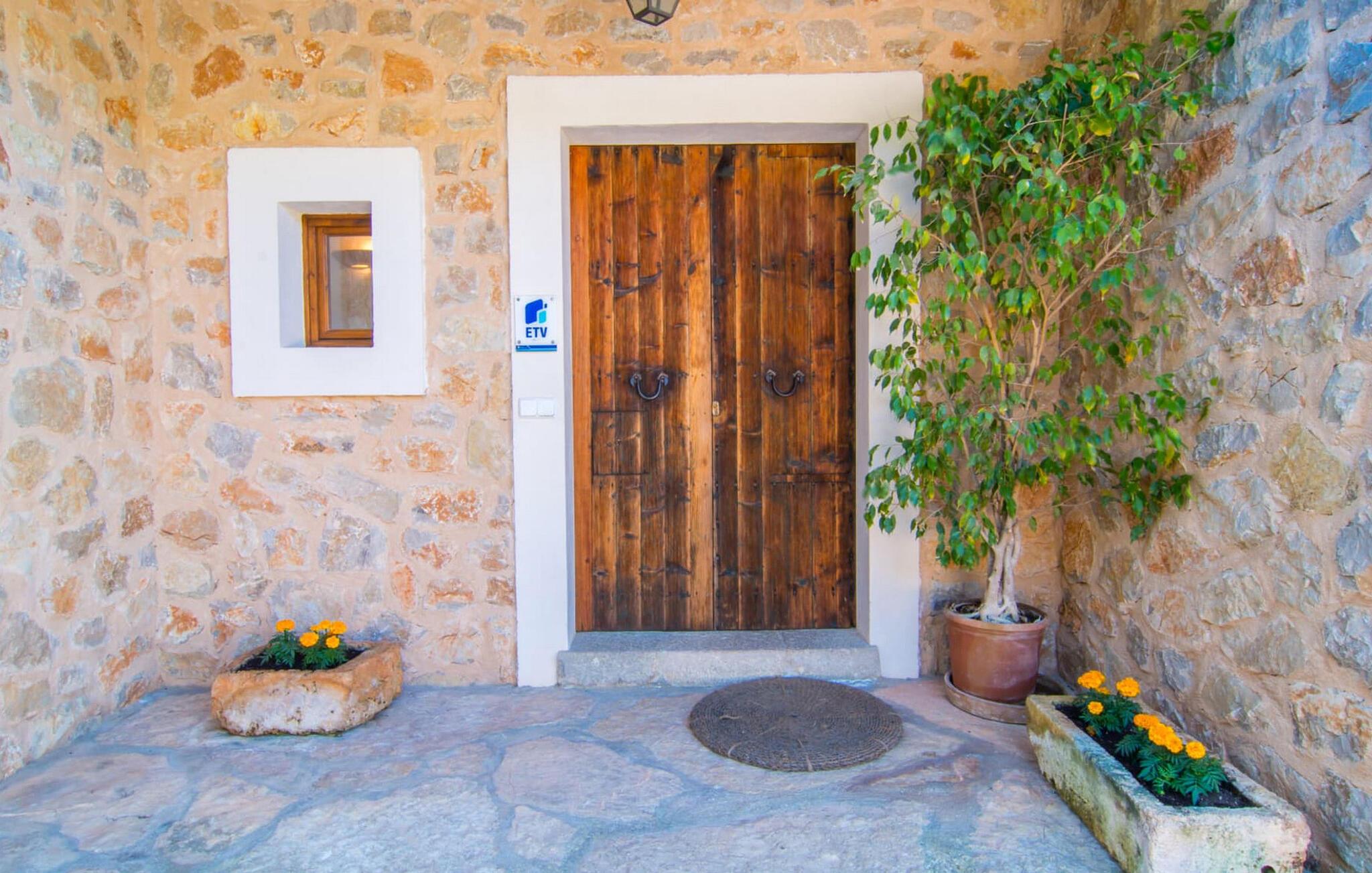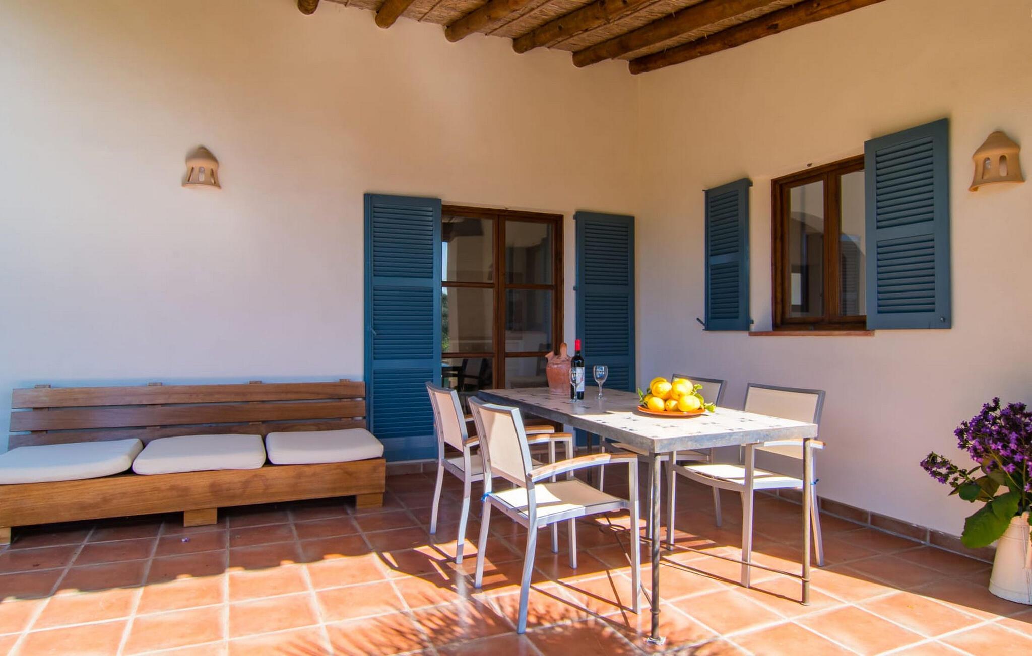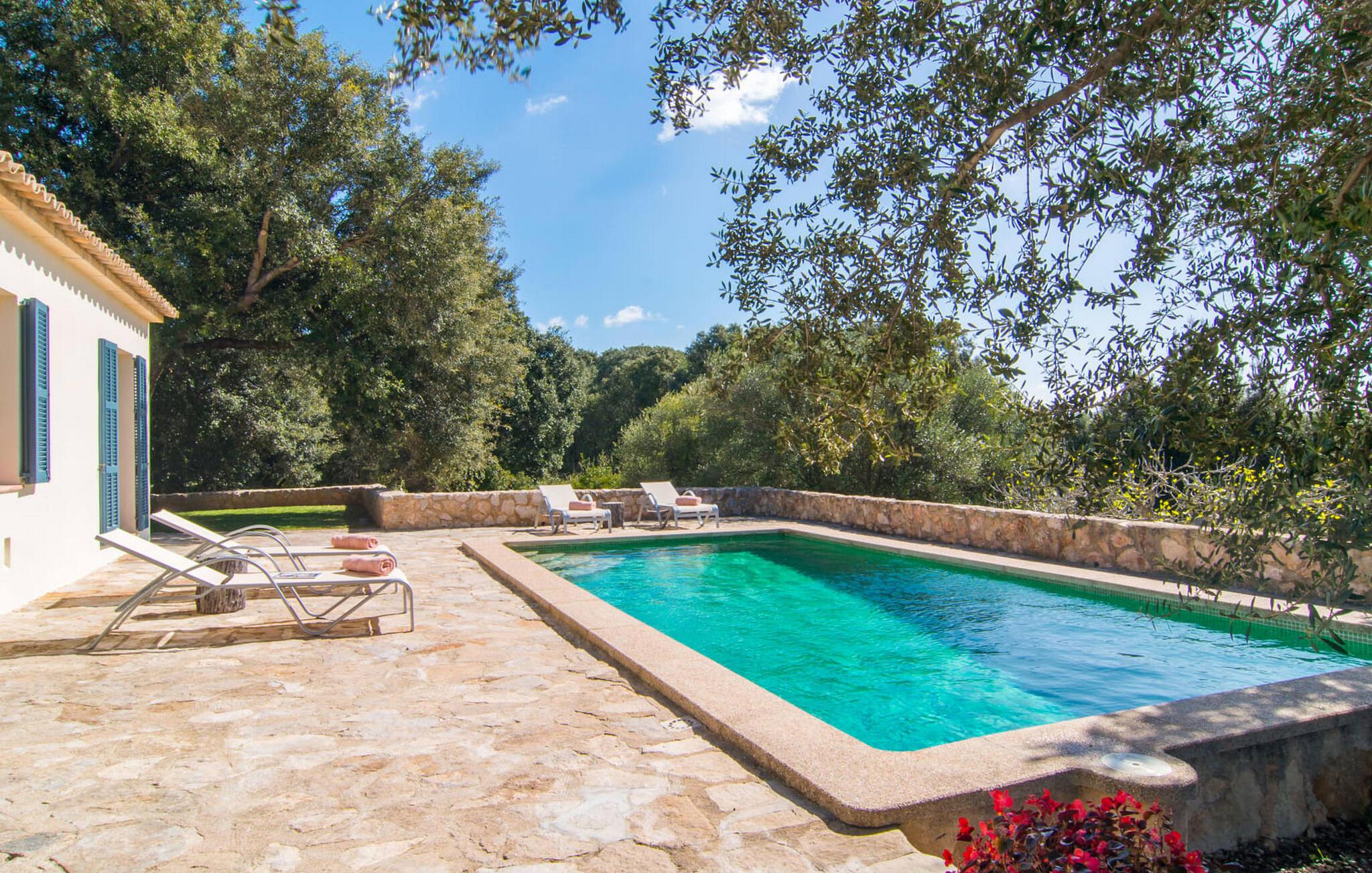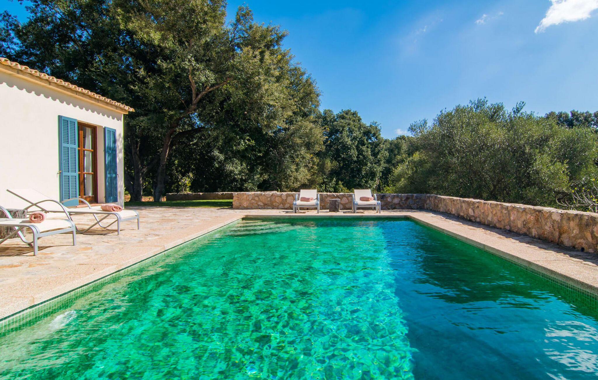 Die wunderschöne Steinvilla "Es Garbalio“ liegt inmitten uralter Bäume und empfängt Sie mit bezaubernden türkisfarbenen Fensterläden und einer großzügigen umlaufenden Terrasse. Die Terrasse verfügt über einen schönen Pool und einen teilweise überdachten Frühstücksbereich. Unter dem strahlend blauen Himmel verbreiten die Palmen eine herrlich mediterrane Atmosphäre. Ein luxuriöser eingebauter Außengrill erwartet Sie, perfekt, um die kulinarischen Schätze der Insel zu genießen.