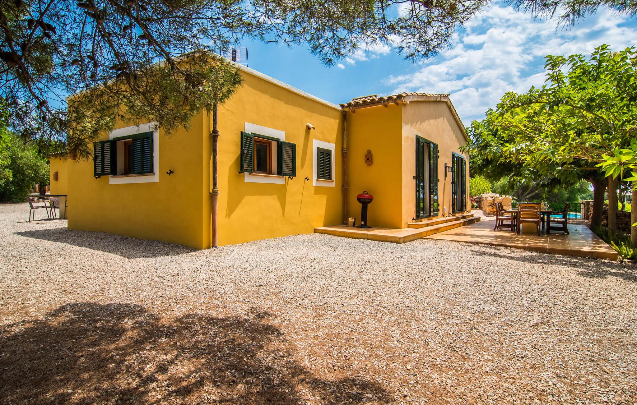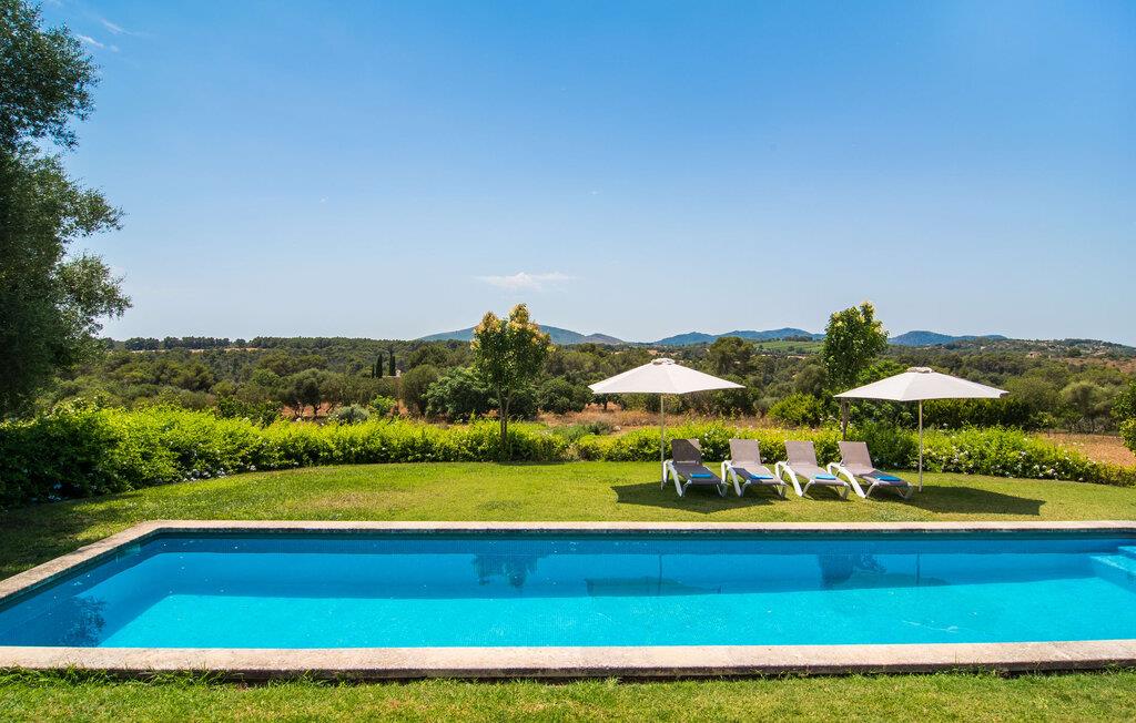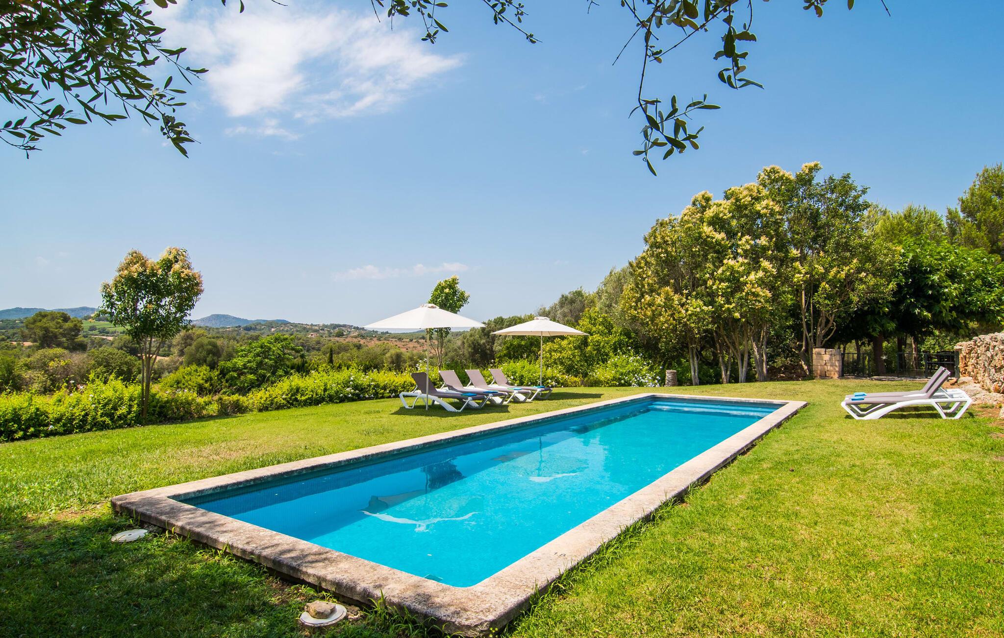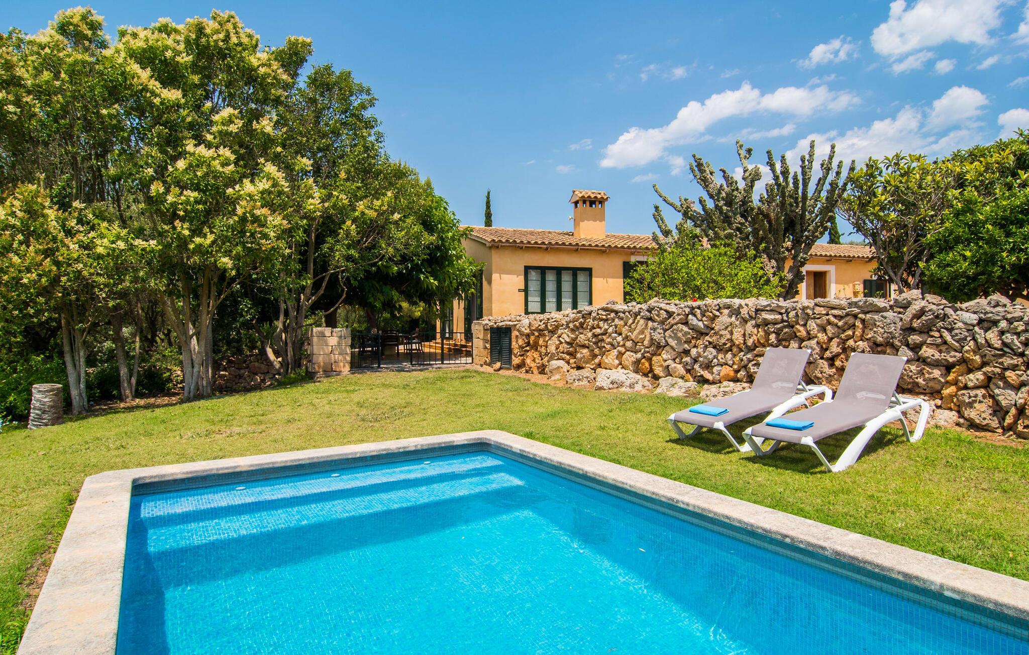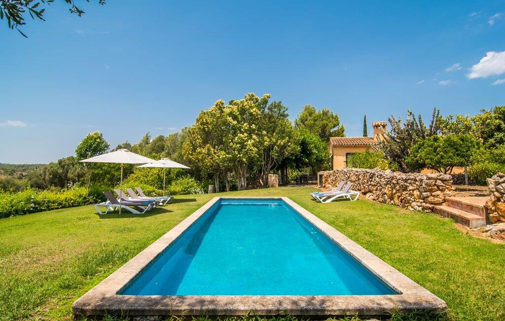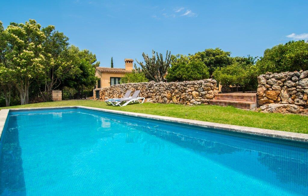 Die Villa „Es Gorg“ liegt in einer sehr ruhigen und idyllischen Lage im hübschen Osten Mallorcas – wo die sanften Hügel der Serra Levant eine liebliche mediterrane Küstenlandschaft bilden. Sie genießen den Luxus großer Privatsphäre, ohne während Ihres Aufenthalts von hohen Mauern oder Zäunen eingeengt zu sein. Ein malerischer Garten mit Obstbäumen und Rosen umgibt das Haus, der in seiner Fröhlichkeit mit den grünen Farben der Rasenflächen und dem Blau des mediterranen Himmels konkurriert. Der lange Pool liegt direkt vor dem Haus und ist durch eine kleine Gartentür zugänglich. Der 1,60 bis 2 m tiefe, mit kleinen blauen Mosaikkieseln geflieste Pool ist von Rasenflächen umgeben, die idyllische Ausblicke ins Grüne bieten. Genießen Sie die Aussicht bequem auf den sechs Sonnenliegen. Direkt am Haus laden Kies- und Fliesenflächen sowie schattige und sonnige Plätze zum Entspannen im Freien ein. Ob vor oder hinter dem Gebäude – hier findet jeder seinen perfekten Platz. Eingebaute Esstische verleihen den Sitzbereichen ein besonders eindrucksvolles Ambiente, um gemeinsam ein schönes Essen zu genießen. Für Ihr Auto gibt es einen Parkplatz vor dem Haus.