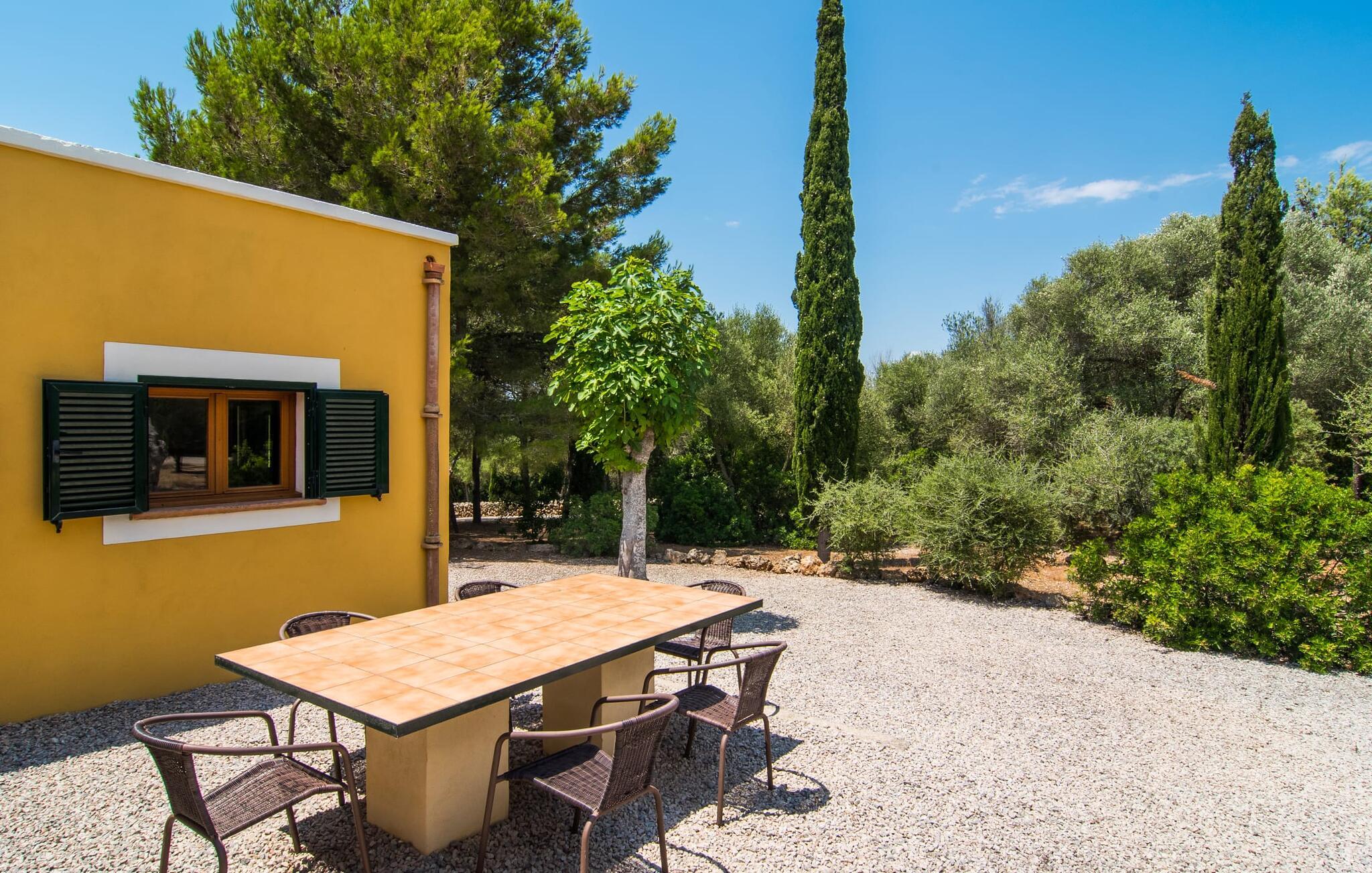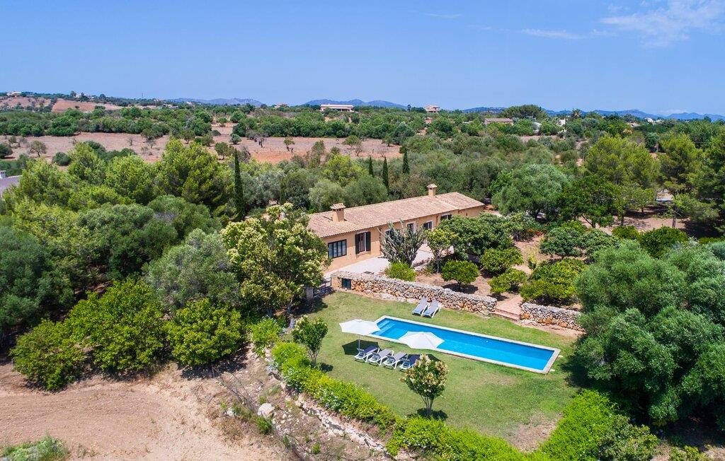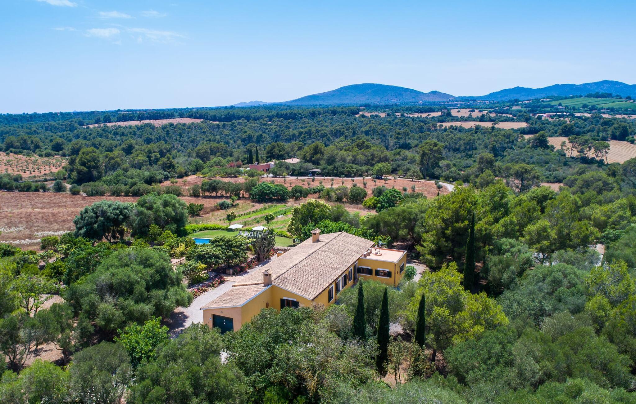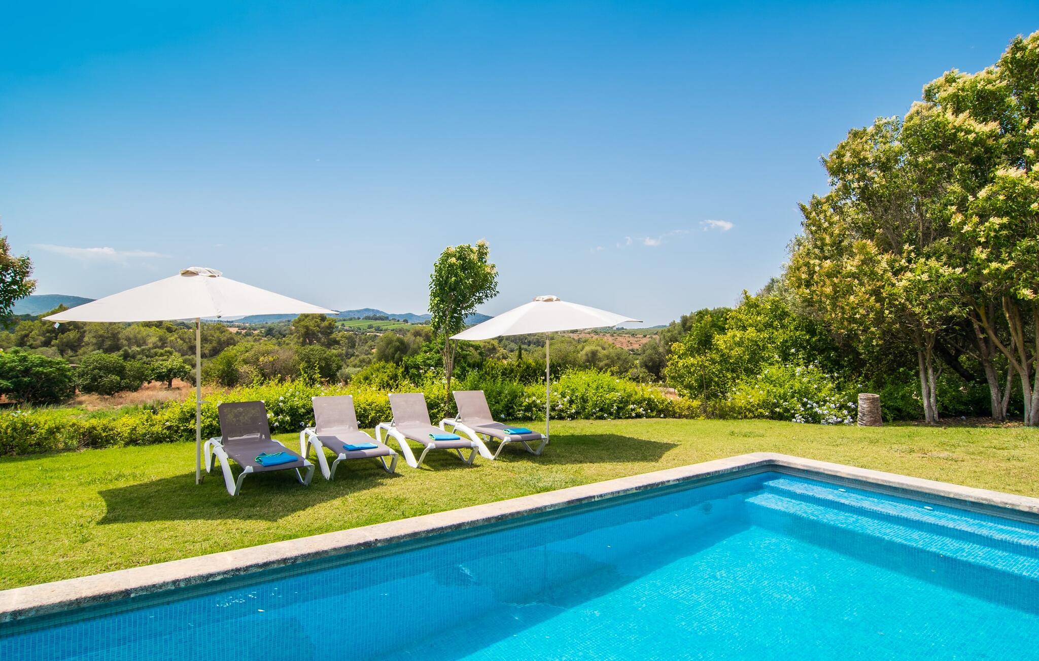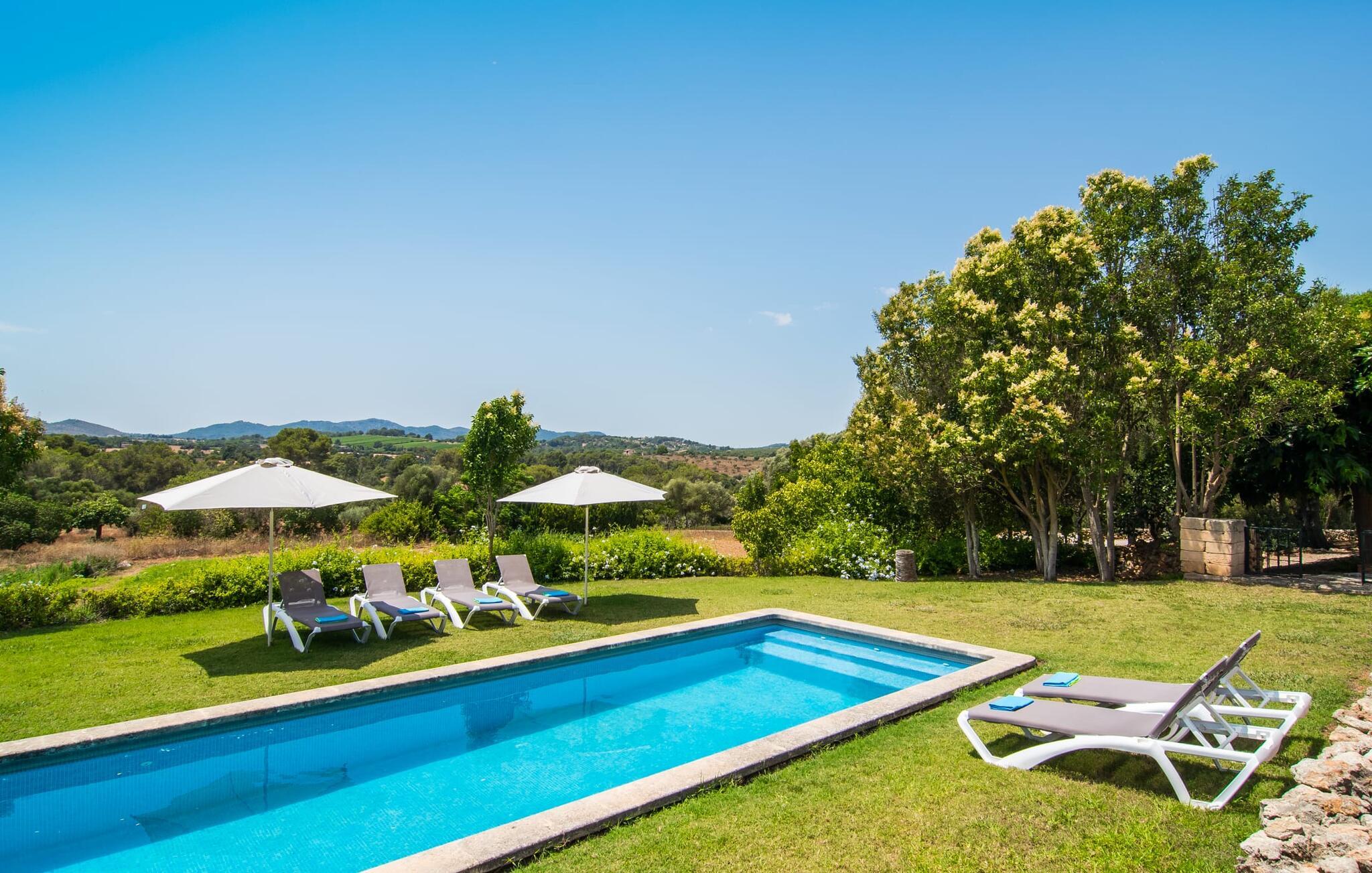 Die Villa „Es Gorg“ liegt in einer sehr ruhigen und idyllischen Lage im hübschen Osten Mallorcas – wo die sanften Hügel der Serra Levant eine liebliche mediterrane Küstenlandschaft bilden. Sie genießen den Luxus großer Privatsphäre, ohne während Ihres Aufenthalts von hohen Mauern oder Zäunen eingeengt zu sein. Ein malerischer Garten mit Obstbäumen und Rosen umgibt das Haus, der in seiner Fröhlichkeit mit den grünen Farben der Rasenflächen und dem Blau des mediterranen Himmels konkurriert. Der lange Pool liegt direkt vor dem Haus und ist durch eine kleine Gartentür zugänglich. Der 1,60 bis 2 m tiefe, mit kleinen blauen Mosaikkieseln geflieste Pool ist von Rasenflächen umgeben, die idyllische Ausblicke ins Grüne bieten. Genießen Sie die Aussicht bequem auf den sechs Sonnenliegen. Direkt am Haus laden Kies- und Fliesenflächen sowie schattige und sonnige Plätze zum Entspannen im Freien ein. Ob vor oder hinter dem Gebäude – hier findet jeder seinen perfekten Platz. Eingebaute Esstische verleihen den Sitzbereichen ein besonders eindrucksvolles Ambiente, um gemeinsam ein schönes Essen zu genießen. Für Ihr Auto gibt es einen Parkplatz vor dem Haus.