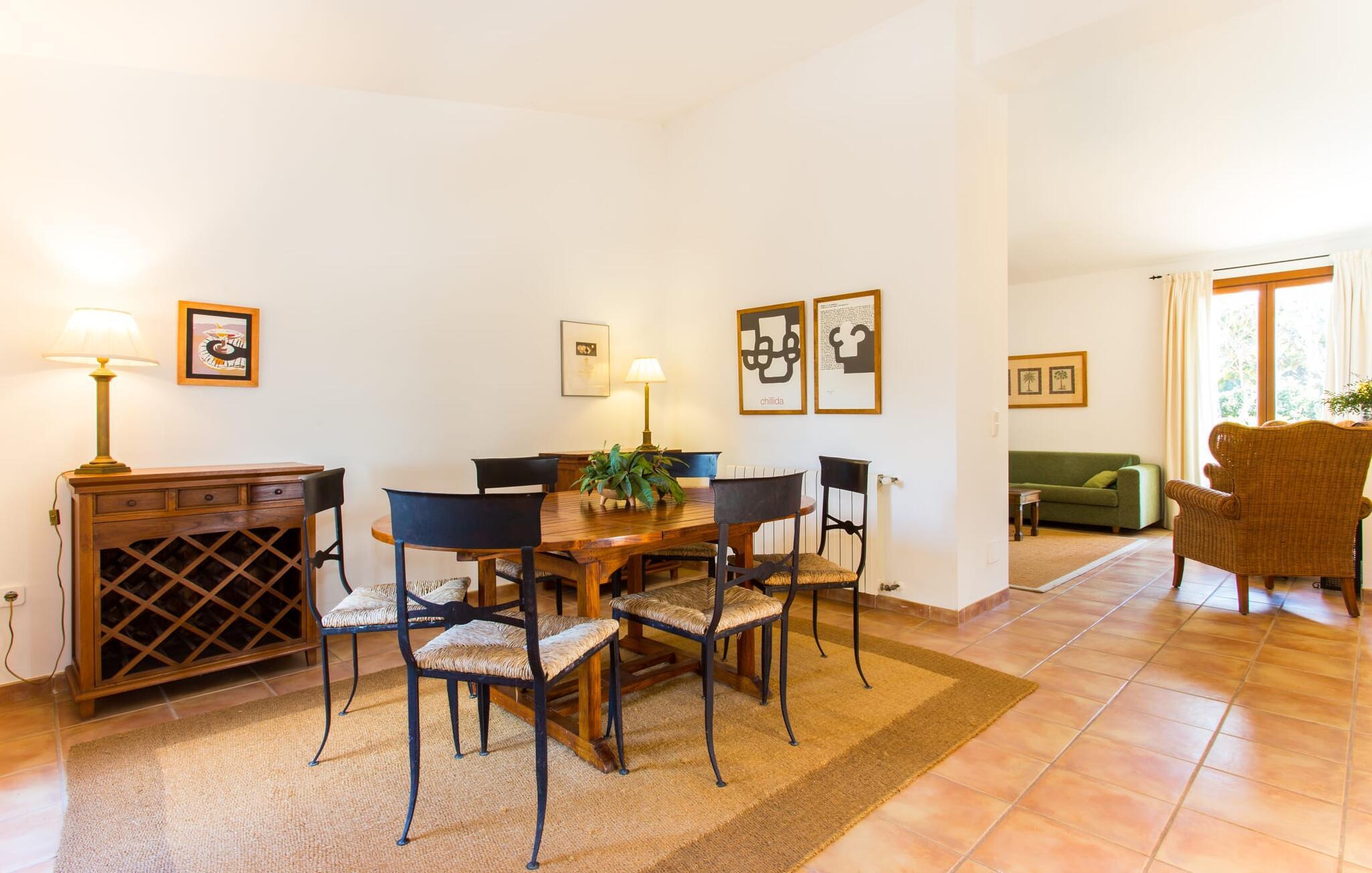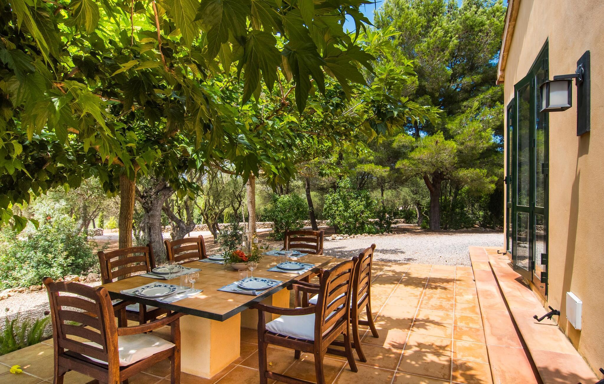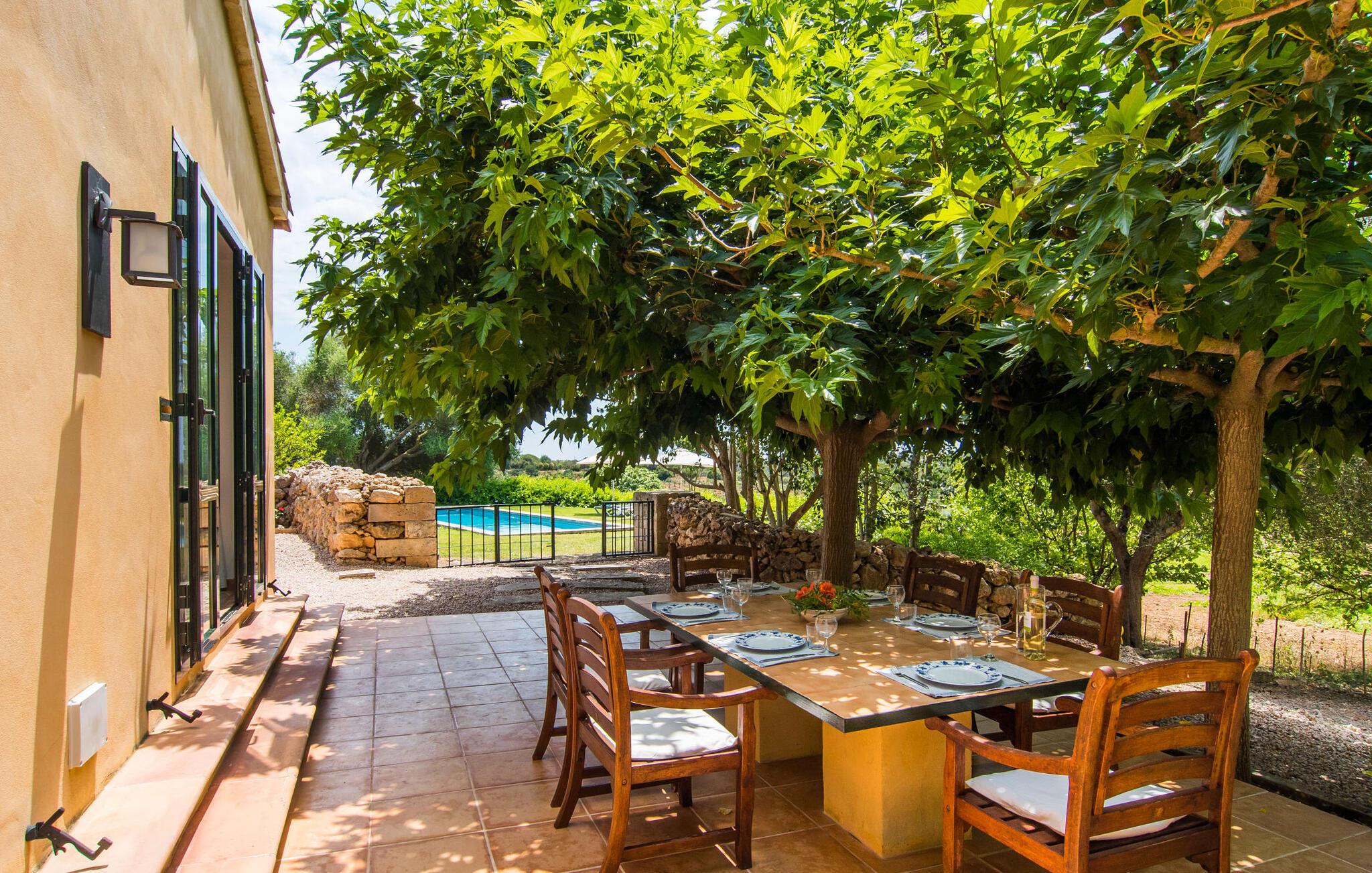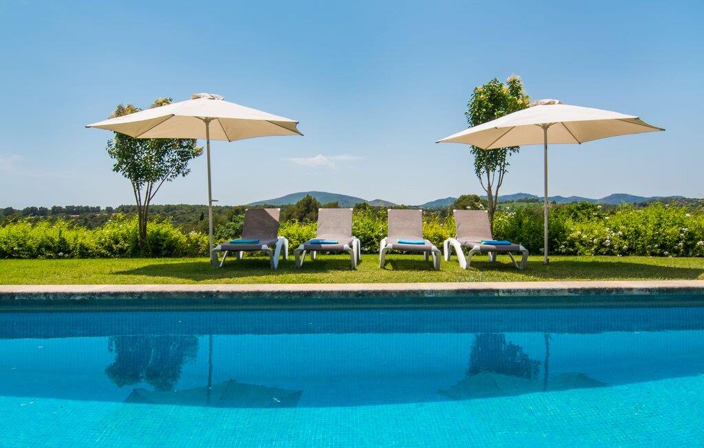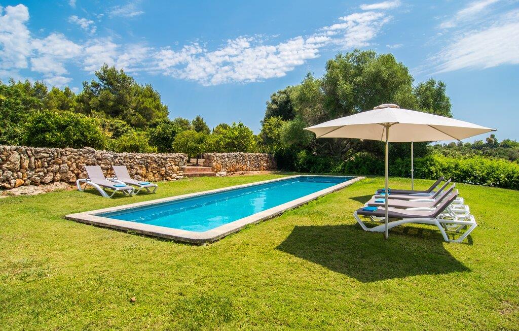 Die Villa „Es Gorg“ liegt in einer sehr ruhigen und idyllischen Lage im hübschen Osten Mallorcas – wo die sanften Hügel der Serra Levant eine liebliche mediterrane Küstenlandschaft bilden. Sie genießen den Luxus großer Privatsphäre, ohne während Ihres Aufenthalts von hohen Mauern oder Zäunen eingeengt zu sein. Ein malerischer Garten mit Obstbäumen und Rosen umgibt das Haus, der in seiner Fröhlichkeit mit den grünen Farben der Rasenflächen und dem Blau des mediterranen Himmels konkurriert. Der lange Pool liegt direkt vor dem Haus und ist durch eine kleine Gartentür zugänglich. Der 1,60 bis 2 m tiefe, mit kleinen blauen Mosaikkieseln geflieste Pool ist von Rasenflächen umgeben, die idyllische Ausblicke ins Grüne bieten. Genießen Sie die Aussicht bequem auf den sechs Sonnenliegen. Direkt am Haus laden Kies- und Fliesenflächen sowie schattige und sonnige Plätze zum Entspannen im Freien ein. Ob vor oder hinter dem Gebäude – hier findet jeder seinen perfekten Platz. Eingebaute Esstische verleihen den Sitzbereichen ein besonders eindrucksvolles Ambiente, um gemeinsam ein schönes Essen zu genießen. Für Ihr Auto gibt es einen Parkplatz vor dem Haus.