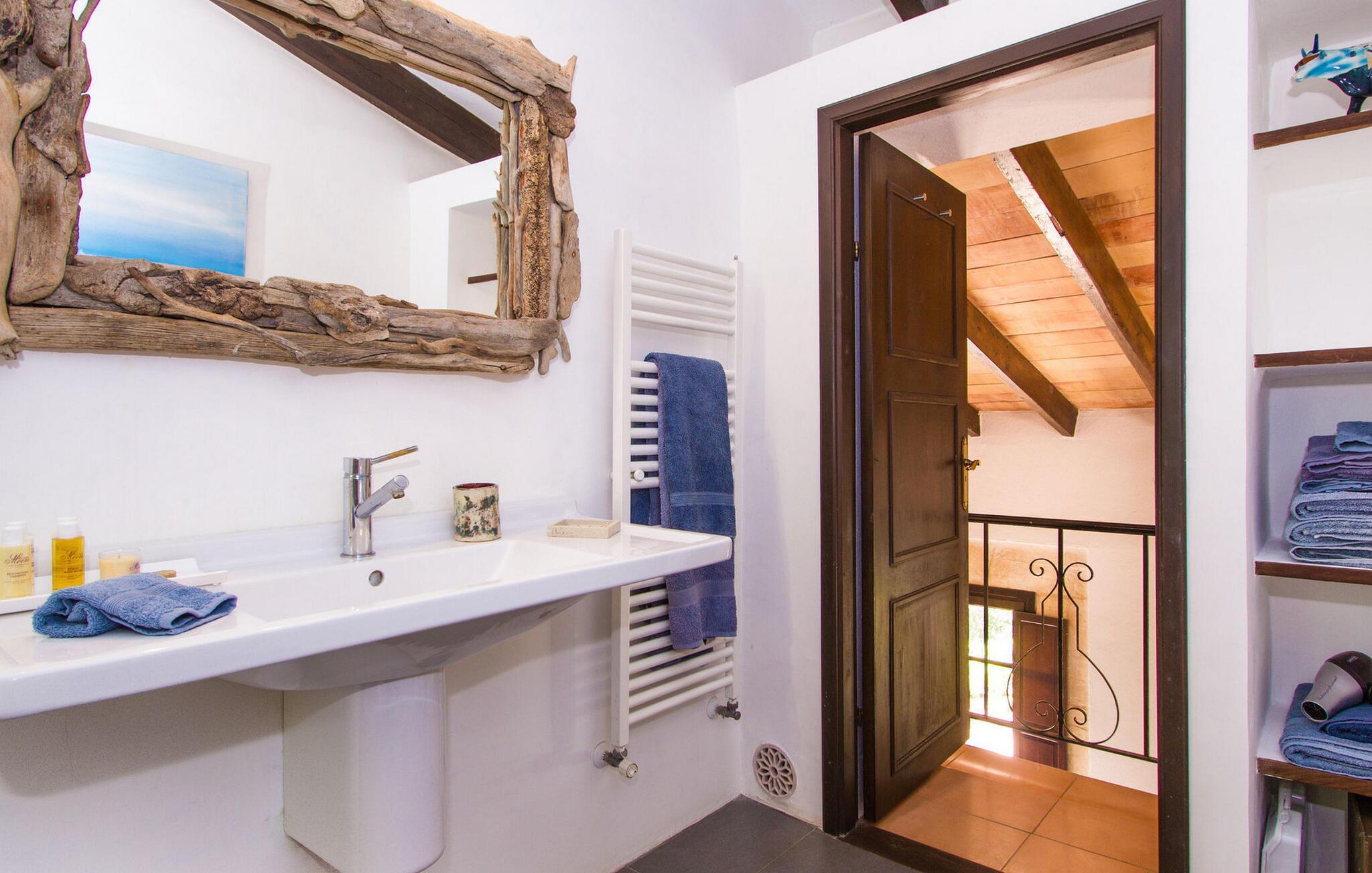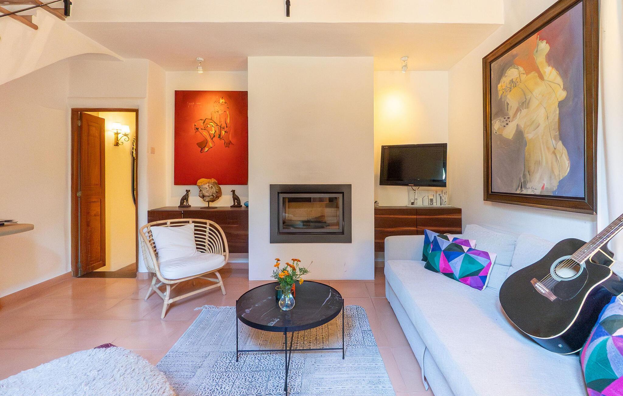Im Inneren des Hauses finden Sie Perserteppiche, Antiquitäten und Originalkunstwerke. Im Erdgeschoss befindet sich ein Wohnzimmer mit einer kleinen Bibliothek und einem Kamin für die kühleren Monate. Die voll ausgestattete Küche im Landhausstil verfügt über Marmorarbeitsplatten und einen großen Gasherd. Eines der drei Schlafzimmer befindet sich im Erdgeschoss und verfügt über ein eigenes Bad und eine private Terrasse. Im Obergeschoss befinden sich zwei Doppelzimmer, eines mit begehbarem Kleiderschrank und Balkon. Ein modernes Gemeinschaftsbad dient beiden Schlafzimmern im Obergeschoss. Im gesamten Gebäude ist Highspeed-WLAN verfügbar.
