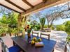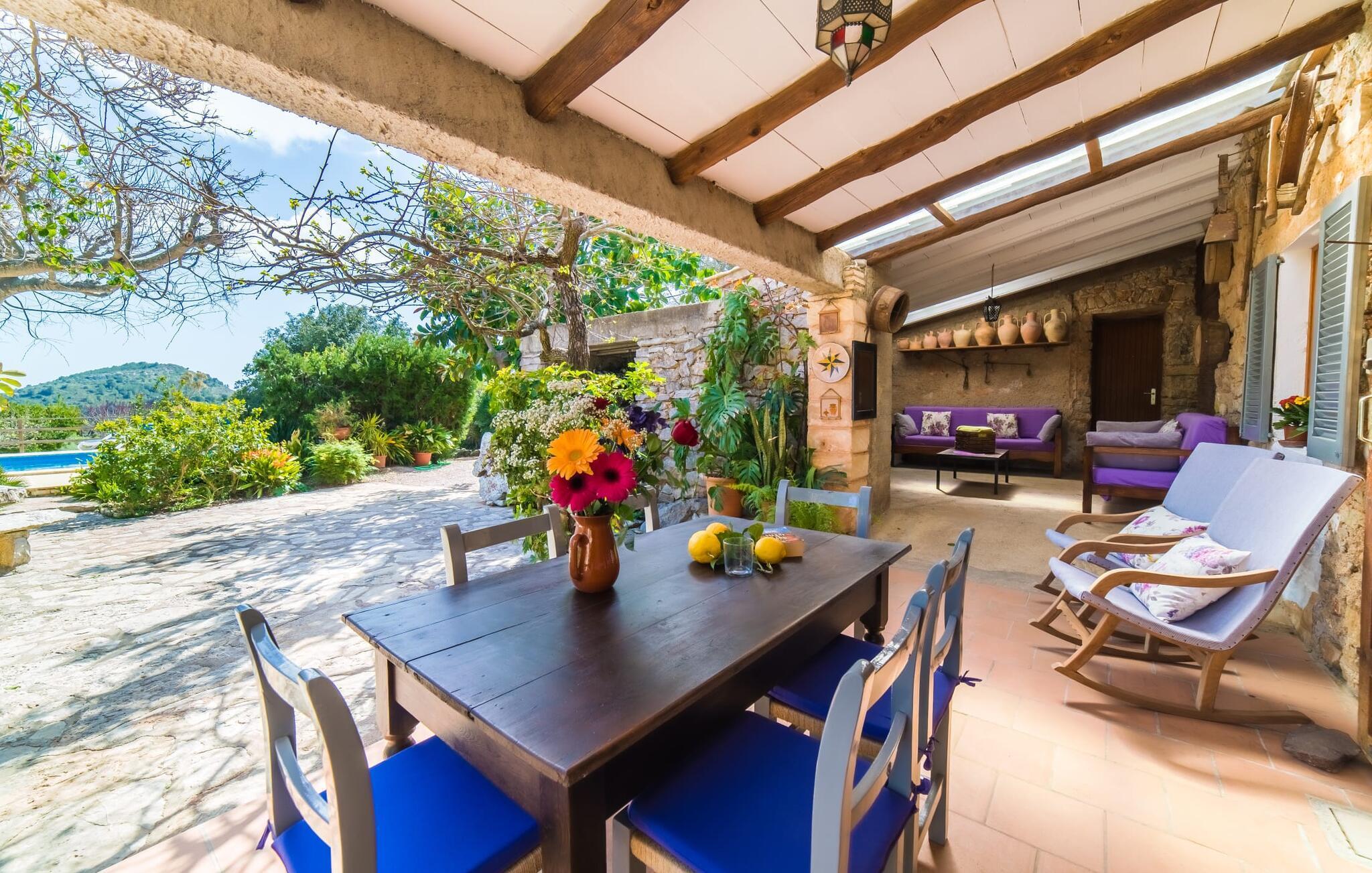 In der Meerblick-Villa „Es Rafal de Baix“ können bis zu acht Reisende einen herrlich ruhigen Urlaub in wunderschöner ländlicher Lage erleben. Die Eigentümer haben dieses Ferienhaus besonders liebevoll für die Ferienvermietung konzipiert und dadurch ein absolut einladendes Wohnambiente geschaffen. Der Außenbereich strahlt eine ansprechende Idylle aus und lockt mit dem schönen Pool mit Meerblick, der üppigen Bepflanzung mit Palmen und anderen mediterranen Pflanzen, dem verzweigten Terrassenbereich, dem ummauerten Grill und verschiedenen attraktiven Sitzmöglichkeiten. Das Herzstück des Außenbereichs, der leicht erhöhte Pool mit seiner umlaufenden Lounge-Terrasse, gibt den Blick auf die wunderschöne umliegende Landschaft frei und stellt einen besonders exponierten Ort dar, an den man immer wieder gerne zurückkommt. Auf insgesamt acht Poolliegen können Sie nach Herzenslust unter dem tiefblauen Mittelmeerhimmel entspannen und die Ruhe genießen. Um sich vor starker UV-Strahlung zu schützen, stehen Ihnen ausreichend Sonnenschirme zur Verfügung. Sie können sich auch ein luftiges, natürliches Schattenplätzchen suchen, das je nach Tageszeit leicht zu finden ist – zum Beispiel auf der urigen Steinsitzgruppe direkt neben der Poolterrasse. Am Haus erwartet Sie eine ebenso gemütliche wie malerische überdachte Terrasse. Holzmöbel werden absolut stimmungsvoll mit Naturstein und originellem Dekor kombiniert, sodass zu jeder Tageszeit ein sehr ruhiger Bereich für gemeinsames Essen entsteht. Über eine verträumte kleine Treppe gelangt man auf eine Dachterrasse außerhalb des Hauses, die teilweise mit einem hellen Bambusdach versehen ist und einen weiteren potenziellen Lieblingsplatz darstellt. Hier bei Sonnenaufgang oder Sonnenuntergang bei einem leckeren Getränk sitzen: ein ganz besonderer Luxus, den Sie unbedingt nutzen sollten!