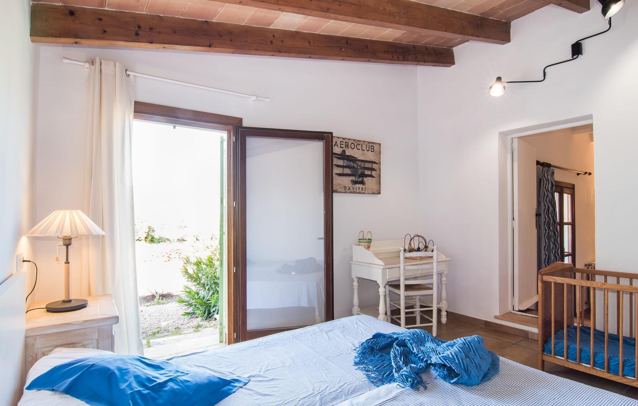 Jede Einheit hat ihren ganz eigenen Charme. Das Apartment „Es Blau“, dessen weiße Inneneinrichtung durch die vielen himmelblauen Akzente hervorgehoben wird, liegt links im Erdgeschoss des Hauptgebäudes. Alle Fenster sind mit Faltläden verdunkelbar. Von der 30 m² großen überdachten Terrasse (mit Esstisch und Sonnenliegen) gelangen Sie direkt in den ruhigen Teil des Gartens; Es ist ideal für einen Urlaub mit Kindern. Hinter der Glastür oder dem Vorhang mit blauem Muster verbirgt sich die gemütliche Fernsehecke, die mit der offenen Küchenzeile und dem Esstisch verbunden ist. Spaghetti mit Tomatensauce und frischen Kräutern sind auf dem Doppelbrenner-Gasherd schnell zubereitet. Von hier aus gelangt man von beiden Seiten über ein paar Stufen in eines der beiden Doppelzimmer. Beide verfügen über ein modernes En-Suite-Duschbad, eines davon mit direktem Zugang nach draußen. Sowohl neben dem 1,50 x 2 m großen Doppelbett als auch neben den beiden Einzelbetten ist Platz für ein Babybett. Und wenn Ihnen 70 m² Wohnfläche nicht ausreichen, sollten Sie das gesamte Anwesen zu Ihrem blühenden Wohn-, Ess- und Spielzimmer im Freien machen.