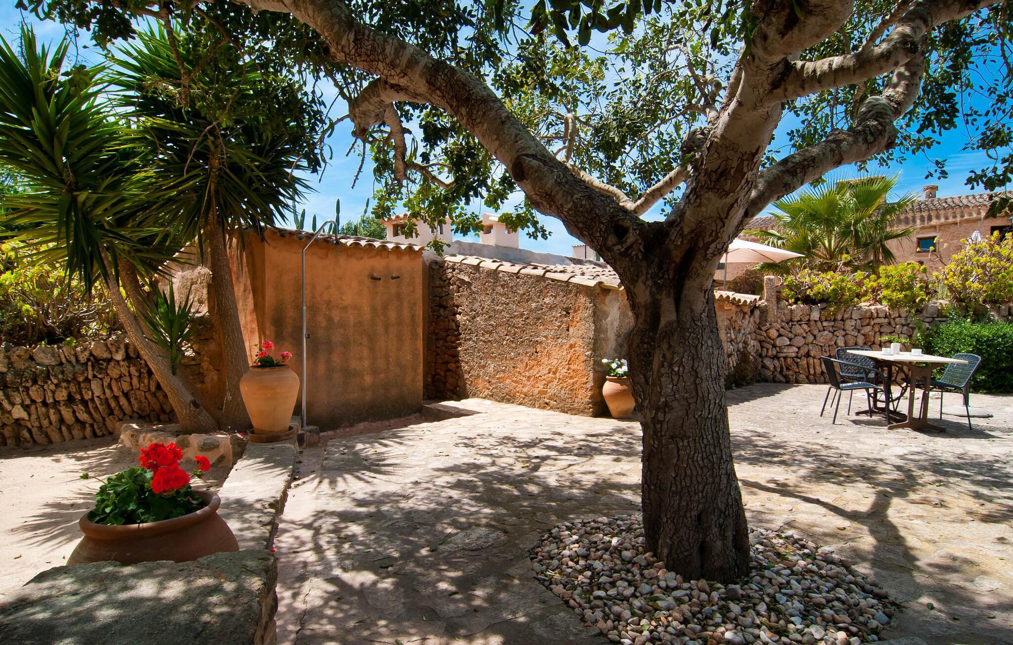 Historisches Anwesen auf rotem Boden, tierlieber Bauernhof, idyllische Mandelbaumvilla, komfortable und gesellige Agroturismo-Unterkunft: Es ist klar, dass diese Beschreibungen auf den roten Bauernhof „Es Rafal Roig“ mit seinem Haupthaus aus Naturstein und drei kleinen Nebenhäusern zutreffen Gebäude. Es gibt satte 350.000 m² üppiger Blumen- und Grünflächen zu entdecken, mit vielen Details, die Groß und Klein begeistern werden. Es gibt gemütliche Ecken, umgeben von Kakteen, Palmen, duftendem Oleander und unzähligen bepflanzten Terrakotta-Töpfen, Wasser aus dem hofeigenen Tiefbrunnen, Solarenergie sowie darin leben Meerschweinchen, Esel, Hühner, Gänse und Schildkröten eigenes Territorium. Während die Großen am 10 m langen, zentral gelegenen Pool entspannen, können die Kleinen im eigenen Pool hinter der Steinmauer planschen, den Sie von den Sonnenliegen aus wunderbar im Auge behalten können. Spielplätze mit großen und kleinen Rutschen, Sandkästen und Geräten für Ballspiele aller Art lassen keine Langeweile aufkommen und man kann auch bei der Landwirtschaft zusehen. Überall sind Stühle und Tische an sonnigen und schattigen Plätzen verteilt, an denen die Gäste ein Picknick machen oder sich unterhalten können. Das kleine Grillhäuschen, ein Original aus alten Zeiten, kann jeden Tag genutzt werden und teilt sich den Raum mit der Außentoilette und der Dusche.
