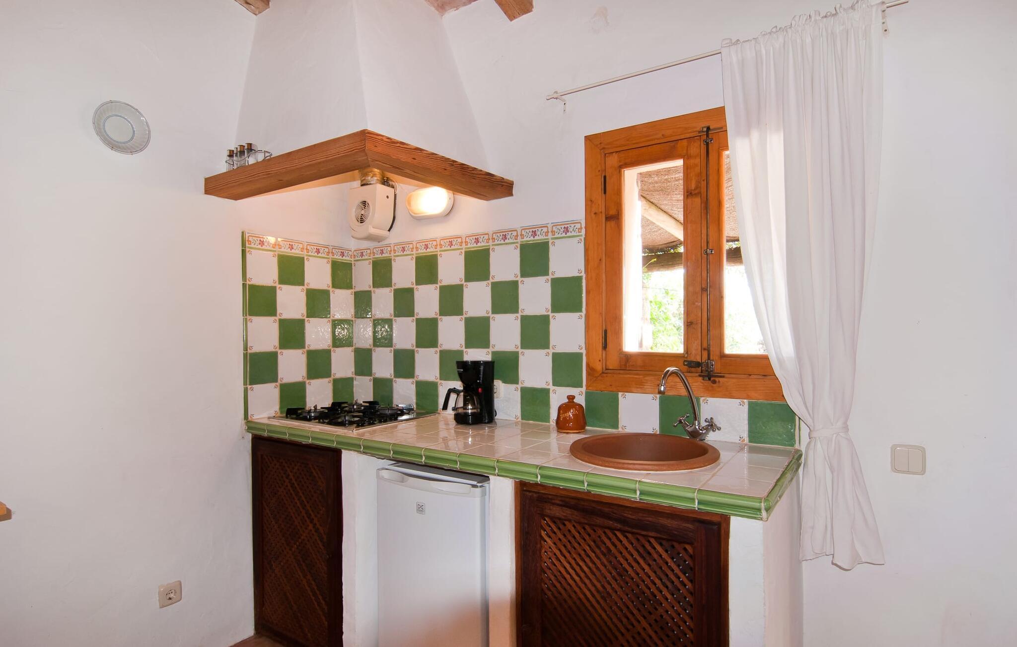 Jede Einheit hat ihren ganz eigenen Charme. Die Erdgeschosswohnung „Es Nou“ liegt, wie auch die Ferienhäuser „Es Nord“ und „Es Cestador“, in geringer Entfernung vom Hauptgebäude, so dass Sie die Ruhe auf Ihrer privaten Terrasse genießen können und dennoch in der Nähe sind Pool und die Tiere. Funktionalität und Komfort stehen hier im Vordergrund. Der Zierbogen im Inneren dient als optische Trennung zwischen Wohn- und Schlafbereich und sorgt zusammen mit dem massiven Sturz, den sichtbaren Balken und dem Mares-Sandstein an der Wand für eine besondere Atmosphäre. Entspannen Sie sich nach intensiven Stunden in der Sonne auf den beiden Sofas, speisen Sie gemeinsam am Tisch oder spielen Sie ein Spiel mit Ihren Kindern. Sie sind bestens für die Zubereitung Ihrer Mahlzeiten gerüstet und können hier Ihren Urlaub völlig unabhängig verbringen; Die integrierte Küchenzeile verfügt über 4 Gasherde, einen Kühlschrank, eine Spüle, eine Kaffeemaschine etc. Die beiden Schlafzimmer sind jeweils entweder mit einem 1,5 x 2 m großen Bett oder zwei 0,9 x 2 m großen Einzelbetten ausgestattet. Das Badezimmer verfügt über eine mit Mosaiksteinen gestaltete Dusche und punktet mit seinem modernen Waschbecken. Und wenn Ihnen 69 m² Wohnfläche nicht ausreichen, sollten Sie das gesamte Anwesen zu Ihrem blühenden Wohn-, Ess- und Spielzimmer im Freien machen.