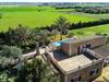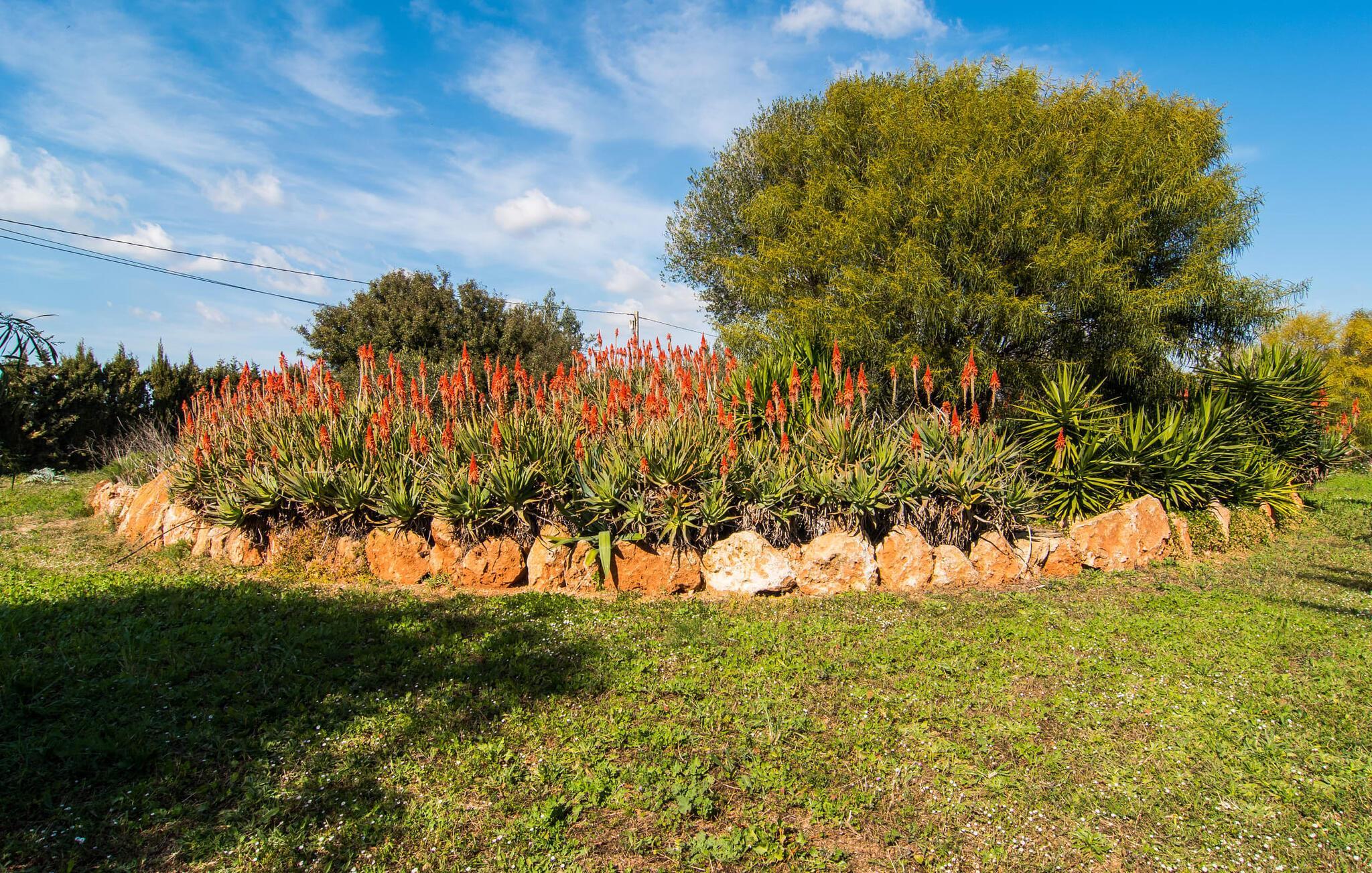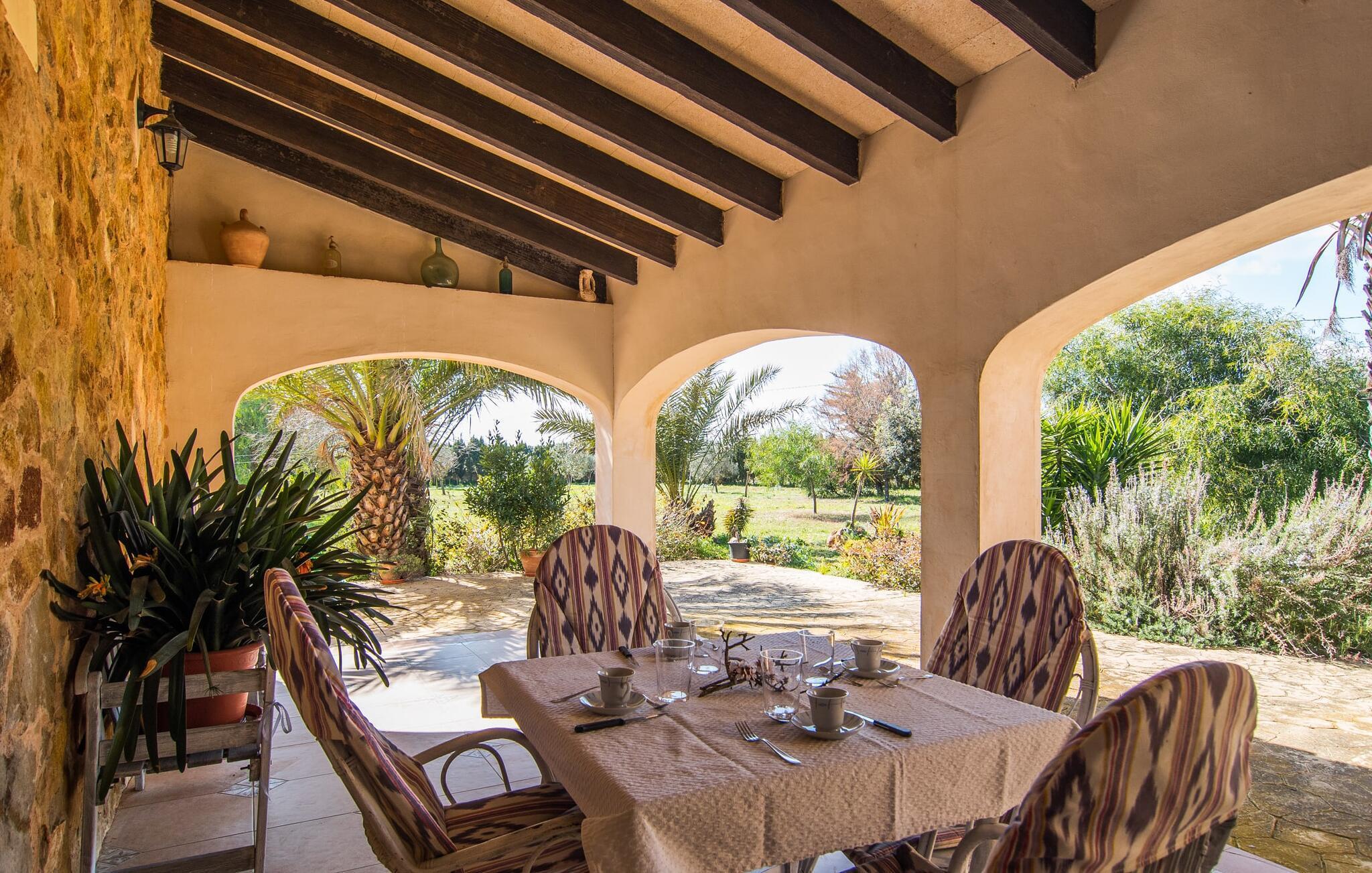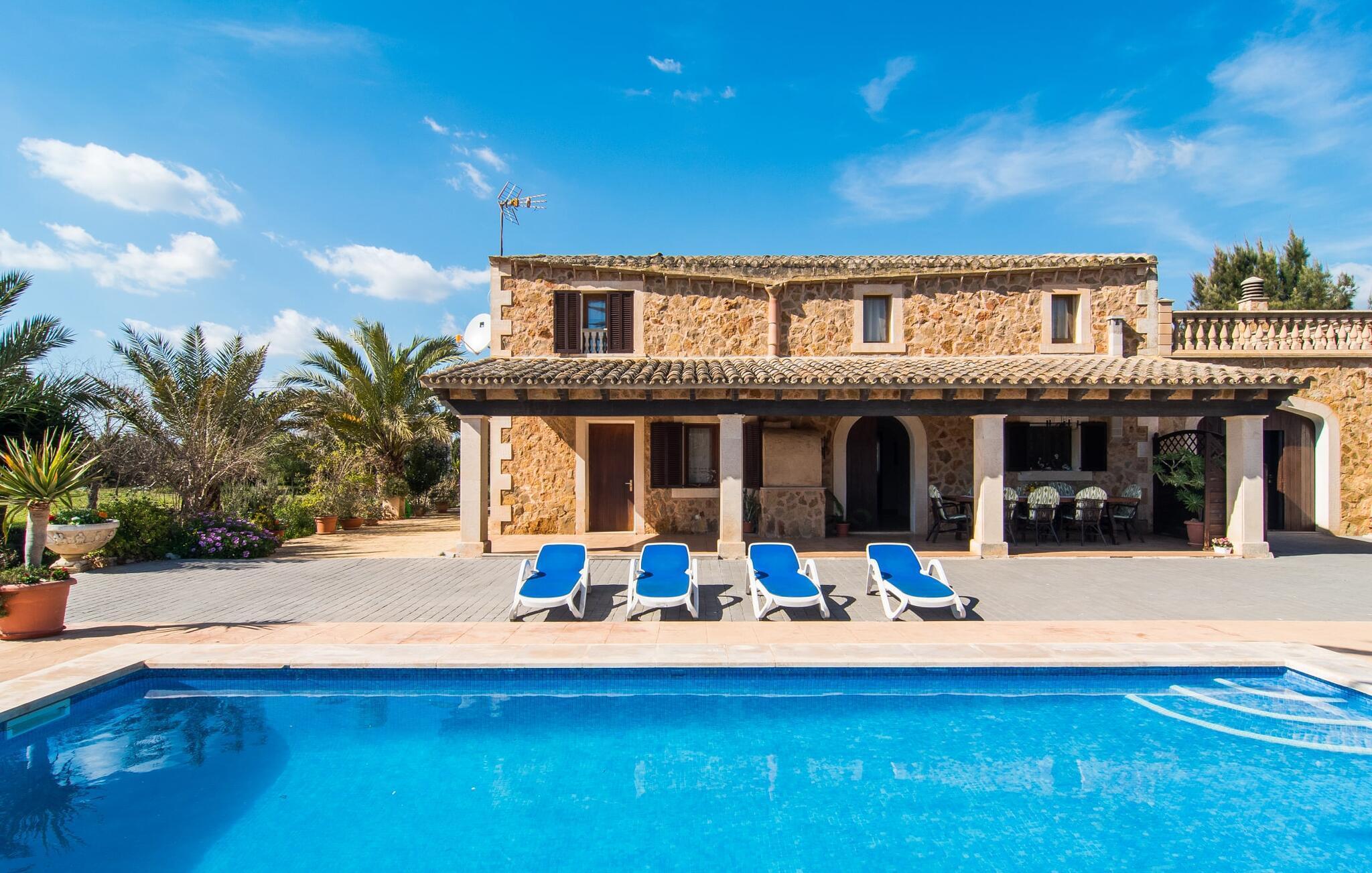 Wenn Sie sich für die Villa „Es Revolt de Sa Barrala“ entscheiden, erwartet Sie ein rundum bodenständiges Anwesen mit einem äußerst gepflegten, attraktiven Außenbereich. Der Pool neben der Palme, der tropisches Flair versprüht, ist mit seinen 6 x 4 m groß genug, um ein paar Bahnen zu schwimmen. Direkt daneben gibt es sogar einen Fußballplatz, der nicht nur bei den jüngsten Reisenden beliebt sein wird. Die Gartengestaltung besticht durch viel Abwechslung – mediterrane Bäume, Sträucher und Rasenflächen bilden ein harmonisches Ensemble, das viel Entspannung bietet. Die Luftaufnahmen der Villa zeigen, wie grün die Umgebung ist. Damit einher geht viel Privatsphäre, die Sie bei stimmungsvollen Grillpartys genießen können. Perfekt hierfür ist der seitliche Anbau, bei dem ein massiver gemauerter Grill ausreichend Platz für Ihre Köstlichkeiten bietet. Diese können Sie dann zum Beispiel auf der überdachten Terrasse genießen, wo ein rustikaler Holztisch zum Sitzen einlädt. Besonders sonnenverwöhnt ist die Dachterrasse. Sie erreichen es vom ersten Stock aus. Ansonsten stehen auch Liegen direkt am Pool zur Verfügung, so dass nach dem täglichen Bad noch ein bisschen Sonnenbaden folgen kann.