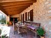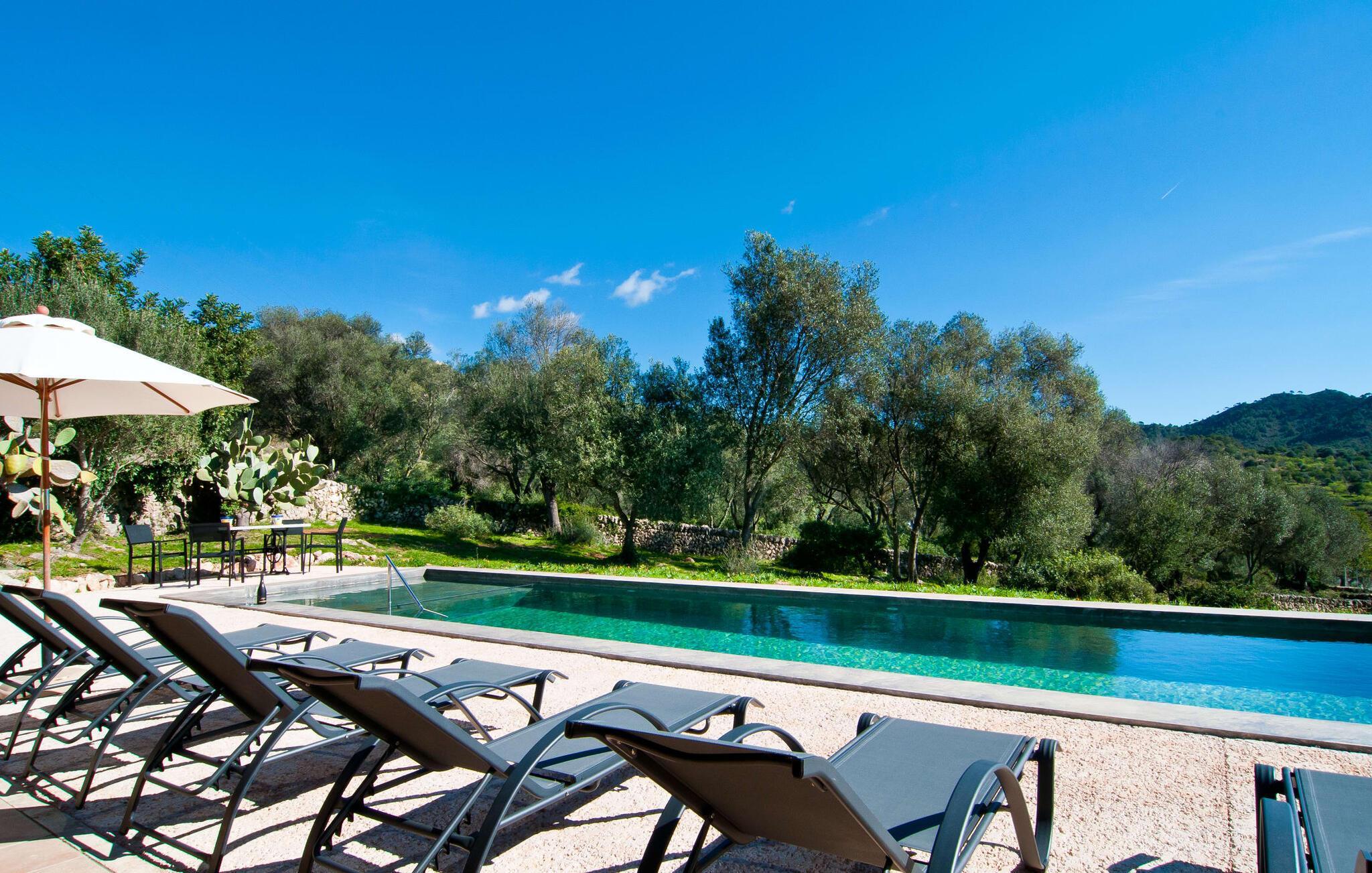 Schon beim Betreten der Villa „Esteparo“ fällt dem Besucher die typisch mallorquinische Architektur des Hauses – Naturstein, breite Wände, Fensterläden aus Holz – angenehm ins Auge. Das Anwesen verfügt über eine außergewöhnliche Größe von 175.000 m², wurde teilweise als dekoratives Atrium sowie einen wunderschönen Garten gestaltet und ist wunderschön in die hügelige Umgebung eingebettet. Die Eingangsfassade und der Vorhofbereich empfangen die Gäste in einer sehr gepflegten und geschmackvollen Atmosphäre. Es macht sofort Lust, einzutreten und den Innenraum zu betrachten. Doch bleiben wir zunächst im Außenbereich, denn hier gibt es einiges zu entdecken. Wenn Sie im Uhrzeigersinn um das Haus herumgehen, gelangen Sie auf den sehr einladenden überdachten Terrassenbereich, auf dem Sie im luftigen Schatten sitzen und einen wunderschönen Blick auf den Pool, den herrlich grünen Garten und weit darüber hinaus genießen können. Dies ist der ideale Ort, um den Tag morgens mit einem erfrischenden Frühstück zu begrüßen und Pläne für den aufregenden Tag zu schmieden, der vor Ihnen liegt. Ein nostalgischer, großer Holztisch mit Bank und Stühlen verleihen diesem Bereich in Kombination mit den beeindruckenden Holzbalken an der Decke ein ganz besonderes Flair. Das lässt sich auch am Abend genüsslich zelebrieren. Der direkt nebenan installierte fest installierte Grill wird hier sicherlich gute Dienste leisten und frische, regionale Köstlichkeiten zubereiten. Im übergroßen Pool können Sie sich nach Herzenslust erfrischen. Das Becken verfügt über einen besonders bequemen Einstieg und grenzt an die Lounge-Terrasse, auf der Sie unter mediterranem Himmel ausgiebig entspannen können. Wenn die Sonneneinstrahlung zu stark wird, kann und sollte ein Sonnenschirm zum Einsatz kommen. Insgesamt stehen Ihnen 10 bequeme Poolliegen zur Verfügung, weitere nette Sitzgelegenheiten warten in der Nähe des Pooleingangs.