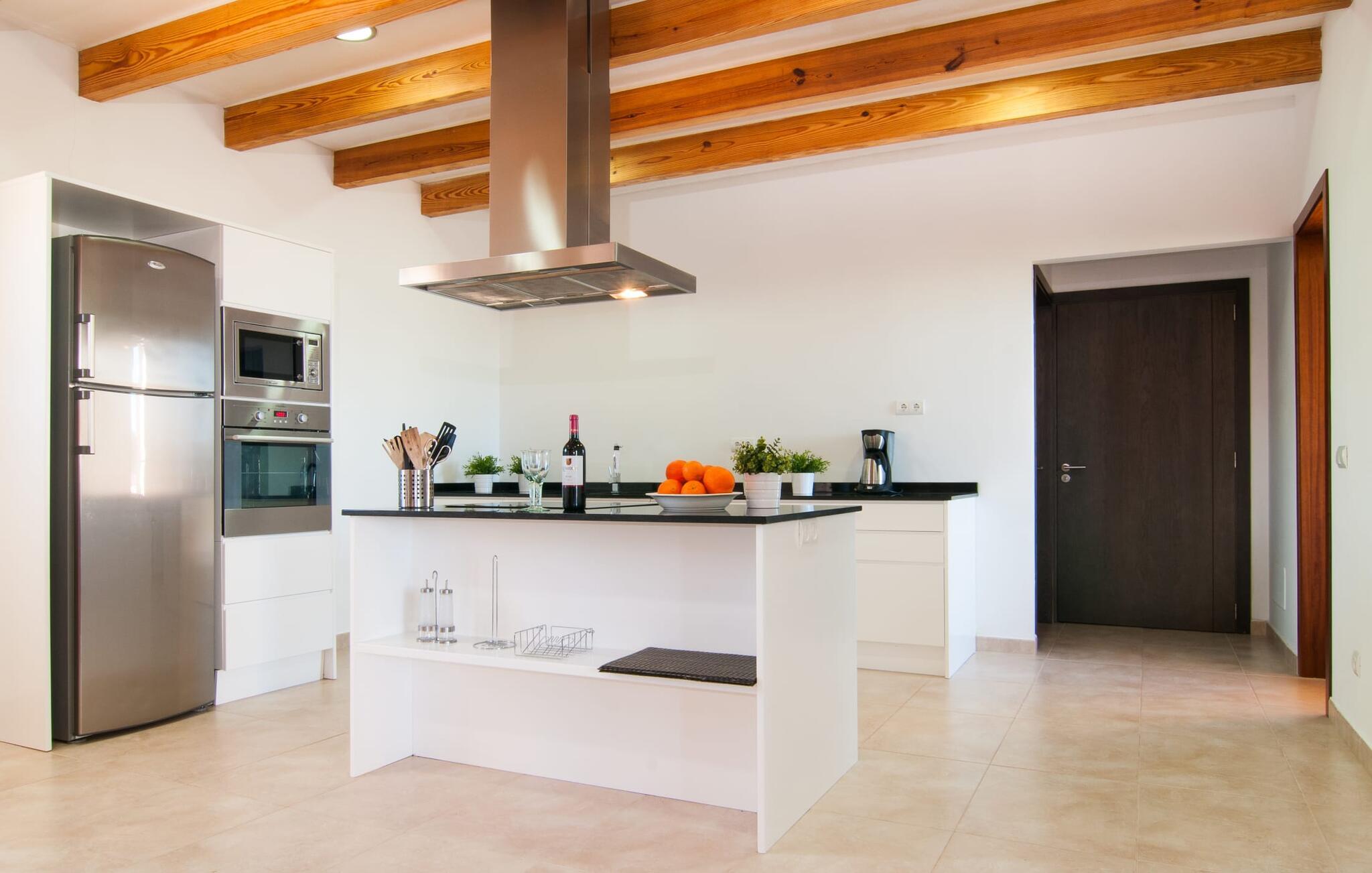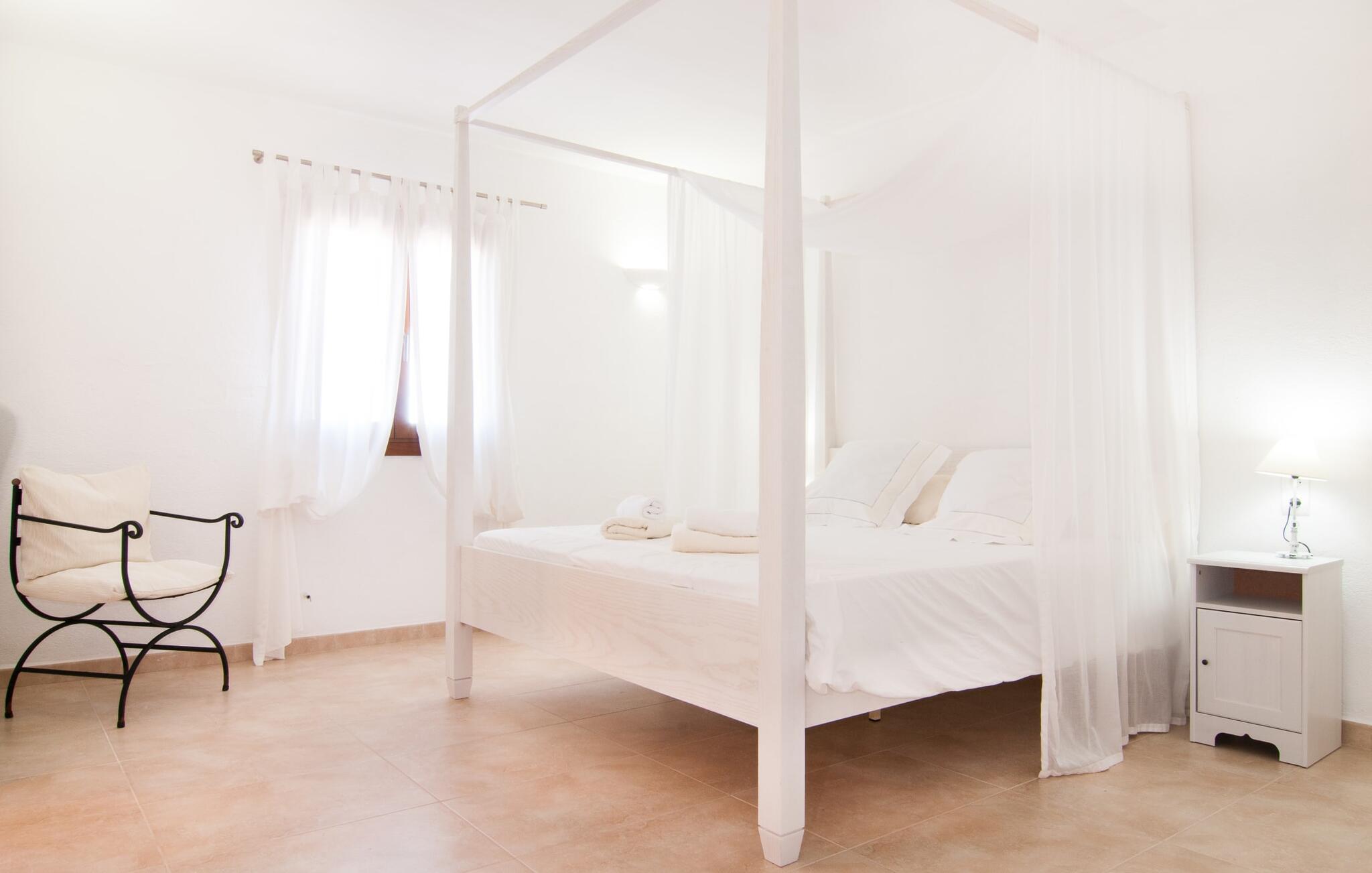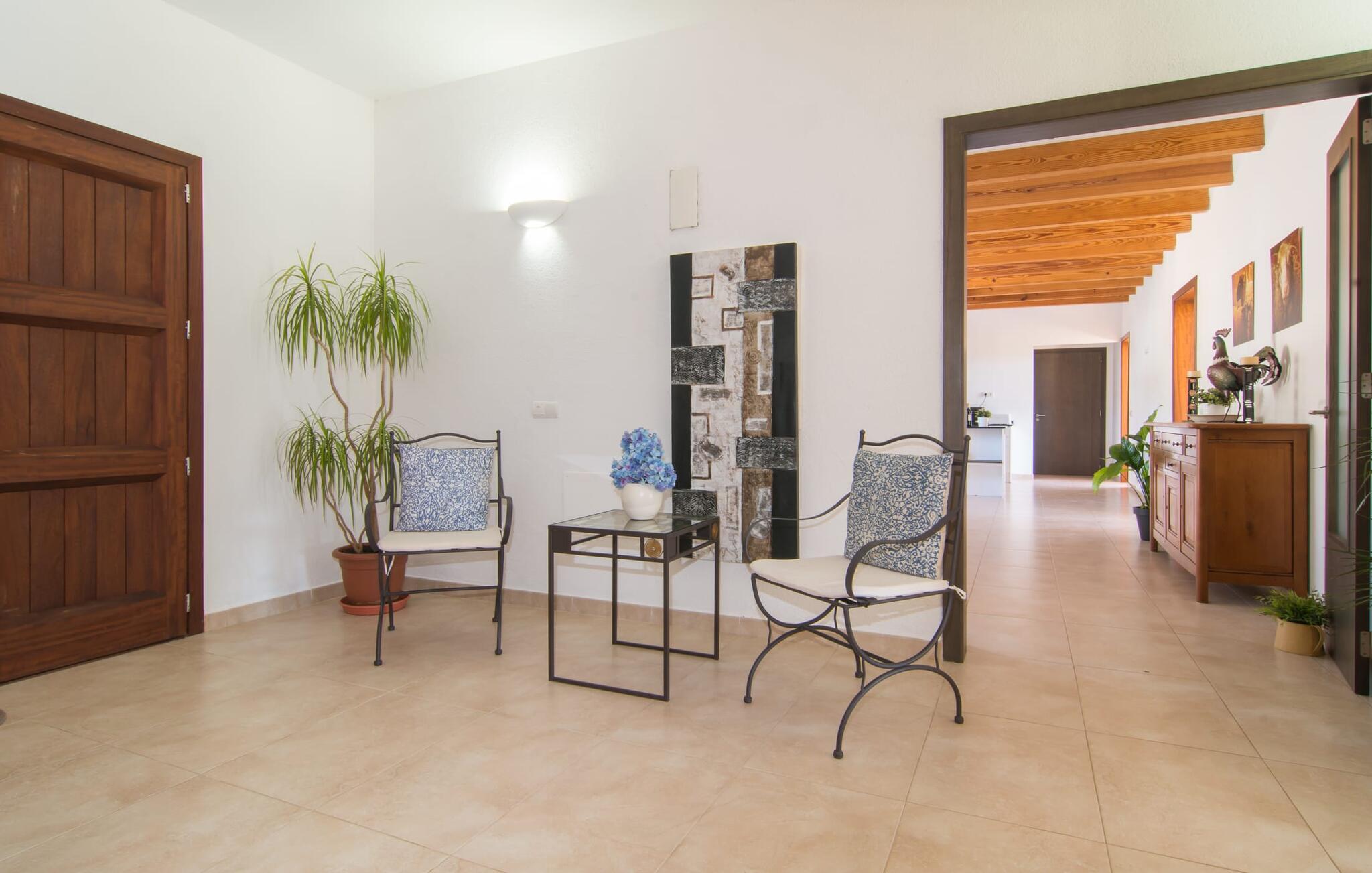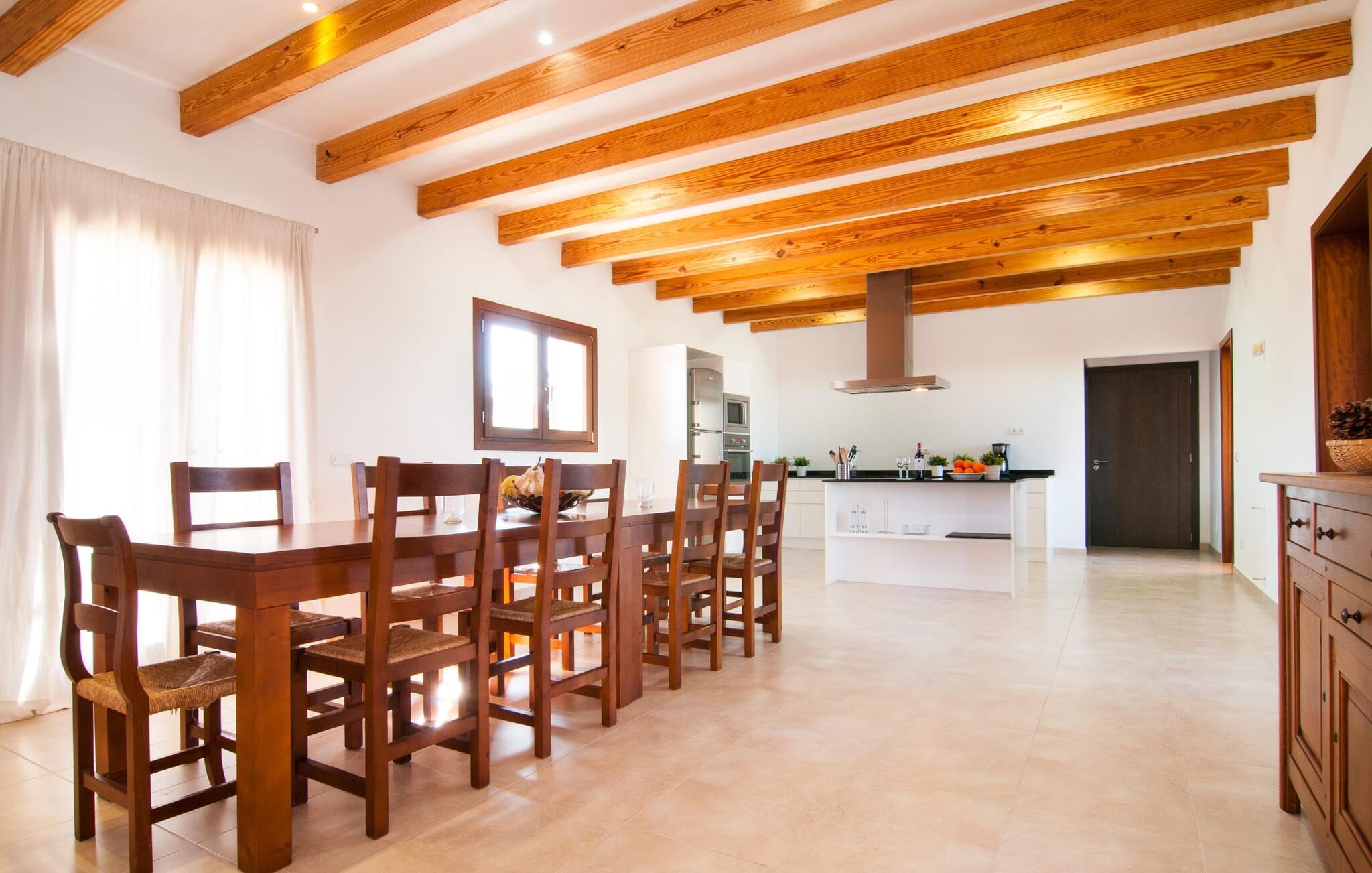 Das Innere der Villa zeichnet sich durch eine bestechende Schönheit und Eleganz aus. Gemessen an der Größe der Reisegruppe, die hier bequem Platz findet, sind die im Erdgeschoss gelegenen Gemeinschaftsräume – das Wohnzimmer und das offene Esszimmer – sehr geräumig. Die lichtdurchfluteten Bereiche bieten Raum für individuelle Bewegung und zum freien Durchatmen und bestechen durch schicke Eleganz mit den weißen Wänden, den sichtbaren Holzbalken und den großformatigen Bodenfliesen. Die Möblierung ist diesem zeitlos-modernen Geschmack angepasst: Ein einladender langer Esstisch für alle Gäste steht neben der modernen, weißen Einbauküche mit Kochinsel – hier wird das gemeinsame Kochen zum kommunikativen und fröhlichen Erlebnis und entfällt Unannehmlichkeit. Im Wohnbereich lädt ein LCD-TV zu gemütlichen Abenden ein. Die komfortablen Schlafzimmer sind äußerst geschmackvoll eingerichtet, auch hier wurde Wert auf klare Linien und Stil gelegt. Anstatt jedes Zimmer gleich auszustatten, haben die Eigentümer für jede Schlafzimmersuite ein individuelles Design gewählt: Dieses reicht von schlichten weißen Möbeln über gekalkte Eiche bis hin zu hellem Grau. Um Ihre Privatsphäre innerhalb Ihrer Reisegruppe zu wahren, sind vier der Schlafzimmer mit einem eigenen Bad ausgestattet. Die anderen beiden Badezimmer sind den restlichen beiden Schlafzimmern zugeordnet, verfügen jedoch nicht über ein eigenes Bad. Ausgestattet mit einer sehr modernen und hervorragenden Badezimmerausstattung verfügen alle Badezimmer entweder über eine Badewanne oder einen begehbaren Duschbereich.