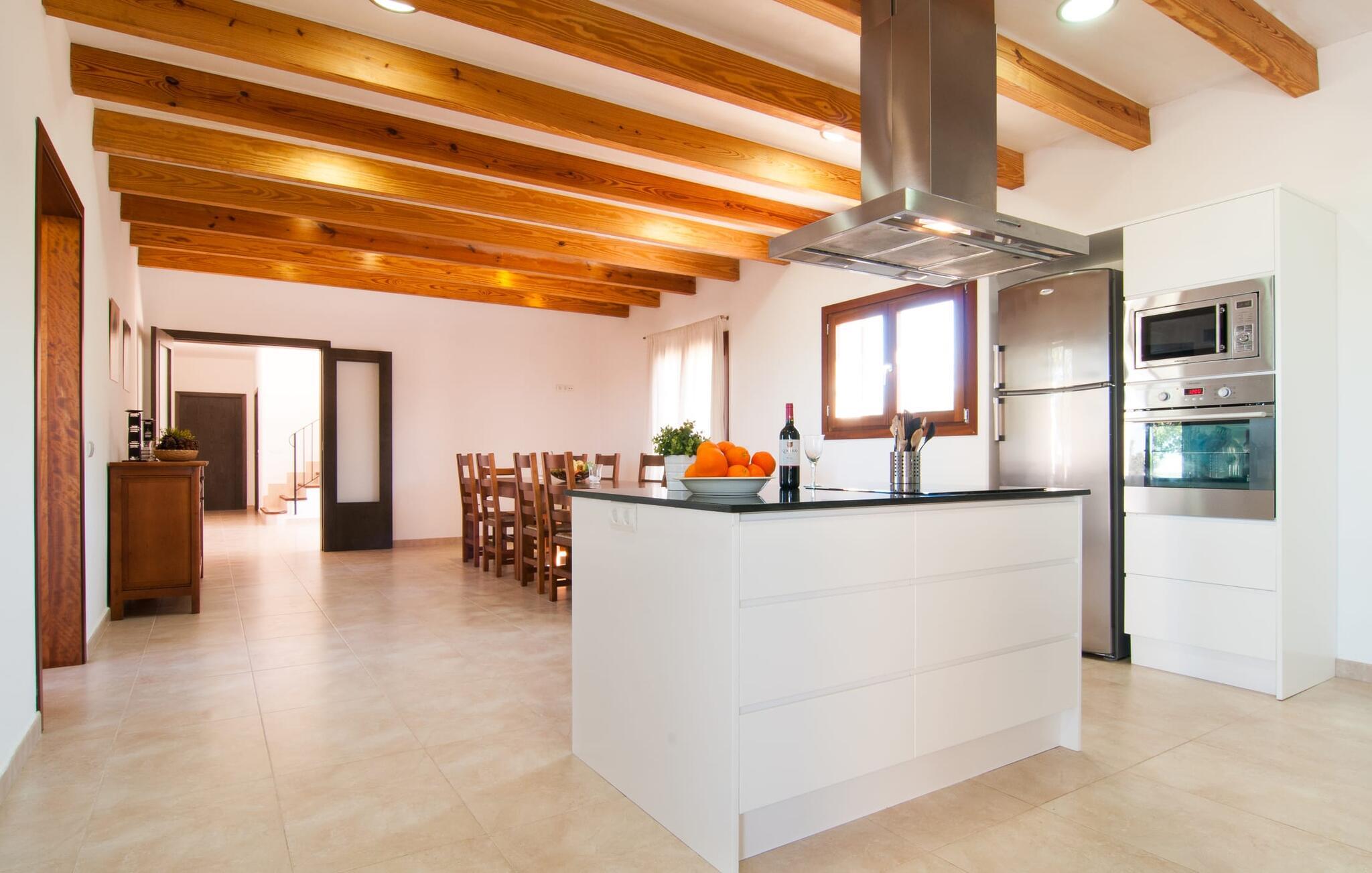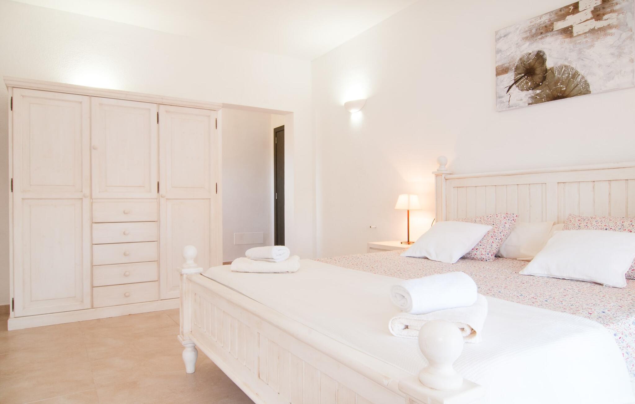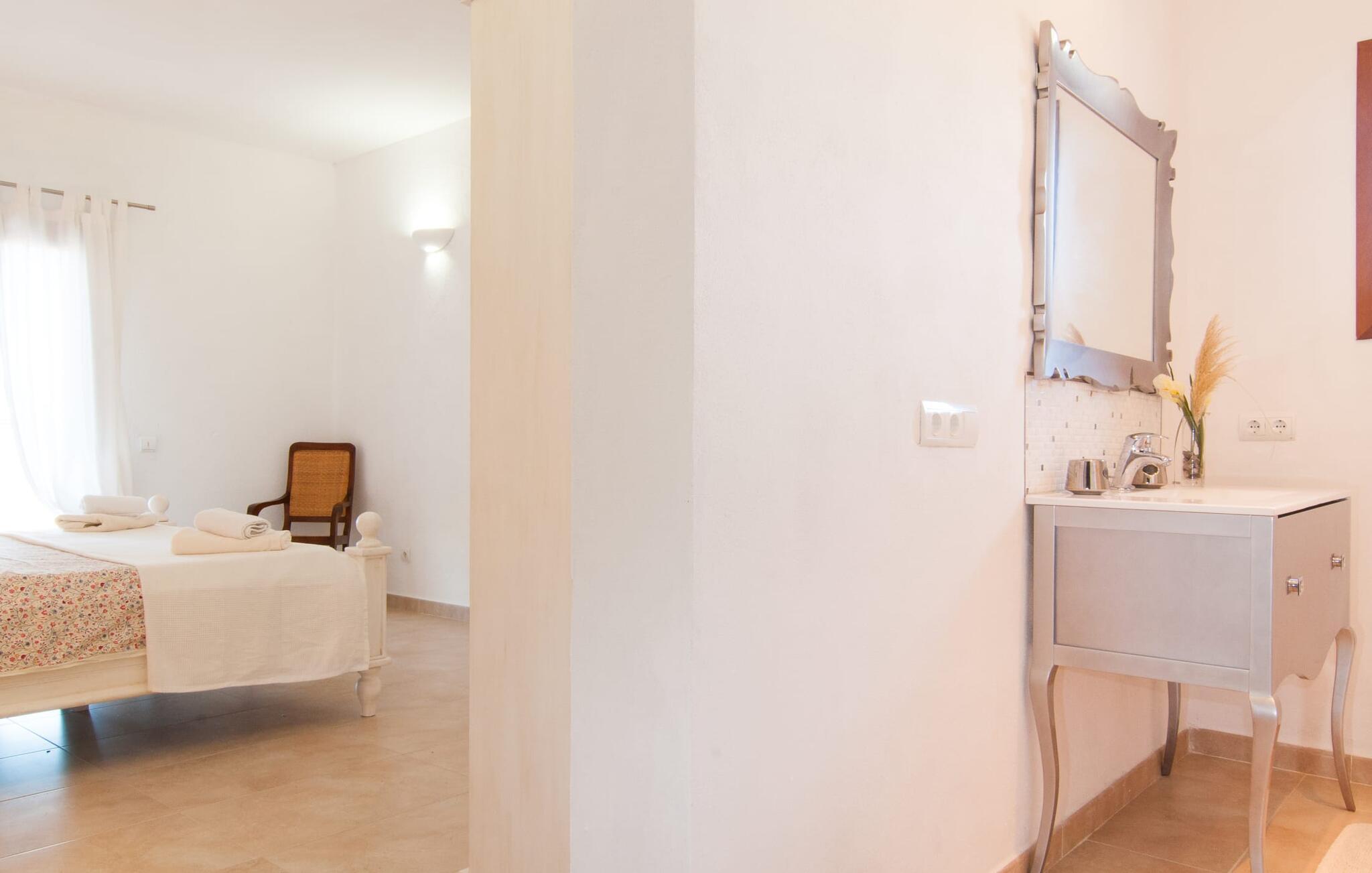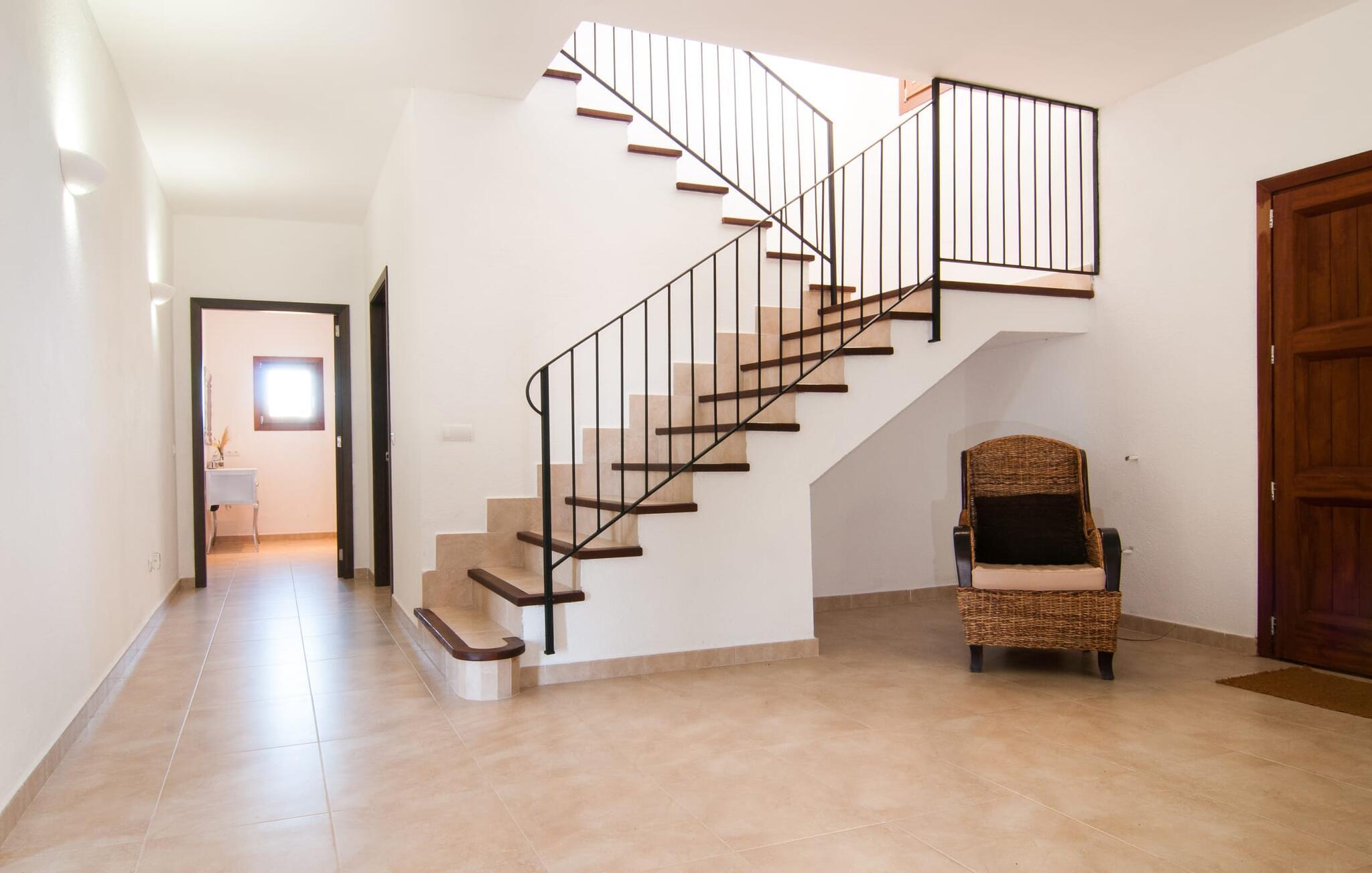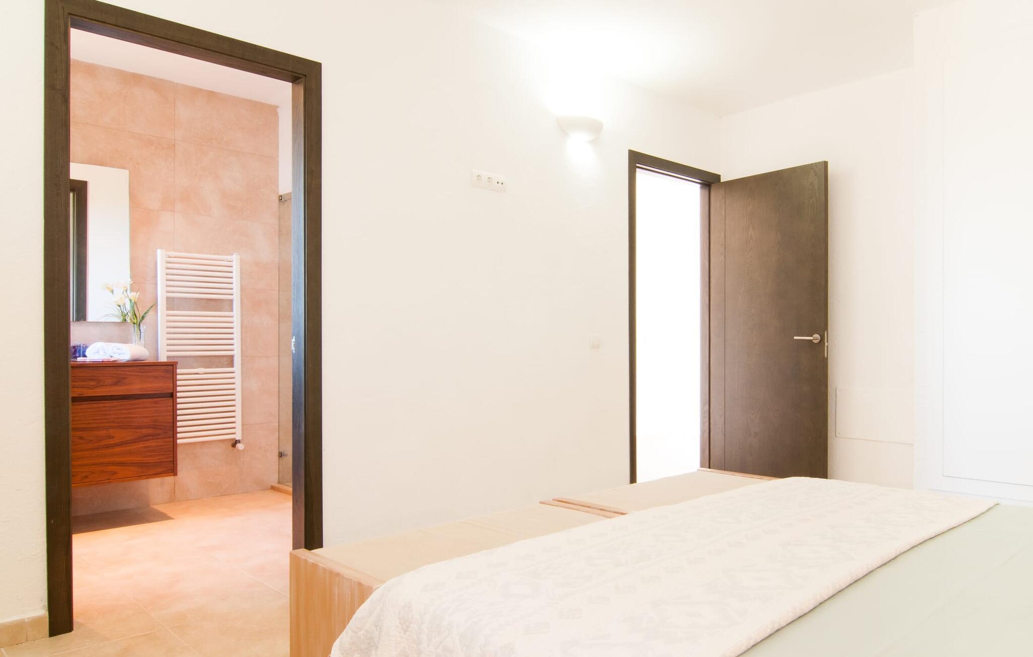 Das Innere der Villa zeichnet sich durch eine bestechende Schönheit und Eleganz aus. Gemessen an der Größe der Reisegruppe, die hier bequem Platz findet, sind die im Erdgeschoss gelegenen Gemeinschaftsräume – das Wohnzimmer und das offene Esszimmer – sehr geräumig. Die lichtdurchfluteten Bereiche bieten Raum für individuelle Bewegung und zum freien Durchatmen und bestechen durch schicke Eleganz mit den weißen Wänden, den sichtbaren Holzbalken und den großformatigen Bodenfliesen. Die Möblierung ist diesem zeitlos-modernen Geschmack angepasst: Ein einladender langer Esstisch für alle Gäste steht neben der modernen, weißen Einbauküche mit Kochinsel – hier wird das gemeinsame Kochen zum kommunikativen und fröhlichen Erlebnis und entfällt Unannehmlichkeit. Im Wohnbereich lädt ein LCD-TV zu gemütlichen Abenden ein. Die komfortablen Schlafzimmer sind äußerst geschmackvoll eingerichtet, auch hier wurde Wert auf klare Linien und Stil gelegt. Anstatt jedes Zimmer gleich auszustatten, haben die Eigentümer für jede Schlafzimmersuite ein individuelles Design gewählt: Dieses reicht von schlichten weißen Möbeln über gekalkte Eiche bis hin zu hellem Grau. Um Ihre Privatsphäre innerhalb Ihrer Reisegruppe zu wahren, sind vier der Schlafzimmer mit einem eigenen Bad ausgestattet. Die anderen beiden Badezimmer sind den restlichen beiden Schlafzimmern zugeordnet, verfügen jedoch nicht über ein eigenes Bad. Ausgestattet mit einer sehr modernen und hervorragenden Badezimmerausstattung verfügen alle Badezimmer entweder über eine Badewanne oder einen begehbaren Duschbereich.