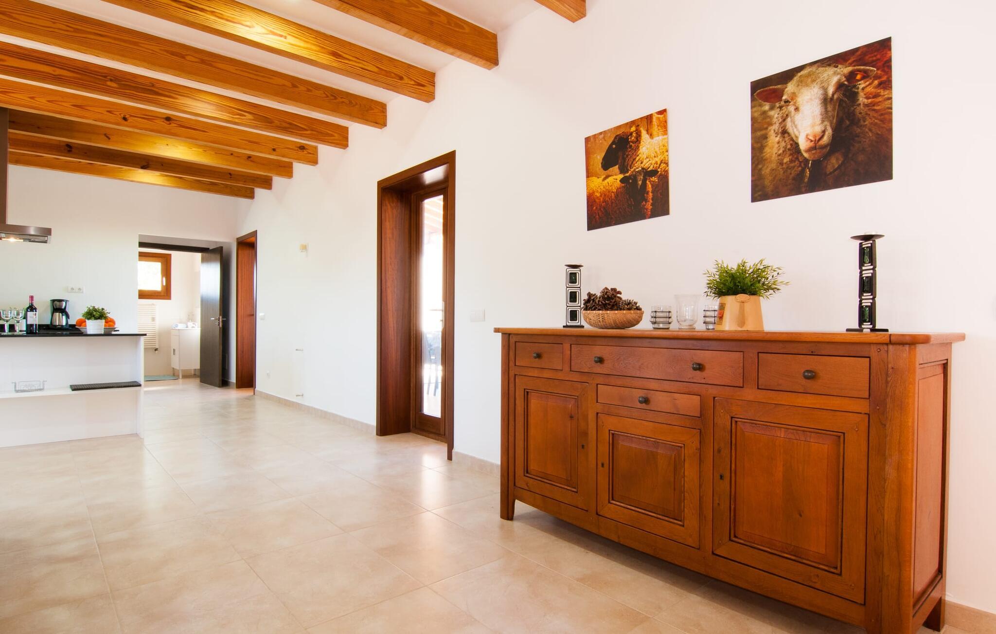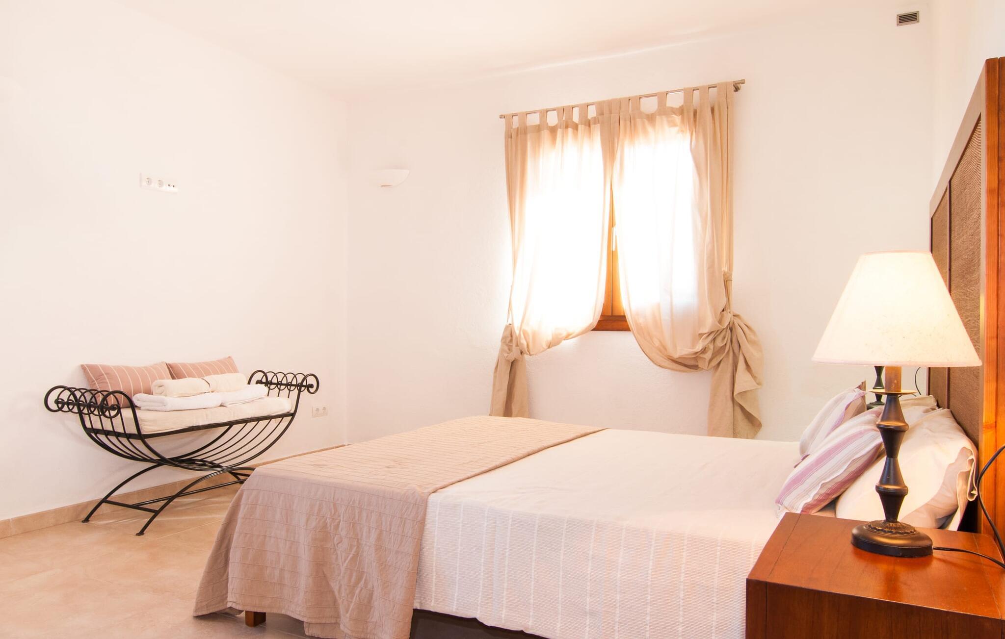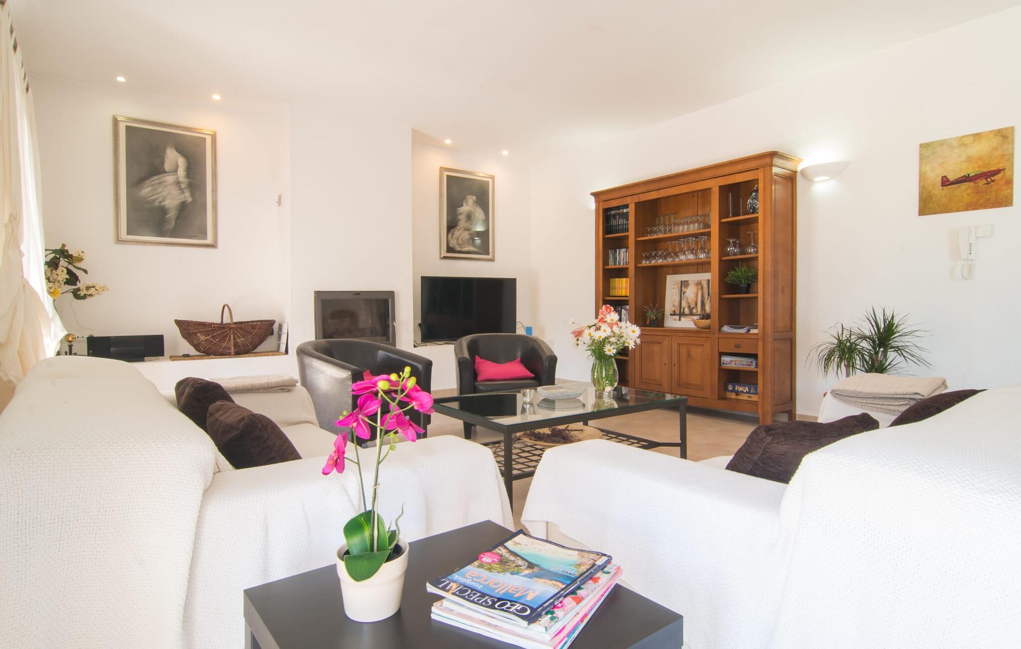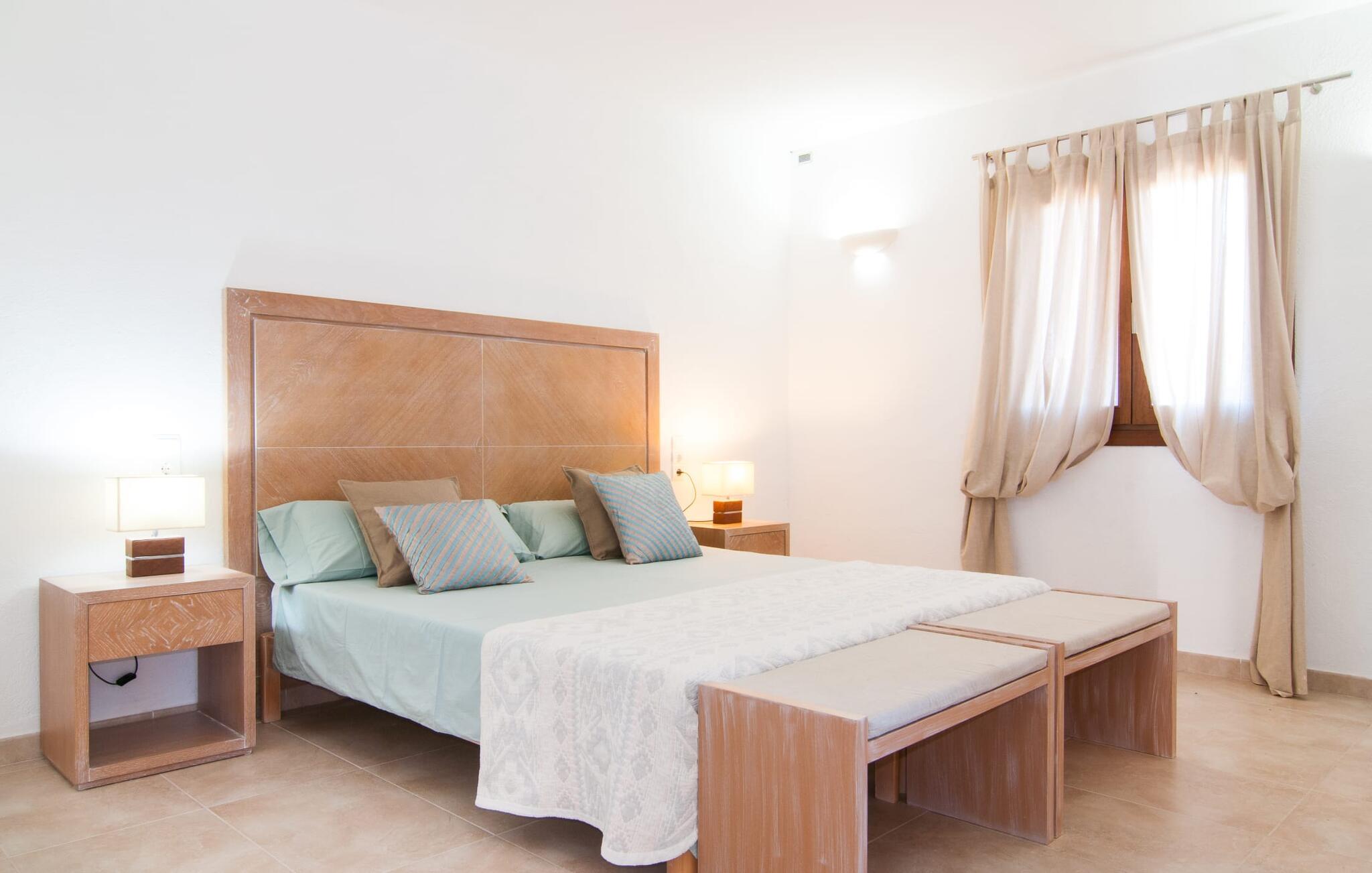 Das Innere der Villa zeichnet sich durch eine bestechende Schönheit und Eleganz aus. Gemessen an der Größe der Reisegruppe, die hier bequem Platz findet, sind die im Erdgeschoss gelegenen Gemeinschaftsräume – das Wohnzimmer und das offene Esszimmer – sehr geräumig. Die lichtdurchfluteten Bereiche bieten Raum für individuelle Bewegung und zum freien Durchatmen und bestechen durch schicke Eleganz mit den weißen Wänden, den sichtbaren Holzbalken und den großformatigen Bodenfliesen. Die Möblierung ist diesem zeitlos-modernen Geschmack angepasst: Ein einladender langer Esstisch für alle Gäste steht neben der modernen, weißen Einbauküche mit Kochinsel – hier wird das gemeinsame Kochen zum kommunikativen und fröhlichen Erlebnis und entfällt Unannehmlichkeit. Im Wohnbereich lädt ein LCD-TV zu gemütlichen Abenden ein. Die komfortablen Schlafzimmer sind äußerst geschmackvoll eingerichtet, auch hier wurde Wert auf klare Linien und Stil gelegt. Anstatt jedes Zimmer gleich auszustatten, haben die Eigentümer für jede Schlafzimmersuite ein individuelles Design gewählt: Dieses reicht von schlichten weißen Möbeln über gekalkte Eiche bis hin zu hellem Grau. Um Ihre Privatsphäre innerhalb Ihrer Reisegruppe zu wahren, sind vier der Schlafzimmer mit einem eigenen Bad ausgestattet. Die anderen beiden Badezimmer sind den restlichen beiden Schlafzimmern zugeordnet, verfügen jedoch nicht über ein eigenes Bad. Ausgestattet mit einer sehr modernen und hervorragenden Badezimmerausstattung verfügen alle Badezimmer entweder über eine Badewanne oder einen begehbaren Duschbereich.