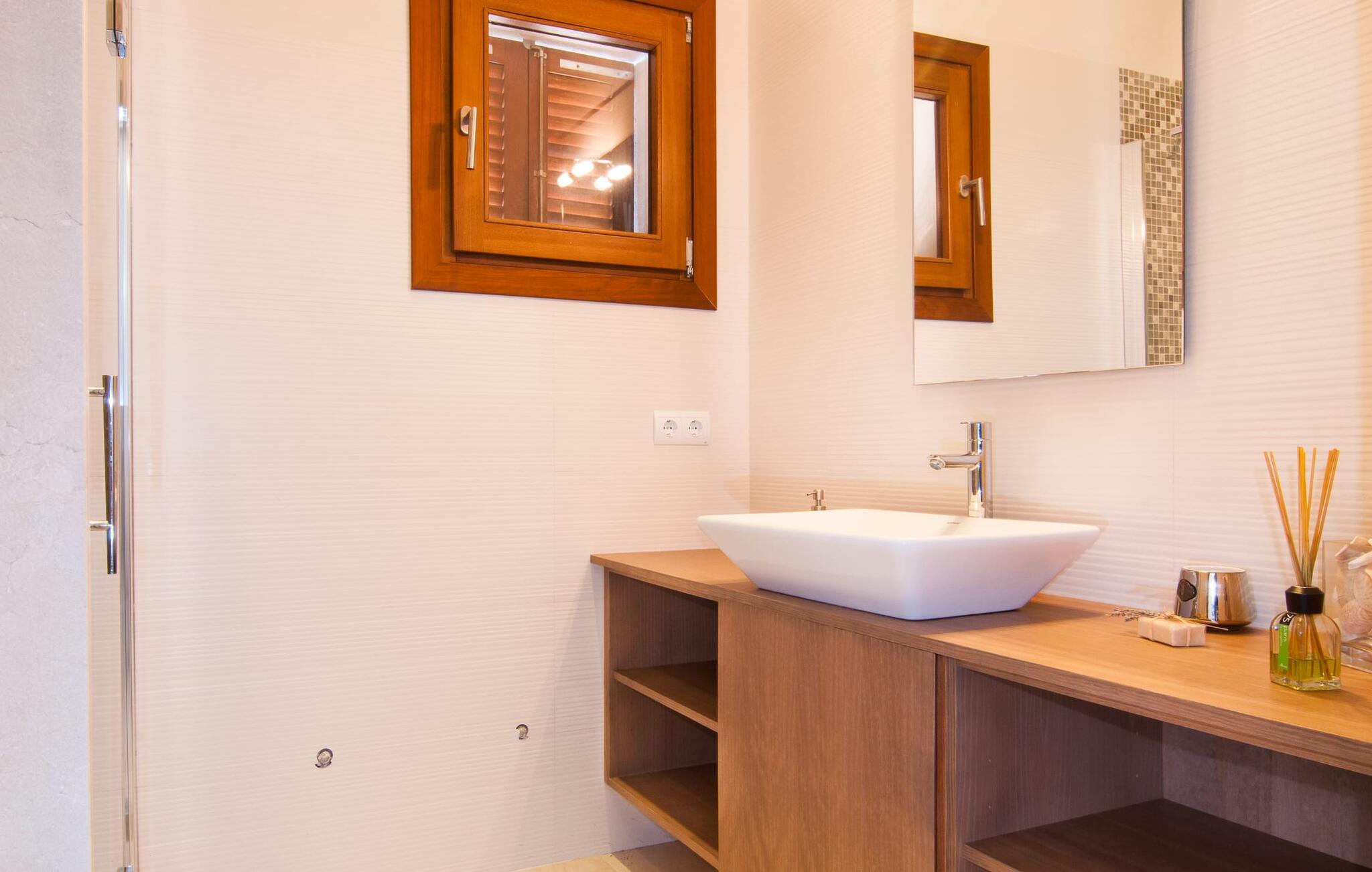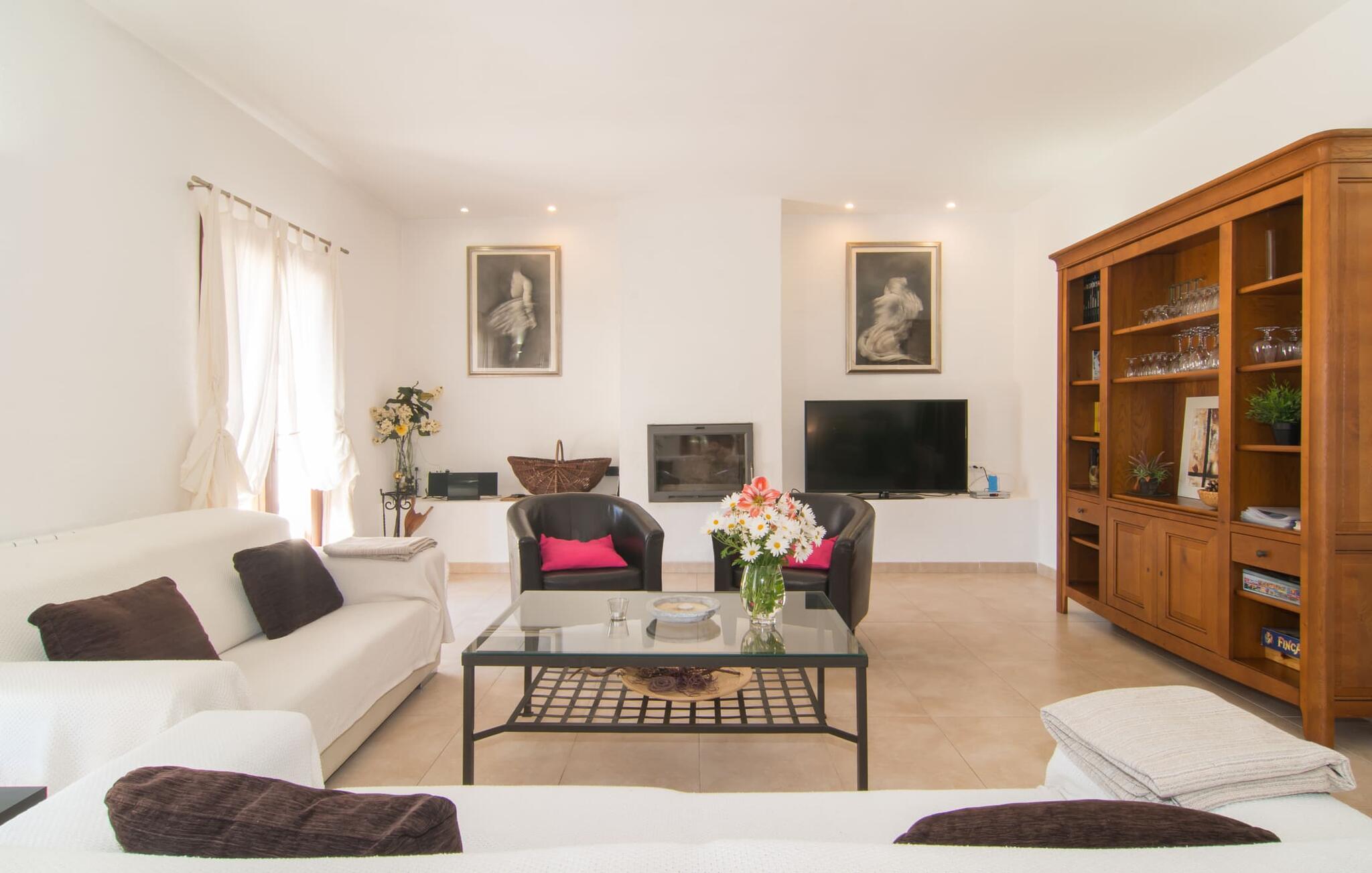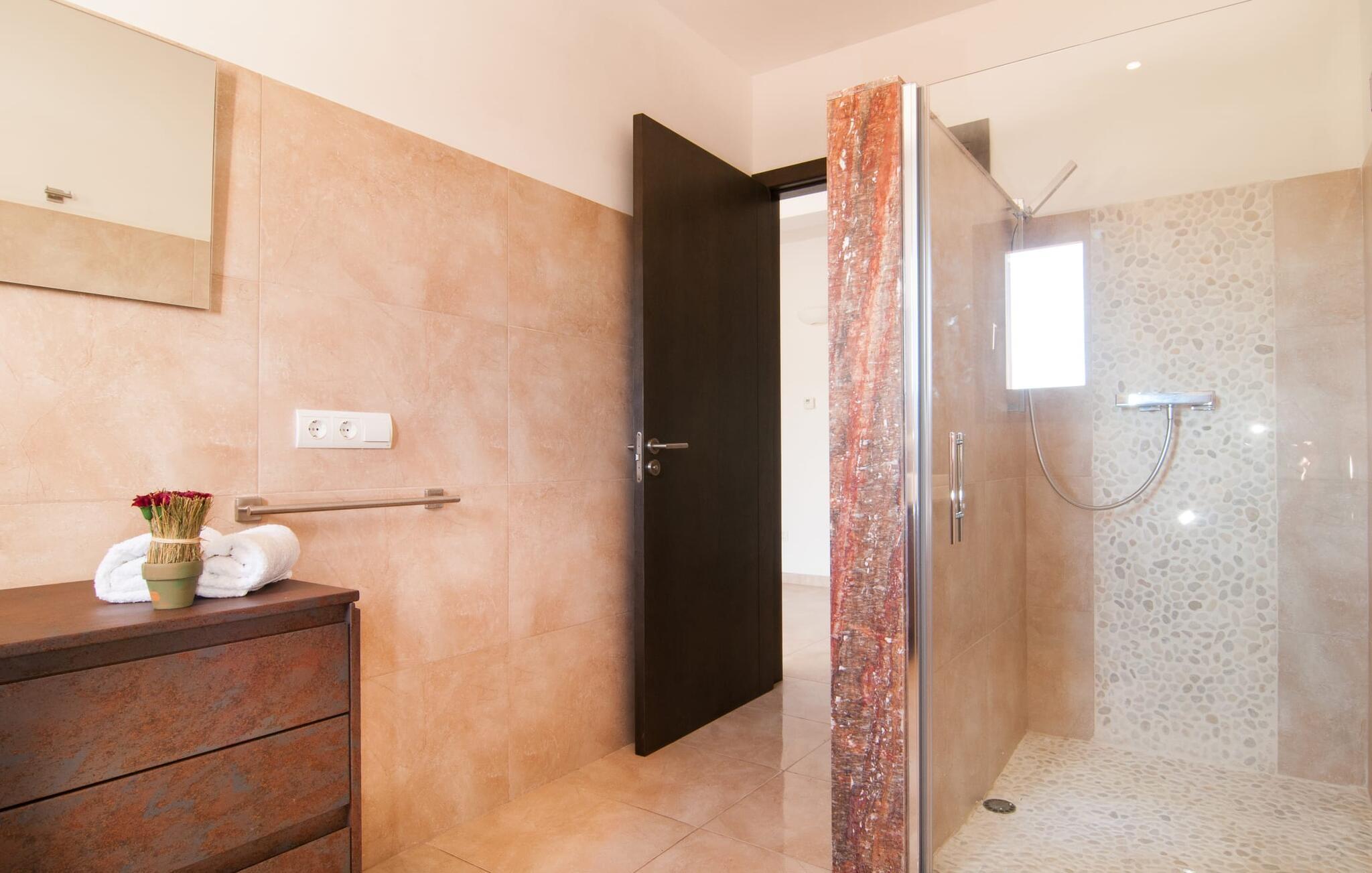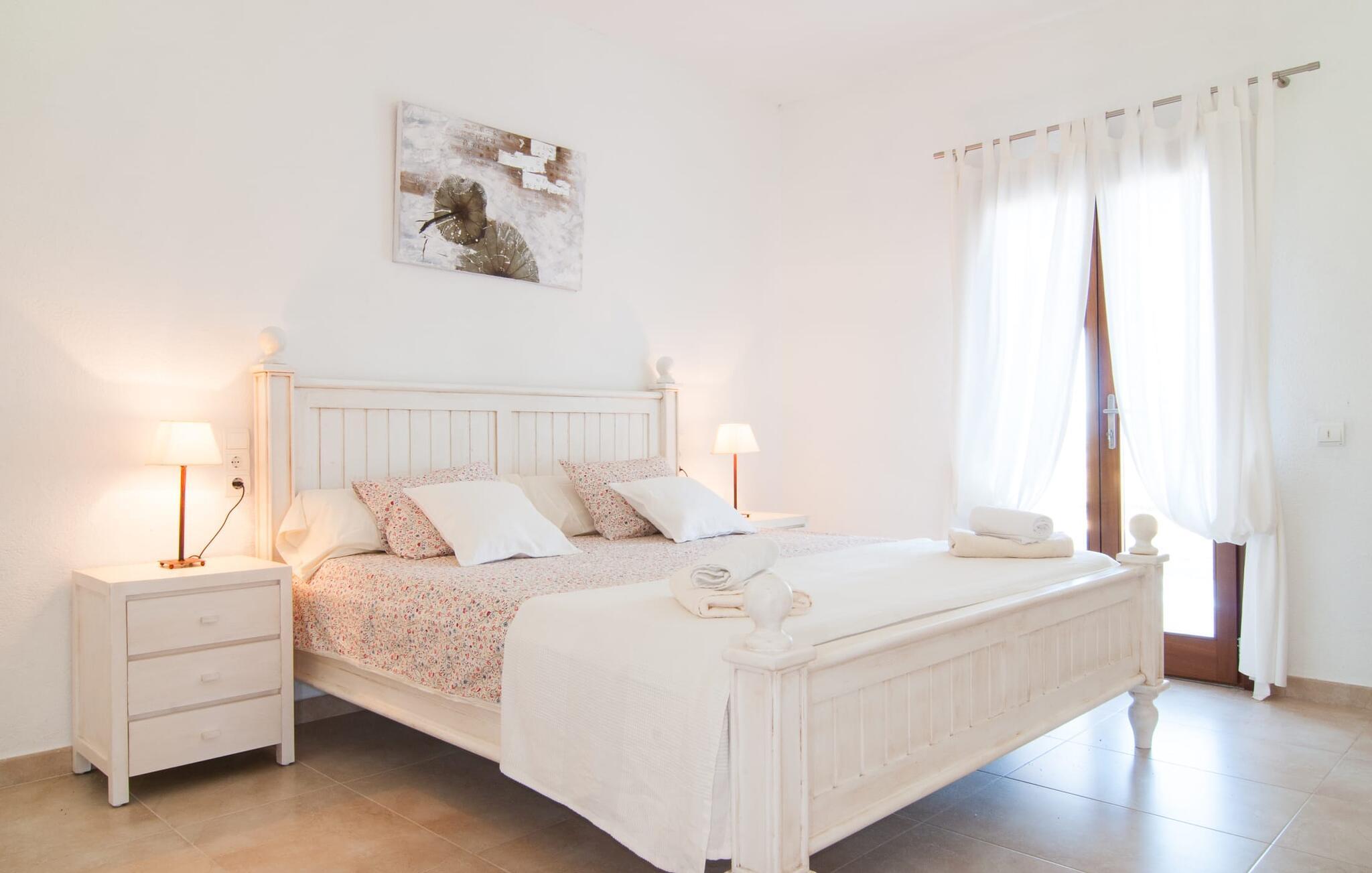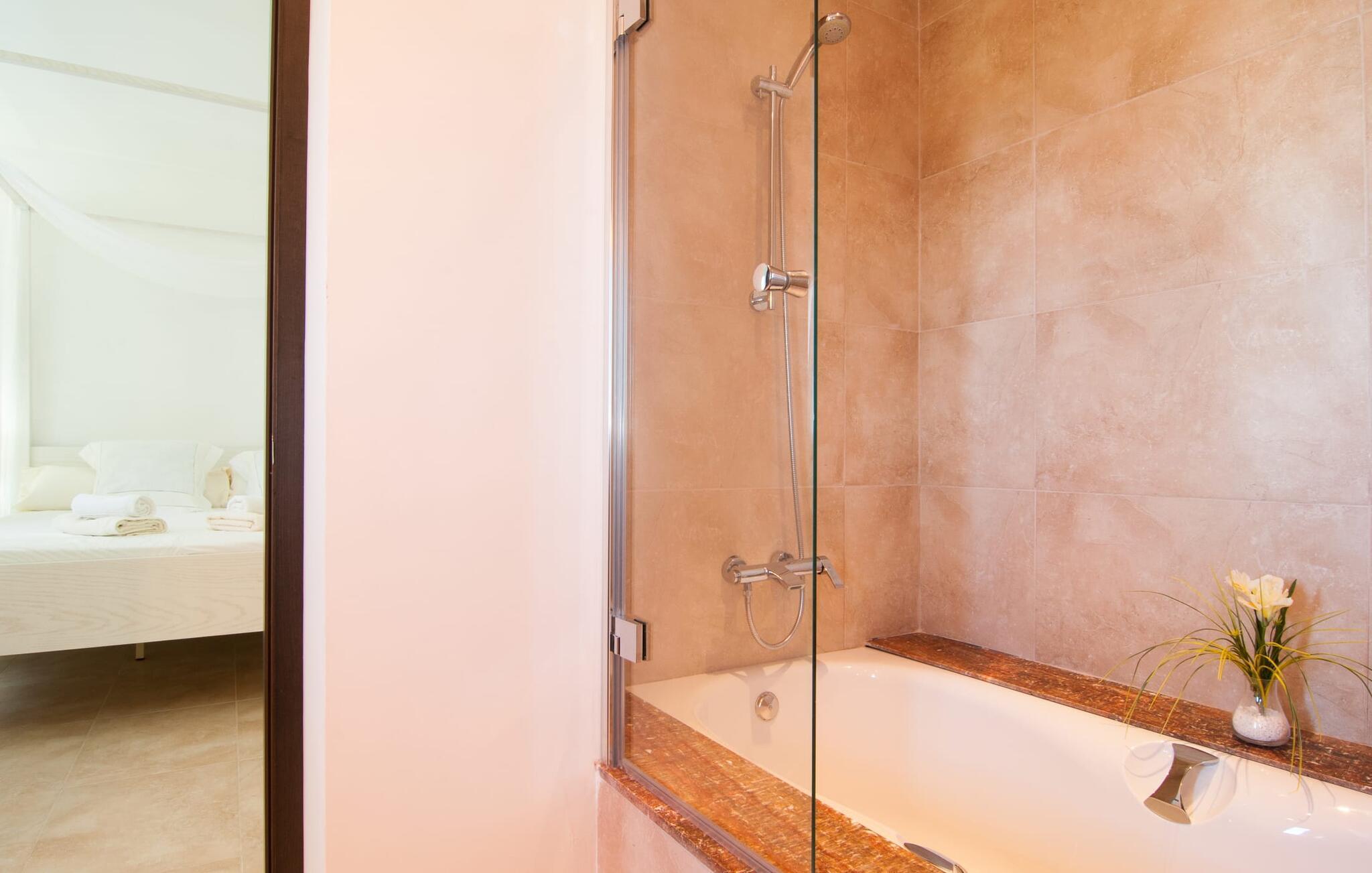 Das Innere der Villa zeichnet sich durch eine bestechende Schönheit und Eleganz aus. Gemessen an der Größe der Reisegruppe, die hier bequem Platz findet, sind die im Erdgeschoss gelegenen Gemeinschaftsräume – das Wohnzimmer und das offene Esszimmer – sehr geräumig. Die lichtdurchfluteten Bereiche bieten Raum für individuelle Bewegung und zum freien Durchatmen und bestechen durch schicke Eleganz mit den weißen Wänden, den sichtbaren Holzbalken und den großformatigen Bodenfliesen. Die Möblierung ist diesem zeitlos-modernen Geschmack angepasst: Ein einladender langer Esstisch für alle Gäste steht neben der modernen, weißen Einbauküche mit Kochinsel – hier wird das gemeinsame Kochen zum kommunikativen und fröhlichen Erlebnis und entfällt Unannehmlichkeit. Im Wohnbereich lädt ein LCD-TV zu gemütlichen Abenden ein. Die komfortablen Schlafzimmer sind äußerst geschmackvoll eingerichtet, auch hier wurde Wert auf klare Linien und Stil gelegt. Anstatt jedes Zimmer gleich auszustatten, haben die Eigentümer für jede Schlafzimmersuite ein individuelles Design gewählt: Dieses reicht von schlichten weißen Möbeln über gekalkte Eiche bis hin zu hellem Grau. Um Ihre Privatsphäre innerhalb Ihrer Reisegruppe zu wahren, sind vier der Schlafzimmer mit einem eigenen Bad ausgestattet. Die anderen beiden Badezimmer sind den restlichen beiden Schlafzimmern zugeordnet, verfügen jedoch nicht über ein eigenes Bad. Ausgestattet mit einer sehr modernen und hervorragenden Badezimmerausstattung verfügen alle Badezimmer entweder über eine Badewanne oder einen begehbaren Duschbereich.