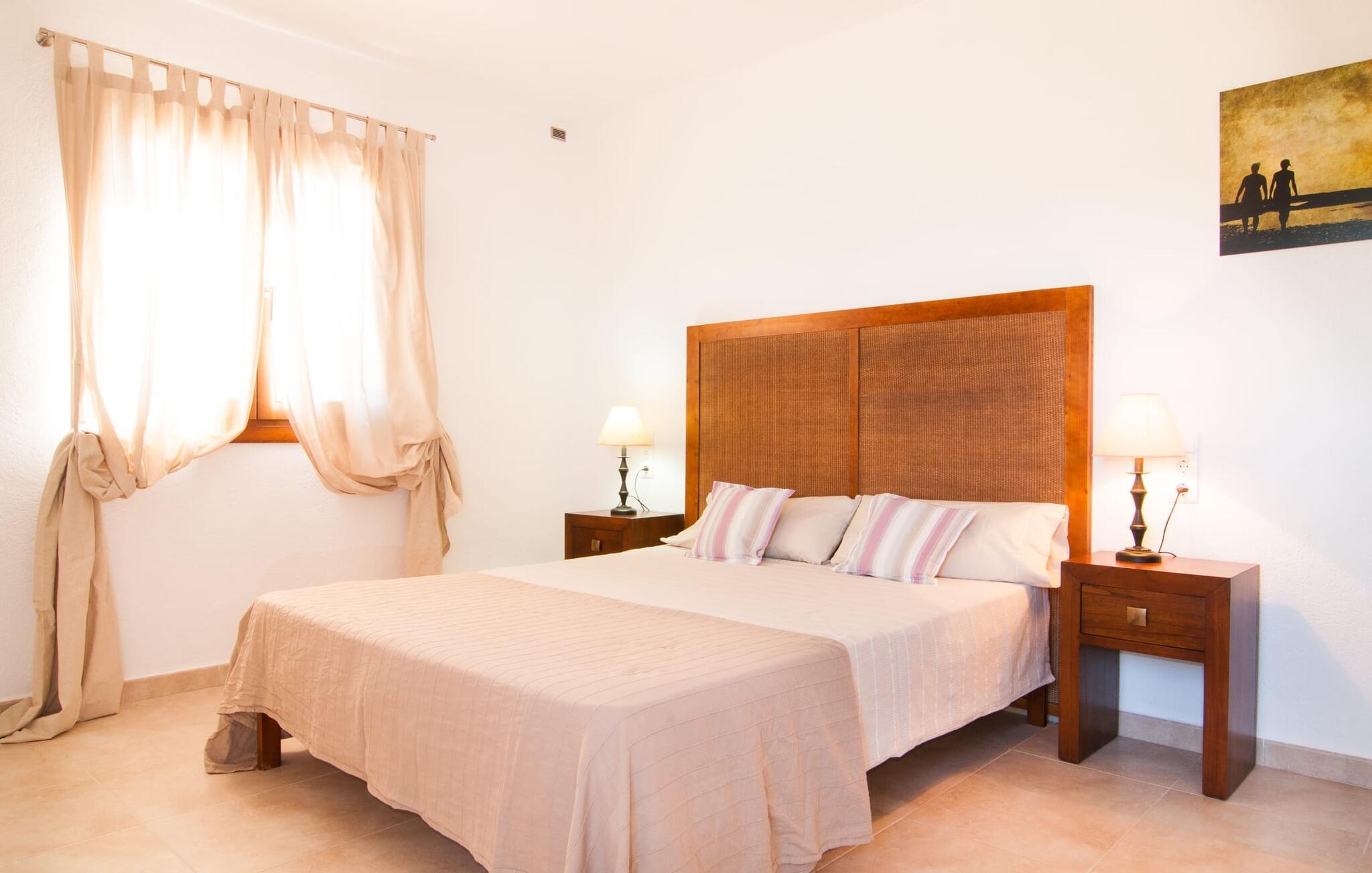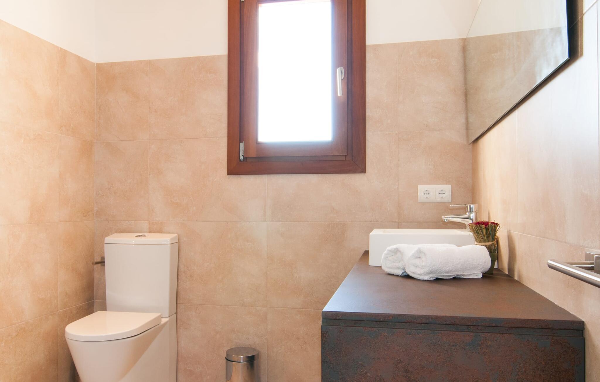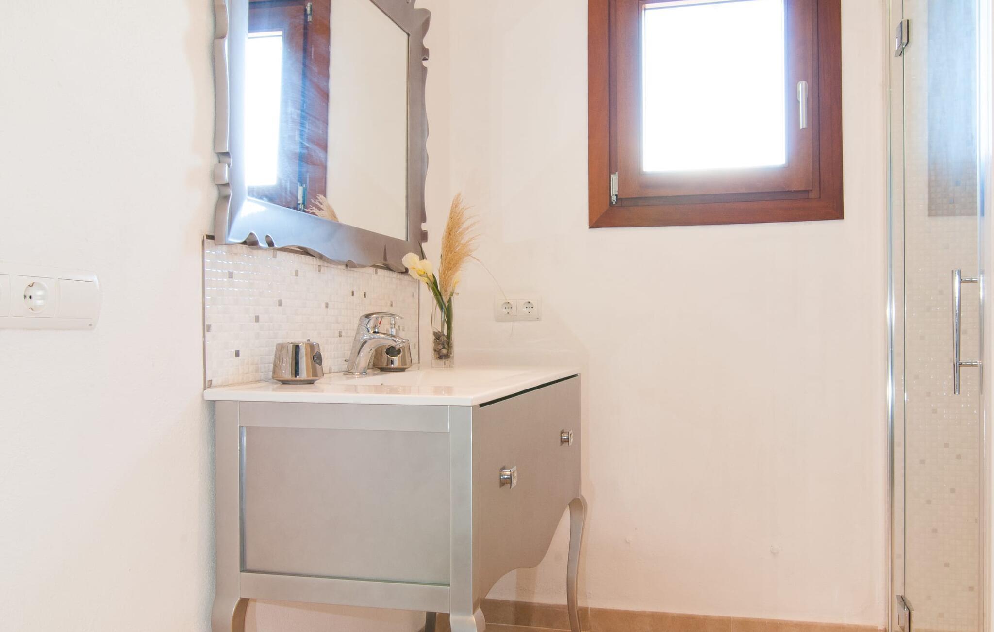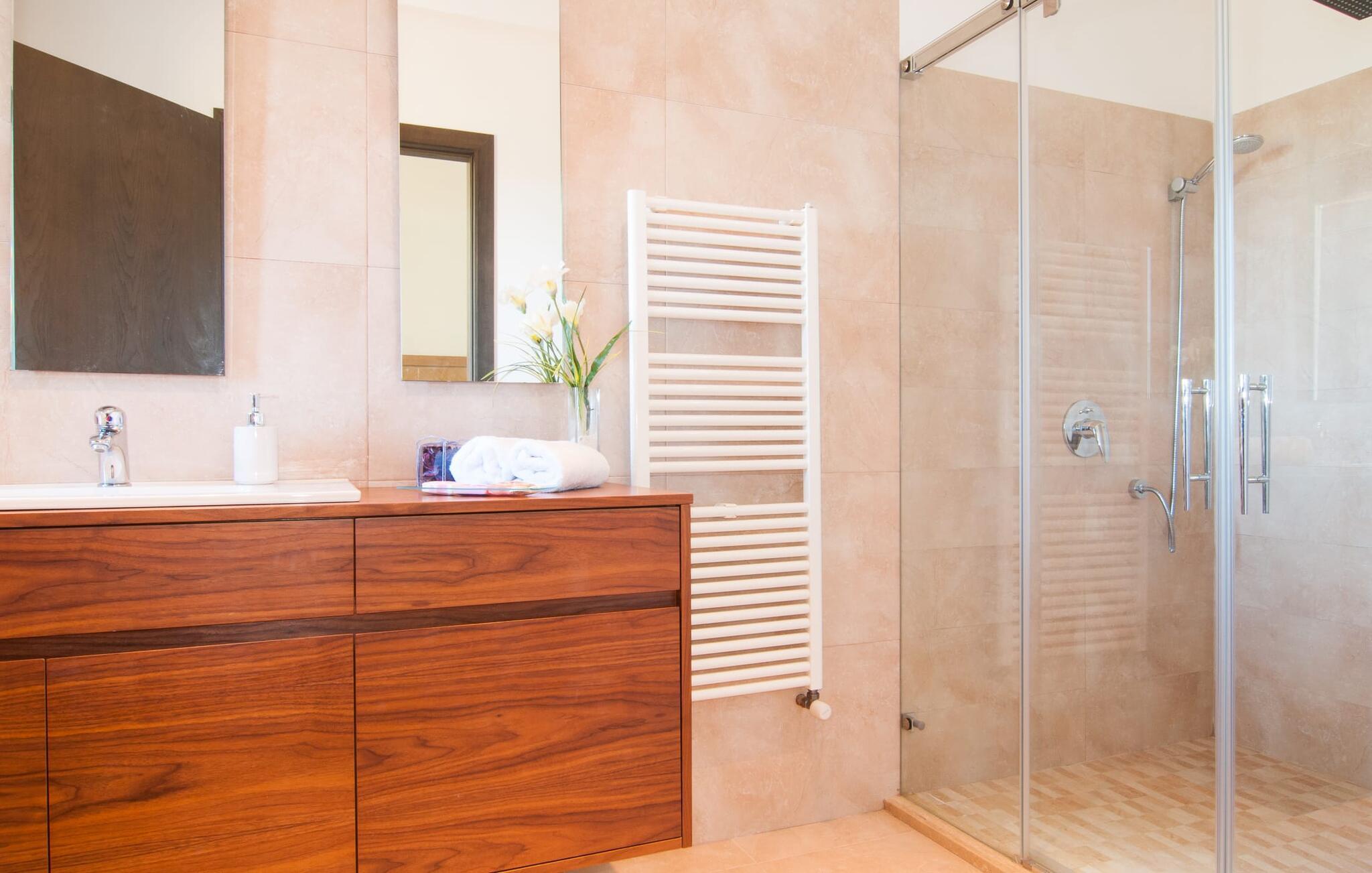 Das Innere der Villa zeichnet sich durch eine bestechende Schönheit und Eleganz aus. Gemessen an der Größe der Reisegruppe, die hier bequem Platz findet, sind die im Erdgeschoss gelegenen Gemeinschaftsräume – das Wohnzimmer und das offene Esszimmer – sehr geräumig. Die lichtdurchfluteten Bereiche bieten Raum für individuelle Bewegung und zum freien Durchatmen und bestechen durch schicke Eleganz mit den weißen Wänden, den sichtbaren Holzbalken und den großformatigen Bodenfliesen. Die Möblierung ist diesem zeitlos-modernen Geschmack angepasst: Ein einladender langer Esstisch für alle Gäste steht neben der modernen, weißen Einbauküche mit Kochinsel – hier wird das gemeinsame Kochen zum kommunikativen und fröhlichen Erlebnis und entfällt Unannehmlichkeit. Im Wohnbereich lädt ein LCD-TV zu gemütlichen Abenden ein. Die komfortablen Schlafzimmer sind äußerst geschmackvoll eingerichtet, auch hier wurde Wert auf klare Linien und Stil gelegt. Anstatt jedes Zimmer gleich auszustatten, haben die Eigentümer für jede Schlafzimmersuite ein individuelles Design gewählt: Dieses reicht von schlichten weißen Möbeln über gekalkte Eiche bis hin zu hellem Grau. Um Ihre Privatsphäre innerhalb Ihrer Reisegruppe zu wahren, sind vier der Schlafzimmer mit einem eigenen Bad ausgestattet. Die anderen beiden Badezimmer sind den restlichen beiden Schlafzimmern zugeordnet, verfügen jedoch nicht über ein eigenes Bad. Ausgestattet mit einer sehr modernen und hervorragenden Badezimmerausstattung verfügen alle Badezimmer entweder über eine Badewanne oder einen begehbaren Duschbereich.
