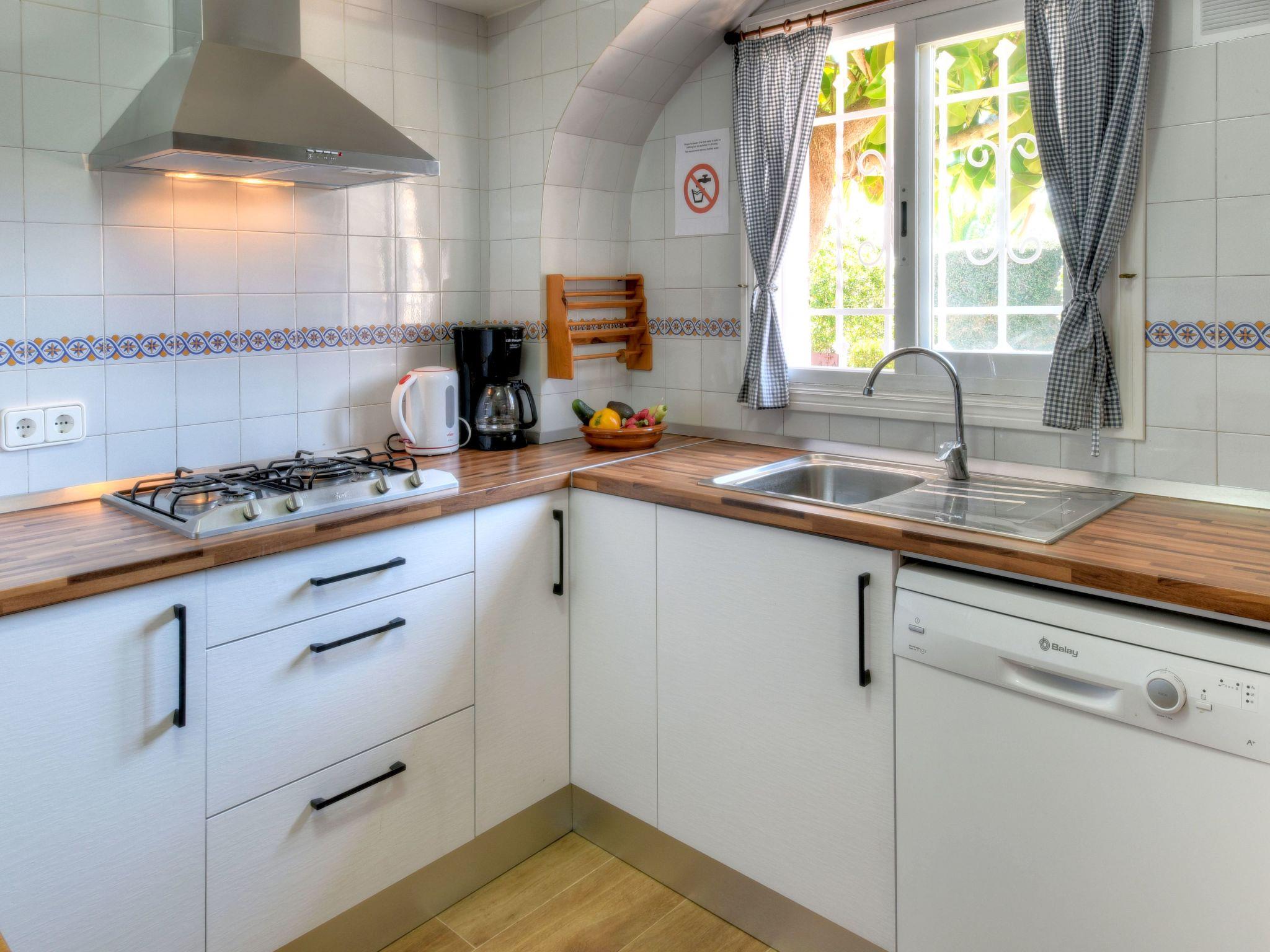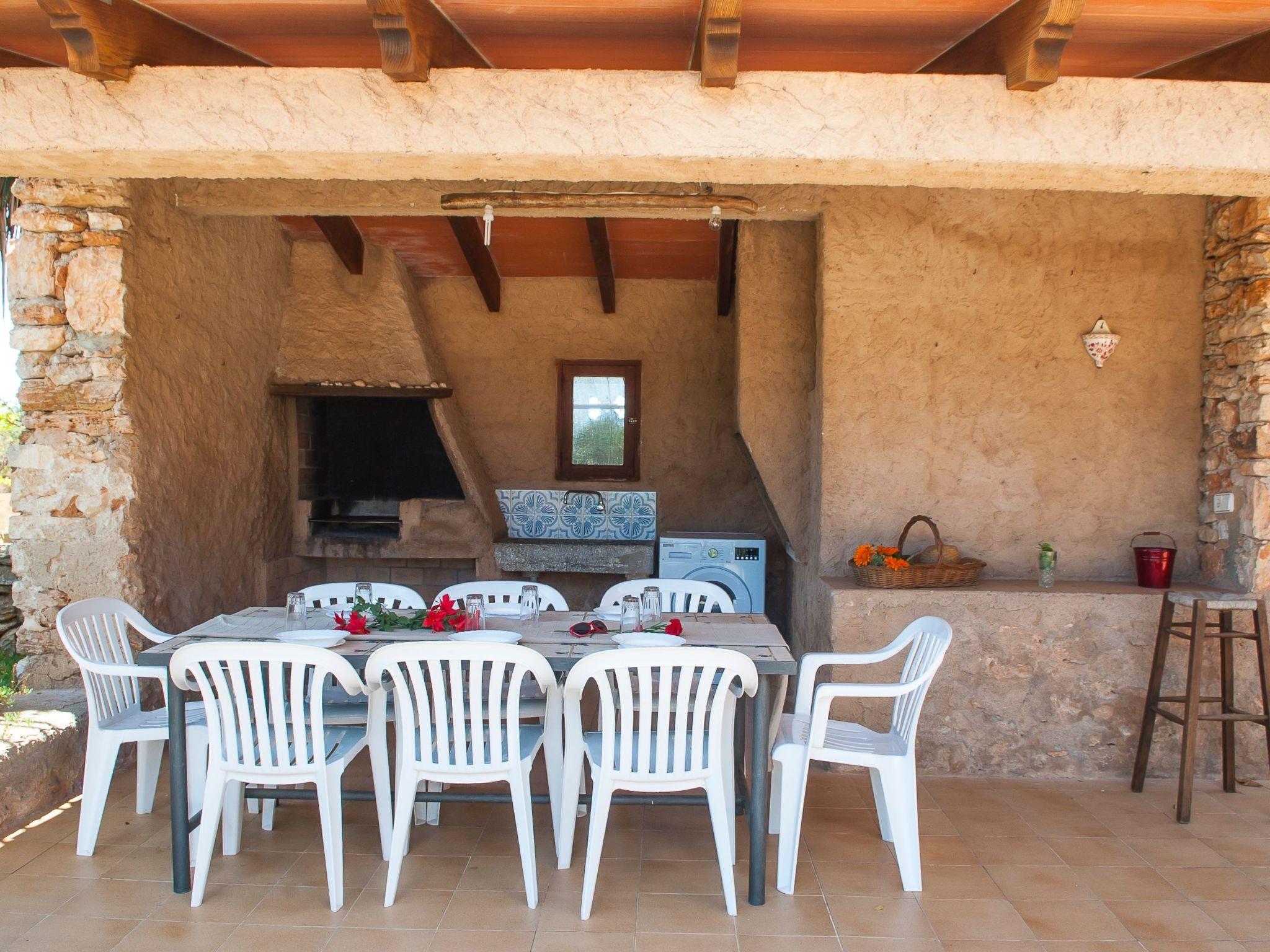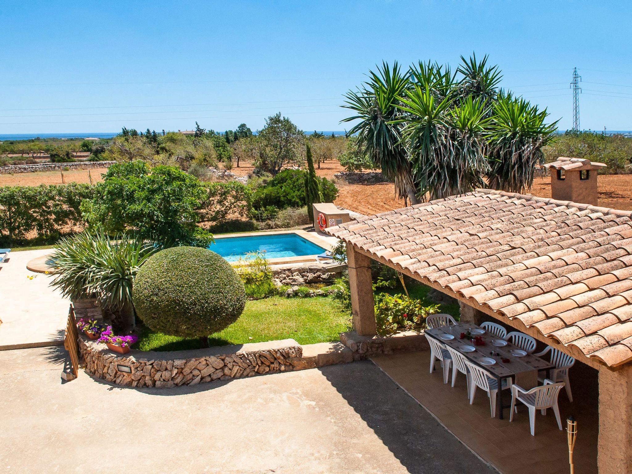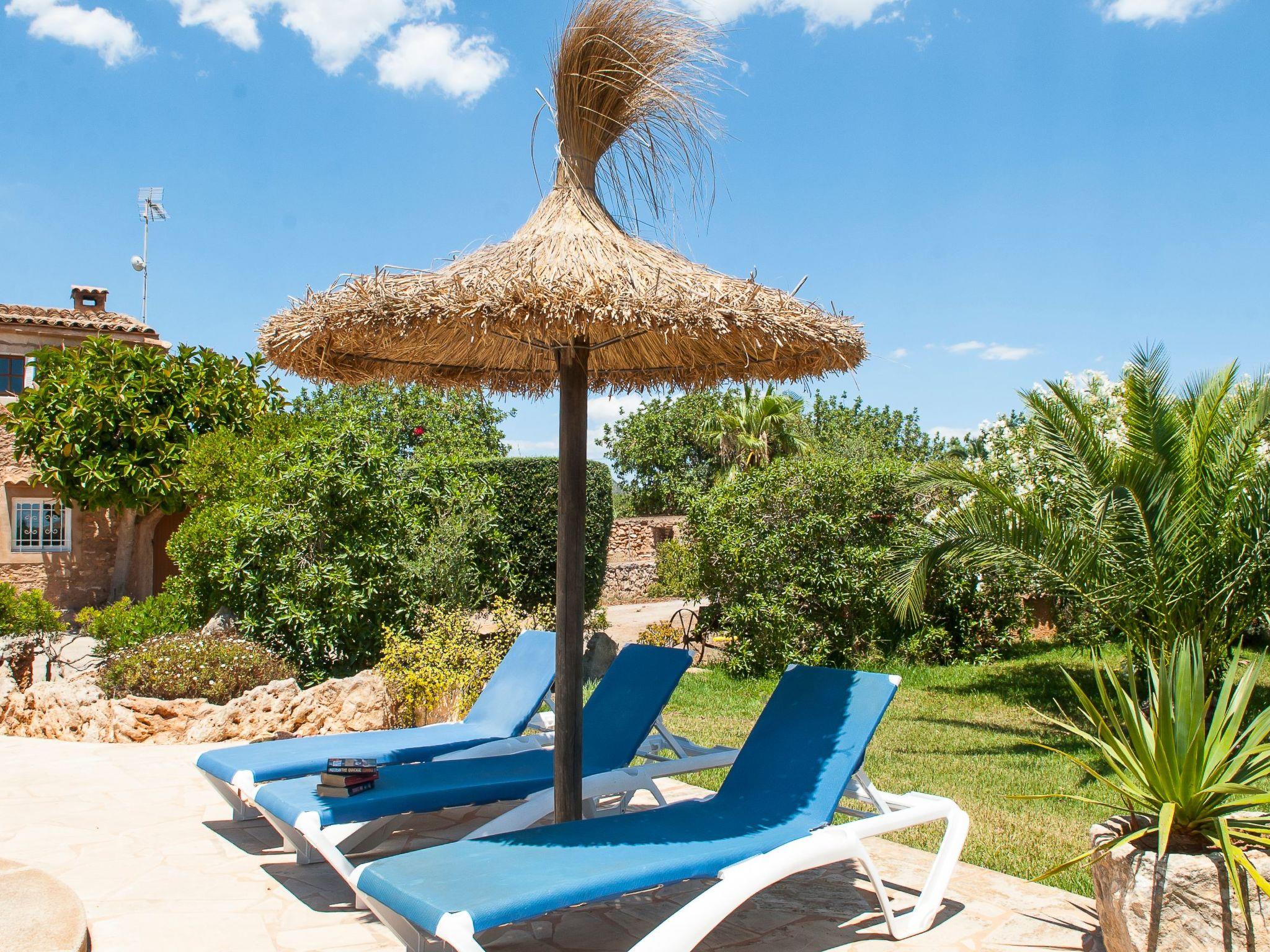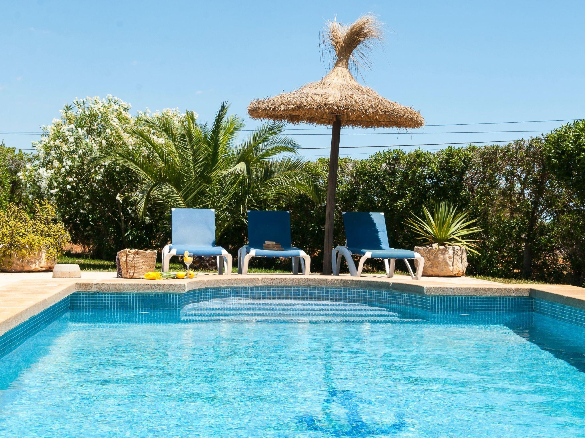 Der grosse Garten mit Büschen, Palmen, Bäumen und leuchtender Bougainvillea ist sehr gepflegt. Der 8m x 4m grosse Pool verfügt über eine grosse Sonnenterrasse mit Sonnenliegen und ist auf einer Seite von einer schützenden Hecke umgeben. Auf der anderen Seite grenzt eine Trockensteinmauer an den benachbarten Mandelbaumhain an. Für Kinder gibt es Schaukeln und Rasenflächen zum Spielen. Ein "Porche", eine überdachte Terrasse mit Grillbereich und Essgelegenheit befindet sich zwischen Haus und Garten und bietet sich als ideales Schattenplätzchen für alle Mahlzeiten an.