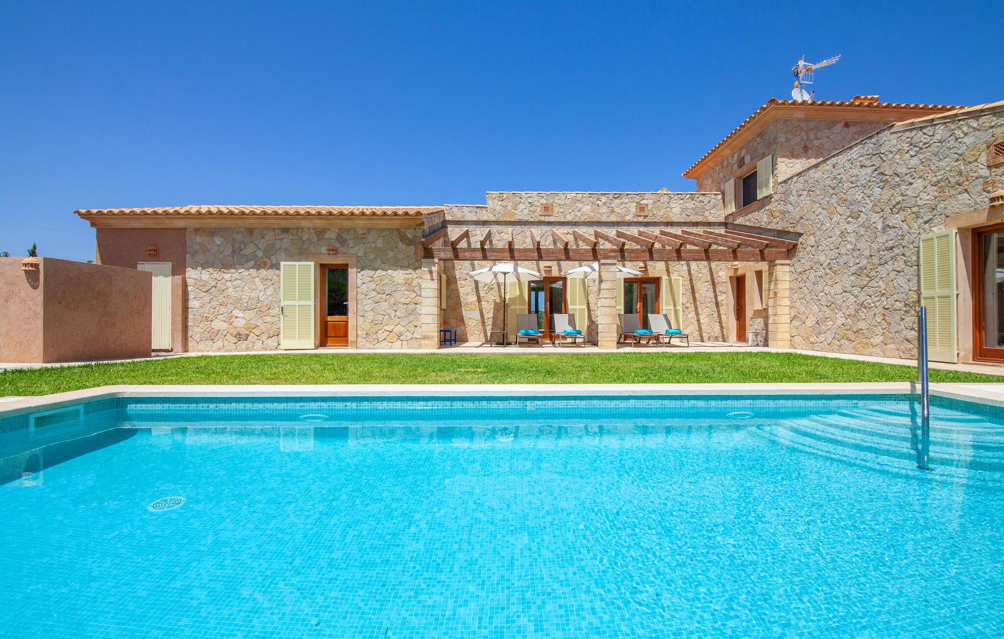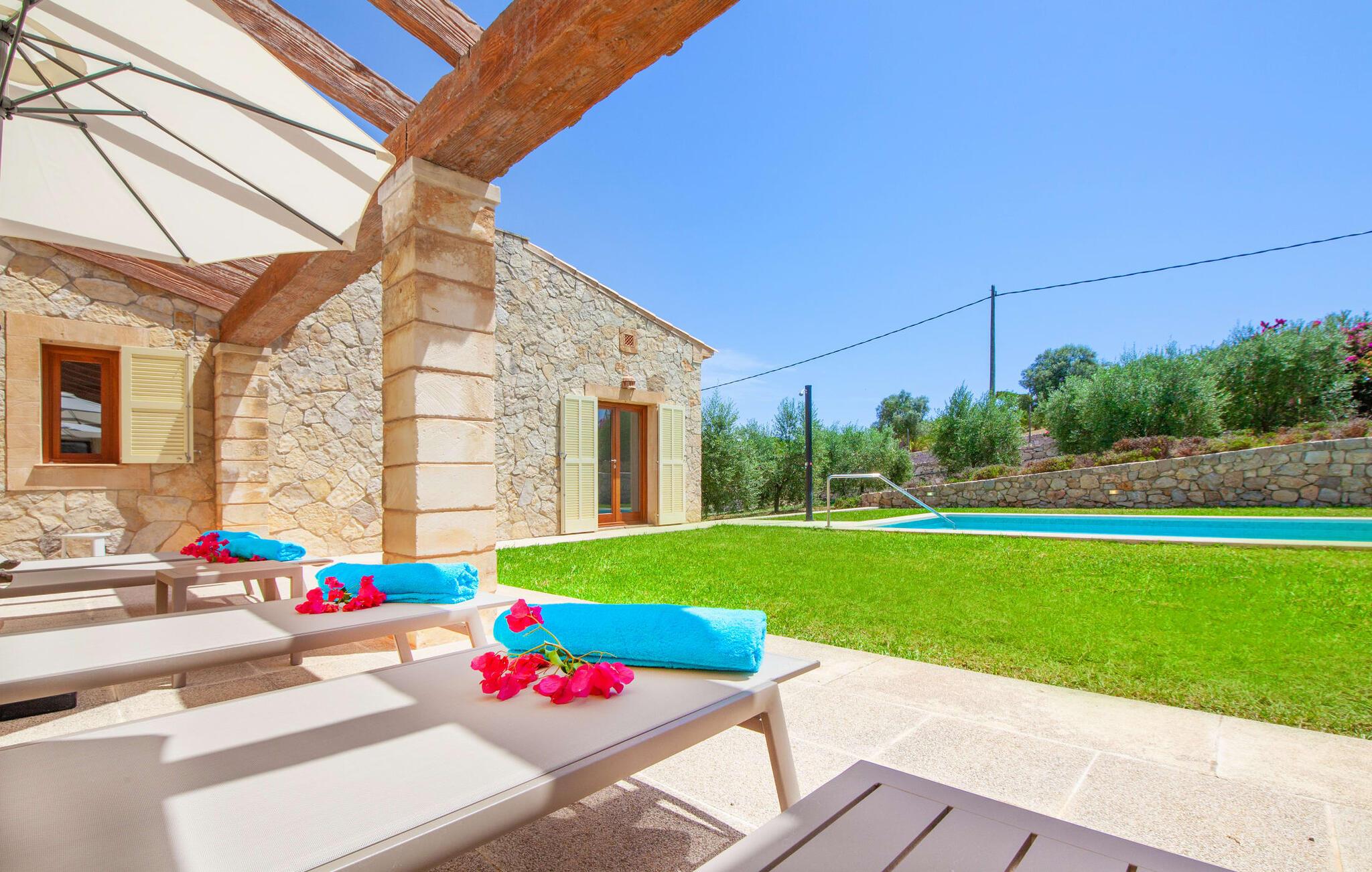 Zwischen sanften Hügeln und weitem Himmel, umgeben von Oliven und Palmen, offenbart sich Ihnen die moderne Mietfinca „Fetget Can Bosco“. Das Ferienhaus ist mit Bruchstein verkleidet und verfügt über Holzfenster mit natürlichem Charme. Damit fügt es sich perfekt in die sanfte Landschaft des Ostens Mallorcas ein, deren Charme sich auf die Atmosphäre der Finca überträgt. Genießen Sie den Rasenpool – völlig abgeschieden und privat. Auf zahlreichen Sitzplätzen im Freien können Sie die mediterrane Ruhe genießen: Auf der teilweise überdachten Veranda stehen bequeme Sonnenliegen mit Sonnenschirm, sodass Sie beim Entspannen den Pool im Blick haben. Unter der überdachten Terrasse auf der anderen Seite des Hauses befindet sich ein lauschiger Essbereich – dort erwartet Sie ein idealer Frühstücksplatz vor der phänomenalen Kulisse der ganzjährig grünen Küstenlandschaft. Der spektakuläre Ausblick wiederholt sich auf der sonnendurchfluteten Dachterrasse im Obergeschoss, von der aus das Panorama noch malerischer wirkt.