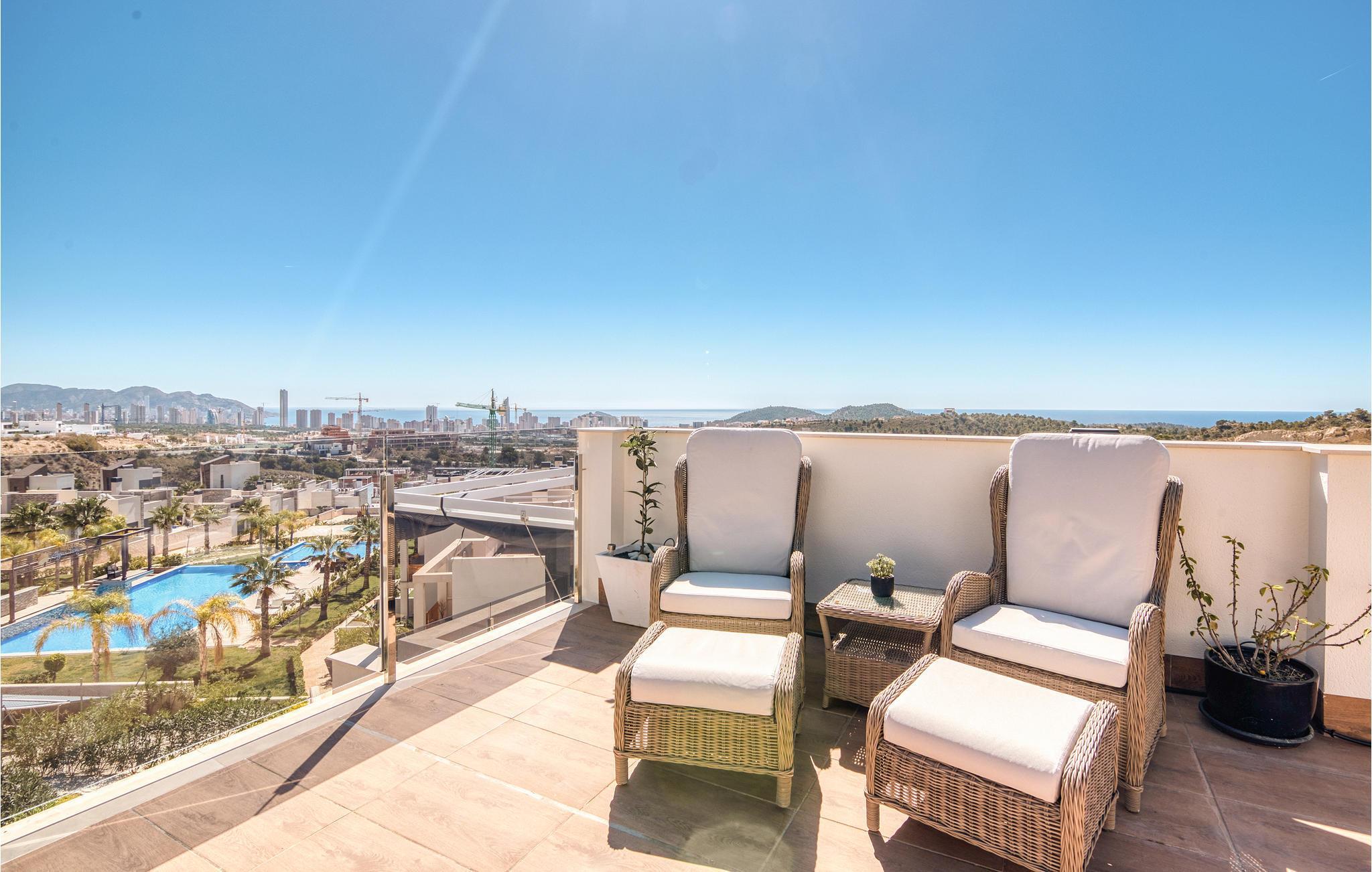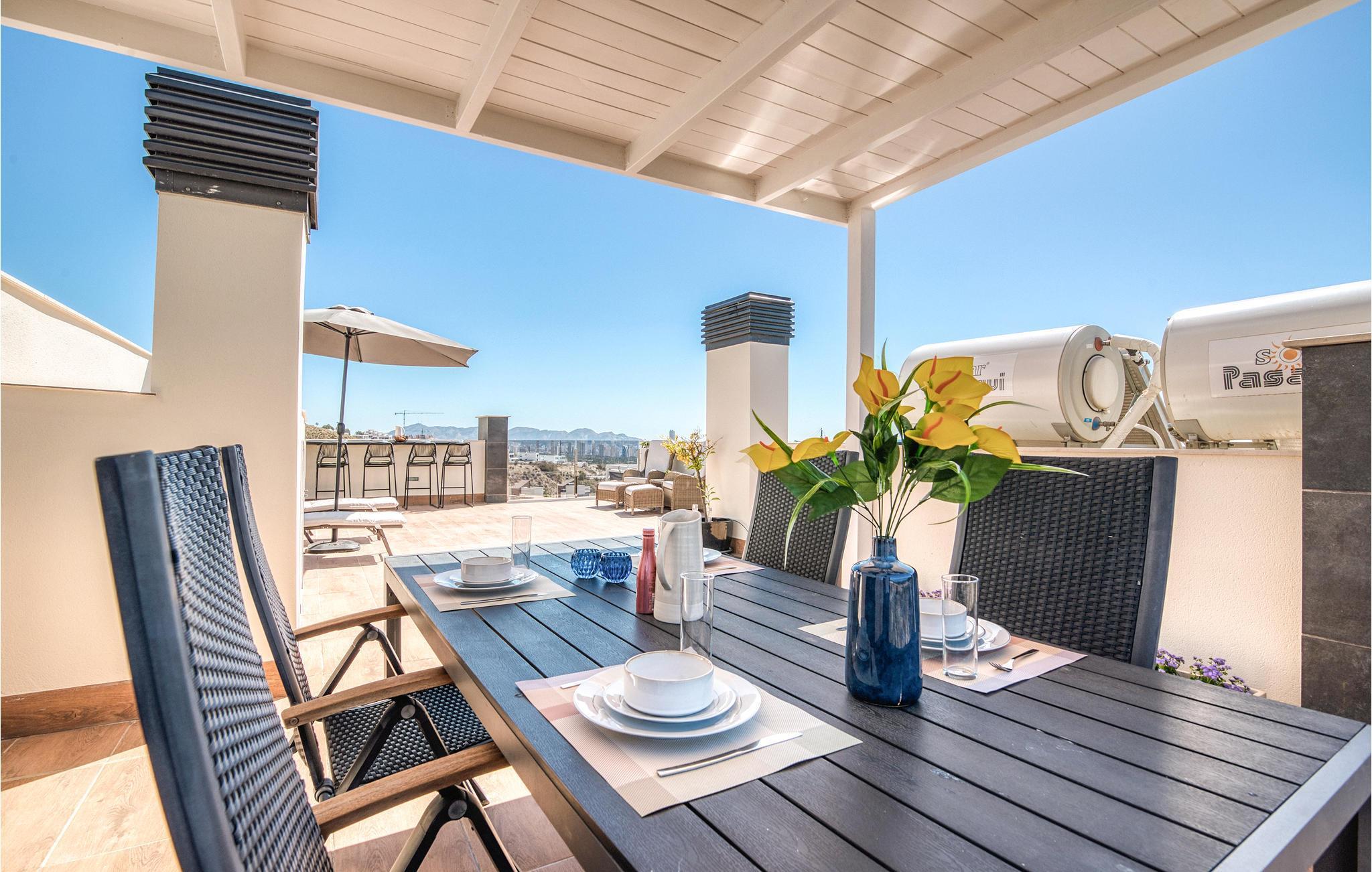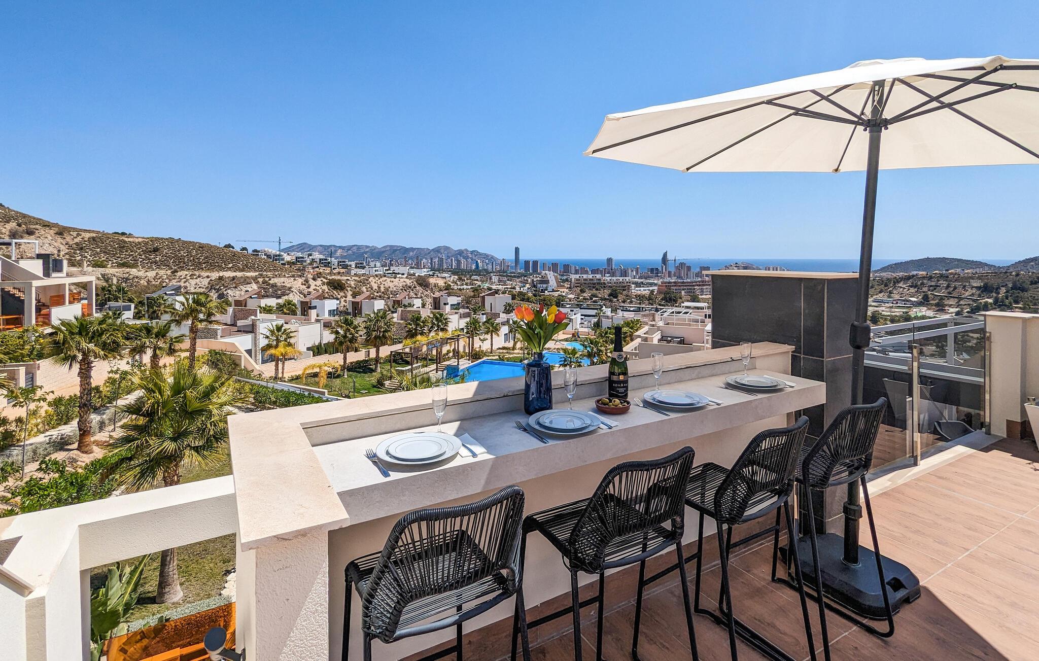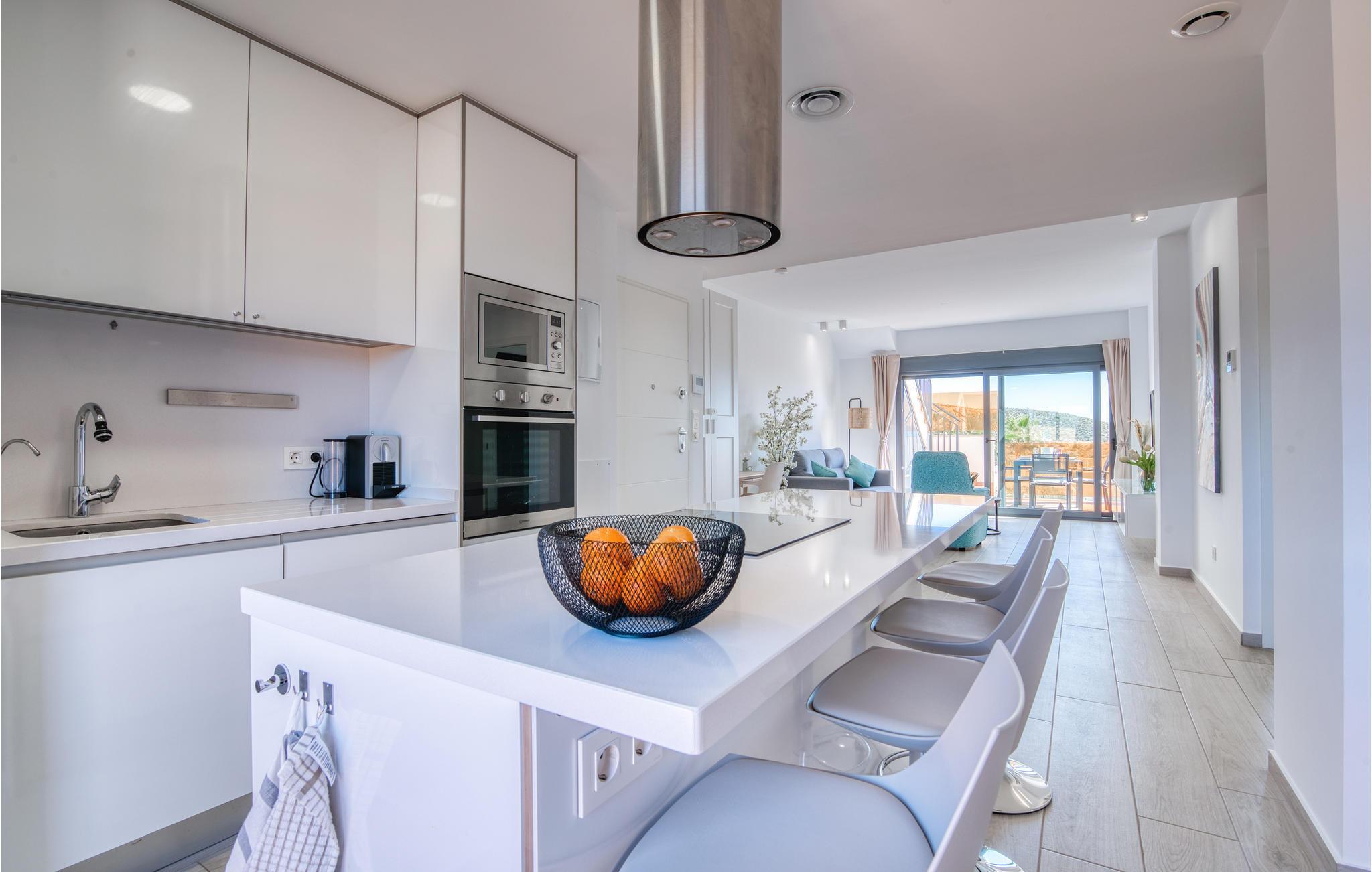 Die einladende Wohnung ist der ideale Ort für eine erholsame Auszeit mit besten Unterhaltungsmöglichkeiten in der näheren Umgebung, wie zum Beispiel dem Golfplatz, den Sie zu Fuß erreichen. Schon beim Betreten der hellen Räume werden Sie sich wohlfühlen. Hier sind Luft und Licht allgegenwärtig und die moderne und komfortable Einrichtung rundet das Erlebnis ab. Schon beim Aufwachen genießen Sie hier ein fantastisches Panorama. Planen Sie beim Frühstück mit wunderbarer Aussicht die Ausflüge und Unternehmungen für den Tag oder eine geruhsame Zeit am Gemeinschaftspool. Genießen Sie auf der Terrasse die Sonne in vollen Zügen, von hier sehen Sie das Meer, erfrischen Sie sich nach Belieben im Pool und lassen Sie den Alltag hinter sich. Am Abend können Sie die Dachterrasse mit Beleuchtung und Grill genießen.