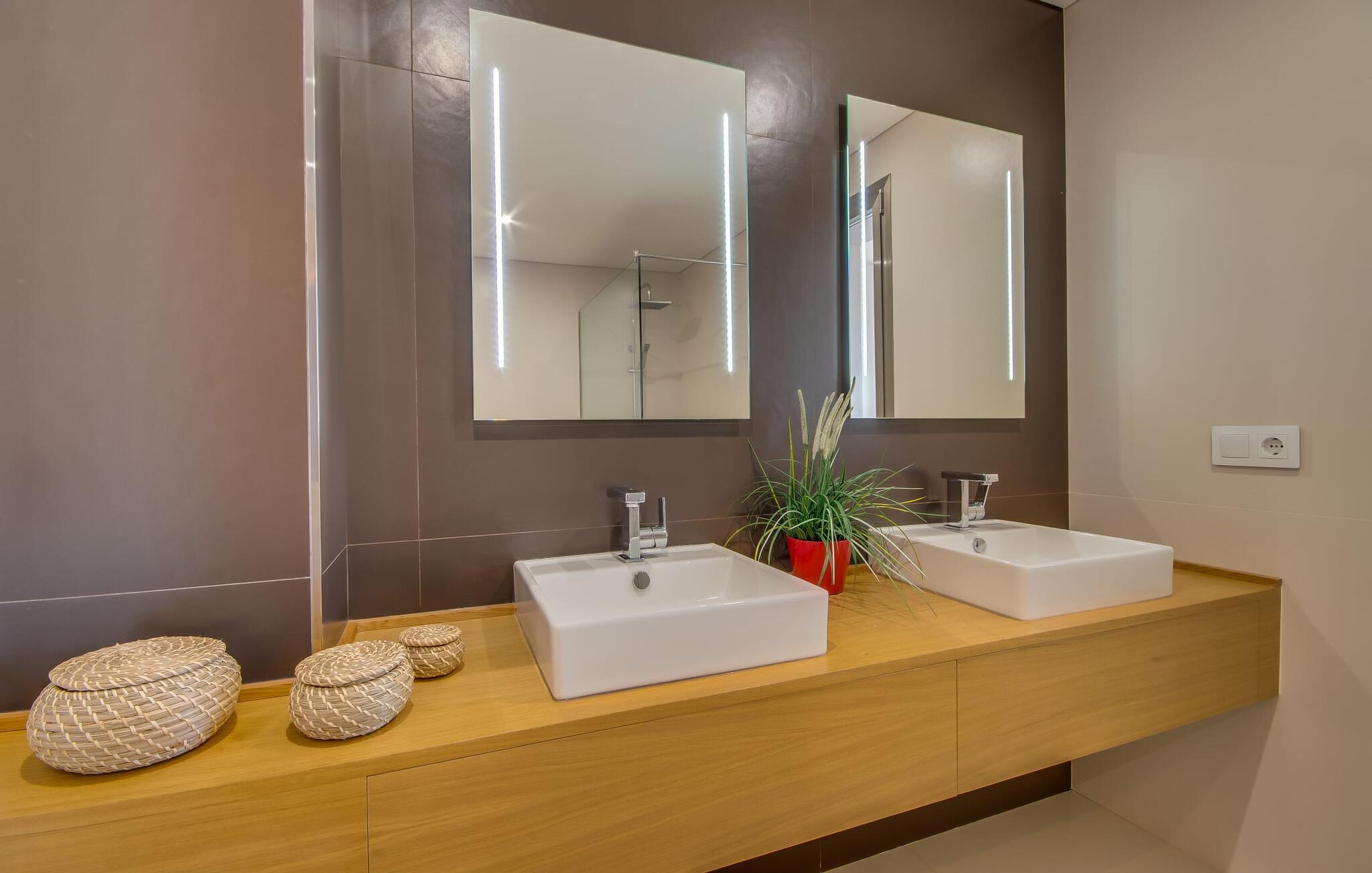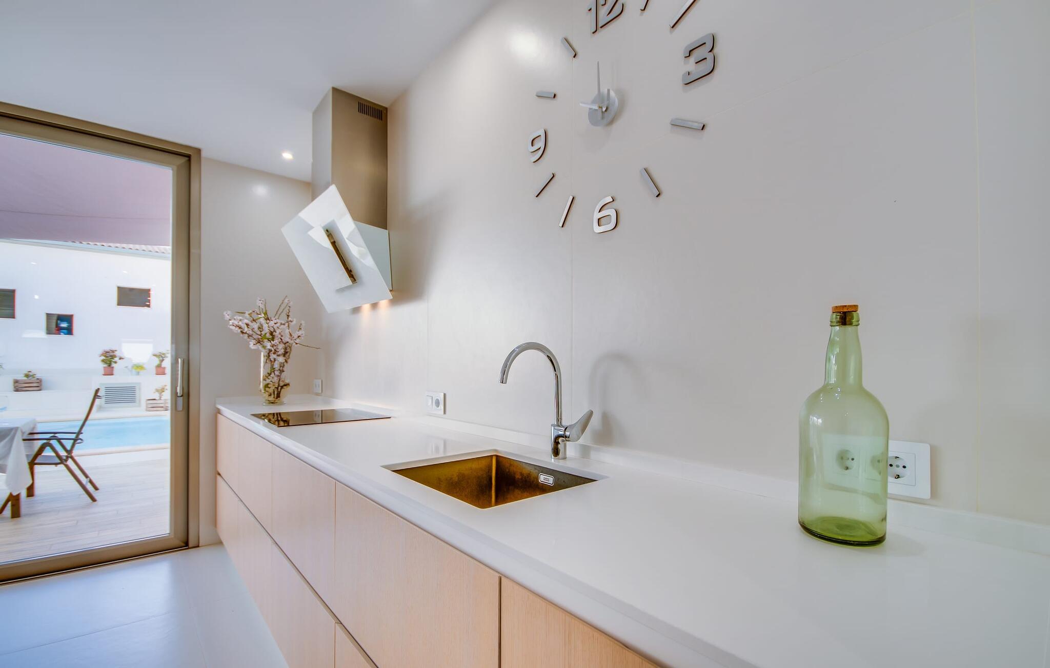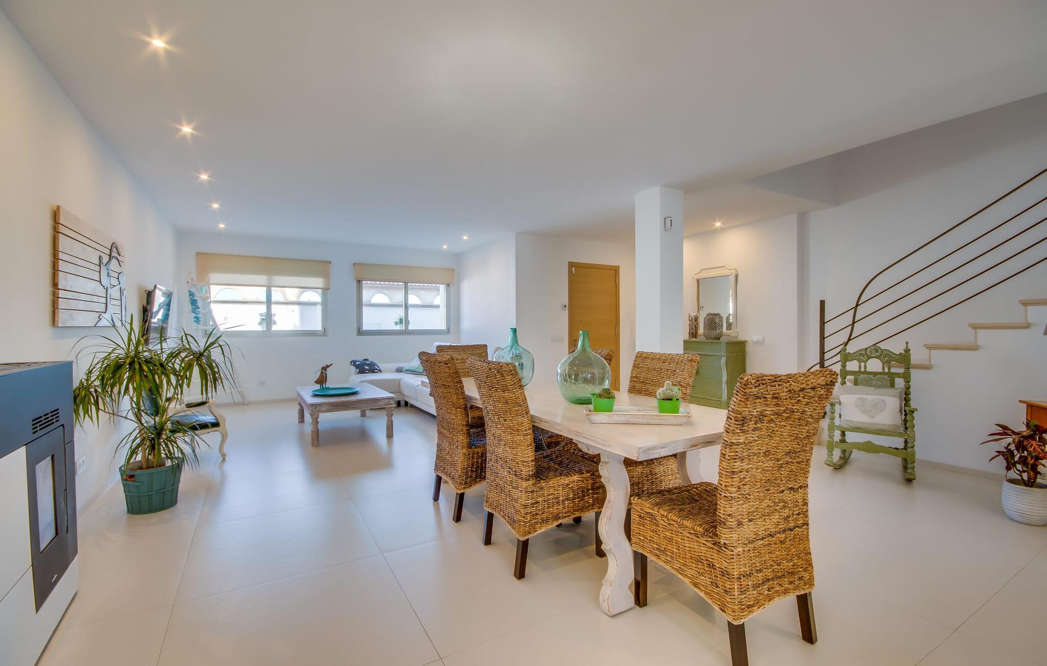 Auch von innen ist „Foners Mallorquins“ ein wahres Juwel. Dank der großen Fenster und der modernen Beleuchtungsanlage mit vielen kleinen, integrierten Deckenleuchten ist zu jeder Tages- und Nachtzeit alles schön hell. Die sehr fröhliche, gepflegte und stilvolle Atmosphäre ist unter anderem dem angenehmen Interieur zu verdanken, das sich durch eine Gestaltung mit viel Liebe zum Detail und einem besonderen Flair auszeichnet. Das Erdgeschoss ist sehr offen gestaltet: Von der Terrasse gelangt man durch große Glastüren direkt in die stilvolle, mit erstklassigen Geräten ausgestattete Küche. Die Küche verfügt über einen großen Esstisch und zahlreiche Sitzmöglichkeiten. Morgens können Sie gemütlich frühstücken; Später am Tag können Sie auf der Terrasse kulinarische Köstlichkeiten für ein mediterranes Outdoor-Dinner zubereiten. Ihr gemeinsames Abendessen können Sie auch im angrenzenden Wohn- und Essbereich des Hauses genießen. Dort finden Sie einen weiteren großen Tisch mit wunderschönen Korbstühlen in natürlicher Optik – zum Genuss üppiger Mahlzeiten und zum Austausch toller Geschichten. Nur ein paar Schritte weiter lädt eine strahlend weiße Kuschelcouch mit zahlreichen Kissen und Decken zu einem gemütlichen Fernsehabend ein. Ein schickes Badezimmer finden Sie auch im Erdgeschoss von „Foners Mallorquins“. Wenn Sie nach einem langen, sonnigen Tag angenehm müde sind, gehen Sie einfach an der wunderschönen lindgrünen Wippe vorbei und die elegante Steintreppe hinauf. Die Schlafzimmer befinden sich auf zwei Etagen und verfügen über eine liebevolle, individuelle Inneneinrichtung – in Weiß, mit farbigen Details, die sofort eine fröhliche Stimmung verbreiten. Ein Hingucker sind die wunderschönen, teilweise aufwendig geschnitzten Betten und in jedem Zimmer gibt es geräumige Kleiderschränke für Ihre Urlaubsgarderobe. Ein Schlafzimmer, ohne Tür, liegt uneinsehbar im dritten Stock des Hauses und ist direkt über die Treppe zu erreichen, während sich die anderen beiden Schlafzimmer – eines davon mit direktem Zugang zu einem gemütlichen kleinen Balkon – auf einer Etage mit zwei Schlafzimmern befinden sehr moderne Badezimmer mit bodengleicher Dusche.