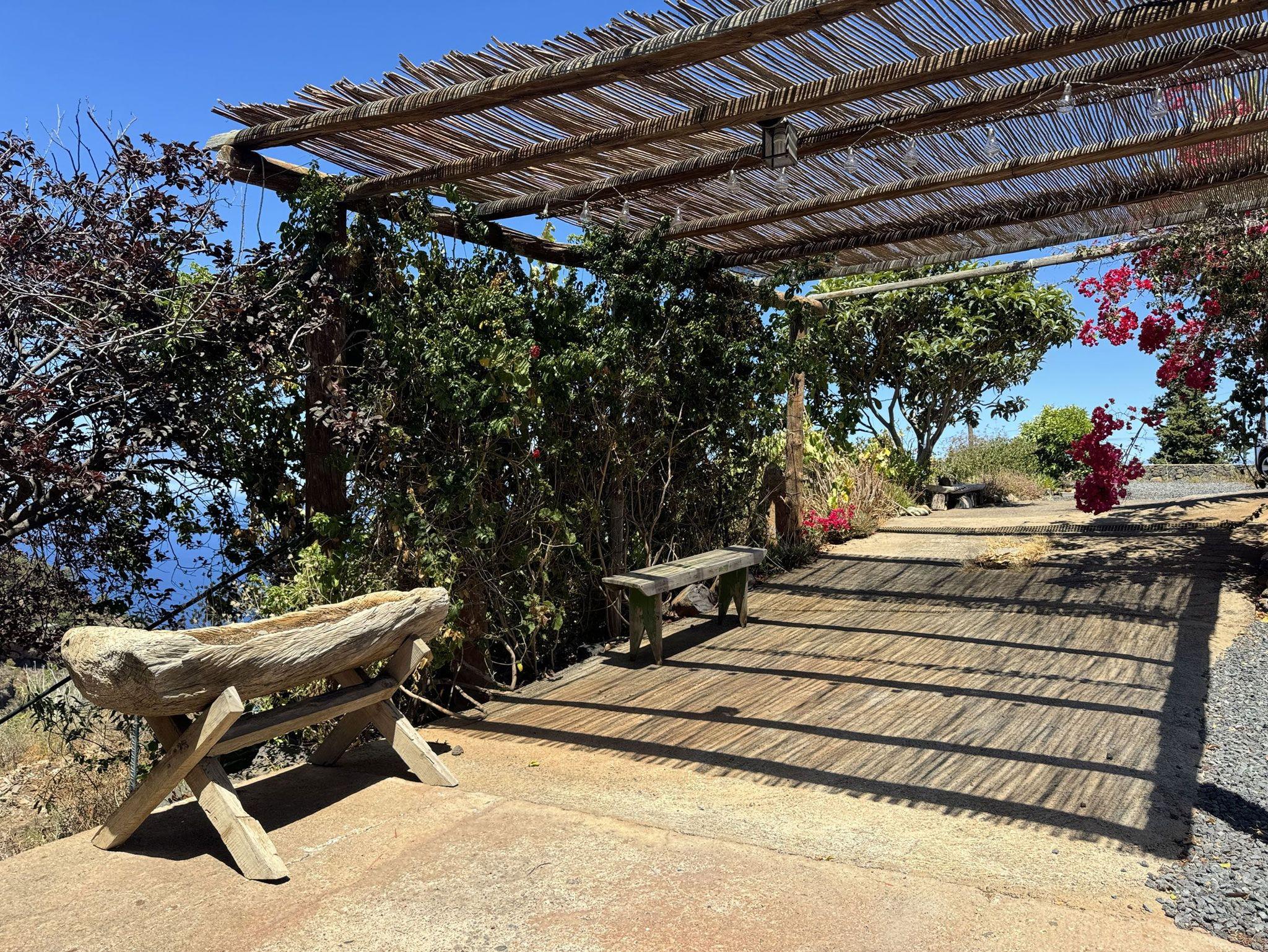 Vor dem Haus befindet sich eine Pergola und eine Terrasse mit Sitzplatz und Sonnenliegen. Am Parkplatz am Grundstückseingang steht eine einfache Holzbank mit herrlichem Meerblick. Hinter dem Haus befindet sich ein sehr romantischer Sitzplatz mit Blick in die umgebende Natur und Blick auf das Meer.