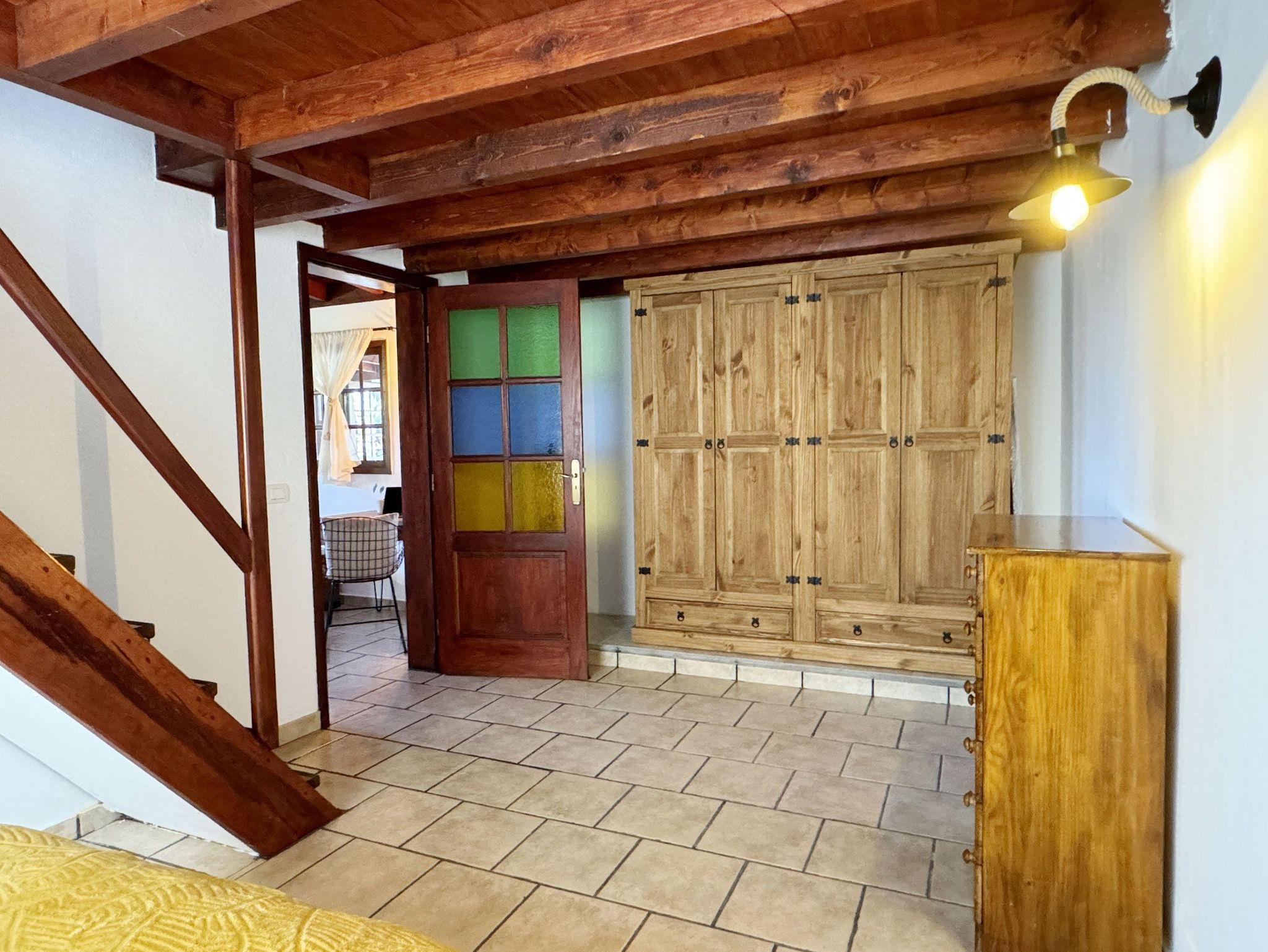 Schlafzimmer: Im Erdgeschoss befindet sich ein Schlafzimmer mit einem französischen Doppelbett und ein großer Wandschrank. Eine Treppe führt zum offenen Dachraum.