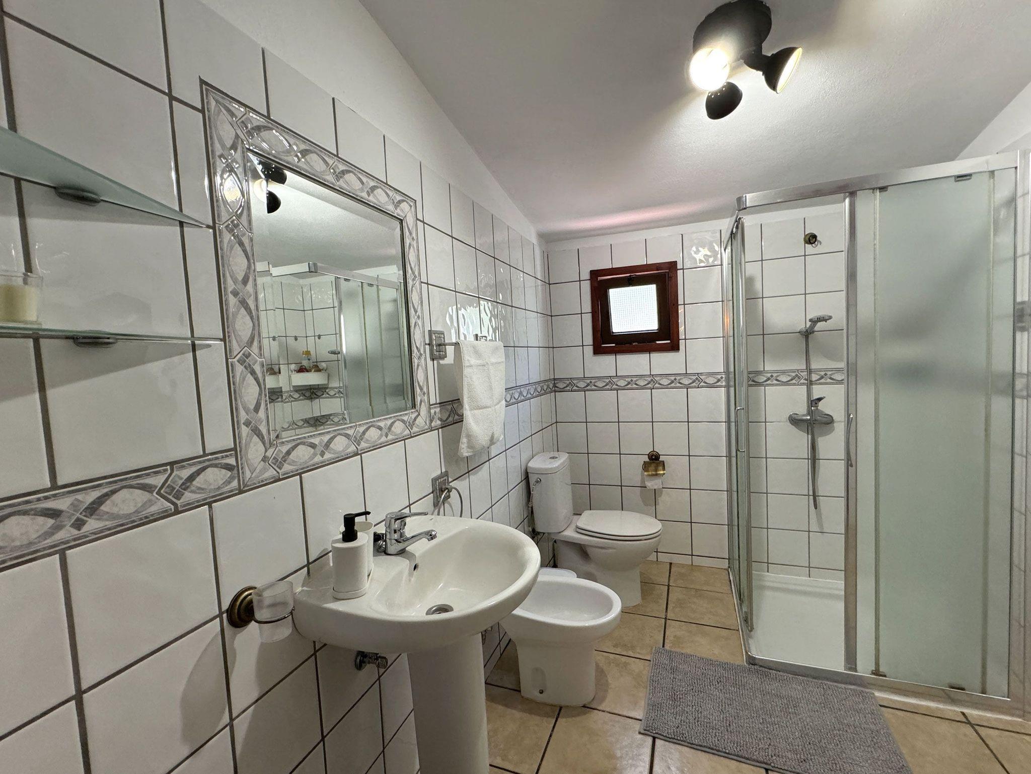 Sanitäre Einrichtungen: Das Bad ist mit Dusche, Waschbecken, Bidet und WC ausgestattet.