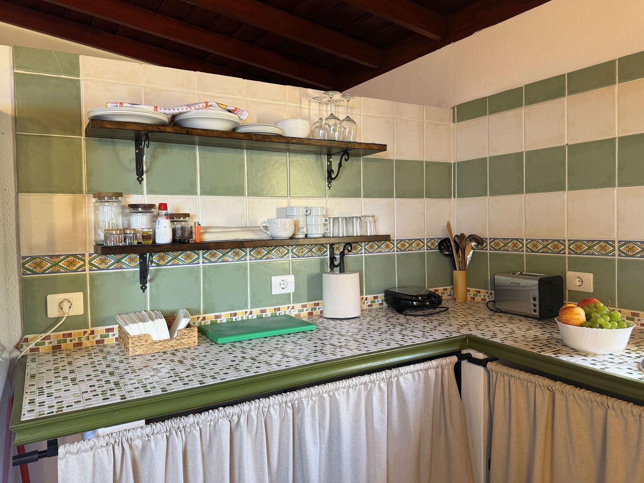 • Küchenzeile mit 4 Cerankochfeldern, Dunstabzug, Mikrowelle, Kaffeemaschine, Cafetera, Toaster, Kühlschrank mit Gefrierfach