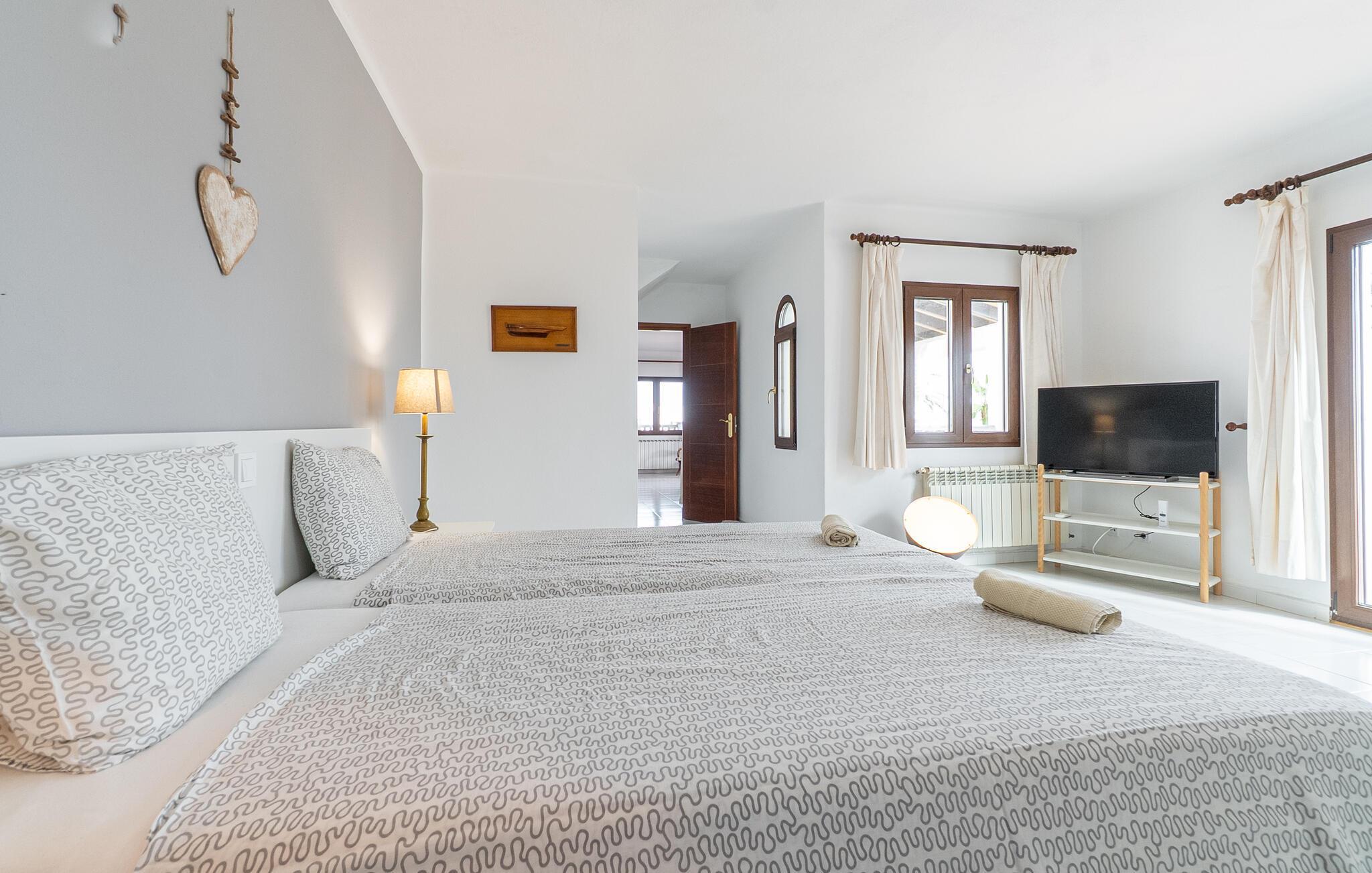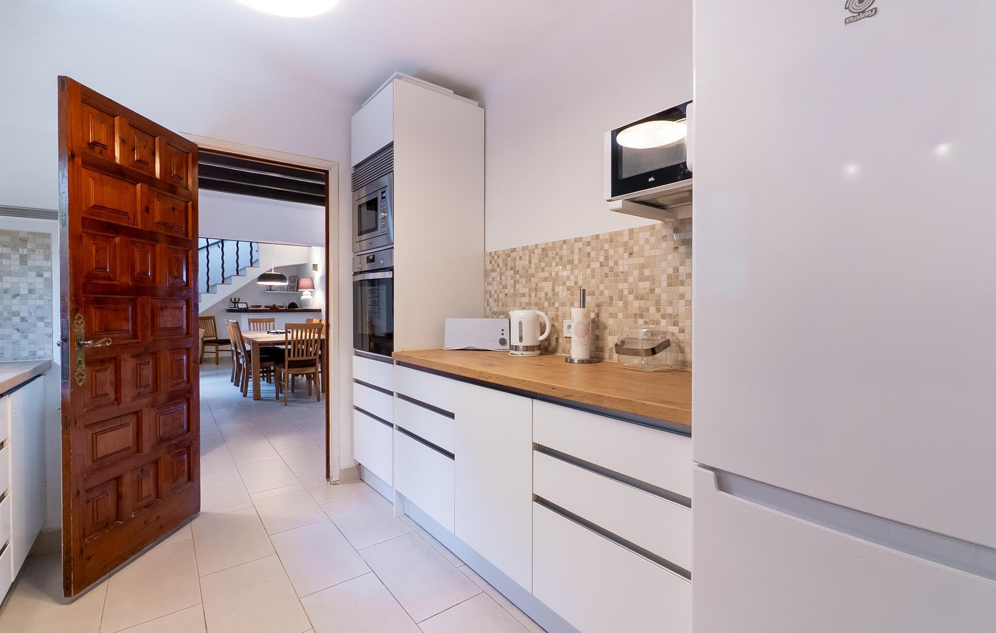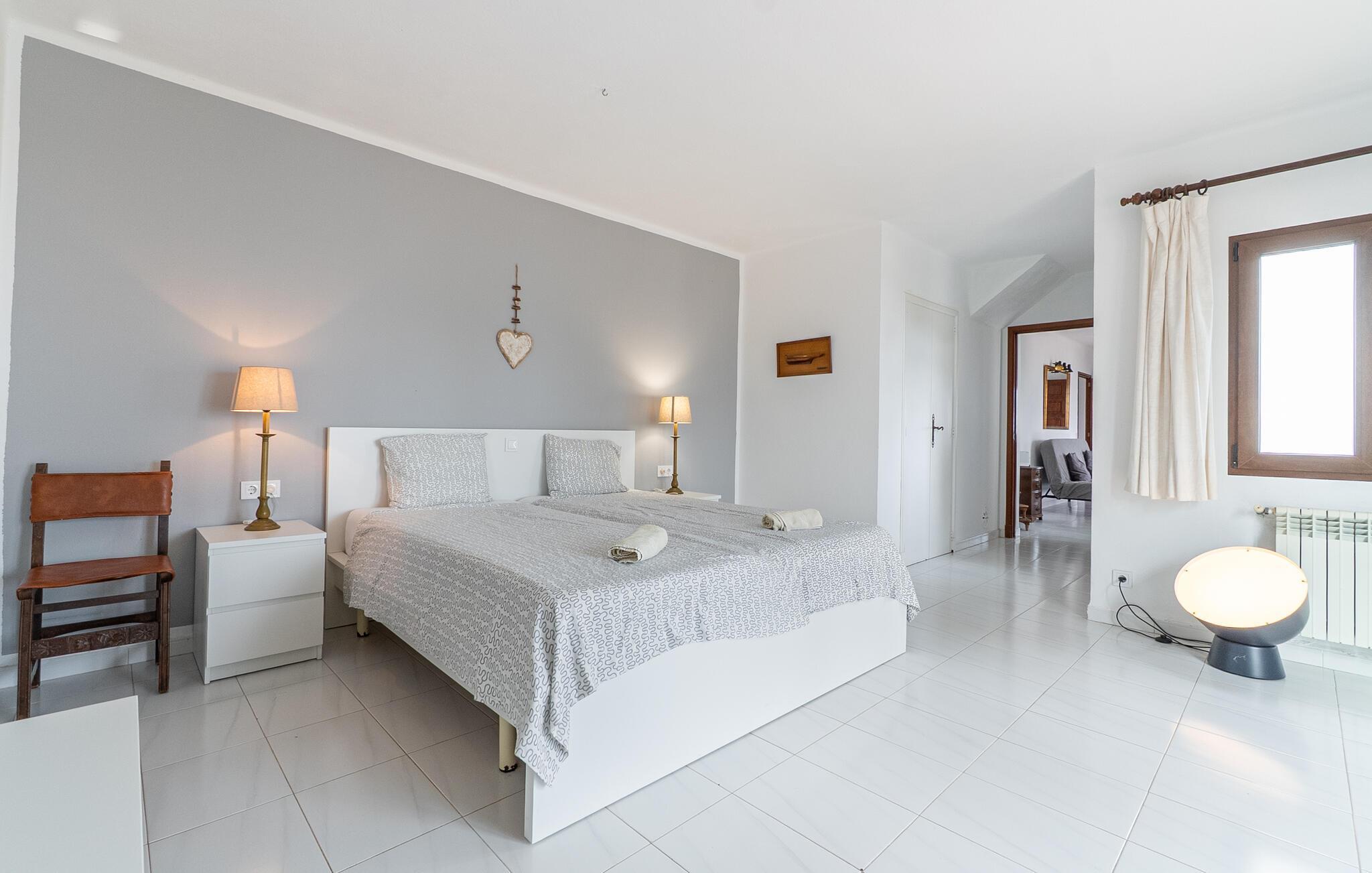 Absolut strandtauglich mit gefliesten Böden und viel Platz! Die Cala d'Or Villa überzeugt durch ihre durchdachte Aufteilung, die sich hervorragend für zwei Familien eignet. Baby-Sets sind verfügbar – fragen Sie einfach nach! Zwei gemütliche Doppelzimmer mit separatem Bad und eigenem Bad (drei Duschen, eine Duschwanne) teilen sich einen Raum. Im Erdgeschoss, links vom Eingang, finden bis zu vier Gäste ein Bett. Die anderen können sich über die gesamte erste Etage mit eigenem Fernsehzimmer und Balkon mit Meerblick verteilen. Am Kamin kann man zusammensitzen oder am langen Esstisch essen, das Wohnzimmer ist durch elegante Lichtbögen gegliedert und unter der Treppe hat eine weitere Sitzecke Platz gefunden. Die weiße, gut ausgestattete Einbauküche macht gerne mit, kann aber auch jederzeit die Tür schließen, wenn Herd und Spülmaschine in Betrieb sind.