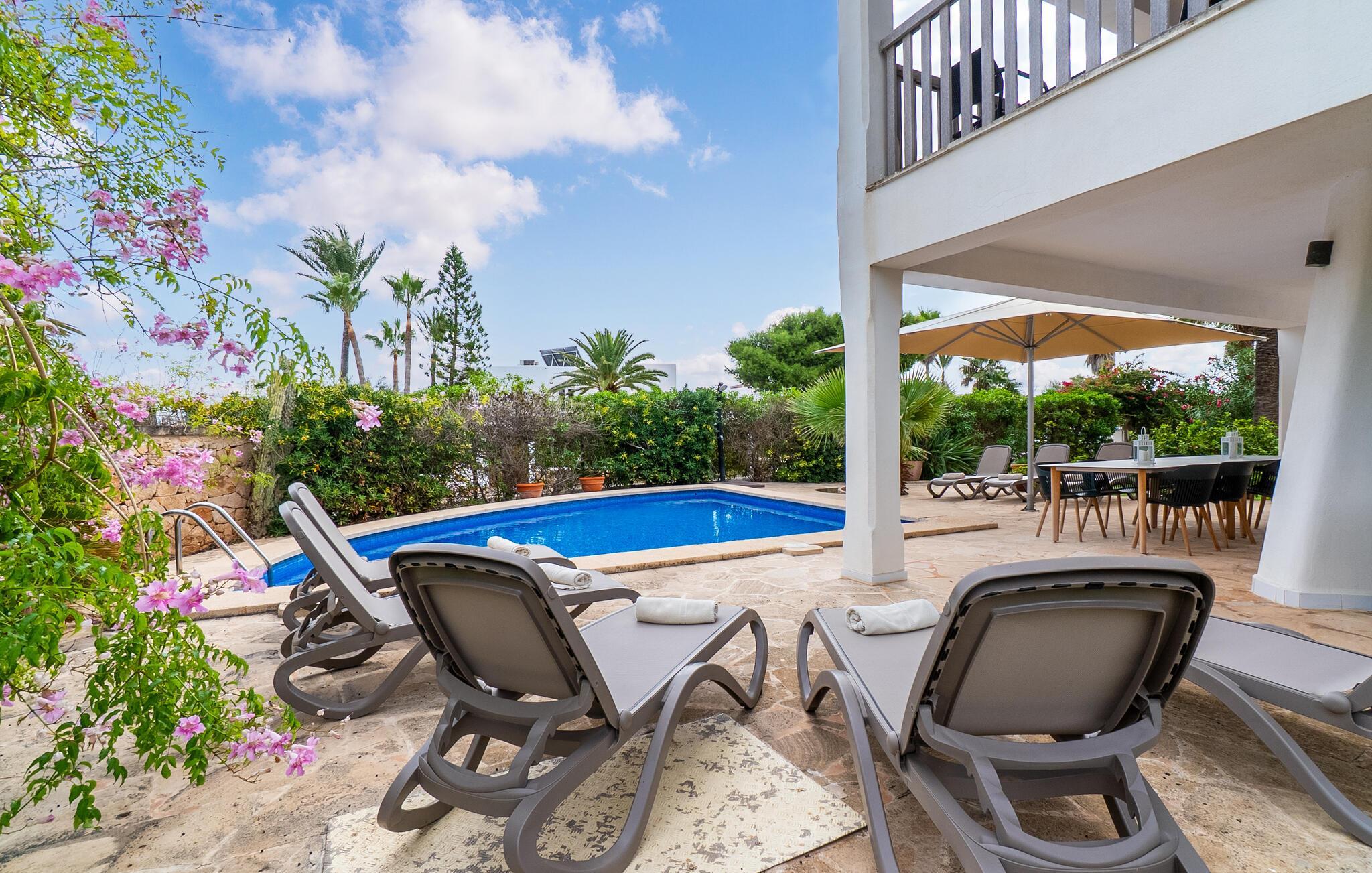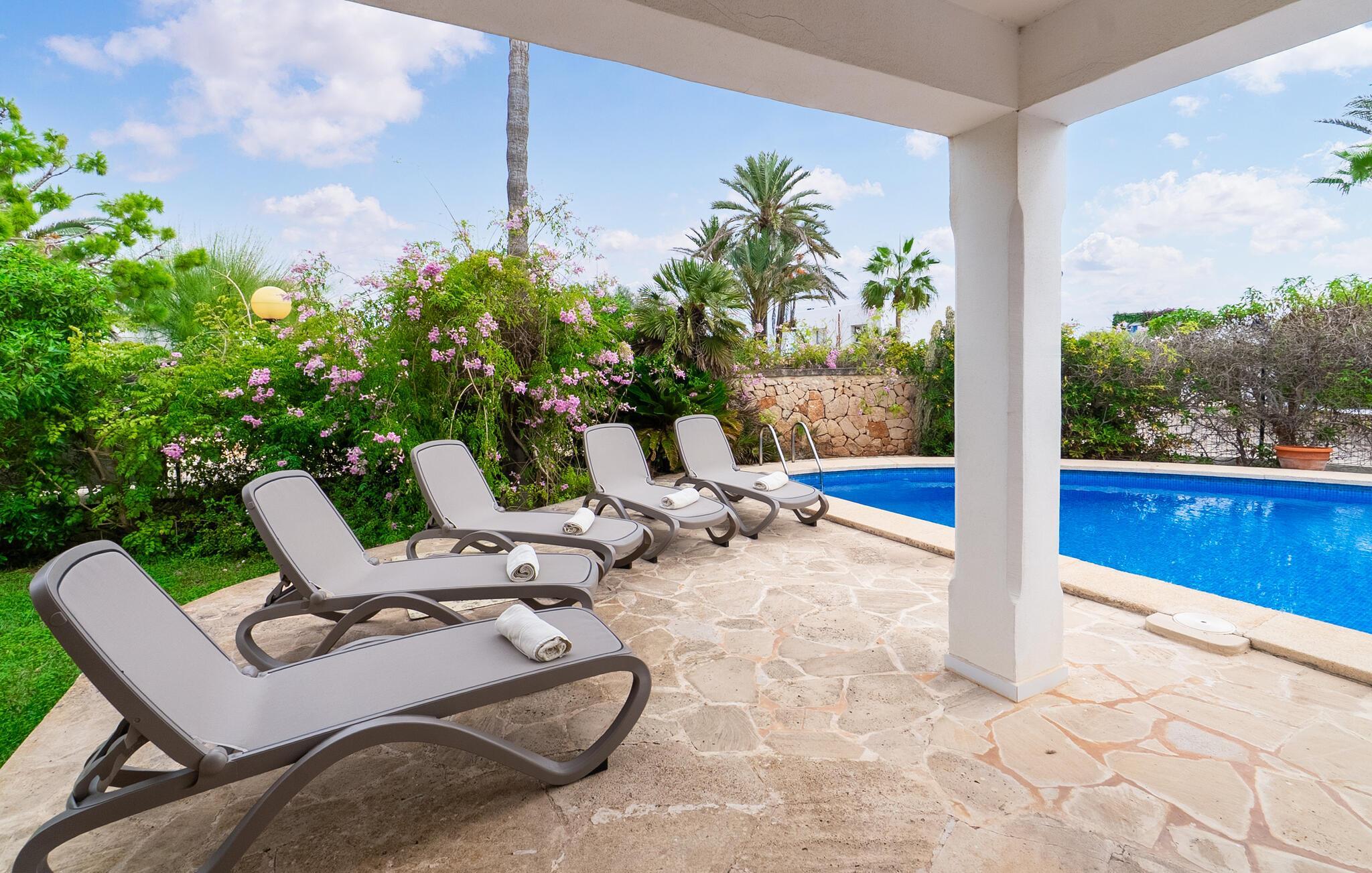 Zwischen Cala Gran und Cala Esmeralda: Wo weiße, würfelförmige Villen am Rande von Cala d'Or dem Meer zugewandt sind und Fächerpalmen sich im Wind wiegen, versprüht Mallorcas Goldküste ein wenig Ibiza-Charme. Auch als Familie/Familien sind Sie in der ruhigen Seitenstraße dieser gepflegten Villenanlage mit Parkplatz bestens aufgehoben. Die Villa „Genin“ erstreckt sich auf drei Ebenen mit Terrassen und Balkonen der Sonne entgegen, schirmt den Garten und den Pool jedoch mit einer Hecke vor den Blicken der Nachbarn ab. Hier können Sie Ihre Tische und Liegen immer ins beste Licht rücken, überdachte Nischen eignen sich hervorragend für Pausen im Schatten und für die ruhigeren Stunden des Tages. Den schönsten Ausblick genießt man auf dem Dach. Nicht allzu weit entfernt glitzert eine der türkisfarbenen Badebuchten, die die Südostküste der Insel so attraktiv machen, in der Sonne.