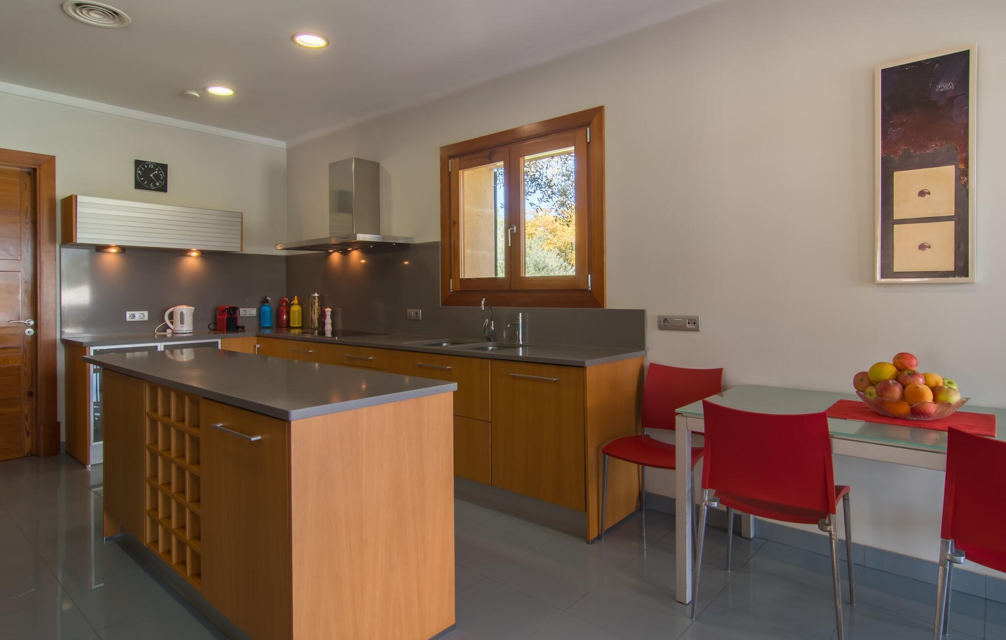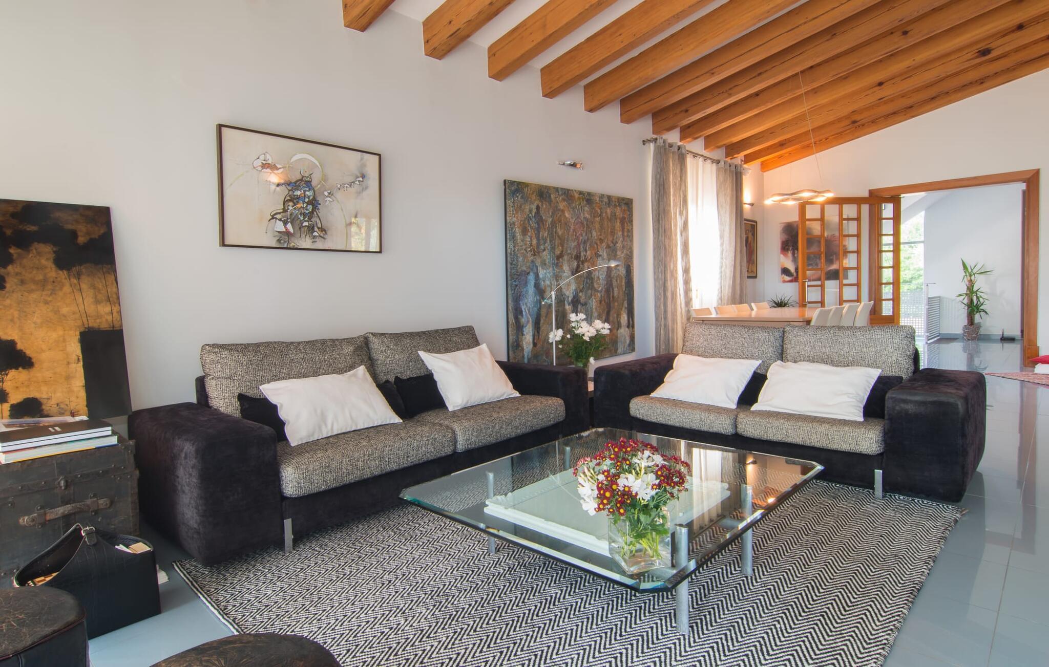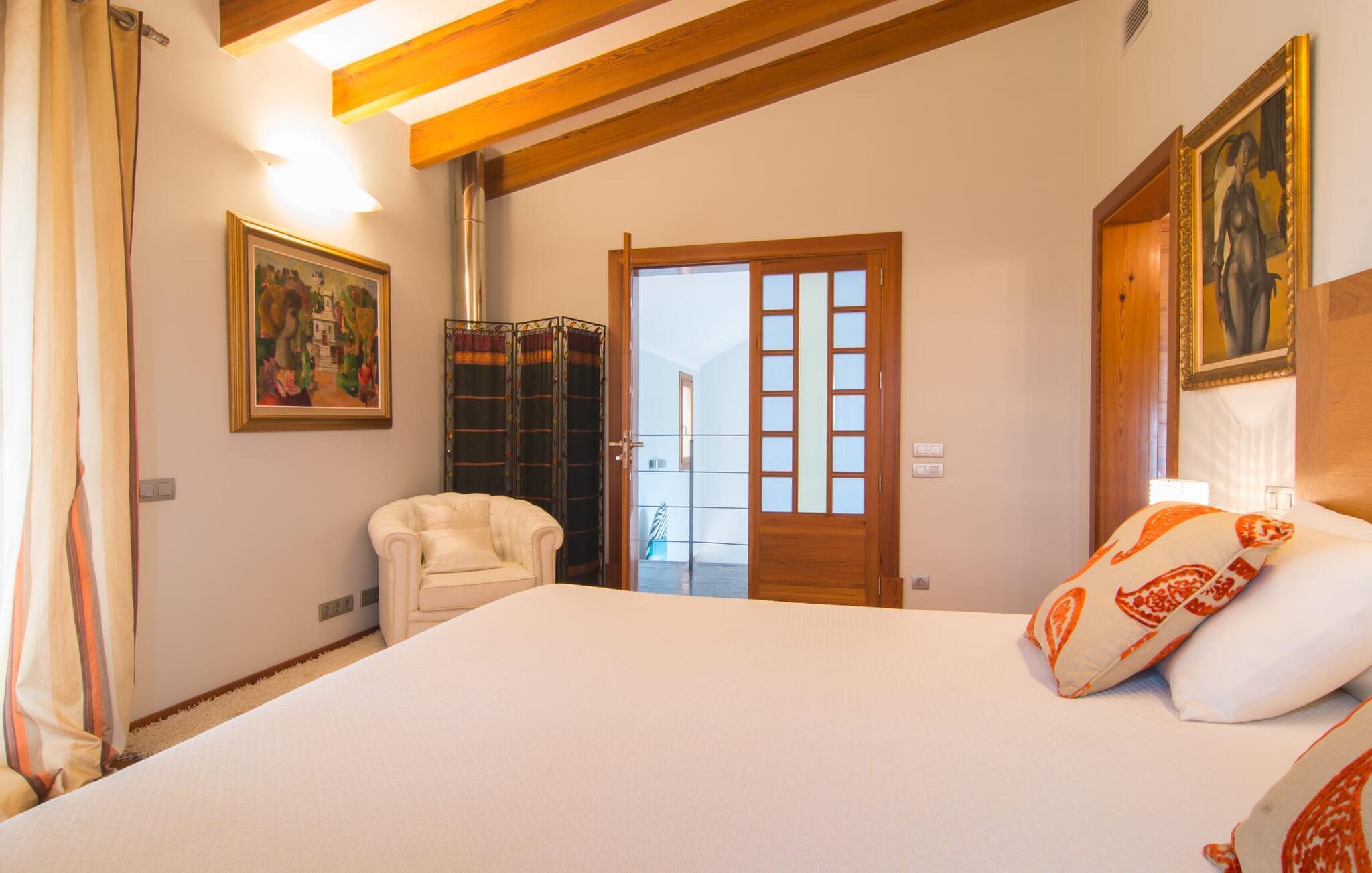 Apropos Spannung: Auch im Inneren der Villa gibt es einiges zu entdecken. Da hat jemand wirklich sein Gespür für Design und Flair bewiesen. Das gesamte Gebäude ist dank der riesigen Fensterfronten lichtdurchflutet und vom Wohnzimmer über den Essbereich bis zur Küche stilvoll eingerichtet. Eine dezente Farbpalette und schicke Designermöbel verleihen dem Interieur des Hauses einen ganz eigenen Charakter. Und die Ausstattung passt mehr als zum Design: eine hochwertige Küche, in der Träume wahr werden können, mit einer zentralen Insel und einer ganzen Reihe elektrischer Annehmlichkeiten; ein Wohnzimmer mit Flachbildfernseher und gemütlichem Kamin für ruhige Abende. Auch in den Schlafzimmern der Villa, die jeweils über ein stilvolles Bad en Suite verfügen, fehlt es in dieser Hinsicht nicht. Der Stil ist in jedem Raum spürbar. Darüber hinaus gibt es für Kunstliebhaber ein besonderes Highlight: Neben der Sammlung von Kunstwerken an vielen Wänden der Villa gibt es auch eine nette kleine Kunstecke mit einer exquisiten Auswahl an verschiedenen Gemälden und Stilen. Warum nicht vorher noch einen edlen Wein aus der riesigen Sammlung im selben Raum erwerben? Dann werden wissenschaftliche Diskussionen über Farben und Epochen umso freier geführt.